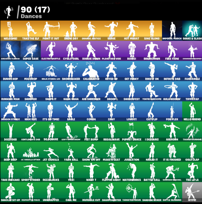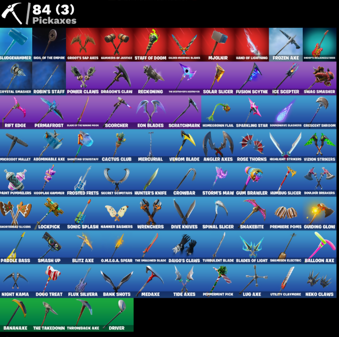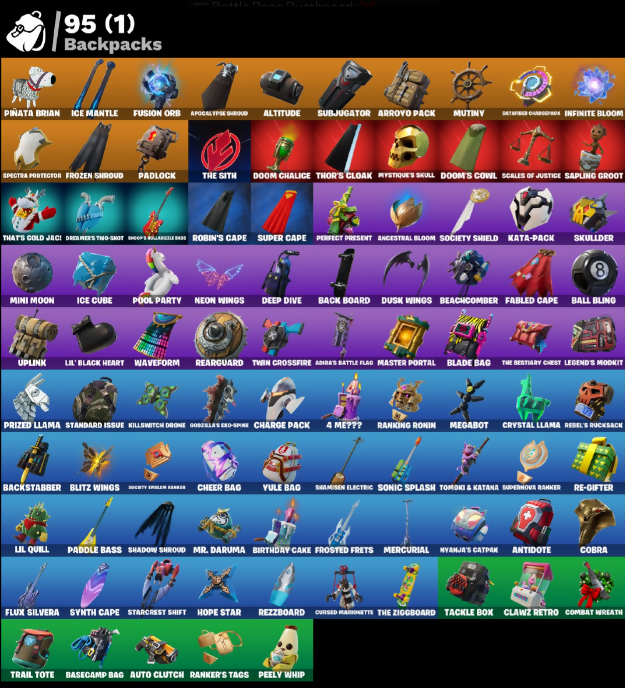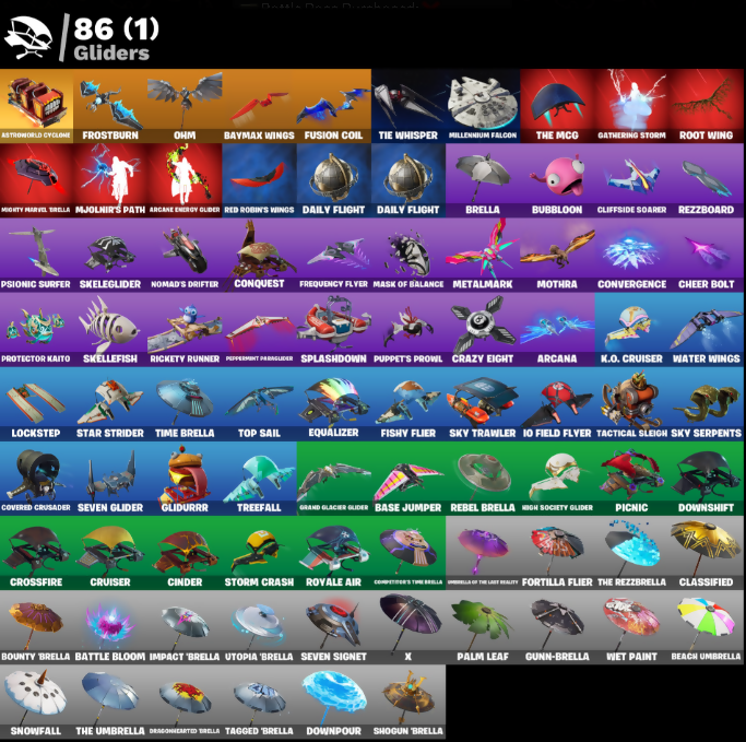 10 Field Flyer, 4 Me??, 8-Ball Vs Scratch, Abominable Axe, Adira’s Battle Flag, Air Horn, Air Shredder, Altitude, Ancestral Bloom, Angler Axes, Antidote, Apocalypse Shroud, Arcana, Arcane Energy Glider, Arroyo Pack, Astroworld Cyclone, Auto Clutch, Back Board, Backstabber, Ball Bling, Balloon Axe, Bananaxe, Bank Shots, Base Jumper, Basecamp Bag, Battle Blessing, Battle Bloom, Battle Call, Baymax Wings, Beach Umbrella, Beachcomber, Beep Beep, Birdarang Flourish, Birthday Cake, Blackheart, Blade Bag, Blade Of The Waning Moon, Blades Of Light, Blitz Axe, Blitz Wings, Boing!, Boogie Down, Boulder Breakers, Bounty Brella, Breakdown, Brella, Bubloon, Bunny Hop, Cactus Club, Calamity, Calculated, Call Me, Cameo Vs Chic, Cat Flip, Charge Pack, Cheer Bag, Cheer Bolt, Cinder, Classified, Clawz Retro, Cliffside Soarer, Cobra, Combat Wreath, Competitor's Time Brella, Conga, Conquest, Convergence, Covered Crusader, Crazy Eight, Crescent Shroom, Crossfire, Crowbar, Cruiser, Crystal Llama, Crystal Smasher, Cursed Marionette, Cyclo Curl, DJ Yonder, Daigo, Daigo's Claws, Daily Flight, Datafiber Chargepack, Deep Dive, Dive Knives, Doctor Doom, Dogg Treat, Doom Chalice, Doom’s Cowl, Downpour, Downshift, Doze Dab, Dragon Stance, Dragon's Claw, Dragonhearted Brella, Dreamer’s Two-Shot, Drift, Driver, Droop, Dusk Knight, Dusk Wings, Eagle, Electro Shuffle, Enforcer, Eon Blades, Equalizer, Fable, Fabled Cape, Fade, Fandangle, Fishy Flier, Fist Bump, Flippin Away, Flux Silvera, Foil Flex, Fortilla Flier, Free Flow, Frequency Flyer, Frostburn, Frosted Frets, Frozen Axe, Frozen Shroud, Fusion, Fusion Coil, Fusion Orb, Fusion Scythe, Gathering Storm, Gentleman's Dab, Get Funky, Giddy-Up, Gilded Morphic Blades, Glidurr, Godzilla Evolved, Godzilla’s Exo-Spine, Golf Clap, Grand Glacier Glider, Groot, Groots Sap Axes, Growing Rage/Event, Guiding Glow, Gum Brawler, Gunn-Brella, Hammers Of Justice, Hand Of Lightning, Haylee Skye, Hello Friend, Hero Baymax, High Five, High Society Glider, Highlight Strikers, Homegrown Flail, Hooplah Hammer, Hope Star, Hot Marat, Hula Hoopin', Humbug Slicer, Hunter's Knife, Huntress, Hybrid, Hype!, I Declare!, Ice Cube, Ice Mantle, Ice Scepter, Impact 'Brella, Imperial March, Infinite Bloom, Infinite Dab, Invisible Cut, It Is Finished, It's Go Time!, Jade, Jennifer Walters, Jet Signals, Journey Vs Hazard, Jubilation, Jules, K.O. Cruiser, Kata-Pack, Kendo, Keyed Up, Killswitch, Killswitch Drone, Kit, Leafy Longboardin', Legend’s Modkit, Lightrider, Lil Quill, Lil' Godzilla Attack, Lil’ Black Heart, Lockpick, Lockstep, Love It!, Lt. Evergreen, Lug Axe, Lynx, Make A Seat, Mask of Balance, Master Portal, Medaxe, Megabot, Mercurial, Metalmark, Mic Drop, Microbot Mallet, Mighty Marvel Delta, Millennium Falcon, Mini Moon, Mjolnir, Mjolnir's Path, Mothra, Mr. Daruma, Mutiny, Mystique, Mystique’s Skull, Nailed It, Nana Nana, Nanner Bashers, Neko Claws, Neon Wings, Night Kama, Ninja Stance: Leo, Nomad's Drifter, Nyanja, Nyanja’s Catpak, O.M.E.G.A. Spear, Ocean, Ohm, Onesie, Orange Justice, Paddle Bass, Padlock, Paint Pummeler, Palm Leaf, Peely, Peely Whip, Peppermint Paraglider, Peppermint Pick, Perfect Present, Permafrost, Picnic, Piñata Brian, Planetary Vibe, Point It Out, Pool Party, Powder, Power Claws, Premiere Poms, Prized Llama, Protector Kaito, Psionic Surfer, Puppet Dance, Puppet's Prowl, Ragnarok, Ranker’s Tags, Ranking Ronin, Re-Gifter, Rearguard, Rebel Brella, Rebel’s Rucksack, Reckoning, Red Robin's Wings, Redline, Regal Wave, Remedy Vs Toxin, Respect The Peace, Rezz Blocks, Rezzboard, Rickety Runner, Rift Edge, Ring It On, Rippley Vs Sludge, Robin, Robin's Staff, Robin’s Cape, Rook, Root Wing, Rose Thorns, Royale Air, Running Man, Runway Racer, Samisen-Sational, Santa Dogg, Sapling Groot, Scales of Justice, Scorcher, Scratchmark, Scuba Jonesy, Secret Scimitars, Seven Glider, Seven Signet, Sgt. Winter, Shadow Blade Hope, Shadow Boxer, Shadow Shroud, Shake & Slash, Shamisen Electric, Shaolin Sit-Up, Sharpshooter, Shimmer, Shogun 'Brella, Shooting Starstaff, Shortbread Slicers, Show 'Em Off, Sidewinder, Sigil Of The Empire, Sing Along, Siona, Skellefish, Skelleglider, Skullder, Sky Serpents, Sky Trawler, Sledgehammer, Sludgehammer, Smash Up, Snakebite, Snoop's Reloaded Bass, Snoozefest, Snow Day, Snow Shaker, Snowfall, So Square, Society Epidem Bandel, Society Shield, Society’s Collateral Bass, Solar Slicer, Sonic Splash, Soundwave Slashers, Sparkling Star, Spectra Protector, Spinal Slicer, Spirit Strider, Splashdown, Staff Of Doom, Standard Issue, Star Strider, Starcrest Shift, Storm, Storm Crash, Storm's Maw, Subjugator, Sun Strider, Super Cape, Super Save, Superman, Supernova Ranker, Swag Smasher, Swipe It, Synth Cape, Synthwave, Tackle Box, Tactical Sleigh, Tagged 'Brella, Tagger's Groove, Take The Cake, Take The Elf, Targeted Focus, That’s Cold Jac!, The Bestiary Chest, The Destroyer's Destroyer, The Ice King, The Imagined Blade, The McG, The Night Rose, The Prisoner, The Rezzbrella, The Sith, The Takedown, The Umbrella, The Zigboard, Thor, Thor’s Cloak, Throwback Axe, Tide Axes, Tie Whisper, Time Brella, Tippy Tap, Tomoki & Katana, Top Sail, Tra La La, Trail Tote, Treefall, Trog, Turbulent Blade, Turk Vs Riptide, Twin Crossfire, UNSC Spartan, Umbrella of the Last Reality, Unwrapped, Uplink, Utility Claymore, Utopia 'Brella, Vax!, Venom Blade, Verve, Vizion Strikers, Water Wings, Waterworks, Waveform, Wavy T, Welcome!, Wet Paint, Wolverine, Wooly Warrior, Wrenchers, X, Yarn Ball, Yellowjacket, You're Awesome, Yule Bag, Zany, Zenith, Ziggy