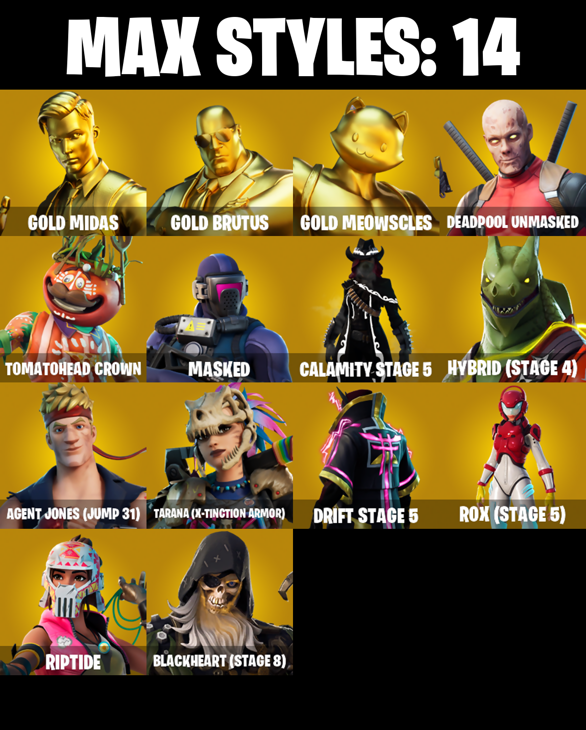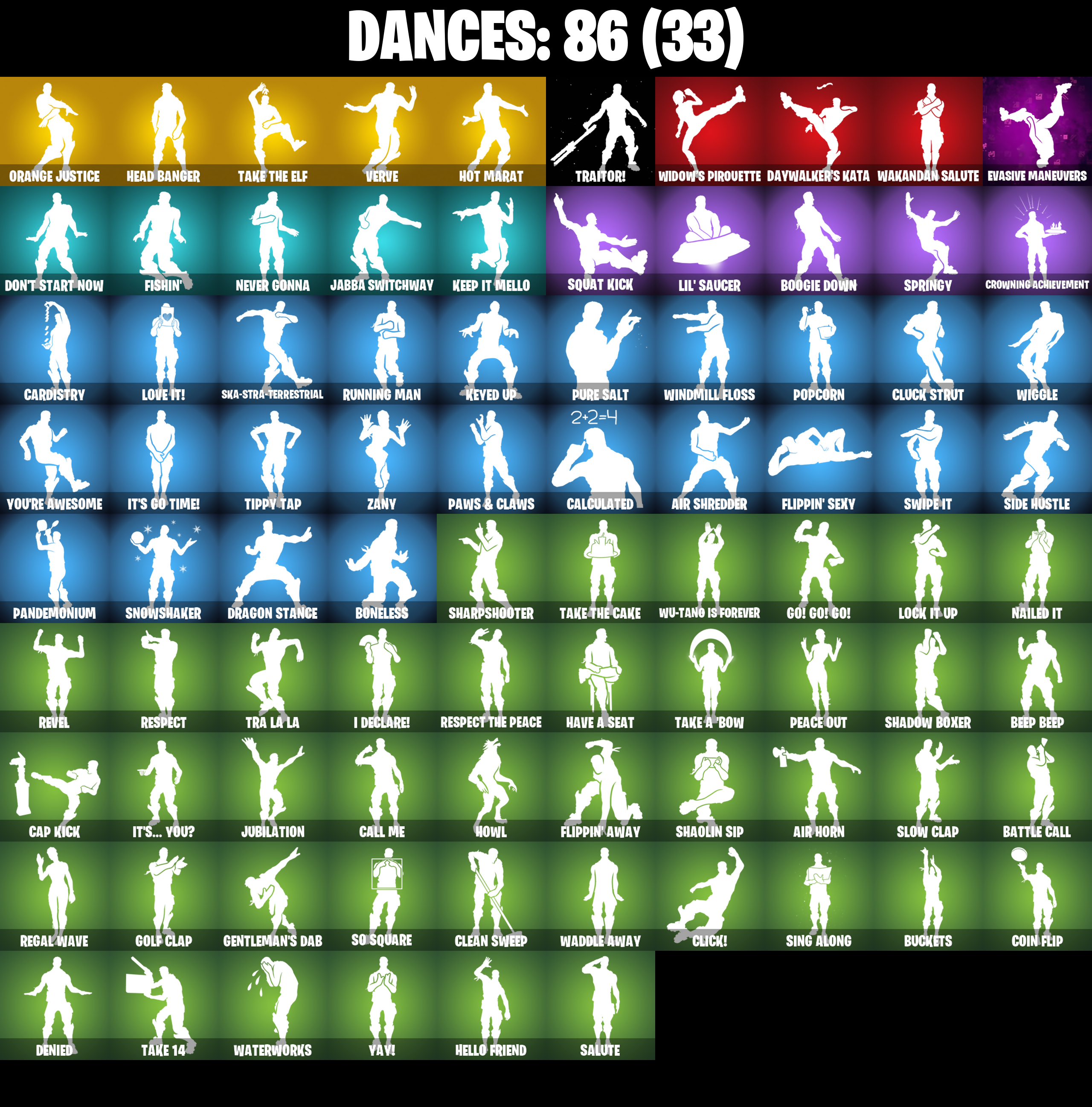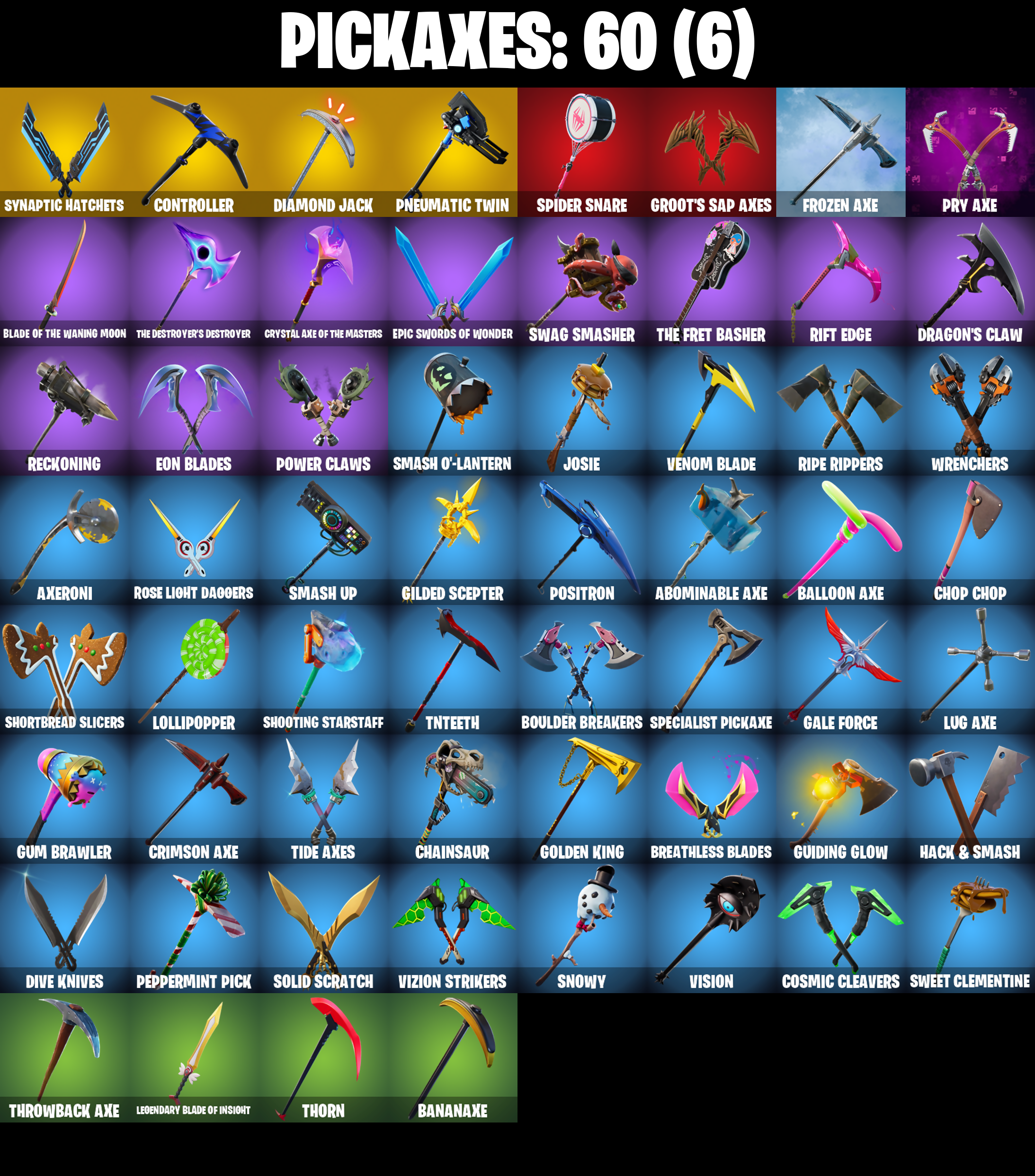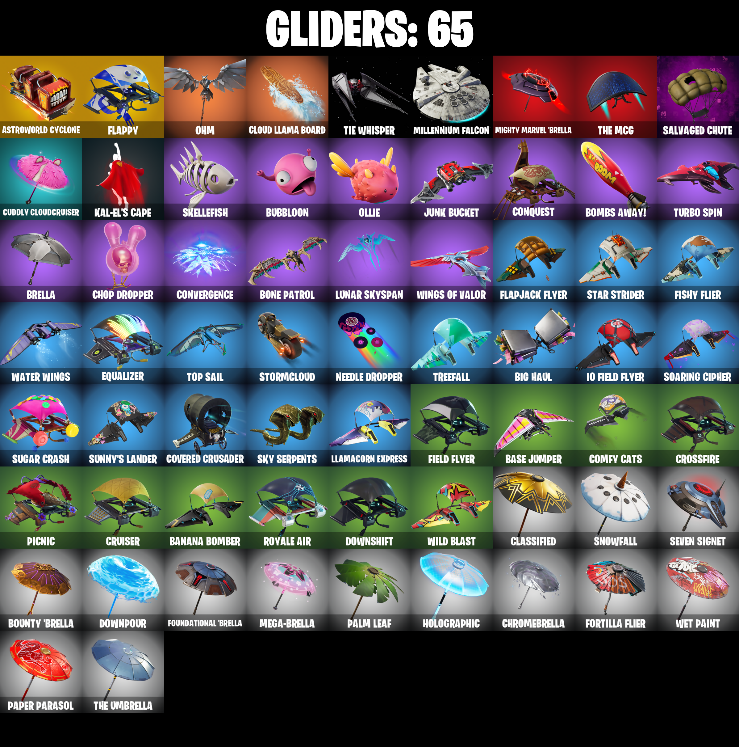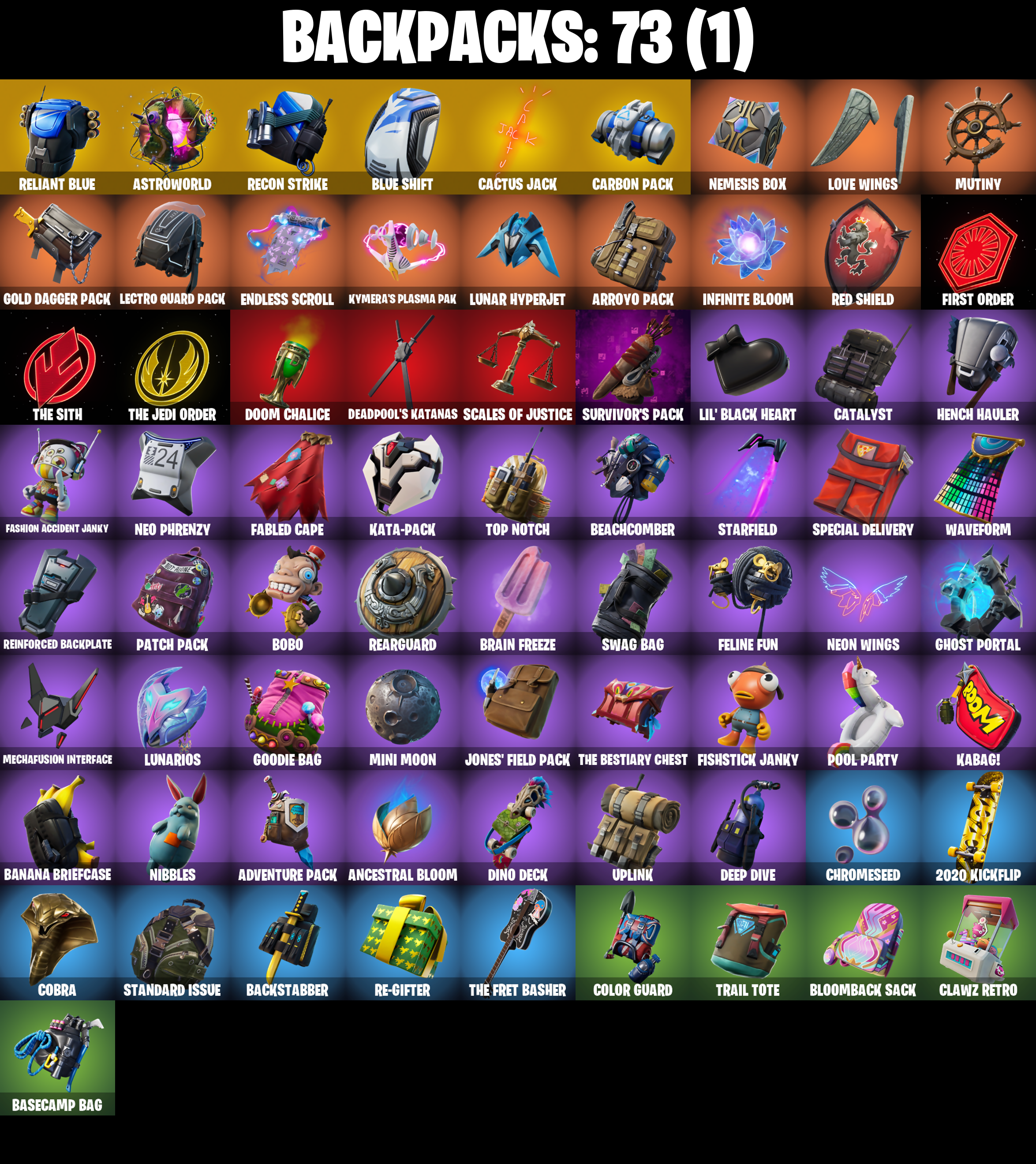 2020 Kickflip, Abominable Axe, Adventure Pack, Agent Jones, Agent Jones (Jump 31), Agent Peely, Air Horn, Air Shredder, Ancestral Bloom, Arroyo Pack, Astro Jack, Astroworld, Astroworld Cyclone, Axeroni, Backstabber, Balloon Axe, Banana Bomber, Banana Briefcase, Bananaxe, Base Jumper, Basecamp Bag, Battle Call, Battlehawk, Beachcomber, Beep Beep, Big Haul, Birdie, Blackheart, Blackheart (Stage 8), Blade Of The Waning Moon, Bloomback Sack, Blue Shift, Blue Striker, Bobo, Bombs Away!, Bone Patrol, Boneless, Boogie Down, Boulder Breakers, Bounty 'Brella, Brain Freeze, Brainiac, Breathless Blades, Brella, Bubbloon, Buckets, Bunker Jonesy, Cactus Jack, Calamity, Calamity Stage 5, Calculated, Call Me, Cap Kick, Carbide, Carbon Commando, Carbon Pack, Cardistry, Catalyst, Chainsaur, Chop Chop, Chop Dropper, Chromebrella, Chromeseed, Classified, Clawz Retro, Clean Sweep, Click!, Clinical Crosser, Cloud Llama Board, Cluck Strut, Cobalt, Cobra, Coin Flip, Color Guard, Comfy Cats, Conquest, Controller, Convergence, Cosmic Cleavers, Covered Crusader, Crimson Axe, Crossfire, Crowning Achievement, Cruiser, Crusher, Crystal Axe Of The Masters, Cuddly Cloudcruiser, Daywalker's Kata, Deadpool, Deadpool Unmasked, Deadpool's Katanas, Deep Dive, Denied, Diamond Jack, Dino Deck, Dive Knives, Dj Yonder, Don't Start Now, Doom Chalice, Downpour, Downshift, Dragon Stance, Dragon's Claw, Drift, Drift Stage 5, Endless Scroll, Eon Blades, Epic Swords Of Wonder, Equalizer, Evasive Maneuvers, Fable, Fabled Cape, Fade, Fashion Accident Janky, Feline Fun, Field Flyer, First Order, Fishin', Fishstick Janky, Fishy Flier, Flapjack Flyer, Flapjackie, Flappy, Flippin' Away, Flippin' Sexy, Fortilla Flier, Foundational 'Brella, Frozen Axe, Gale Force, Gear Specialist Maya, Gentleman's Dab, Ghost Portal, Giddy-Up, Gilded Scepter, Go! Go! Go!, Gold Brutus, Gold Dagger Pack, Gold Meowscles, Gold Midas, Golden King, Golf Clap, Goodie Bag, Groot's Sap Axes, Guggimon, Guiding Glow, Gum Brawler, Hack & Smash, Have A Seat, Head Banger, Hello Friend, Hench Hauler, Holographic, Hot Marat, Howl, Huntress, Hybrid, Hybrid (Stage 4), I Declare!, Infinite Bloom, Infinity, Io Field Flyer, It's Go Time!, It's... You?, Jabba Switchway, Jones' Field Pack, Josie, Jubilation, Jules, Junk Bucket, Kabag!, Kal-El's Cape, Kata-Pack, Keep It Mello, Keyed Up, Kit, Kymera, Kymera's Plasma Pak, Lara Croft, Lectro Guard Pack, Legendary Blade Of Insight, Lil' Black Heart, Lil' Saucer, Llamacorn Express, Lock It Up, Lollipopper, Love It!, Love Ranger, Love Wings, Lt. Evergreen, Lug Axe, Lunar Hyperjet, Lunar Skyspan, Lunarios, Masked, Mechafusion Interface, Mega-Brella, Mighty Marvel 'Brella, Millennium Falcon, Mini Moon, Mutiny, Nailed It, Needle Dropper, Nemesis Box, Neo Phrenzy, Neo Versa, Neon Wings, Never Gonna, Nibbles, Ocean, Ohm, Ollie, Orange Justice, Palm Leaf, Pandemonium, Paper Parasol, Patch Pack, Paws & Claws, Peace Out, Peppermint Pick, Picnic, Pneumatic Twin, Point Patroller, Pool Party, Popcorn, Positron, Power Claws, Pry Axe, Pure Salt, Re-Gifter, Rearguard, Reckoning, Recon Ranger, Recon Strike, Red Jade, Red Knight, Red Shield, Redline, Regal Wave, Reinforced Backplate, Reliant Blue, Respect, Respect The Peace, Revel, Rey, Rift Edge, Ripe Rippers, Riptide, Rogue Agent, Rose Light Daggers, Rox, Rox (Stage 5), Royale Air, Running Man, Salute, Salvaged Chute, Scales Of Justice, Scuba Jonesy, Sentinel, Seven Signet, Shadow Boxer, Shaolin Sip, Sharpshooter, Shooting Starstaff, Shortbread Slicers, Side Hustle, Sing Along, Siona, Ska-Stra-Terrestrial, Skellefish, Sky Serpents, Skye, Sledgehammer, Slow Clap, Smash O'-Lantern, Smash Up, Snowfall, Snowshaker, Snowy, So Square, Soaring Cipher, Solid Scratch, Special Delivery, Specialist Pickaxe, Spider Snare, Springy, Squat Kick, Standard Issue, Star Strider, Star-Spangled Trooper, Starfield, Stormcloud, Sugar Crash, Summit Striker, Sun Strider, Sunny, Sunny's Lander, Survivor's Pack, Swag Bag, Swag Smasher, Sweet Clementine, Swipe It, Synaptic Hatchets, Take 14, Take A Bow, Take The Cake, Take The Elf, Tarana, Tarana (X-Tinction Armor), Teknique, The Ace, The Bestiary Chest, The Destroyer's Destroyer, The Fret Basher, The Jedi Order, The Mcg, The Sith, The Umbrella, Thorn, Throwback Axe, Tide Axes, Tie Whisper, Tippy Tap, Tnteeth, Tntina, Tomatohead, Tomatohead Crown, Top Notch, Top Sail, Tra La La, Trail Tote, Traitor!, Travis Scott, Treefall, Trilogy, Turbo Spin, Uplink, Venom Blade, Verve, Vision, Vizion Strikers, Waddle Away, Wakandan Salute, Water Wings, Waterworks, Waveform, Wet Paint, Widow's Pirouette, Wiggle, Wild Blast, Windmill Floss, Wings Of Valor, Wooly Warrior, Wrenchers, Wu-Tang Is Forever, X-Lord, Yay!, Yellowjacket, You're Awesome, Zany, Zoey