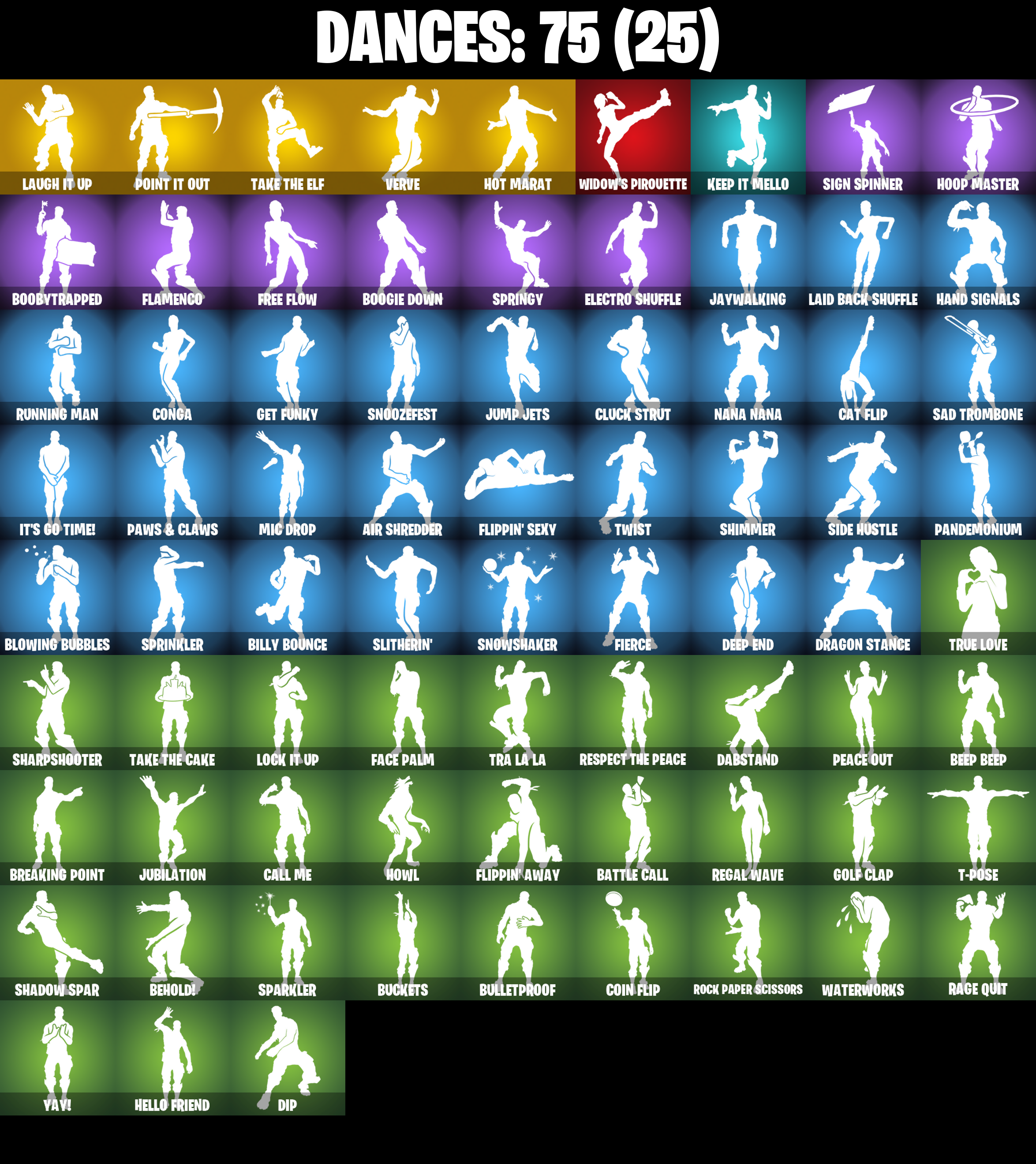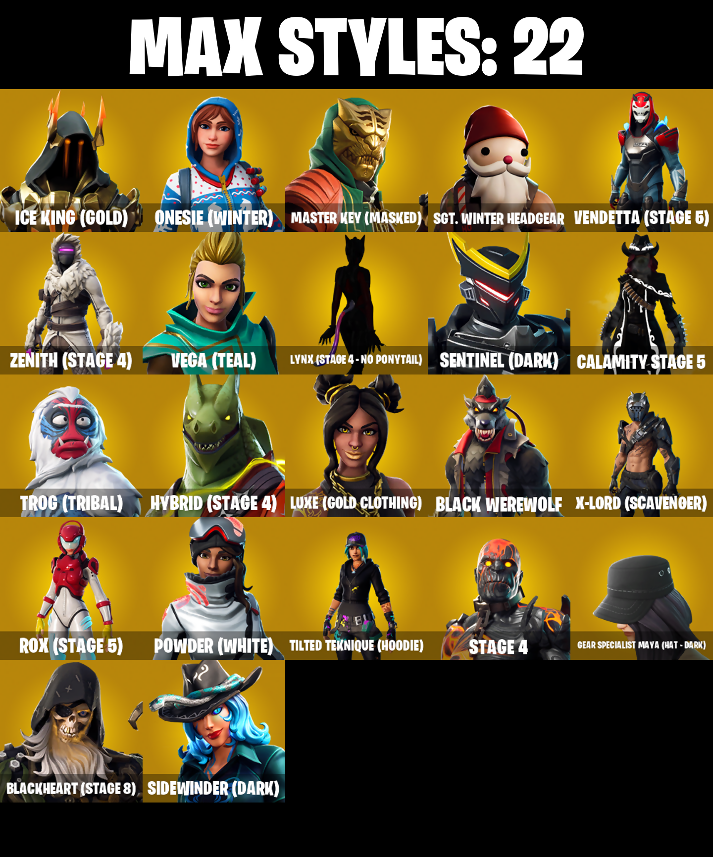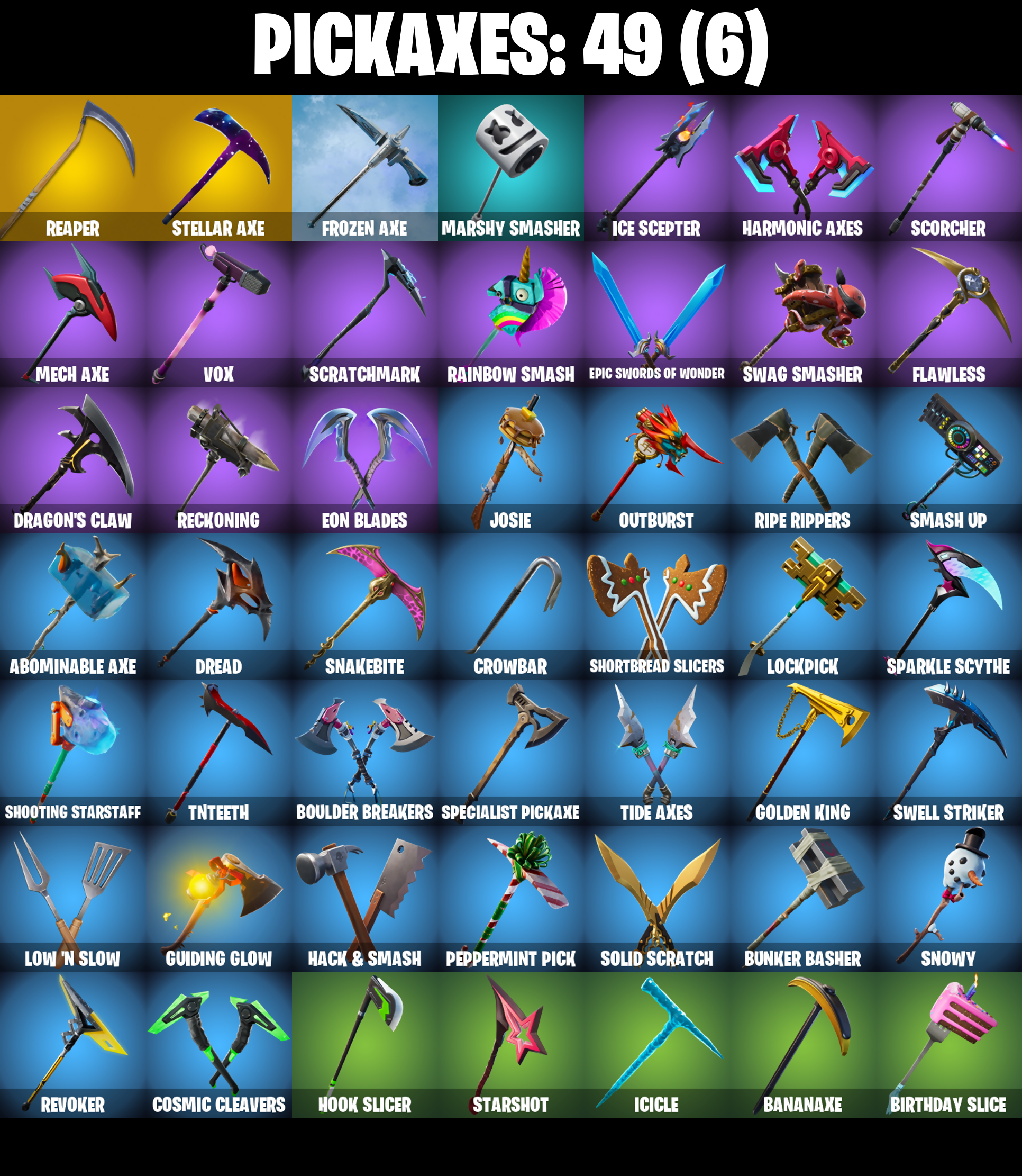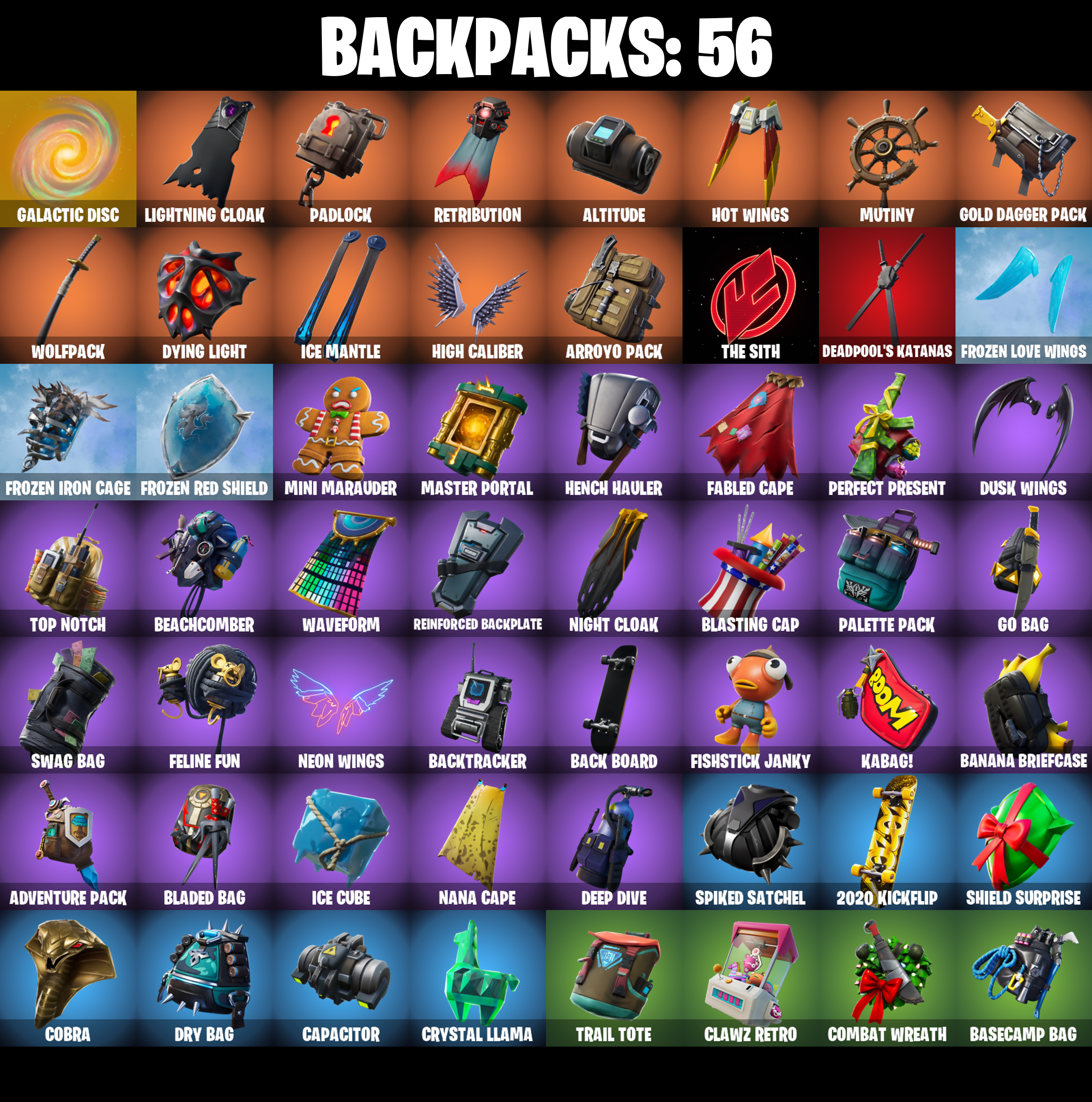 2020 Kickflip, Abominable Axe, Adventure Pack, Agent Peely, Air Shredder, Altitude, Arroyo Pack, Back Board, Backtracker, Banana Briefcase, Bananaxe, Basecamp Bag, Battle Call, Beachcomber, Beep Beep, Behold!, Billy Bounce, Birthday Slice, Black Werewolf, Blackheart, Blackheart (Stage 8), Bladed Bag, Blasting Cap, Blowing Bubbles, Boobytrapped, Boogie Down, Boulder Breakers, Brainiac, Breaking Point, Brutus, Buckets, Bulletproof, Bunker Basher, Bunker Jonesy, Calamity, Calamity Stage 5, Call Me, Capacitor, Cat Flip, Catalyst, Clawz Retro, Cluck Strut, Cobalt, Cobra, Coin Flip, Combat Wreath, Conga, Cosmic Cleavers, Crowbar, Crystal Llama, Dabstand, Deadpool, Deadpool's Katanas, Deep Dive, Deep End, Demi, Dip, Dire, Dj Yonder, Dragon Stance, Dragon's Claw, Dread, Dry Bag, Dusk, Dusk Wings, Dying Light, Electro Shuffle, Ember, Eon Blades, Epic Swords of Wonder, Fable, Fabled Cape, Face Palm, Fade, Feline Fun, Fierce, Fireworks Team Leader, Fishstick Janky, Flamenco, Flawless, Flippin' Away, Flippin' Sexy, Free Flow, Frozen Axe, Frozen Iron Cage, Frozen Love Ranger, Frozen Love Wings, Frozen Raven, Frozen Red Knight, Frozen Red Shield, Gage, Galactic Disc, Galaxy, Gear Specialist Maya, Gear Specialist Maya (Hat - Dark), Get Funky, Giddy-Up, Go Bag, Gold Dagger Pack, Golden King, Golf Clap, Guiding Glow, Hack & Smash, Hand Signals, Harmonic Axes, Hello Friend, Hench Hauler, High Caliber, Hook Slicer, Hoop Master, Hot Marat, Hot Wings, Howl, Hybrid, Hybrid (Stage 4), Ice Cube, Ice King (Gold), Ice Mantle, Ice Scepter, Icicle, It's Go Time!, Jack Gourdon, Jaywalking, Josie, Jubilation, Jump Jets, Kabag!, Keep It Mello, Laid Back Shuffle, Laugh It Up, Lightning Cloak, Lock It Up, Lockpick, Low 'N Slow, Luxe, Luxe (Gold Clothing), Lynx, Lynx (Stage 4 - No Ponytail), Marshy Smasher, Masked Fury, Master Key, Master Key (Masked), Master Portal, Mech Axe, Meowscles, Merry Marauder, Mic Drop, Midas, Mini Marauder, Munitions Major, Mutiny, Nana Cape, Nana Nana, Neon Wings, Night Cloak, Nightshade, Ocean, Onesie, Onesie (Winter), Outburst, Padlock, Palette Pack, Pandemonium, Paws & Claws, Peace Out, Peely, Peppermint Pick, Perfect Present, Point It Out, Poised Playmaker, Powder, Powder (White), Prickly Patroller, Rage Quit, Rainbow Smash, Reaper, Reckoning, Red Jade, Red Strike, Regal Wave, Reinforced Backplate, Respect The Peace, Retribution, Revoker, Ripe Rippers, Rock Paper Scissors, Rox, Rox (Stage 5), Ruin, Running Man, Sad Trombone, Scorcher, Scratchmark, Scuba Jonesy, Sentinel, Sentinel (Dark), Sgt. Green Clover, Sgt. Winter, Sgt. Winter Headgear, Shadow Spar, Sharpshooter, Shield Surprise, Shimmer, Shooting Starstaff, Shortbread Slicers, Side Hustle, Sidewinder, Sidewinder (Dark), Sign Spinner, Skye, Slitherin', Smash Up, Snakebite, Snoozefest, Snowshaker, Snowy, Solid Scratch, Sparkle Scythe, Sparkler, Specialist Pickaxe, Spiked Satchel, Springy, Sprinkler, Stage 4, Starshot, Stellar Axe, Stratus, Summit Striker, Swag Bag, Swag Smasher, Swell Striker, T-Pose, Take The Cake, Take The Elf, Tech Ops, Tempest, The Ace, The Ice King, The Prisoner, The Sith, Tide Axes, Tilted Teknique, Tilted Teknique (Hoodie), Tnteeth, Tntina, Top Notch, Tra La La, Trail Tote, Trog, Trog (Tribal), True Love, Twist, Vega, Vega (Teal), Vendetta, Vendetta (Stage 6), Verve, Vox, Waterworks, Wavebreaker, Waveform, Whiplash, Widow's Pirouette, Wilde, Wolfpack, Wooly Warrior, X-Lord, X-Lord (Scavenger), Yay!, Yond3r, Zenith, Zenith (Stage 4)