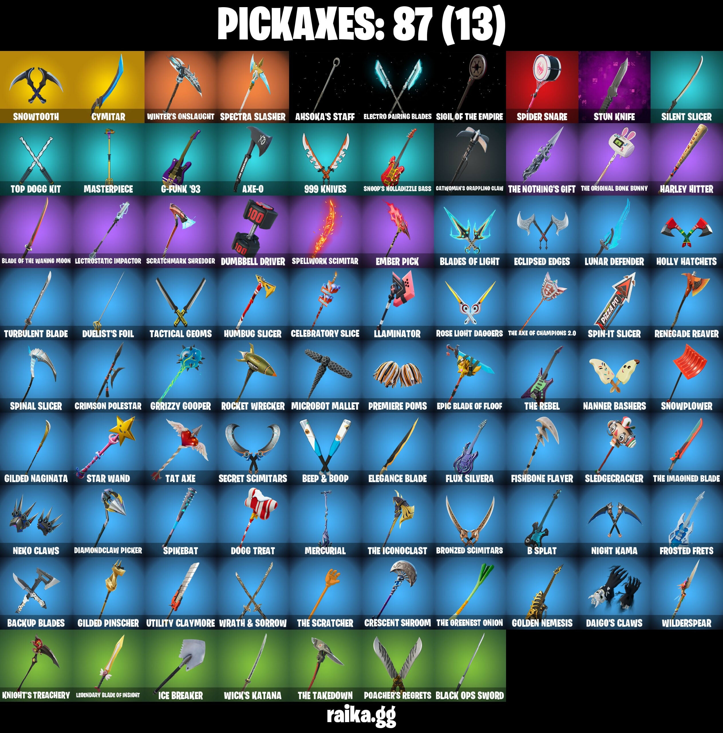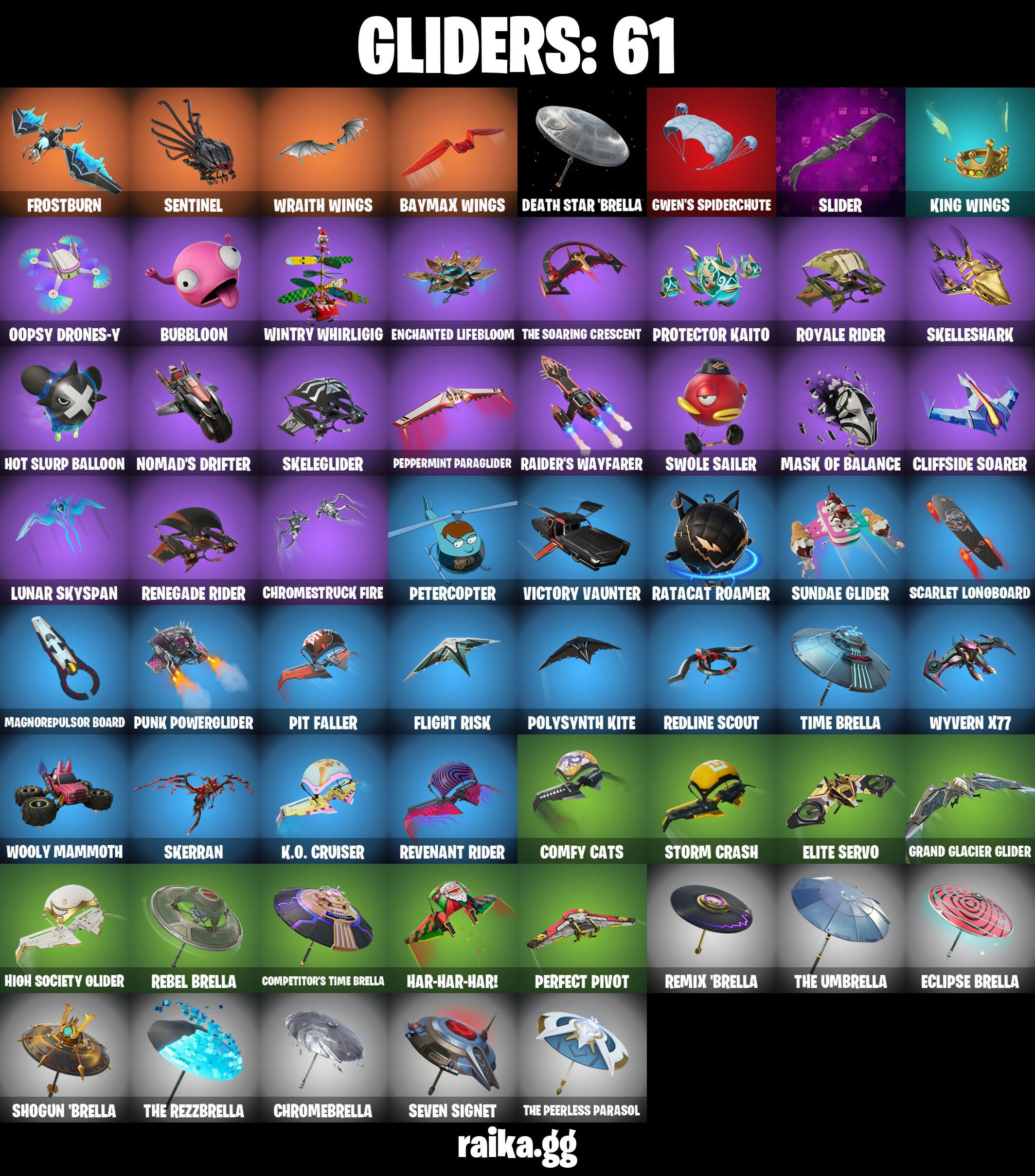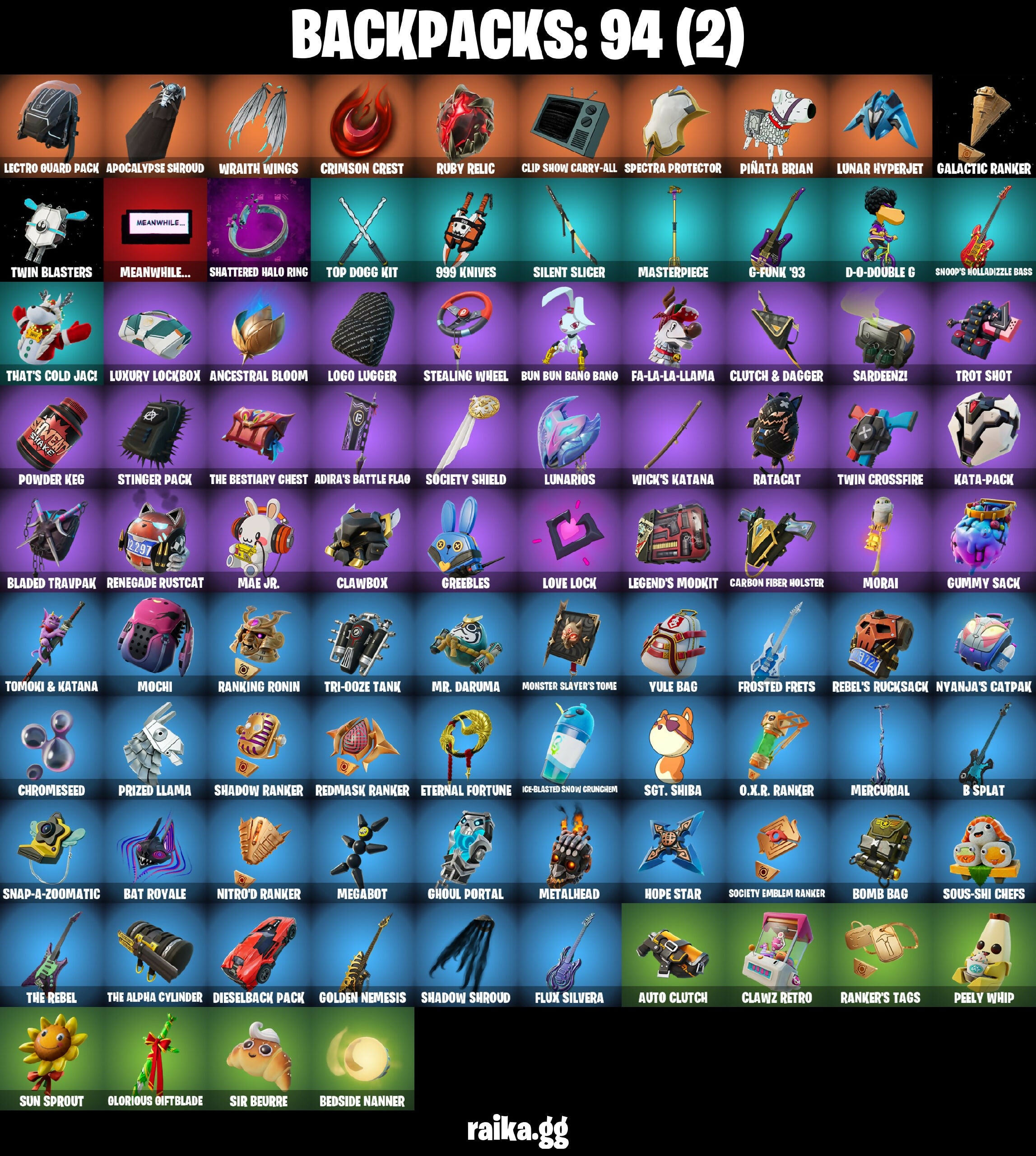 999 Knives, Adira's Battle Flag, Aerial Assault Captain, Ahsoka Tano, Ahsoka's Staff, Ancestral Bloom, Apocalypse Shroud, Arachrobatics, Arctic Adeline, Auto Clutch, Axe-O, B Splat, Bachii, Backup Blades, Bat Royale, Baymax Wings, Beatzbunny, Bedside Nanner, Beep & Boop, Black Ops Sword, Blade Of The Waning Moon, Bladed Travpak, Blades Of Light, Blizzabelle, Bomb Bag, Boogie Down, Bronzed Scimitars, Bubbloon, Bun Bun Bang Bang, Burning Ambition Valeria, Bytes (Lone Traveler), Carbon Fiber Holster, Card Drop, Catwoman's Grappling Claw, Celebratory Slice, Choice Knit, Chromebrella, Chromeseed, Chromestruck Fire, Clash, Clawbox, Clawz Retro, Cliffside Soarer, Clip Show Carry-All, Clutch & Dagger, Collector Kado Thorne, Comfy Cats, Competitor's Time Brella, Cozy Jonesy, Crack It, Crescent Shroom, Crimson Crest, Crimson Polestar, Crowning Achievement, Cyclo Curl, Cymitar, D-O-Double G, Dagger Dance, Daigo's Claws, Death Star 'brella, Diamond Throne, Diamondclaw Picker, Dice Roll, Dieselback Pack, Do The 'Split, Dogg Treat, Don't Start Now, Doze Dab, Duelist's Foil, Dumbbell Driver, Durrr Taisho, Eclipse Brella, Eclipsed Edges, Electro Pairing Blades, Elegance Blade, Elite Servo, Ember Pick, Enchanted Lifebloom, Epic Blade Of Floof, Eternal Fortune, Explorer Emilie, Fa-La-La-Llama, Fancy Peter Griffin, Fishbone Flayer, Fist Bump, Flaky Feast, Flashback Breakdown, Flight Risk, Flux Silvera, Foil Flex, Frostburn, Frosted Frets, G-Funk '93, Galactic Ranker, Ghoul Portal, Gilded Naginata, Gilded Pinscher, Glorious Giftblade, Golden Nemesis, Grand Glacier Glider, Greebles, Grizzly Gooper, Guardian Jade, Guff Gringle, Gummy Sack, Gwen's Spiderchute, Har-Har-Har!, Harbinger Armor Omeadorx, Harley Hitter, Haven, Heart Sign, Heartburst, Helichopper, High Society Glider, Holiday Boxy, Holly Hatchets, Hope, Hope Star, Hot Slurp Balloon, Humbug Slicer, I'm A Mystery, Ice Breaker, Ice-Blasted Snow Cruncher, Imperial March, Invisible Cut, It Is Finished, Jazz Hands, Jet Signals, Jolly Jammer, K.O. Cruiser, Kata-Pack, Kendo, King Wings, Kintsugi Daigo, Knife Sharpener, Knight's Treachery, Krisabelle, LBC '93 Dogg, Lady of Cranes, Laser Focused, Lectro Guard Pack, Lectrostatic Impactor, Legend's Modkit, Legendary Blade Of Insight, Lennox Rose, Lil' Longboat, Lil' Monster, Lil' Prancer, Lil' T-6 Shuttle, Lil' Tank, Llaminator, Logo Lugger, Love It!, Love Lock, Lt. John Llama, Lunar Charge, Lunar Defender, Lunar Hyperjet, Lunar Skyspan, Lunarios, Luxury Lockbox, Mae Jr., Magnorepulsor Board, Make A Seat, Mask of Balance, Masterpiece, Meanwhile..., Megabot, Meow Skulls, Mercurial, Metalhead, Microbot Mallet, Min-Joon, Minato Hakaru, Mochi, Monster Slayer's Tome, Morai, Mr. Dappermint, Mr. Daruma, Nanner Bashers, Neko Claws, Neko Hatsune Miku, Night Kama, Ninja Stance: Leo, Nisha, Nitro'd Ranker, Nog Ops, Nolan Chance, Nomad's Drifter, Nyanja, Nyanja's Catpak, O.X.R. Ranker, Omg I Love It, Oopsy Drones-V, Paradigm (Aurelian), Peely Whip, Peppermint Paraglider, Perfect Pivot, Petercopter, Pit Faller, Pitcycle, Piñata Brian, Poacher's Regrets, Point & Shoot, Polar Peely, Polysynth Kite, Powder Keg, Premiere Poms, Prized Llama, Protector Kaito, Punk Powerglider, Puppet Dance, Qrriz (Wild Beary Qrriz), Raider's Wayfarer, Ranker's Tags, Ranking Ronin, Ratacat, Ratacat Roamer, Raven Team Syd, Rebel Brella, Rebel's Rucksack, Recon Expert, Red Card, Redline Scout, Redmask Ranker, Reef Cake Fish Thicc, Remix 'brella, Renegade Racer, Renegade Raider, Renegade Reaver, Renegade Rider, Renegade Rustcat, Revenant Rider, Rocket Wrecker, Ronin, Rose Light Daggers, Rough Cut Montague, Royale Rider, Ruby Relic, Runway Racer, Samurai Baymax, Santa Dogg, Sardeenz!, Scarlet Longboard, Scorecard, Scratchmark Shredder, Secret Scimitars, Sentinel, Seven Signet, Sgt. Shiba, Shadow Blade Hope, Shadow Ranker, Shadow Shroud, Shamisen-Sational, Shanta, Shattered Halo Ring, Shock Brawler Oscar, Shogun 'brella, Show 'Em Off, Sigil Of The Empire, Silent Slicer, Sir Beurre, Skele-Dance, Skeleglider, Skellshark, Skerran, Slayer Juice Wrld, Sled Ready Guff, Sledgecracker, Slider, Snap-A-Zoomatic, Snoop's Holladizzle Bass, Snowplower, Snowsuited, Snowtooth, Society Emblem Ranker, Society Shield, Solid Snake, Sous-Shi Chefs, Spectra Knight, Spectra Protector, Spectra Slasher, Spellwork Scimitar, Spider Snare, Spider-Gwen, Spikebat, Spin-It Slicer, Spinal Slicer, Spirit Strider, Star Wand, Stealing Wheel, Stinger Pack, Storm Crash, Stun Knife, Sultura, Sun Sprout, Sundae Glider, Surfin' Bird, Sweet!, Swole Sailer, Tactical Geoms, Take A 'Bow, Tat Axe, Team Mech, That's Cold Jac!, The Alpha Cylinder, The Axe Of Champions 2.0, The Bestiary Chest, The Break Shot, The Dip, The Greenest Onion, The Iconoclast, The Imagined Blade, The Nothing's Gift, The Original Bonk Bunny, The Peerless Parasol, The Rebel, The Rezzbrella, The Scratcher, The Soaring Crescent, The Takedown, The Umbrella, Time Breaker Lil Split, Time Breaker Renegade Lynx, Time Brella, Tomoki & Katana, Top Dogg Kit, Traditional Khaby, Tri-Ooze Tank, Trot Shot, Turbulent Blade, Twin Blasters, Twin Crossfire, Twyn, Unchained Ramirez, Utility Claymore, Vengeance Jones, Victory Vaunter, Wick's Katana, Wilderspear, Winter's Onslaught, Winterfest Bushranger, Wintry Whirligig, Wooly Mammoth, Wraith Commander, Wraith Wings, Wrath & Sorrow, Wyvern X77, Yarn Ball, Yellow Diamond Antonia, Yellow Diamond Mae, Yellow Diamond Piper Pace, Yule Bag, Yulejacket, Zoe Clash