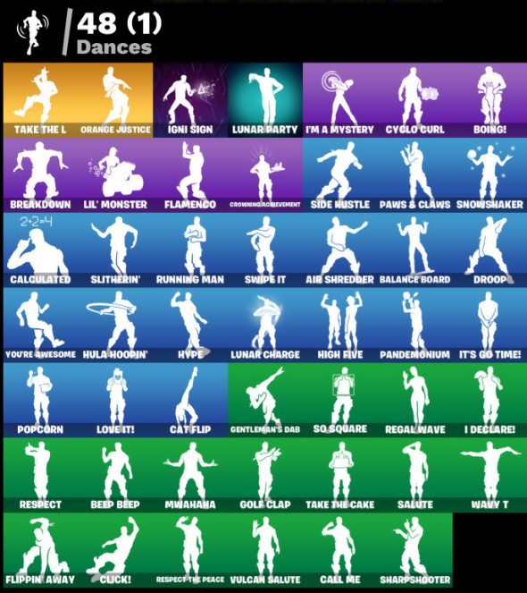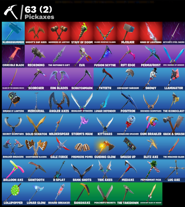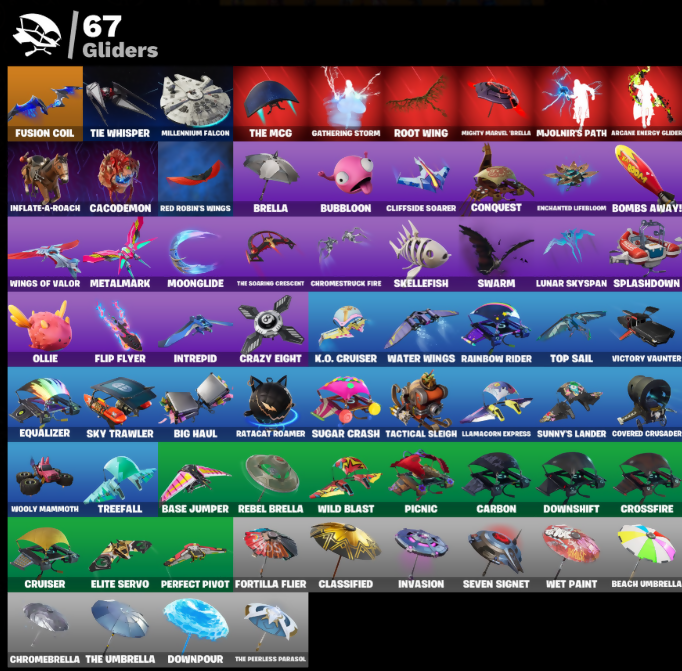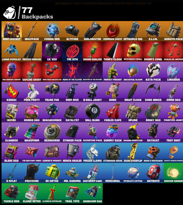 2020 Kickflip, 8-Ball Janky, 8-Ball vs Scratch, A.I.M., Adventure Pack, Agent Peely, Air Shredder, Altitude, Ancestral Bloom, Angler Axes, Antidote, Arcane Energy Glider, Arroyo Pack, Astro, B Splat, Balance Board, Ball Bling, Balloon Axe, Banana Briefcase, Bananaxe, Bank Shots, Base Jumper, Basecamp Bag, Battlehawk, Beach Umbrella, Beachcomber, Bedside Nanner, Beep Beep, Big Haul, Birthday Cake, Blade Bag, Blade of The Evening Road, Blitz Axe, Board Breaker, Bobo, Bogey Bag, Boing!, Bombs Away!, Boulder Breakers, Breakdown, Brella, Bronzed Scimitars, Brutus, Bubbloon, Bytes, Cacodemon, Calamity, Calculated, Call Me, Cameo vs Chic, Carbide, Carbon, Cat Flip, Catalyst, Chromebrella, Chromestruck Fire, Classified, Clawbox, Clawz Retro, Cliffside Soarer, Cluck!, Conquest, Covered Crusader, Crazy Eight, Crescent Shroom, Crimson Crest, Crossfire, Crucible Blade, Cruiser, Cyclo Curl, DJ Yonder, Deadpool, Deep Dive, Dire, Doctor Doom, Doom Chalice, Doom Slayer, Doom's Cowl, Downpour, Downshift, Drift, Droop, Dusk, Dusk Wings, E.L.I.M., Elite Servo, Enchanted Lifebloom, Enforcer, Eon Blades, Equalizer, Eva, Fable, Fabled Cape, Fade, Feline Fun, Fishstick Janky, Flamenco, Flip Flyer, Flippin' Away, Fortilla Flier, Frozen Shroud, Fusion, Fusion Coil, Fusion Orb, Fusion Scythe, Gale Force, Gathering Storm, Gear Specialist Maya, Gentleman's Dab, Geralt of Rivia, Giddy-Up, Gilded Morphic Blades, Glorious Giftblade, Golf Clap, Goodie Bag, Grind Bag, Groot, Groots Sap Axes, Guiding Glow, Gum Brawler, Gumbo, Gummy Sack, Hack & Smash, Hammers of Justice, Hand of Lightning, Haven, Hench Hauler, High Five, Highlight Strikers, Holiday Boxy, Hope, Hula Hoopin', Huntress, Hype, I Declare!, I'm A Mystery, Igni Sign, Inflate-A-Roach, Intrepid, Invasion, Iron Man Backplate, It's Go Time!, Jennifer Walters, Journey vs Hazard, K.O. Cruiser, Kabag!, Kata-Pack, Kittanas, Legend's Modkit, Legendary Blade of Insight, Lil' Kev, Lil' Monster, Llamacorn Express, Llaminator, Lollipopper, Love It!, Lt. Evergreen, Lt. John Llama, Lug Axe, Lunar Charge, Lunar Defender, Lunar Glow, Lunar Hyperjet, Lunar Party, Lunar Skyspan, Lunarios, Lynx, Mark of the Slayer, Massai, Medaxe, Meowscles, Mercurial, Metalmark, Mighty Marvel 'Brella, Millennium Falcon, Mission Specialist, Mjolnir, Mjolnir's Path, Moonglide, Mr. Daruma, Mwahaha, Mystique, Mystique's Skull, Night Cloak, Nightshade, Nyanja's Catpak, Ocean, Offworld Rig, Ollie, Orange Justice, Oscar, Pandemonium, Paradigm (Reality-858), Paws & Claws, Peppermint Pick, Perfect Pivot, Perfect Present, Permafrost, Picnic, Poacher's Regrets, Pool Party, Popcorn, Positron, Precision, Premiere Poms, Prized Llama, Ragnarok, Rainbow Rider, Ratacat, Ratacat Roamer, Re-Gifter, Rearguard, Rebel Brella, Rebel's Rucksack, Reckoning, Red Robin's Wings, Redline, Regal Wave, Remedy vs Toxin, Respect, Respect The Peace, Rift Edge, Rippley vs Sludge, Rogue Agent, Ronin, Rook, Root Wing, Running Man, Rust Bucket, Rust Lord, Salute, Sapling Groot, Sawtooth, Scales of Justice, Scorcher, Scratchmark, Scuba Jonesy, Secret Scimitars, Selene, Seven Signet, Sgt. Winter, Shanta, Sharpshooter, Shortbread Slicers, Side Hustle, Skellefish, Sky Trawler, Sledgehammer, Slitherin', Sludgehammer, Smash O'-Lantern, Smash Up, Snowglobe Smasher, Snowshaker, Snowy, So Square, Society Emblem Banner, Solid Scratch, Splashdown, Squad Leader, Staff of Doom, Standard Issue, Stinger Pack, Storm, Storm's Maw, Subjugator, Sugar Crash, Sun Strider, Sunny's Lander, Swarm, Swipe It, Tackle Box, Tactical Sleigh, Take The Cake, Take The L, Teknique, The Bestiary Chest, The Foundation, The Iconoclast, The Imagined Blade, The Mcg, The Nothing's Gift, The Peerless Parasol, The Sith, The Soaring Crescent, The Takedown, The Umbrella, The Visitor, Thor, Thor's Cloak, Tide Axes, Tie Whisper, Tnteeth, Tntina, Top Sail, Trail Tote, Treefall, Trot Shot, Turk vs Riptide, Uplink, Valor, Vengeance Jones, Victory Vaunter, Vulcan Salute, Water Wings, Waveform, Wavy T, Weapons of the Witcher, Wet Paint, Wild Blast, Wilderspear, Wingman, Wings of Valor, Winterfest Bushranger, Witcher's Steel Sword, Wolfpack, Wolverine, Wolverine's Trophy, Wooly Mammoth, Wooly Warrior, You're Awesome, Zenith, Zoey