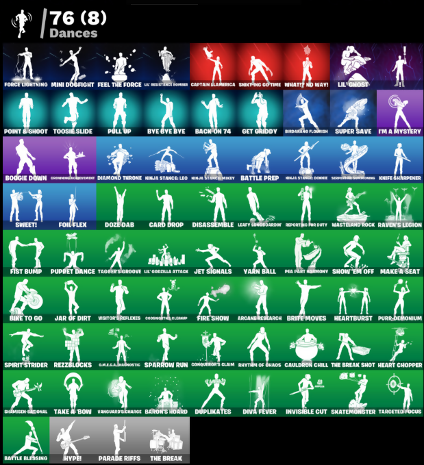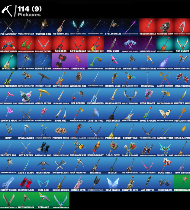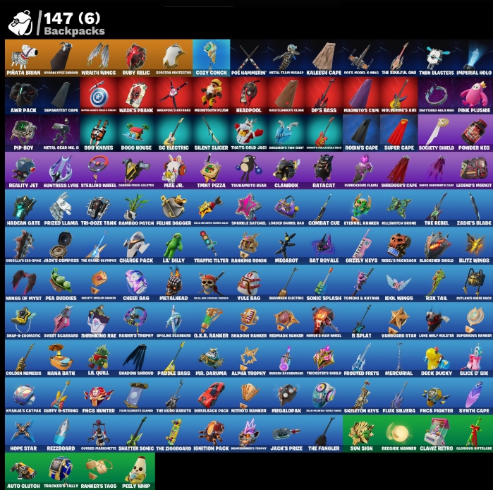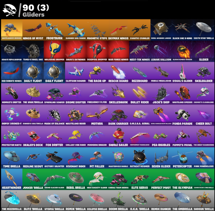 1-Ball, 999 Knives, Aero Axe, Agent Patch, Air Pack, Alpha Trophy, Apex Predator, Apocalypse Shroud, Apprentice Evie, Arcane Research, Assaultron Blade, Auto Clutch, B Splat, Back On 74, Backroom Medmo Victory, Backup Blades, Bamboo Patch, Bamboo-Tana, Baron's Hoard, Bat Royale, Battle Blessing, Battle Prep, Baymax Wings, Bedside Banner, Berserker's Two-Shot, Bike To Go, Birdarking Flourish, Birthday Basher, Bitey, Black One X-Wing, Blackened Shield, Blades of Light, Blitz 'Brella, Blitz Wings, Bolt Blades, Bomb Bouquet, Boogie Down, Boomer's Bones, Brilliant Cutters, Brite Moves, Brite Raider, Bullet Rider, Bye Bye Bye, Cactus Club, Captain America's Shield, Captain Slamerica, Carbon Fiber Holster, Card Drop, Cauldron Chill, Chaos Director, Chaotic Crawler, Charge Pack, Cheer Bag, Cheer Bolt, Chemist's Cloudglider, Chillest Vibe Rider, Clang & Basher, Clawbox, Clawz Retro, Cliffside Soarer, Cogsworth's Cleanup, Color Splash Jellie, Combat Cue, Competitor's Time Brella, Conqueror's Axe, Conqueror's Claim, Cozy Conch, Crowning Achievement, Crystal Fang, Crystal Smasher, Cuddle Carvers, Cuddle Team Sierra, Cuddle Team Specialist, Cursed Jack Sparrow, DP's Bass, DP's Katanas, Daigo, Daigo's Claws, Daily Flight, Dark Charger, Darkfire Claws, Deadpool (Pen & Ink), Deadpool Dropper, Dealer's Deck, Death Star 'Brella, Deck Ducky, Diamond Throne, Diamondclaw Pickar, Dieselback Pack, Disassemble, Diva Fever, Dogg House, Dogg Treat, Don's Dominator, Doom Brella, Doze Dab, Drome Drifter, Duelist's Foil, Dumbbell Driver, Dupli-Kate, Duplicates, Duplicating Batons, Dusk Knight, Dynamo TNTina, Eclipse Brella, Electro Flaming Blades, Elegant Crowbar, Elite Servo, Ember Pick, Emperor Palpatine, Energy Sword, Epic Blade of Floof, Eternal Ranker, FNCS Fighter, FNCS Hunter, Feel The Force, Felina, Felina's Claw, Feline Dagger, Fiendish Wands, Fire Show, Fireworks Rocket, Fist Bump, Flux Silveira, Flux Silvera, Foil Flex, Force Lightning, Four Elements Banner, Fox Drifter, Frequency Flyer, Frostburn, Frosted Frets, Furrocious Flame, General Grievous, Get Griddy, Ghost's Obfuscate Blades, Glorious Giftable, Godzilla Evolved, Golden Nemesis, Golden Scythe, Gorilla’s Egg Spin Bike, Grand Glacier Glider, Grizzly Keys, Grzzly Keys, Guffy 6-String, Guffy G-String, Hadean Gate, Hairpin, Haylee Skye, Headpool, Heart Chopper, Heart's Carver, Heartburst, Heartwinder, Hero Baymax, High Society Glider, Holiday Boxy, Homegrown Flail, Hope, Hope Star, Horde's War Wheel, Hot Pokers, Humbug Slicer, Hunter's Knife, Huntress Lyre, Hydraulic Slammer, Hype!, I'm A Mystery, I.M.E.C.A. Suit Alpha, Idol Wings, Ignition Pack, Illusionist's Blades, Imperial Holo, Invisible Cut, Jack Sheridan's Saber, Jack Sparrow, Jack's Compass, Jack's Cutlass and Saber, Jack's Prize, Jack's Ship, Jade, Jar Buster, Jar Of Dirt, Jet Signals, Junker 'Brella, Kaleesh Cape, Kendo, Killswitch, Killswitch Drone, Klassic Combat Grabber, Knife Sharpener, Knight Conqueror, Leafy Longboardin', League Balloon, Legend's Modkit, Lightrider, Lil' Dilly, Lil' Ghost, Lil' Godzilla Attack, Lil' Quill, Loaded Barrel Bag, Lockwoods Katana, Lone Wolf Holster, Lt. Resistance Bomber, Magnetic Steps, Magnetized Scrap, Magneto's Cape, Maje Jr., Make A Seat, Mark 46 Energy Blades, Mask of Balance, Masterpiece Bubble, Megabot, Megalo Don, Megalopalax, Meghoton Plushie, Meowdas, Mercurial, Metal Gear MK II, Metal Team Mishap, Metalhead, Microbot Mallet, Mini Dogfight, Mobile Megalodon, Montague, Moogle's Balloon, Moonbow Breezer, Morgan Myst, Mothra, Mr. Daruma, Nana Bath, Nanner Bashers, Neko Claws, Neon Reaver, Night Kama, Ninja Stance: Donnie, Ninja Stance: Leo, Ninja Stance: Mikey, Nisha, Nitro'D Ranker, Nomad's Drifter, Nyanja, Nyanjas Catpak, O-M Gloves!, O.M.E.G.A. Aerial, O.M.E.G.A. Spear, O.M.G.! A Diagnostic, O.X.R. 'Brella, O.X.R. Ranker, Oopsy Drones-V, Opaline Scabbard, Opaline Slashers, Oscar, Oursed Marionette, Outlan's Core Bear, Outlaw's Warpawns, Paddle Bass, Paint Pummellers, Palpatine's Cane, Panda Parade, Parade Riffs, Pea Buddies, Pea Part Harmony, Pea-Rigibles, Peabody, Peely Whip, Peppermint Paraglider, Perfect Pivot, Peter Griffin, Petercopter, Phantom Meowscles, Pink Plushie, Pip-Boy, Pit Faller, Piñata Brian, Poacher's Regrets, Poe Dameron, Poe Hammerin', Point & Shoot, Poots Model X King, Powder Keg, Premiere Poms, Prized Llama, Protector Kaito, Pull Up, Punk Powerglider, Puppet Dance, Puppet's Prowl, Purr Demonium, Quickslash Baton Spear, R3X Tail, Raider's Trophy, Ranker's Tags, Ranker's Vaultbrella, Ranking Ronin, Ratacat, Ratcat Roamer, Raven's Legion, Reality Jet, Rebel Brella, Rebel Wookie Lander, Rebel's Rucksack, Red Robin's Wings, Redline Scout, Redmask Ranker, Remix 'Brella, Remix Ranker, Reporting For Duty, Rescue Board, Revenant Rider, Rezz Blocks, Rezz-Arc, Rezzboard, Rhythm Of Chaos, Riftbreaker's Edge, Ringmaster Scarr, Robin, Robin's Cape, Robin's Staff, Rose Thorns, Ruby Reci, Runes Background, Runway Racer, Rust, S-Foil Scrapaxe, SC Electric, Santa Dogg, Sea Bobber, Secret Scimitars, Senate Repulsorpod, Separatist Cape, Serpentine Snakening, Seven Glider, Shadow Blade Hope, Shadow Ranker, Shadow Shroud, Shadow's Steels Culls, Shamisen-Sational, Shamsen Electric, Sharisen Electro, Shatter Sonic, Shogun 'Brella, Show 'Em Off, Shredder, Shredder's Cape, Shrinking Rae, Shuri's Skywings, Silent Slicer, Skate Monster, Skeleglider, Skeleton Keys, Skelleshark, Slayer Juice Wrld, Slice O' Six, Slider, Smithysea Hold, Snap-A-Domatic, Snikt-ing Go Time, Snoop Dogg, Society Emblem Banner, Society Shield, Solid Snake, Sonic Splash, Soundwave Slashers, Sparkle Diva, Sparkle Satchel, Sparkling Soarer, Sparkling Star, Sparrow Run, Spectra Protector, Spike Mic, Spiked Baton-Rage, Spinal Slicer, Spirit Strider, Stealing Wheel, Storm's Maw, Street Wave Teknique, Streetwear Yuji Itadori, Stun Knife, Sub-Zero's Battle Axes, Summer Sail Shark, Sun Sign, Super Cape, Super Save, Super Shredder's Cape, Superman, Supernova Ranker, Sweet Scabbard, Swee