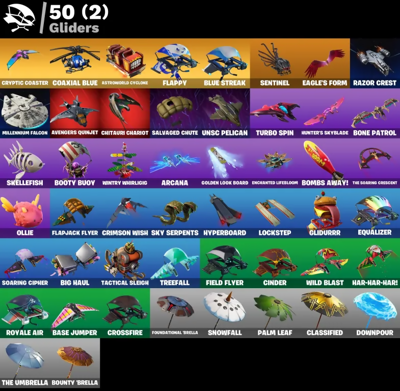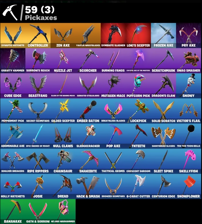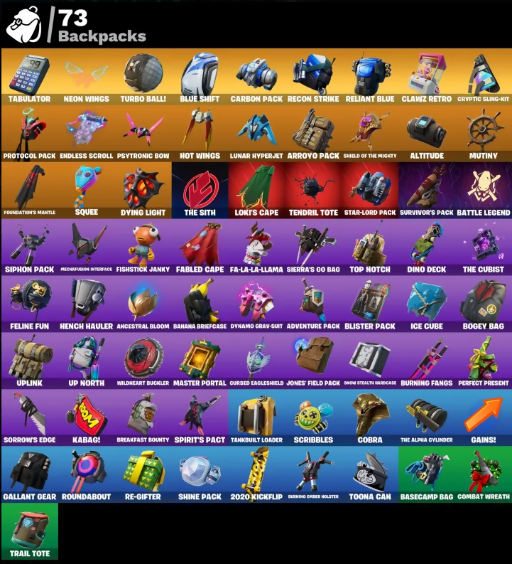 2020 Kickflip, Abominable Axe, Adventure Pack, Agent Jones (Jump 31), Agent Peely, Alli, Altitude, Ancestral Bloom, Arcana, Arctic Adeline, Arroyo Pack, Astroworld Cyclone, Avengers Quinjet, Banana Briefcase, Bananaxe, Base Jumper, Basecamp Bag, Battle Legend, Beastfang, Beep Beep, Bhangra Boogie, Big Haul, Blackheart (Stage 8), Blade Of The Waning Moon, Blister Pack, Blue Shift, Blue Streak, Blue Striker, Blue Team Leader, Bogey Bag, Bombs Away!, Bone Patrol, Boogie Down, Boomin', Booty Buoy, Boulder Breakers, Bounty 'Brella, Breakfast Bounty, Breathless Blades, Bronzed Scimitars, Brutus, Bunker Jonesy, Burning Ember Holster, Burning Fangs, Call Me, Carbon Commando, Carbon Pack, Cardistry, Cat Flip, Centurion, Centurion Edge, Chainsaur, Chaos Origins (Shadow), Chitauri Chariot, Choice Knit, Cinder, Classified, Clawz Retro, Clean Sweep, Cluck Strut, Coaxial Blue, Cobra, Combat Wreath, Conga, Controller, Crescent Shroom, Crimson Wish, Crossfire, Cryptic Coaster, Cryptic Sling-Kit, Crystal Axe Of The Masters, Cube Assassin, Cube Edge, Cursed Eagleshield, Deadpool, Deimos, Diamond Diva, Diamond Hanz, Dino Deck, Downpour, Dragon Stance, Dragon's Claw, Dread, Dying Light, Dynamo Grav-Suit, Eagle's Form, Electro Swing, Ember (Night), Ember Baton, Enchanted Lifebloom, Endless Scroll, Epic Sword Of Might, Equalizer, Evasive Maneuvers, Fa-La-La-Llama, Fabled Cape, Feline Fun, Field Flyer, Fishstick Janky, Flapjack Flyer, Flappy, Foundation's Mantle, Foundational 'Brella, Frozen Axe, G-Carat Cutter, Gains!, Gallant Gear, Gear Specialist Maya, Gentleman's Dab, Get Funky, Gilded Scepter, Glidurrr, Golden Look Board, Gole Clap, Gravity Hammer, Hack & Smash, Har-Har-Har!, Headbanger, Hello Friend, Hench Hauler, Holly Hatchets, Hot Marat, Hot Wings, Howl, Hunter's Skyblade, Hybrid (Stage 4), Hyperboard, Ice Cube, Infinite Dab, Iris, Jones' Field Pack, Josie, Jun-Hwan, Kabag!, Kondor, Krisabelle, Kymera, Lara Croft, Lexa (Warstrike), Lil' Prancer, Lil' Warthog, Llambro, Lockpick, Lockstep, Loki Laufeyson, Loki's Cape, Loki's Scepter, Lt. Evergreen, Lunar Charge, Lunar Hyperjet, Machinist Mina, Mandalorian, Mangcake, Mashed Potato, Master Chief (Matte Black), Master Key, Master Portal, Mave (Reactive Hair Off), Mecha Cuddle Master, Mechafusion Interface, Meowscles, Mic Drop, Millennium Falcon, Min-Joon, Mutagen Mace, Mutiny, Nana Nana, Ne'jari Warhammer, Neon Wings, Never Gonna, Null Claws, Nuzzle Jet, Oath & Sorrow, Ollie, Out West, Palm Leaf, Pandemonium, Paws & Claws, Peace Out, Peely, Peppermint Pick, Perfect Present, Point Patroller, Polar Peely, Pop Axe, Powder (White), Predator, Prodigy, Protocol Pack, Pry Axe, Psytronic Bow, Puffcorn Pick, Pull Up, Razor Crest, Re-Gifter, Recon Strike, Reese, Regal Wave, Reliant Blue, Respect The Peace, Ripe Rippers, Ronin, Roundabout, Rox (Stage 5), Royale Air, Ruin, Salvaged Chute, Scorcher, Scratchmark, Scribbles, Secret Scimitars, Sentinel, Serrated Steelblades, Sgt. Winter Headgear, Shanta, Shield Of The Mighty, Shimmer, Shine Pack, Shortbread Slicers, Side Hustle, Sidewinder (Dark), Sierra (Gold), Sierra's Go Bag, Sing Along, Siphon Pack, Skellefish, Skellyfish, Sky Serpents, Sled Ready Guff, Sledgecracker, Sleet Spike, Snakebite, Snare Solo, Snoozefest, Snow Stealth Hardcase, Snow Stealth Slone, Snowfall, Snowplower, Snowshaker, Snowy, Soaring Cipher, Solid Scratch, Sorrow's Edge, Sorrow's Reach, Spirit's Pact, Squee, Star-Lord Outfit, Star-Lord Pack, Subzero Cryptic, Summer Skye, Summit Striker, Survivor's Pack, Swag Smasher, Symbiote Slasher, Synaptic Hatchets, Tabulator, Tactical Geoms, Tactical Sleigh, Take The Elf, Tankbuilt Loader, Ten-Ton Toon-Bells, Tendril Tote, The Alpha Cylinder, The Cubist, The Sith, The Soaring Crescent, The Umbrella, Tnteeth, Tntina, Toon Meowscles, Toona Can, Top Notch, Trail Tote, Treefall, Trilogy, Trog (Tribal), Turbo Ball!, Turbo Spin, Unsc Pelican, Up North, Uplink, Vautja Wristblades, Vegeta, Venom, Victor's Flail, Vivi Chroma, Wanna See Me, Wild Blast, Wildheart Buckler, Wingman, Wintry Whirligig, Wooly Warrior, Yay!, Zen Axe, Zenith (Stage 4)