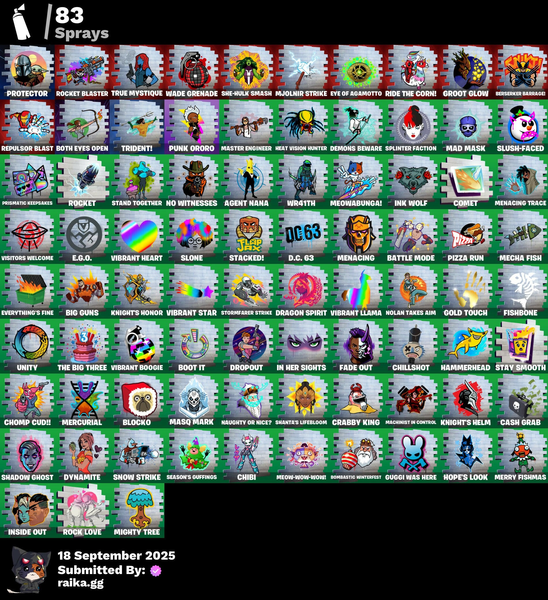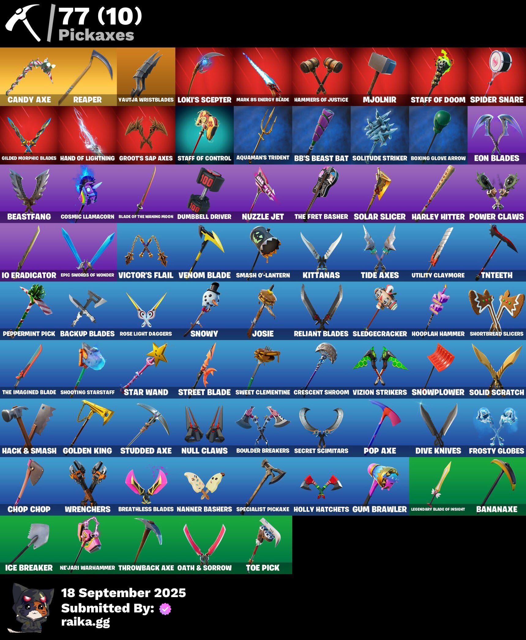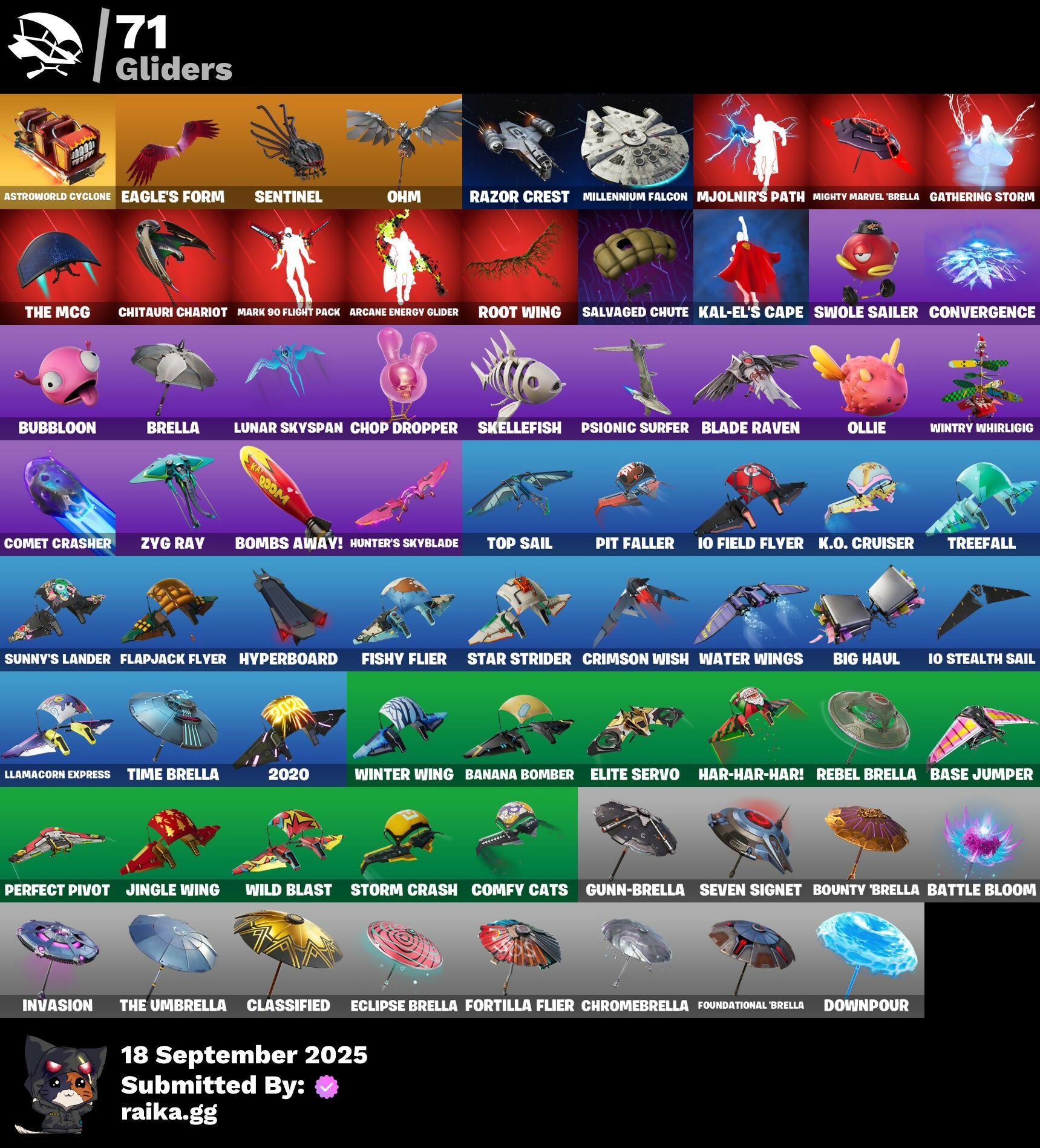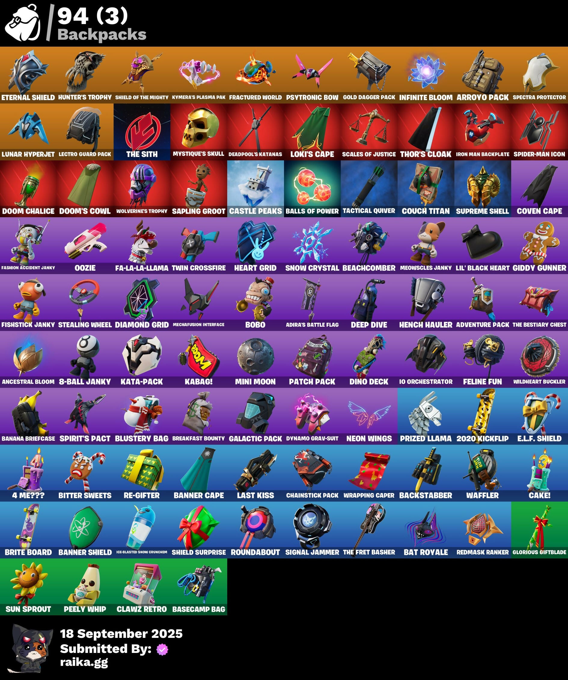 2020, 2020 Kickflip, 4 Me???, 8-Ball Janky, A Warrior Prepares, Abduction, Adira's Armor, Adira's Battle Flag, Adventure Pack, Afterparty, Agent Jones, Agent Nana, Agent Peely, Air Shredder, Ancestral Bloom, Aquaman, Aquaman's Trident, Arcane Energy Glider, Arcane Steel, Arctic Adeline, Arroyo Pack, Arthur Curry, Astro Jack, Astroworld Cyclone, Aura, BB's Beast Bat, Backstabber, Backup Blades, Balls Of Power, Banana Bomber, Banana Briefcase, Bananaxe, Banner, Banner Cape, Banner Icon, Banner Shield, Base Jumper, Basecamp Bag, Bat Royale, Batman, Battle Bloom, Battle Mode, Beach Bomber, Beachcomber, Beamers, Beast Boy, Beastfang, Beep Beep, Berserker Barrage!, Big Guns, Big Haul, Billy Bounce, Bitter Sweets, Blade Raven, Blade of the Waning Moon, Blasted, Blocko, Blustery Bag, Bobo, Bombastic Winterfest, Bombs Away!, Boomin', Boot It, Both Eyes Open, Boulder Breakers, Bounty 'Brella, Boxing Glove Arrow, Breakfast Bounty, Breakpoint, Breathless Blades, Brella, Brite Board, Brutus, Bubbloon, Bunnywolf, Bushie Bright, Buttoned Up, Bytes' Sigil, Cake!, Cakey, Calico, Call Me, Candy Axe, Cash Grab, Castle Peaks, Chainstick Pack, Chapter 2 Season 2 Level 100, Charlotte's Logo, Chibi, Chillshot, Chimichanga!, Chitauri Chariot, Choice Knit, Chomp Cud!!, Chop Chop, Chop Dropper, Choppy, Chrome Marked, Chromebrella, Classified, Clawz Retro, Clean Sweep, Cloudburst, Codename E.L.F., Coin Flip, Comet, Comet Crasher, Comfy Cats, Confetti, Controller Crew, Convergence, Cosmic Llamacorn, Cosmic Sun, Couch Titan, Coven Cape, Cowboy Chat, Crabby King, Crescent Shroom, Crimson Wish, Crowning Achievement, Cuddle Mech, Cyclo Curl, D.C. 63, Daisies, Deadpool, Deadpool Unmasked, Deadpool's Katanas, Deep Dive, Demons Beware, Denim Destiny, Diamond Grid, Dino Deck, Dive Knives, Doctor Doom, Doctor Doom (God Emperor), Doctor Slone, Dolphin, Doom Chalice, Doom's Cowl, Downpour, Dragon Rune Lances, Dragon Spirit, Dropout, Dumbbell Driver, Dynamite, Dynamo Grav-Suit, E.G.O., E.L.F. Shield, Eagle's Form, Eclipse Brella, Elite Servo, Eon Blades, Epic Swords of Wonder, Eternal Emblem, Eternal Knight, Eternal Shield, Everything's Fine, Eye Of Agamotto, Fa-la-la-llama, Face Palm, Fade, Fade Out, Falling Leaf, Fashion Accident Janky, Feline Fun, Ferocious, Fish Hook, Fishbone, Fishstick Janky, Fishy Flier, Fist, Fizzix, Flapjack Flyer, Flippin' Away, Fortilla Flier, Foundational 'Brella, Fractured World, Frost Squad, Frosty Globes, Frozen Fishstick, Frozen Nog Ops, Fryangles, Galactic Pack, Galaxia, Gathering Storm, Gear Specialist Maya, Giddy Gunner, Gilded Morphic Blades, Ginger Gunner, Gingerbread Raider, Glorious Giftblade, Gold Dagger Pack, Gold Touch, Golden King, Golden Shine, Good Guy, Grav-Fusion, Green Arrow, Gringle Gift, Groot, Groot (Silver Foil), Groot Glow, Groot's Sap Axes, Grriz, Guggi Was Here, Guggimon, Gugmon, Gum Brawler, Gumbo, Gunn-Brella, Gunnar's Special, Hack & Smash, Hammerhead, Hammers of Justice, Hand of Lightning, Hand of Trace, Happy, Har-Har-Har!, Harley Hitter, Have A Seat, Haven, Heart Grid, Heat Vision Hunter, Hench, Hench Hauler, Holiday Boxy, Holly Hatchets, Hooplah Hammer, Hope's Look, Hunter's Skyblade, Hunter's Trophy, Hyperboard, I Declare!, IO Eradicator, IO Field Flyer, IO Orchestrator, IO Stealth Sail, Ice Breaker, Ice-Blasted Snow Cruncher, In Da Party, In Her Sights, Industrious, Infinite Bloom, Ink Wolf, Inside Out, Invasion, Inventor's Choice, Iris, Iron Man, Iron Man Backplate, It Is Finished, Jennifer Walters, Jingle Wing, Joey, Josie, Jules, Jules' Mask, Jurassically Charged, K.O. Cruiser, Kabag!, Kaboom!, Kal-El's Cape, Kata-Pack, Kenshi Yonezu, Keyed Up, Kick Ups, Kit, Kittanas, Knight's Helm, Knight's Honor, Kondor, Krisabelle, Kymera, Kymera Swarm, Kymera's Plasma Pak, Laser Blaze, Last Kiss, Lectro Guard Pack, Legendary Blade of Insight, Lexa, Lexa (Warstrike), Lil' Black Heart, Lil' Prancer, Lil' Saucer, Lion's Roar, Llamacorn Express, Llion, Lobby Classic, Loki Laufeyson, Loki's Cape, Loki's Scepter, Love It!, Lt. Evergreen, Lunar Hyperjet, Lunar Skyspan, Lunarian Luxury, Machinist In Control, Mad Mask, Major Mancake, Make A Seat, Mancake, Mandalorian, Mark 85 Energy Blade, Mark 90 Flight Pack, Marsh Walk, Mashed Potato, Masked, Masq Mark, Master Engineer, Master Plan, Mave, Mave (Reactive Hair Off), Mecha Cuddle Master, Mecha Fish, Mechafusion Interface, Members Only, Menace, Menace (Challenger Menace - Flame), Menacing, Menacing Trace, Meow Skulls, Meow-Wow-Wow!, Meowabunga!, Meowscles, Meowscles Janky, Meowstermind, Mercurial, Merry Fishmas, Midas, Midas Memory, Midas' Shadow, Mighty Marvel 'Brella, Mighty Tree, Millennium Falcon, Mind Blown, Mini Moon, Mjolnir, Mjolnir Strike, Mjolnir's Path, Monks, Morphic Blue, Mudhorn, Mystique, Mystique (Tactical), Mystique's Skull, Nailed It, Nanner Bashers, Naughty Or Nice?, Ne'jari Warhammer, Neon Wings, New Year 2020, No Witnesses, Nolan Takes Aim, Null Claws, Nuzzle Jet, Oath & Sorrow, Ocean, Ocean Wave, Ohm, Ollie, Oni Mask, Oozey, Oozie, Original Issue, Pancake Posse, Pandemonium, Paradigm (Reality-659), Patch Pack, Paws & Claws, Peely Whip, Peppermint Pick, Perfect Pivot, Pit Faller, Pizza Party, Pizza Pit, Pizza Run, Planet, Planetary Vibe, Polar Peely, Polished Stone, Pop Axe, Power Claws, Predator, Prismatic Keepsakes, Prized Llama, Protector, Psionic Surfer, Psytronic Bow, Pulse Phase, Punk Ororo, Rage Quit, Rainbow Fog, Razor Crest, Re-Gifter, Reaper, Rebel Brella, Red Jade, Redmask Ranker, Reese, Reliant Blades, Repulsor Blast, Respect The Peace, Revel, Ride The Corn!, Riptide, Rock Love, Rocket, Rocket Blaster, Root Wing, Rose Light Daggers, Roses, Roundabout, Sabina's Shuriken, Salvaged Chute, Sanctum, Sap, Sapling Groot, Scales Of Justice, Scanline, Scuba Jonesy, Season's Guffings, Secret Scimitars, Seeker, Sentinel, Seven Signet, Shadow Ghost, Shanta's Lifebloom, Shaolin Sip, She-Hulk Smash, Shield Of The Mighty, Shield Surprise, Shooting Starstaff, Shortbread Slicers, Side Hustle, Sidewayfarer, Sigil Red,