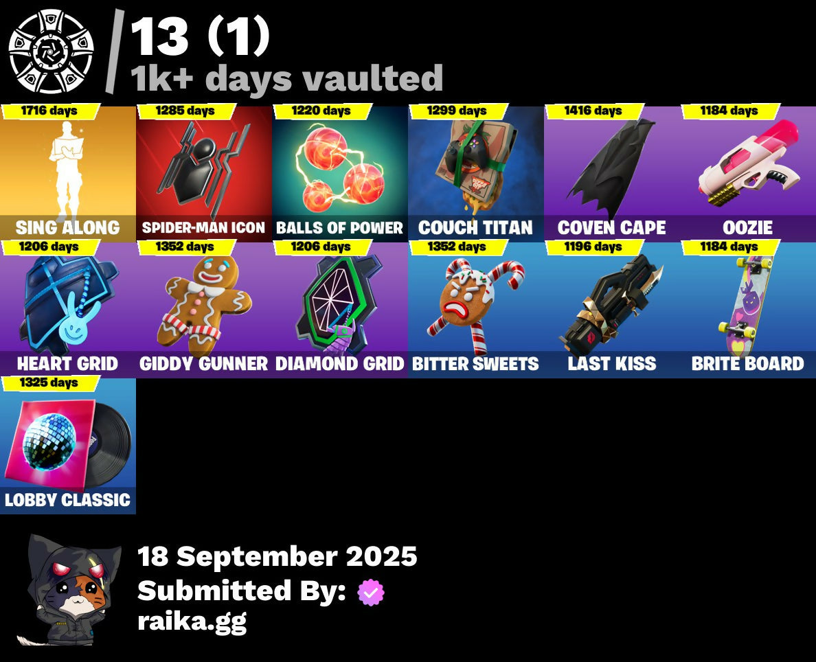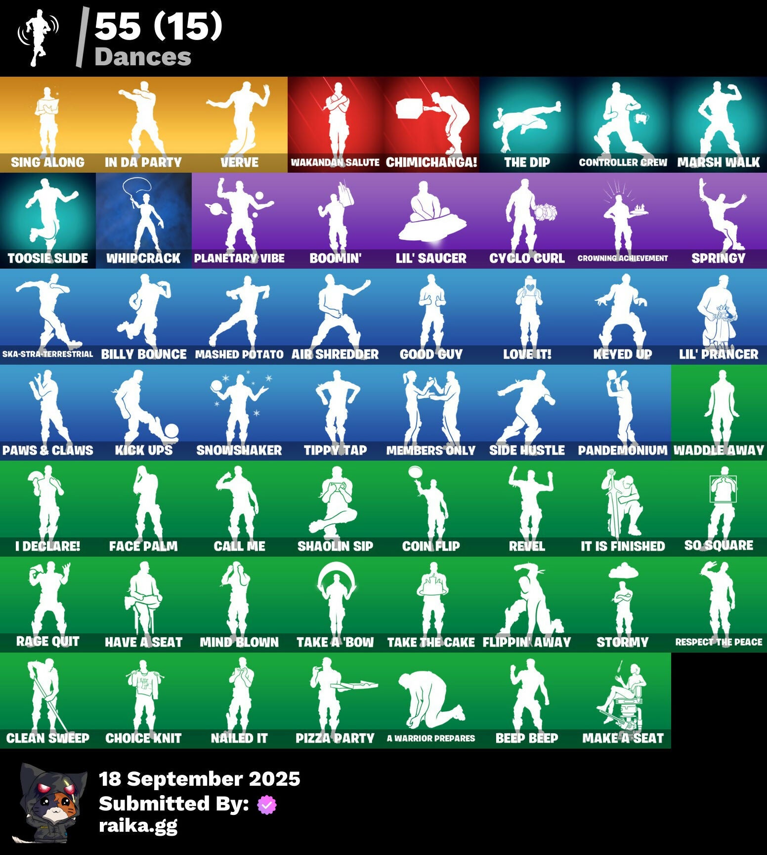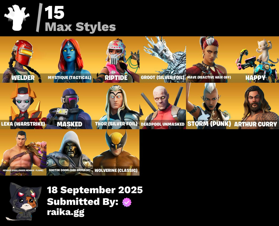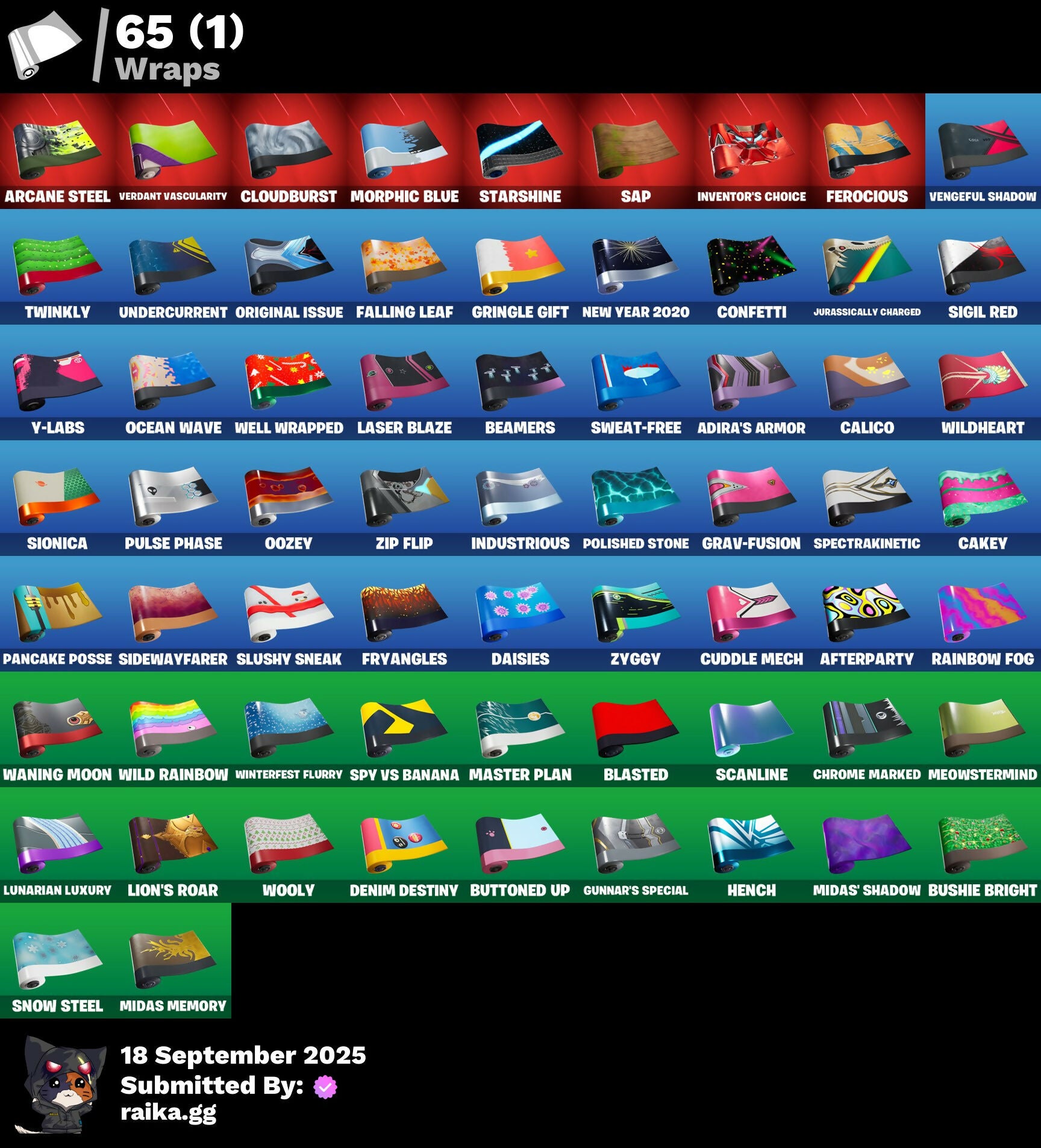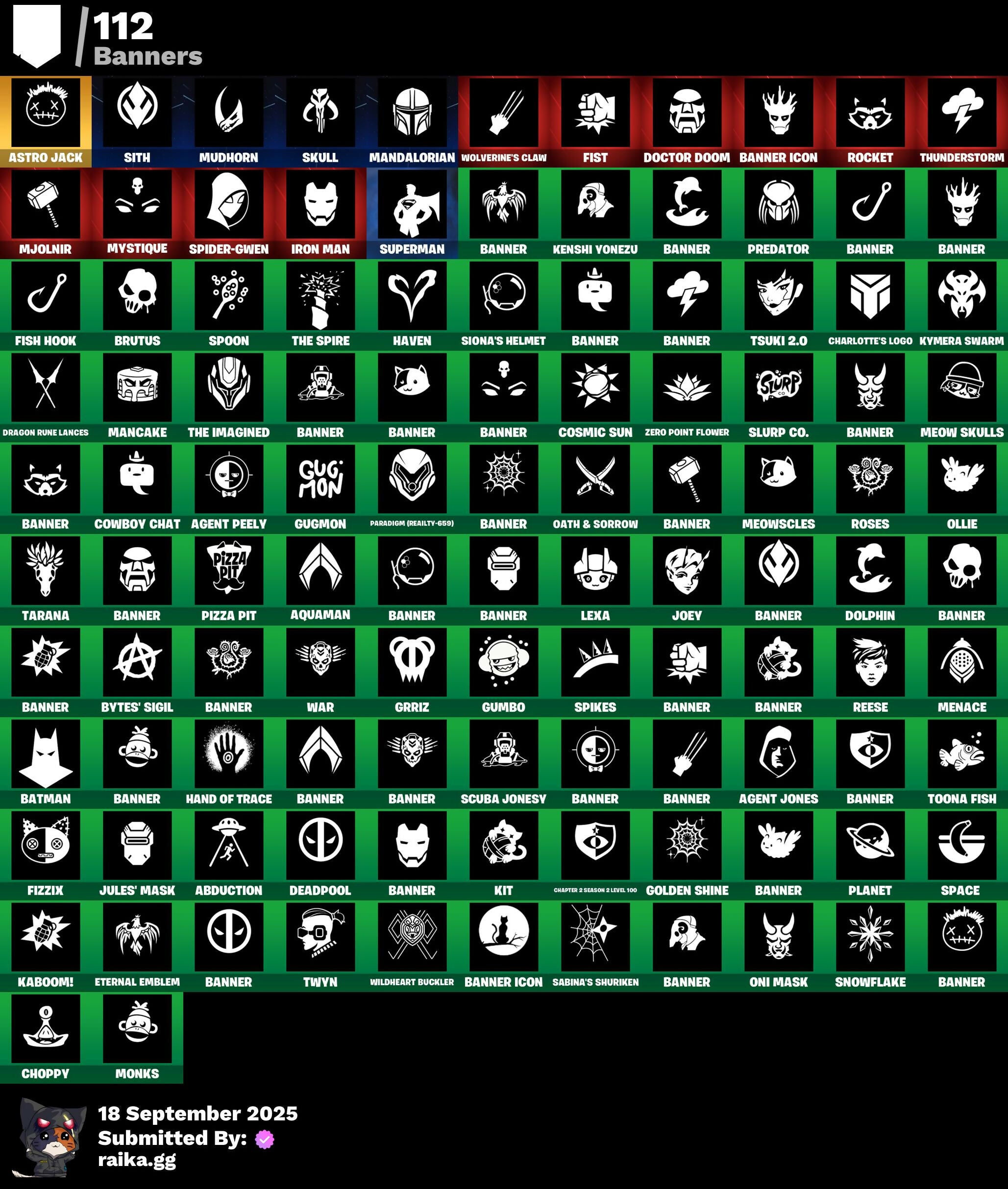 2020, 2020 Kickflip, 4 Me???, 8-Ball Janky, A Warrior Prepares, Abduction, Adira's Armor, Adira's Battle Flag, Adventure Pack, Afterparty, Agent Jones, Agent Nana, Agent Peely, Air Shredder, Ancestral Bloom, Aquaman, Aquaman's Trident, Arcane Energy Glider, Arcane Steel, Arctic Adeline, Arroyo Pack, Arthur Curry, Astro Jack, Astroworld Cyclone, Aura, BB's Beast Bat, Backstabber, Backup Blades, Balls Of Power, Banana Bomber, Banana Briefcase, Bananaxe, Banner, Banner Cape, Banner Icon, Banner Shield, Base Jumper, Basecamp Bag, Bat Royale, Batman, Battle Bloom, Battle Mode, Beach Bomber, Beachcomber, Beamers, Beast Boy, Beastfang, Beep Beep, Berserker Barrage!, Big Guns, Big Haul, Billy Bounce, Bitter Sweets, Blade Raven, Blade of the Waning Moon, Blasted, Blocko, Blustery Bag, Bobo, Bombastic Winterfest, Bombs Away!, Boomin', Boot It, Both Eyes Open, Boulder Breakers, Bounty 'Brella, Boxing Glove Arrow, Breakfast Bounty, Breakpoint, Breathless Blades, Brella, Brite Board, Brutus, Bubbloon, Bunnywolf, Bushie Bright, Buttoned Up, Bytes' Sigil, Cake!, Cakey, Calico, Call Me, Candy Axe, Cash Grab, Castle Peaks, Chainstick Pack, Chapter 2 Season 2 Level 100, Charlotte's Logo, Chibi, Chillshot, Chimichanga!, Chitauri Chariot, Choice Knit, Chomp Cud!!, Chop Chop, Chop Dropper, Choppy, Chrome Marked, Chromebrella, Classified, Clawz Retro, Clean Sweep, Cloudburst, Codename E.L.F., Coin Flip, Comet, Comet Crasher, Comfy Cats, Confetti, Controller Crew, Convergence, Cosmic Llamacorn, Cosmic Sun, Couch Titan, Coven Cape, Cowboy Chat, Crabby King, Crescent Shroom, Crimson Wish, Crowning Achievement, Cuddle Mech, Cyclo Curl, D.C. 63, Daisies, Deadpool, Deadpool Unmasked, Deadpool's Katanas, Deep Dive, Demons Beware, Denim Destiny, Diamond Grid, Dino Deck, Dive Knives, Doctor Doom, Doctor Doom (God Emperor), Doctor Slone, Dolphin, Doom Chalice, Doom's Cowl, Downpour, Dragon Rune Lances, Dragon Spirit, Dropout, Dumbbell Driver, Dynamite, Dynamo Grav-Suit, E.G.O., E.L.F. Shield, Eagle's Form, Eclipse Brella, Elite Servo, Eon Blades, Epic Swords of Wonder, Eternal Emblem, Eternal Knight, Eternal Shield, Everything's Fine, Eye Of Agamotto, Fa-la-la-llama, Face Palm, Fade, Fade Out, Falling Leaf, Fashion Accident Janky, Feline Fun, Ferocious, Fish Hook, Fishbone, Fishstick Janky, Fishy Flier, Fist, Fizzix, Flapjack Flyer, Flippin' Away, Fortilla Flier, Foundational 'Brella, Fractured World, Frost Squad, Frosty Globes, Frozen Fishstick, Frozen Nog Ops, Fryangles, Galactic Pack, Galaxia, Gathering Storm, Gear Specialist Maya, Giddy Gunner, Gilded Morphic Blades, Ginger Gunner, Gingerbread Raider, Glorious Giftblade, Gold Dagger Pack, Gold Touch, Golden King, Golden Shine, Good Guy, Grav-Fusion, Green Arrow, Gringle Gift, Groot, Groot (Silver Foil), Groot Glow, Groot's Sap Axes, Grriz, Guggi Was Here, Guggimon, Gugmon, Gum Brawler, Gumbo, Gunn-Brella, Gunnar's Special, Hack & Smash, Hammerhead, Hammers of Justice, Hand of Lightning, Hand of Trace, Happy, Har-Har-Har!, Harley Hitter, Have A Seat, Haven, Heart Grid, Heat Vision Hunter, Hench, Hench Hauler, Holiday Boxy, Holly Hatchets, Hooplah Hammer, Hope's Look, Hunter's Skyblade, Hunter's Trophy, Hyperboard, I Declare!, IO Eradicator, IO Field Flyer, IO Orchestrator, IO Stealth Sail, Ice Breaker, Ice-Blasted Snow Cruncher, In Da Party, In Her Sights, Industrious, Infinite Bloom, Ink Wolf, Inside Out, Invasion, Inventor's Choice, Iris, Iron Man, Iron Man Backplate, It Is Finished, Jennifer Walters, Jingle Wing, Joey, Josie, Jules, Jules' Mask, Jurassically Charged, K.O. Cruiser, Kabag!, Kaboom!, Kal-El's Cape, Kata-Pack, Kenshi Yonezu, Keyed Up, Kick Ups, Kit, Kittanas, Knight's Helm, Knight's Honor, Kondor, Krisabelle, Kymera, Kymera Swarm, Kymera's Plasma Pak, Laser Blaze, Last Kiss, Lectro Guard Pack, Legendary Blade of Insight, Lexa, Lexa (Warstrike), Lil' Black Heart, Lil' Prancer, Lil' Saucer, Lion's Roar, Llamacorn Express, Llion, Lobby Classic, Loki Laufeyson, Loki's Cape, Loki's Scepter, Love It!, Lt. Evergreen, Lunar Hyperjet, Lunar Skyspan, Lunarian Luxury, Machinist In Control, Mad Mask, Major Mancake, Make A Seat, Mancake, Mandalorian, Mark 85 Energy Blade, Mark 90 Flight Pack, Marsh Walk, Mashed Potato, Masked, Masq Mark, Master Engineer, Master Plan, Mave, Mave (Reactive Hair Off), Mecha Cuddle Master, Mecha Fish, Mechafusion Interface, Members Only, Menace, Menace (Challenger Menace - Flame), Menacing, Menacing Trace, Meow Skulls, Meow-Wow-Wow!, Meowabunga!, Meowscles, Meowscles Janky, Meowstermind, Mercurial, Merry Fishmas, Midas, Midas Memory, Midas' Shadow, Mighty Marvel 'Brella, Mighty Tree, Millennium Falcon, Mind Blown, Mini Moon, Mjolnir, Mjolnir Strike, Mjolnir's Path, Monks, Morphic Blue, Mudhorn, Mystique, Mystique (Tactical), Mystique's Skull, Nailed It, Nanner Bashers, Naughty Or Nice?, Ne'jari Warhammer, Neon Wings, New Year 2020, No Witnesses, Nolan Takes Aim, Null Claws, Nuzzle Jet, Oath & Sorrow, Ocean, Ocean Wave, Ohm, Ollie, Oni Mask, Oozey, Oozie, Original Issue, Pancake Posse, Pandemonium, Paradigm (Reality-659), Patch Pack, Paws & Claws, Peely Whip, Peppermint Pick, Perfect Pivot, Pit Faller, Pizza Party, Pizza Pit, Pizza Run, Planet, Planetary Vibe, Polar Peely, Polished Stone, Pop Axe, Power Claws, Predator, Prismatic Keepsakes, Prized Llama, Protector, Psionic Surfer, Psytronic Bow, Pulse Phase, Punk Ororo, Rage Quit, Rainbow Fog, Razor Crest, Re-Gifter, Reaper, Rebel Brella, Red Jade, Redmask Ranker, Reese, Reliant Blades, Repulsor Blast, Respect The Peace, Revel, Ride The Corn!, Riptide, Rock Love, Rocket, Rocket Blaster, Root Wing, Rose Light Daggers, Roses, Roundabout, Sabina's Shuriken, Salvaged Chute, Sanctum, Sap, Sapling Groot, Scales Of Justice, Scanline, Scuba Jonesy, Season's Guffings, Secret Scimitars, Seeker, Sentinel, Seven Signet, Shadow Ghost, Shanta's Lifebloom, Shaolin Sip, She-Hulk Smash, Shield Of The Mighty, Shield Surprise, Shooting Starstaff, Shortbread Slicers, Side Hustle, Sidewayfarer, Sigil Red,