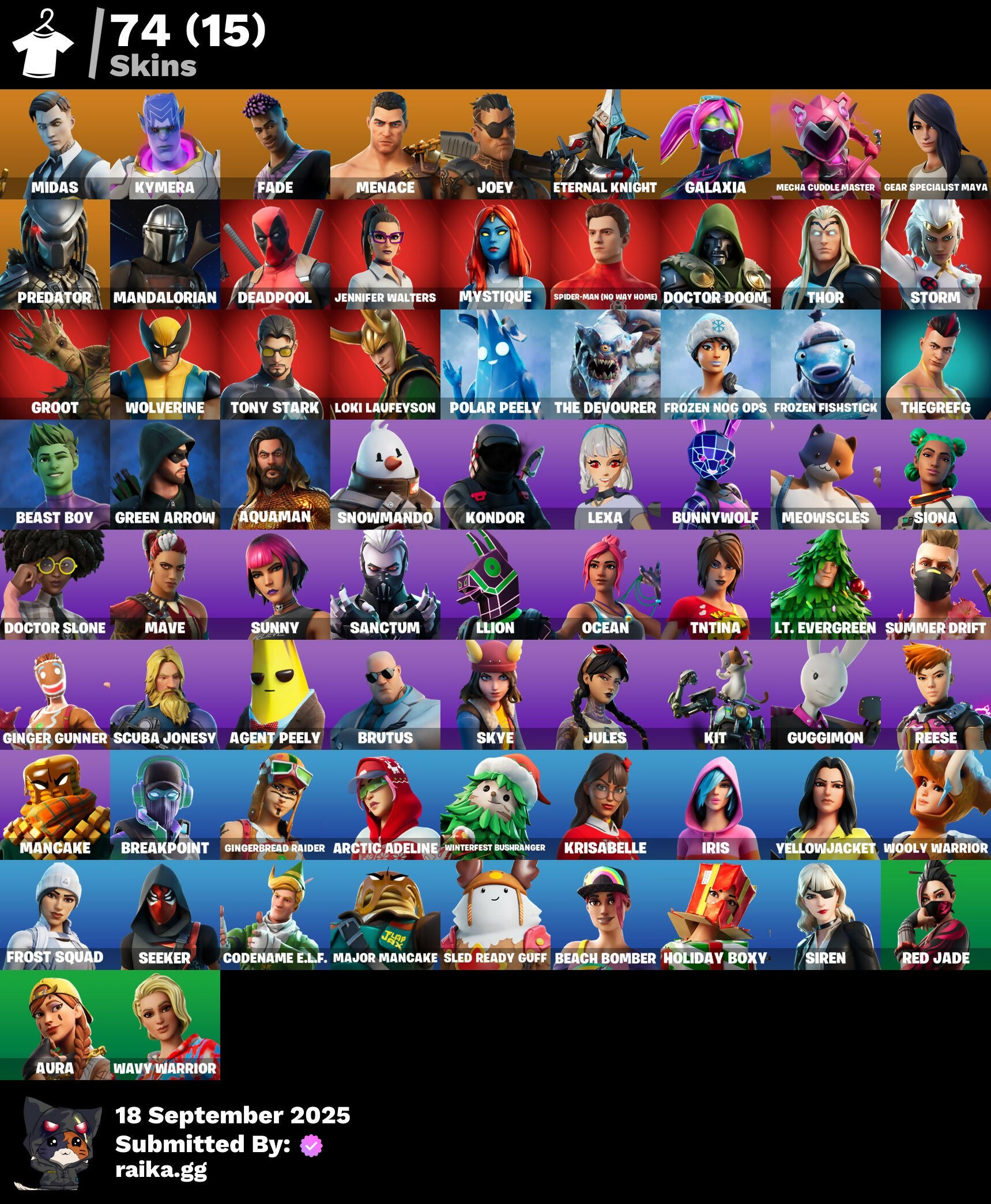 [PC/PSN/XBOX] 74 skins | Midas | Kymera | Fade | Menace | Joey | Eternal Knight | Galaxia | Mecha Cuddle Master | Gear Specialist Maya | Predator | 500 VB / Fortnite