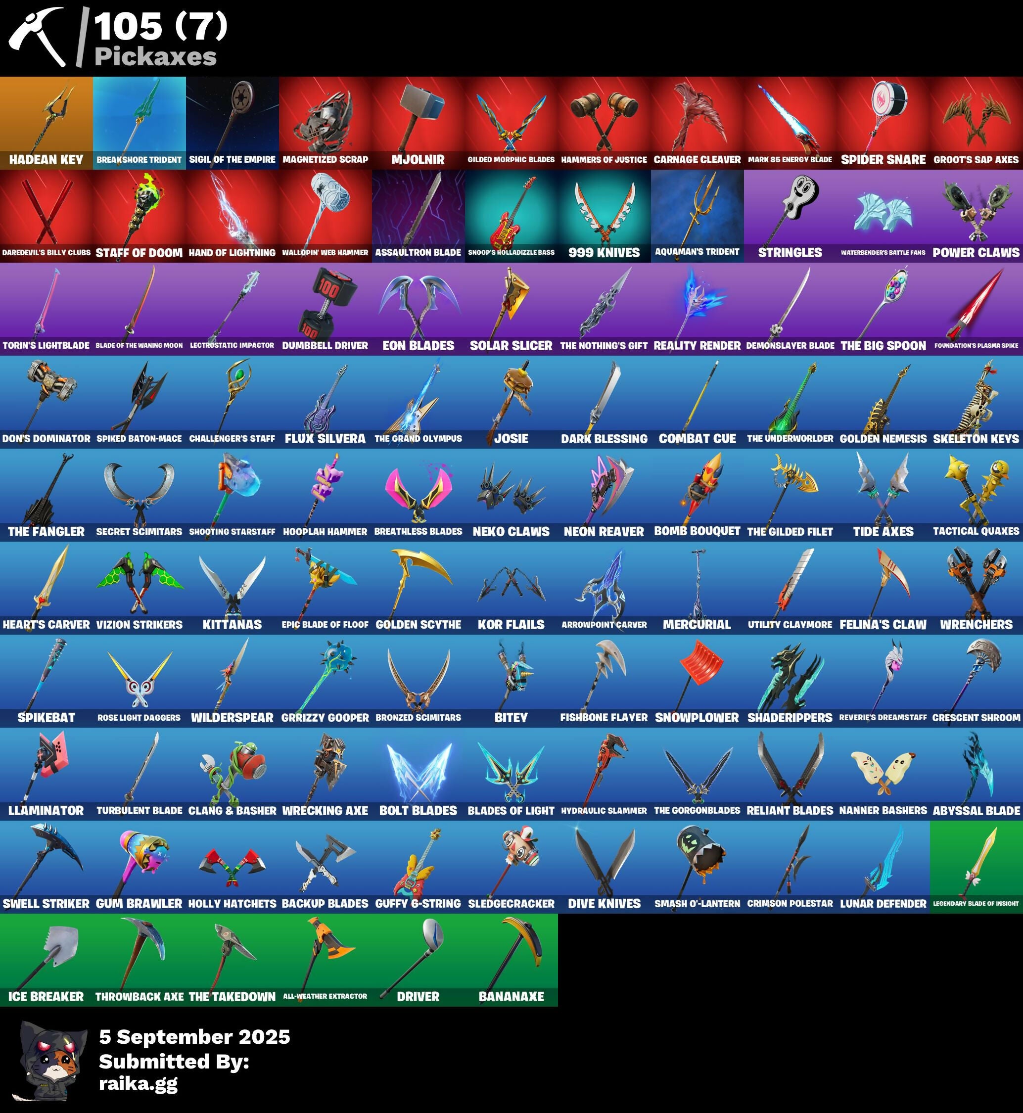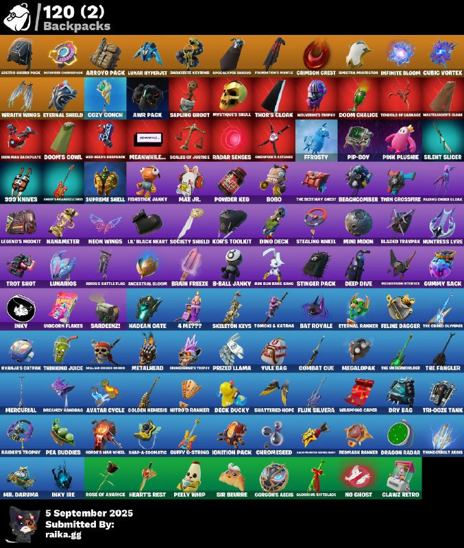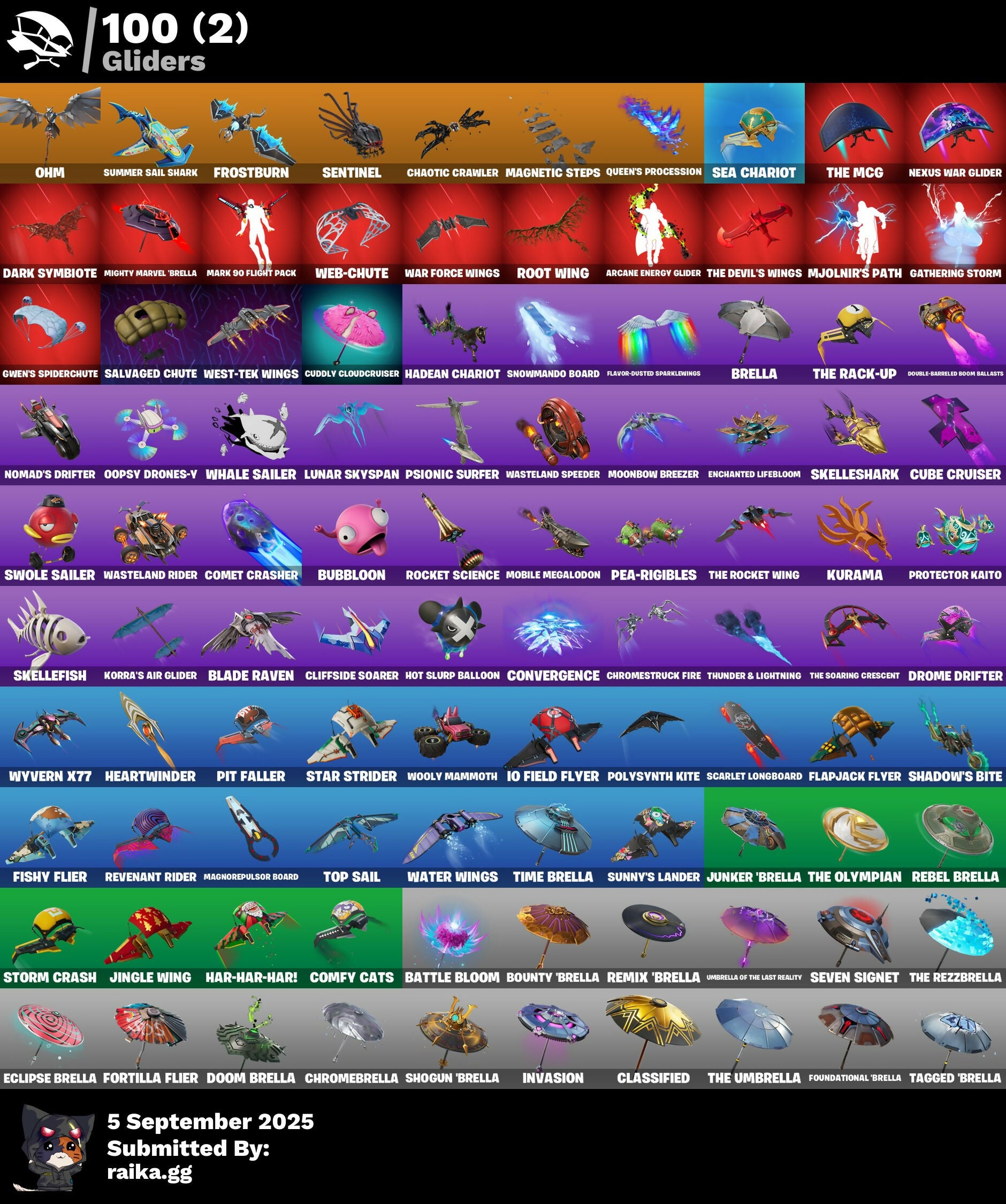 1-Ball, 4 Me???, 8-Ball Janky, 959 Knives, 999 Knives, A Warrior Prepares, Absenz, Abyssal Blade, Air Shredder, All-Weather Extractor, Ancestral Bloom, Aphrodite, Apocalypse Shroud, Aquaman, Aquaman's Trident, Arachrobatics, Arcane Energy Glider, Arrowpoint Carver, Arroyo Pack, Artemis, Assaultron Blade, Avatar Cycle, Avatar's Flourish, Awr Pack, Backup Blades, Bananaxe, Bat Royale, Battle Bloom, Beachcomber, Beep Beep, Bitey, Black Box Of Halloween (New), Blade Of The Waning Moon, Blade Raven, Bladed Trapwire, Blades Of Light, Bobo, Bolt Blades, Bomb Bouquet, Boogie Down, Bounty 'Brella, Brain Freeze, Breakshore Trident, Breathless Blades, Brella, Brite Moves, Brite Raider, Bronzed Scimitars, Bubbloon, Bytes, Call Me, Carnage, Carnage Cleaver, Cerberus, Challenger's Staff, Chaos Director, Chaotic Crawler, Charlotte, Choice Knit, Chrome Punk, Chromebrella, Chromeseed, Chromestruck Fire, Clang & Basher, Classified, Clawz Retro, Clean Sweep, Cliffside Soarer, Codsworth's Cleanup, Combat Cue, Comet Crasher, Comfy Cats, Conch Call, Convergence, Cozy Conch, Crescent Shroom, Crimson Crest, Crimson Polestar, Crowning Achievement, Cube Cruiser, Cubic Vortex, Cuddly Cloudcruiser, D'Ark, Daredevil, Daredevil's Billy Clubs, Dark Blessing, Dark Symbiote, Daybreaker Chambering, Deck Ducky, Deep Dive, Demonslayer Blade, Dino Deck, Dirtbike Challenge, Disassemble, Dive Knives, Djibas Battleflag, Doctor Doom, Don's Dominator, Doom Brella, Doom Chalice, Doom's Cowl, Double-Barreled Boog Ballistas, Doze Dab, Dragon Radar, Dreamzy Handbag, Driver, Droidminder's Trophy, Drome Drifter, Dry Bag, Duffy 6-String, Dumbbell Driver, Dynamo TNTina, Eclipse Brella, Electro Guava Pack, Enchanted Lifebloom, End Zone Expert, Eon Blades, Epic Blade Of Floof, Eternal Knight, Eternal Ranker, Eternal Shield, Ew Euh Bass Fang, Fabio Sparklemane, Face Palm, Fade, Fading Power Cloak, Felina, Felina's Claw, Feline Dagger, Fire Show, Fishbone Flayer, Fishstick Janky, Fishy Flier, Flapjack Flyer, Flavor-Dusted Sparklewings, Flippin' Away, Flux Silvera, Foil Flex, Fortilla Flier, Foundation's Mantle, Foundation's Plasma Spike, Foundational 'Brella, Frostburn, Frosty, Gathering Storm, Gilded Morphic Blades, Glorious Giftblade, Golden Nemesis, Golden Scythe, Good Guy, Gorgon's Aegis, Greenpool's Katanas, Groot, Groot's Sap Axes, Grriz, Grrizzy Gooper, Guffy G-String, Gum Brawler, Gumbo, Gummy Sack, Gwen's Spiderchute, Hadean Chariot, Hadean Gate, Hadean Key, Hades, Hammers Of Justice, Hand Of Lightning, Hand-Forged, Har-Har-Har!, Harlowe, Have A Seat, Haven, Heart Sign, Heart's Carver, Heart's Rest, Heartwinder, Holiday Boxy, Holly Hatchets, Hooplah Hammer, Hot Slurp Balloon, Huntress Lyre, Hydraulic Slammer, Ice Breaker, Ignition Pack, Imperial March, Infinite Bloom, Inky, Inky Ire, Invasion, Invisible Cut, Io Field Flyer, Iron Man Backplate, It Is Finished, It's... You?, Ivania's Catpair, J.B. Chimpanski, Jade, Jennifer Walters, Jingle Wing, Josie, Jules, Junker 'Brella, Kendo, Keyed Up, Kit, Kittanas, Kor, Kor Flails, Kore's Toolkit, Korra, Korra's Air Glider, Krisabelle, Kurama, Laser Focused, Laugh It Up, Lectrostatic Impactor, Legend's Mogxit, Legendary Blade Of Insight, Lennox Rose, Lil Black Heart, Lil' Monster, Lil' Prancer, Lil' Rover, Llaminator, Love It!, Lt. John Llama, Lunar Charge, Lunar Defender, Lunar Hyperjet, Lunar Skyspan, Lunarios, Mae Jr., Magnetic Steps, Magnetized Scrap, Magnorepulsor Board, Make A Seat, Mark 85 Energy Blade, Mark 90 Flight Pack, Meanwhile..., Medusa, Megalo Don, Megalopak, Meow Skulls, Meowdas, Mercurial, Metalhead, Mighty Marvel 'Brella, Mini Moon, Mjolnir, Mjolnir's Path, Mobile Megalodon, Moonbow Breezer, Moonlit Mystery, Mr. Daruma, Mwahaha, Mystique, Mystique's Skull, Nailed It, Nanner Bashers, Nanometer, Neko Claws, Neon Reaver, Neon Wings, Nexus War Glider, Nitro'd Ranker, No Ghost, Nomad's Drifter, Nyanja, OMG I Love It, Ocean, Ohm, Oopsy Drones-V, Paradigm (Reality-659), Pea Buddies, Pea Part Harmony, Pea-Rigibles, Peabody, Peely Whip, Pelé's Air Punch, Pink Plushie, Pip-Boy, Pit Faller, Planetary Vibe, Point & Shoot, Polar Peely, Polysynth Kite, Poseidon, Powder Keg, Power Claws, Prized Llama, Protector Kaito, Psionic Surfer, Pull Up, Purr-Demonium, Queen's Procession, Radar Senses, Raider's Trophy, Ready When You Are, Reality Render, Rebel Brella, Red Card, Red-Head's Backback, Redmask Ranker, Reliant Blades, Remix 'Brella, Revel, Revenant Rider, Reverie, Reverie's Dreamstaff, Rhythm Of Chaos, Ringmaster Scarr, Robo's War Wheel, Rocket Science, Ronin, Root Wing, Rose Light Daggers, Rose Of Avarice, Rust, Salvaged Chute, Santa Dogg, Sapling Groot, Sardeenz!, Scales Of Justice, Scarlet Longboard, Scuba Jonesy, Sea Chariot, Secret Scimitars, Sentinel, Serpentine Summoning, Seven Signet, Shad-A-Zoomatic, Shadebox, Shaderippers, Shadow Vox, Shadow's Bite, Shadow's Eagle's Roar, Shamisen-Sational, Shanta, Shattered Hope, Shogun 'Brella, Shooting Starstaff, Showboat, Sigil Of The Empire, Silent Slicer, Sing Along, Siona, Sir Beurre, Skatemonster, Skeleton Keys, Skellefish, Skelleshark, Slammin' Bass, Slayer Juice Wrld, Sledgecracker, Smash O'-Lantern, Snakebite Keyring, Snoop's Holladizzle Bass, Snowmando Board, Snowplower, So Square, Society Shield, Solar Slicer, Spectra Protector, Spellsword (Tiger's Claw), Spider Snare, Spider-Gwen, Spider-Man, Spikebat, Spiked Baton-Mace, Staff Of Doom, Star Strider, Stealing Wheel, Stinger Pack, Storm, Storm Crash, Stormy, Stringles, Summer Sail Shark, Sunny's Lander, Supreme Shell, Sweet Swing, Sweet!, Swell Striker, Swole Sailer, T-60 Power Armor, Tactical Quaxes, Tagged 'Brella, Take A Bow, Take The Cake, Tempest Flight, Tendrils Of Carnage, The Bestiary Crest, The Big Spoon, The Break Shot, The Cube Queen, The Devil's Wings, The Fangler, The Foundation, The Gilded Filet, The Gorgonblades, The Grand Olympus, The Herald, The Machinist, The Mcg, The Nothing's Gift, The Olympian, The Rack-Up, The Rezzbrella, The Rick Dance, The Rocket Wing, The So