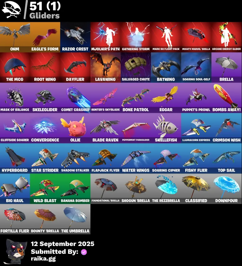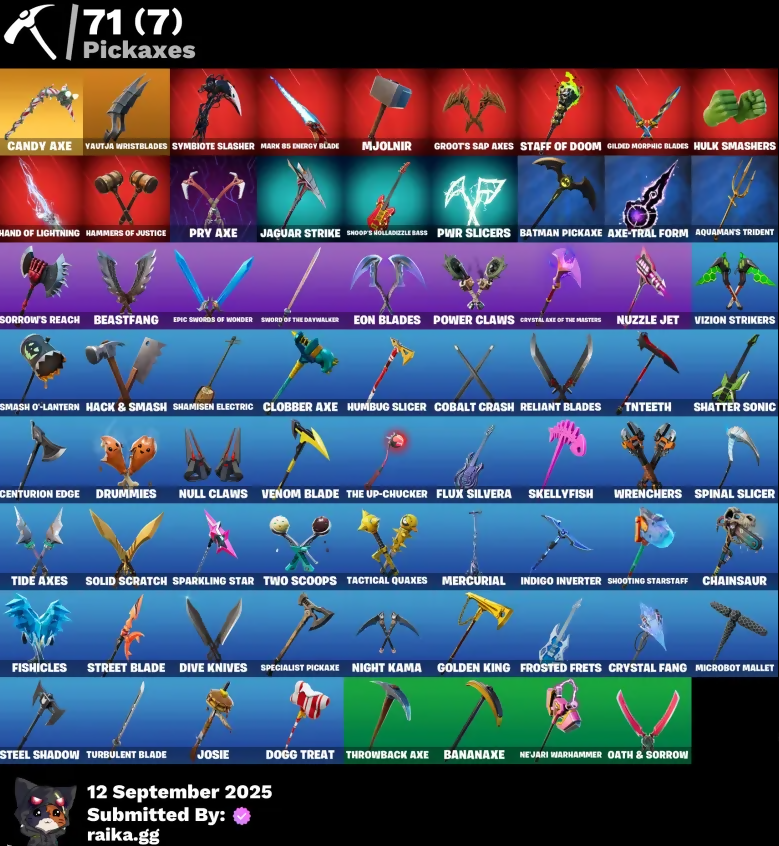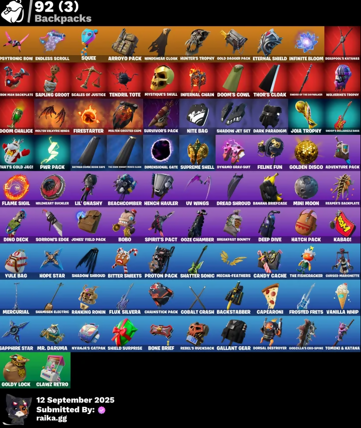 Advanced Math, Adventure Pack, Agent Jones, Agent Peely, Air Shredder, Alli, Aquaman, Aquaman's Trident, Arcane Energy Glider, Arroyo Pack, Aura, Axe-Tral Form, Backstabber, Banana Bomber, Banana Briefcase, Bananaxe, Batman Comic Book Cape, Batman Comic Book Outfit, Batman Pickaxe, Battle Call, Batwing, Beachcomber, Bean Bag, Beastfang, Beep Beep, Behold!, Big Haul, Bitter Sweets, Blade, Blade Raven, Blaze, Bobo, Bombs Away!, Bone Brief, Bone Patrol, Boogie Down, Boomin', Boots 'N Cats, Bounty 'Brella, Brainiac, Breakfast Bounty, Brella, Brutus, Bulletproof, Business Hips, California Love, Call Me, Candy Axe, Candy Cache, Capearoni, Cardistry, Centurion, Centurion Edge, Chainsaur, Chainstick Pack, Chaos Agent, Chill Count, Classified, Claws & Claws, Clawz Retro, Clean Sweep, Cliffside Soarer, Clobber Axe, Cluck, Cobalt Crash, Cobalt Snowfoot, Coin Flip, Comet Crasher, Contract Giller, Convergence, Crimson Wish, Crowning Achievement, Crystal, Crystal Axe Of The Masters, Crystal Fang, Cursed Marionette, Cyclo, Dark Doggo, Dark Paradigm, Dayflier, Daywalker's Kata, Deadpool, Deadpool's Katanas, Deep Dab, Deep Dive, Deimos, Dimensional Gate, Dino Deck, Dive Knives, Doctor Doom, Dogg Treat, Dominion, Doom Chalice, Doom's Cowl, Dorsal Destroyer, Double Up, Downpour, Dread Omen, Dread Shroud, Drummies, Dynamo Grav-Suit, Eagle's Form, Eggar, Endless Scroll, Eon Blades, Epic Swords Of Wonder, Eternal Knight, Eternal Shield, Evasive Maneuvers, Fa-la-la-la-fishstick, Face Palm, Fade, Feline Fun, Firestarter, Fishicles, Fishy Flier, Fist Bump, Flame Sigil, Flapjack Flyer, Flippin' Away, Flux Silvera, Focused, Fortilla Flier, Foundational 'Brella, Frosted Frets, Funk Ops, Gallant Gear, Gathering Storm, Gear Specialist Maya, Ghost Rider, Gilded Morphic Blades, Gingerbread Raider, Gnash, Godzilla's Exo-Spine, Gold Dagger Pack, Gold Midas, Golden Disco, Golden King, Goldy Lock, Grave, Groot, Groot's Sap Axes, Hack & Smash, Hammers Of Justice, Hand Of Lightning, Hang Loose Celebration, Hatch Pack, Hench Hauler, Hope Star, Hot Stuff, Hulk Smashers, Humbug Slicer, Hunter's Skyblade, Hunter's Trophy, Hyperboard, I Declare!, Indigo Inverter, Infernal Chain, Infinite Bloom, Iron Man Backplate, Jaguar Strike, Jakandan Salute, Jennifer Walters, Jet Signals, Joia Trophy, Jones' Field Pack, Josie, Jules, Kabag!, Keyed Up, Kit, Kondor, Lachlan, Lara Croft, Laugh It Up, Lavawing, Leave The Door Open, Lexa, Lil' Gnashy, Llamacorn Express, Make It Rain, Mancake, Mandalorian, Mark 85 Energy Blade, Mark 90 Flight Pack, Mask of Balance, Mave, Mecha Cuddle Master, Mecha Team Shadow, Mecha-Feathers, Meowscles, Mercurial, Microbot Mallet, Mighty Marvel 'Brella, Mini Moon, Mjolnir, Mjolnir's Path, Molten Battle Hound, Molten Crested Cape, Molten Valkyrie, Molten Valkyrie Wings, Mr. Dappermint, Mr. Daruma, Mystique, Mystique's Skull, Ne'Jari Warhammer, Neymar Jr, Night Kama, Nite Bag, Nite Gunner, Null Claws, Nuzzle Jet, Nyanja's Catpak, Oath & Sorrow, Ocean, Ohm, Ollie, Ooze Chamber, Pandemonium, Paranormal Guide, Parath Hugon-Zenthosi, Party Favor, Party Hips, Peppermint Paraglider, Phew!, Pizza Party, Planetary Vibe, Poki, Power Claws, Predator, Proton Pack, Pry Axe, Psytronic Bow, Puppet's Prowl, Pwr Pack, Pwr Punch, Pwr Slicers, Rage Quit, Ranking Ronin, Raz, Razor Crest, Reaper's Backplate, Rebel's Rucksack, Rebirth Raven, Reese, Reliant Blades, Respect The Peace, Revel, Rock Out, Rock Paper Scissors, Root Wing, Salvaged Chute, Santa Dogg, Sapling Groot, Sapphire Star, Scales of Justice, Scorecard, Scuba Jonesy, Seeker, Shadow Archetype, Shadow Boxer, Shadow Jet Set, Shadow Shroud, Shadow Spar, Shadow Stalker, Shamisen Electric, Shaolin Sit-Up, Shatter Sonic, Shield Surprise, Shogun 'Brella, Shooting Starstaff, Side Hustle, Sing Along, Siona, Skeleglider, Skellefish, Skellyfish, Skye, Smash O'-Lantern, Snap, Snoop's Holladizzle Bass, Snoop's Walk, Snow Striker, So Square, Soaring Cipher, Soaring Soul-Self, Solid Scratch, Sorrow's Edge, Sorrow's Reach, Sparkler, Sparkling Star, Specialist Pickaxe, Spinal Slicer, Spirit's Pact, Springy, Squee, Staff Of Doom, Star Strider, Steel Shadow, Storm, Stormy, Street Blade, Supreme Shell, Survivor's Pack, Survivorsault, Sword of the Daywalker, Symbiote Slasher, Tactical Quaxes, Take The Cake, Tarana, Taxi!, Tendril Tote, That's Cold Jac!, The Break, The Dark Knight Movie Cloak, The Dark Knight Movie Outfit, The Fishcracker, The McG, The Rezzbrella, The Umbrella, The Up-Chucker, Thor, Thor's Cloak, Throwback Axe, Tide Axes, Tiniest Violin, Tippy Tap, Tnteeth, Tntina, Tomoki & Katana, Tony Stark, Toosie Slide, Top Sail, Traitor!, Turbulent Blade, Two Scoops, Uv Wings, Vanilla Whip, Venom, Venom Blade, Verve, Violet, Vizion Strikers, Waddle Away, Wanna See Me, Water Wings, Webster, Whipcrack, Wild Blast, Wildheart Buckler, Windshear Cloak, Wolverine, Wolverine's Trophy, Wrenchers, Yautja Wristblades, Yellowjacket, Yule Bag, Yulejacket