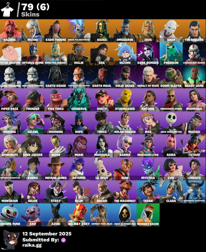 [PC/PSN/XBOX] ] 79 skins | Valeria | Mizuki | Kado Thorne | Renzo the Destroyer | Hades | Omegarok | Zeus | Snap | The Ageless | Peter Griffin | Optimus Prime | 200 VB