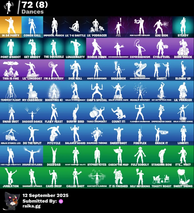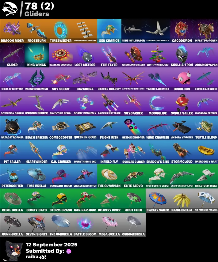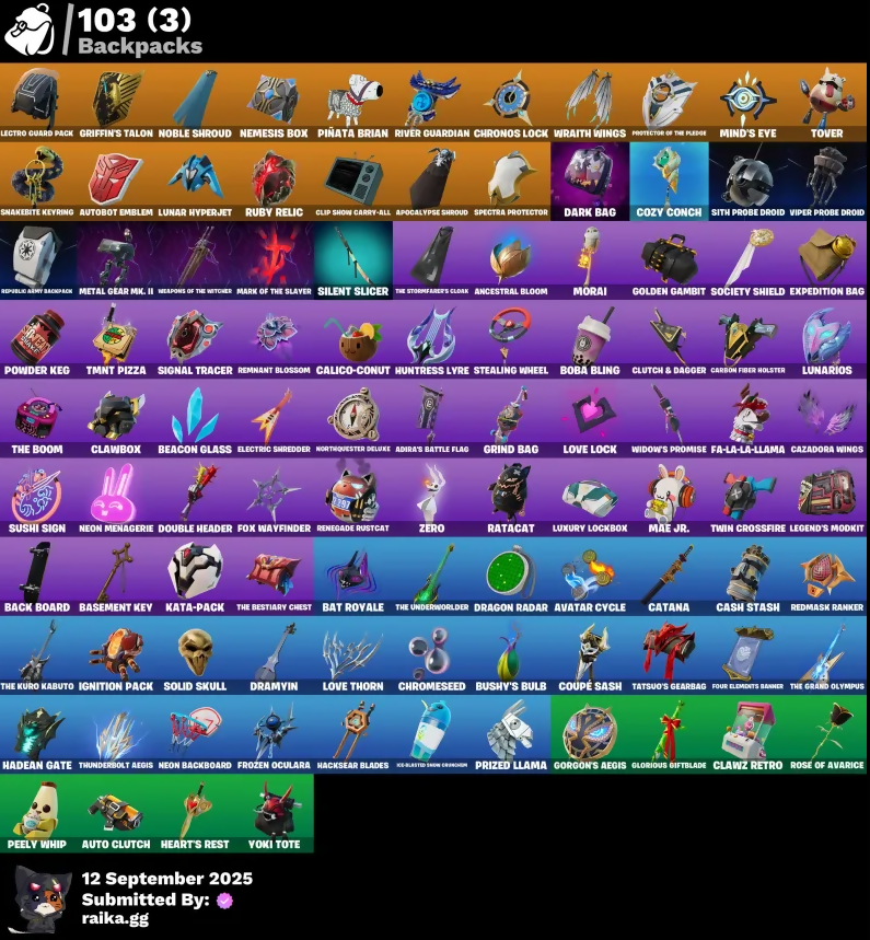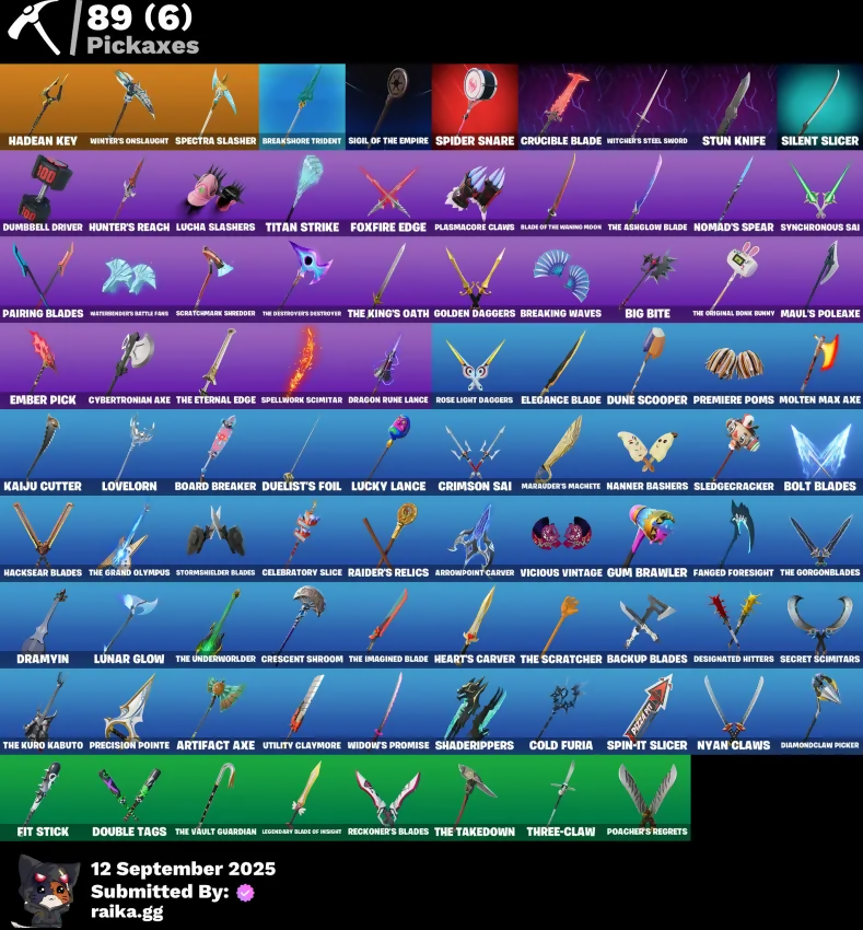 4XO, Adira, Adira's Battle Flag, Adventure Aerial, Ahsoka's Clone Trooper, Ancestral Bloom, Antonia, Aphrodite, Apocalypse Shroud, Arrowpoint Carver, Artemis, Articulated Blade Wing, Artifact Axe, Auto Clutch, Autobot Emblem, Avatar Cycle, Avatar's Flourish, Azuki, Back Board, Backup Blades, Balance Board, Basement Key, Bat Royale, Battle Bloom, Beach Breezer, Beacon Glass, Big Bite, Blade of the Waning Moon, Blowin' Up, Board Breaker, Boba Bling, Boba Snack, Bolt Blades, Boogie Down, Boosting Ki, Breaking Waves, Breakshore Trident, Bubbloon, Bushy's Bulb, Buzzsaw Breacher, Cacodemon, Calico-Conut, Called Shot, Carbon Fiber Holster, Card Drop, Cash Stash, Catana, Cazadora, Cazadora Wings, Celebratory Slice, Cerberus, Check The Map, Chef's Special, Chrome Punk, Chromebrella, Chromeseed, Chronos Lock, Clara, Clawbox, Clawz Retro, Clip Show Carry-All, Clone Trooper, Clutch & Dagger, Cold Furia, Combat Tech Jules, Combocopter, Comfy Cats, Commander's Descent, Conch Call, Coruscant Guard, Count It!, Coupé Sash, Cozy Conch, Crack It, Crescent Shroom, Crimson Sai, Crowning Achievement, Crucible Blade, Cybertronian Axe, Cyclo Curl, Dagger Dance, Dark Bag, Dark Bomber, Darth Maul, Darth Vader, Delivery Diver, Designated Hitters, Diamond Throne, Diamondclaw Picker, Dice Roll, Do The Split, Doom Slayer, Double Header, Double Tags, Doze Dab, Dragon Radar, Dragon Rider, Dragon Rune Lance, Dramatic Flares, Dramyin, Duelist's Foil, Dumbbell Driver, Dune Scooper, Dusty, Electric Shredder, Elegance Blade, Elite Servo, Ember Pick, Emergency Raft, Empress Fan Dance, Era, Eren Jaeger, Everything's End, Evie, Expedition Bag, Expressionism, Fa-La-La-Llama, Fanged Foresight, Fish Thicc, Fit Stick, Flaky Feast, Flashback Breakdown, Flight Risk, Flip Flyer, Foil Flex, Four Elements Banner, Fox Wayfinder, Foxfire Edge, Frostburn, Frozen Oculara, Full Googly, Geralt Of Rivia, Get Griddy, Get Out Of Your Mind, Glorious Giftblade, Gold Blooded Ace, Golden Daggers, Golden Gambit, Gorgon's Aegis, Grand Glacier Glider, Griffin's Talon, Grind Bag, Gum Brawler, Gunn-Brella, Hacksear Blades, Hadean Chariot, Hadean Gate, Hadean Key, Hades, Hailstorm Rider, Har-Har-Har!, Heart's Carver, Heart's Rest, Heartwinder, Heist Flier, Helsie, High Society Glider, Highwire, Holiday Boxy, Hope, Hunter's Reach, Huntress Lyre, Hypnot-Eyes, I Need You To Concentrate, I'm A Mystery, Ice-Blasted Snow Crossbow, Igni Sign, Ignition Pack, Imani, Imperial March, In Da Party, Indiana Jones, Infield Fly, Inflate-A-Roach, It Is Finished, It's... You?, Jack Skellington, Jubilation, K.O. Cruiser, Kado Thorne, Kaiju Cutter, Kata-Pack, Khaby Lame, King Wings, Knife Sharpener, Korra, Korra's Air Glider, Lambda-Class Shuttle, Lectro Guard Pack, Legend's Modkit, Legendary Blade of Insight, Lil Split, Lil' Longboat, Lil' Podracer, Lil' Prancer, Lil' T-6 Shuttle, Lorenzo, Lost Meteor, Love It!, Love Lock, Love Thorn, Lovelorn, Lucha Slashers, Lucky Lance, Lunar Glow, Lunar Hyperjet, Lunar Party, Lunar Skyspan, Lunarios, Luxury Lockbox, Mae, Mae Jr., Malik, Marauder's Machete, Marigold, Mariposa, Mark Of The Slayer, Massai, Maul's Poleaxe, Medusa, Mega-Brella, Metal Gear Mk. II, Mind's Eye, Mini Slayer Fistbump, Mizuki, Molten Max Axe, Montague, Moonbow Breezer, Moonglide, Moonlit Mystery, Morai, My Cabbages!, Mystica, Nana-Brella, Nanner Bashers, Needle Dropper, Nemesis Box, Neon Backboard, Neon Menagerie, Nezumi, Ninja Stance: Donnie, Ninja Stance: Leo, Ninja Stance: Mikey, Ninja Stance: Raph, Nisha, Noble Shroud, Nolan Chance, Nomad's Spear, Northquister Deluxe, Nyan Claws, Omegarok, Oopsy Drones-V, Optimus Prime, Oscar, Pairing Blades, Peely Whip, Peter Griffin, Petercopter, Piper Pace, Pit Faller, Pitcycle, Piñata Brian, PlasmaCore Claws, Poacher's Regrets, Point & Shoot, Poseidon, Powder Keg, Precision Pointe, Premiere Poms, Prized Llama, Protector Of The Pledge, Psionic Surfer, Purradise Meowscles, Queen In Gold, Raider's Relics, Raider's Wayfarer, Ratacat, Ratacat Roamer, Rebel Brella, Reckoner's Blades, Redmask Ranker, Relik, Remnant Blossom, Renegade Lynx, Renegade Rustcat, Renzo The Destroyer, Republic Army Backpack, Revenant Rider, Rian, River Guardian, Rose Light Daggers, Rose Of Avarice, Ruby Relic, Runway Racer, Sabina, Scout Regiment Salute, Scratchmark Shredder, Sea Chariot, Secret Scimitars, Selene, Self Reflexing, Serpentine Summoning, Seven Signet, Shadebox, Shaderippers, Shadow's Bite, Shuriken Spinner, Sigil of the Empire, Signal Tracer, Silent Slicer, Sith Infiltrator, Sith Probe Droid, Skull-A-Tron, Sky Scout, Skycarver, Sledgecracker, Slider, Snakebite Keyring, Snap, Society Shield, Solid Skull, Solid Snake, Sovereign Griffin, Spectra Knight, Spectra Protector, Spectra Slasher, Spellwork Scimitar, Spider Snare, Spin-It Slicer, Standing Bow, Steady, Stealing Wheel, Storm Crash, Stormcloud, Stormfarer, Stormshielder Blades, Stray, Stun Knife, Sundae Glider, Surfin' Bird, Sushi Sign, Swag Shot, Sweaty Sailer, Sweet Shot, Sweet Swing, Sweet!, Swole Sailer, Synchronous Sai, TMNT Pizza, Taiko Drumbeat, Tatsuo, Tatsuo's Gearbag, Tegan, Tempest Flight, The Ageless, The Ashglow Blade, The Bestiary Chest, The Boom, The Destroyer's Destroyer, The Eternal Edge, The Gorgonblades, The Grand Olympus, The Imagined Blade, The King's Oath, The Kuro Kabuto, The Machinist, The Olympian, The Original Bonk Bunny, The Peerless Parasol, The Scratcher, The Squabble, The Stormfarer's Cloak, The Takedown, The Umbrella, The Underworlder, The Vault Guardian, This Is Fine, Three-Claw, Thunder, Thunder & Lightning, Thunderbolt Aegis, Time Brella, Timesweeper, Titan Strike, Toasty Roast, Tover, Trace, Turtle Blimp, Twin Crossfire, Underworld Desdemona, Unseen Airdropter, Utility Claymore, Valeria, Vengeance Jones, Vicious Vintage, Victory Vaunter, Viper Probe Droid, Wasteland Speeder, Waterspiders Battle Fans, Weapons Of The Witcher, Whispering Wind, Widow's Promise, Wind Crawler, Wings Of The Storm, Winter's Onslaught, Wintry Whirligig, Witcher's Steel Sword, 