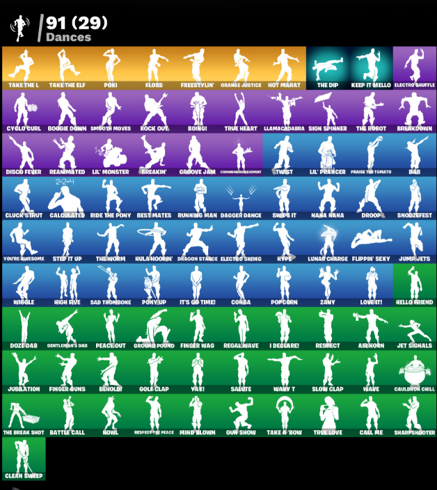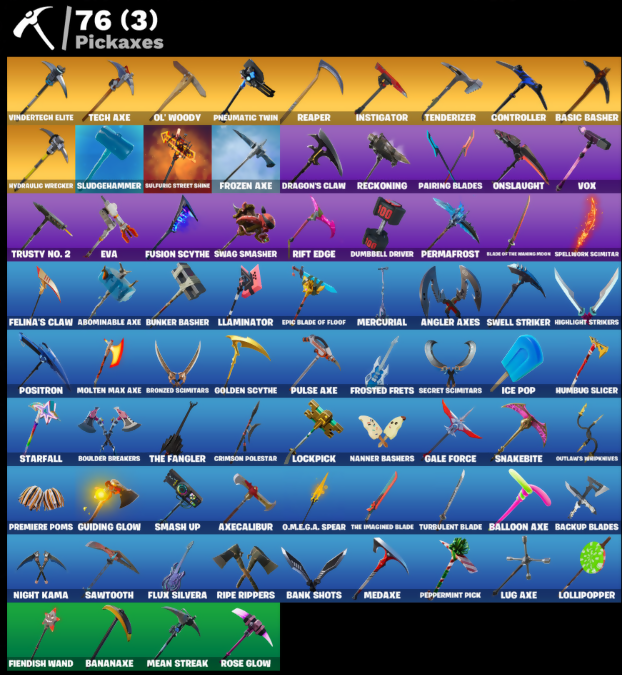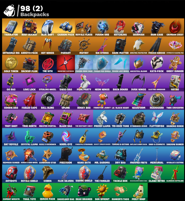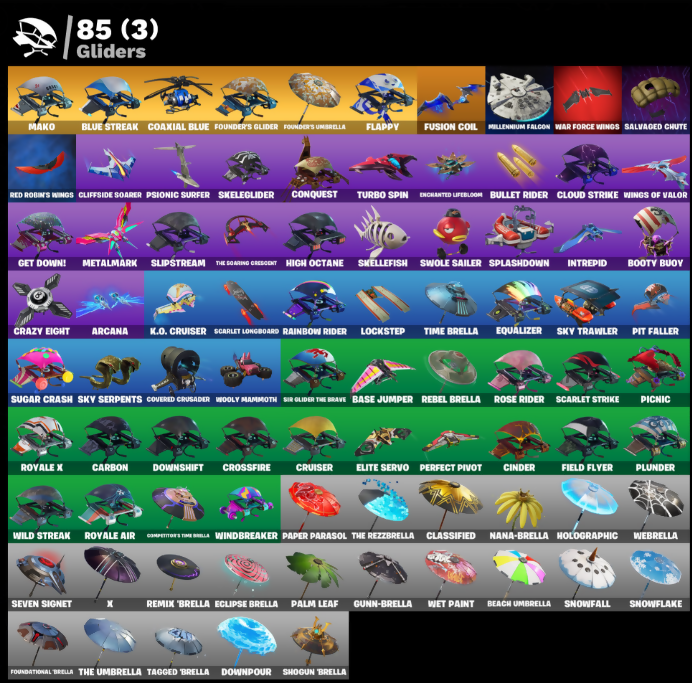 8-Ball vs Scratch, Abominable Axe, Air Horn, Ancestral Bloom, Angler Axes, Antidote, Arcana, Arctic Assassin, Arroyo Pack, Astro, Axecalibur, Back Board, Backup Blades, Backup Plan, Ball Bling, Balloon Axe, Bananaxe, Bank Shots, Base Jumper, Basecamp Bag, Basic Basher, Bat Royale, Battle Call, Battlehawk, Beach Umbrella, Bear Brained, Behold!, Best Mates, Blackheart, Blade Bag, Blade of the Waning Moon, Blue Shift, Blue Squire, Blue Streak, Blue Striker, Blue Team Leader, Bogey Bag, Boing!, Boogie Down, Booty Buoy, Boulder Breakers, Breakdown, Breakin', Bronzed Scimitars, Bullet Rider, Bunker Basher, Bunker Jonesy, Calamity, Calculated, Call Me, Cameo vs Chic, Carbide, Carbon, Carbon Commando, Carbon Pack, Cauldron Chill, Cinder, Classified, Clawz Retro, Clean Sweep, Cliffside Soarer, Cloud Strike, Cluck Strut, Coaxial Blue, Cobra, Combat Wreath, Commando, Competitor's Time Brella, Conga, Conquest, Controller, Covered Crusader, Crazy Eight, Crimson Crest, Crimson Polestar, Crossfire, Crown Regal Elevate, Cruiser, Crystal Llama, Cyclo Curl, DJ Yonder, Dab, Dagger Dance, Dark Matter, Dark Voyager, Disco Fever, Downpour, Downshift, Doze Dab, Dragon Stance, Dragon's Claw, Drift, Droop, Dry Bag, Dumbbell Driver, Dusk Wings, Eclipse Brella, Electric Shredder, Electro Shuffle, Electro Swing, Elite Agent, Elite Servo, Ember, Enchanted Lifebloom, Epic Blade of Floof, Equalizer, Eva, Everest Upgrader, Evie, Fable, Fabled Cape, Felina, Felina's Claw, Field Flyer, Fiendish Wand, Finger Guns, Finger Wag, Fishstick, Flappy, Flippin' Sexy, Floss, Flutterfish, Flux Silvera, Foundational Brella, Founder's Glider, Founder's Umbrella, Freestylin', Frosted Frets, Frozen Axe, Frozen Iron Cage, Frozen Love Ranger, Frozen Love Wings, Frozen Raven, Frozen Red Knight, Frozen Red Shield, Frozen Shroud, Fusion, Fusion Coil, Fusion Orb, Fusion Scythe, Gale Force, Gentleman's Dab, Get Down!, Ghoul Trooper, Giddy Gunner, Giddy-Up, Ginger Gunner, Glorious Giftblade, Go Bag, Gold Token, Golden Scythe, Gole Clap, Goodie Bag, Greenpools Katana's, Groove Jam, Ground Pound, Guiding Glow, Gun Show, Gunn-Brella, Hatchling, Havoc, Hello Friend, High Five, High Octane, Highlight Strikers, Holiday Boxy, Holographic, Horde's War Wheel, Hot Marat, Hot Wings, Howl, Hula Hoopin', Humbug Slicer, Huntress, Hybrid, Hydraulic Wrecker, Hype, I Declare!, I-Hope-Everybodys-Sharp-Teeth, Ice Pop, Instigator, Intrepid, Iron Cage, It's Go Time!, Janky Lil' Black Heart, Jet Signals, Journey vs Hazard, Jubilation, Jump Jets, K.O. Cruiser, Kata-Pack, Keep It Mello, Kymera, Kymera's Plasma Pak, Laguna, Lil' Monster, Lil' Prancer, Llamacadabra, Llaminator, Lockpick, Lockstep, Lollipopper, Love It!, Love Lock, Lt. John Llama, Lug Axe, Lunar Charge, Mako, Master Portal, Mean Streak, Medaxe, Mercurial, Metalmark, Millennium Falcon, Mind Blown, Mission Specialist, Molten Max Axe, Moonwalker, Mr. Daruma, Mutiny, Nana Bath, Nana Nana, Nana-Brella, Nanner Bashers, Neon Wings, Night Kama, Nitelite, Nyanja's Catpak, O.M.E.G.A. Spear, Offworld Rig, Ol' Woody, Omega, Onslaught, Orange Justice, Outlaw's Knife Rack, Outlaw's Wipkreves, Pairing Blades, Palm Leaf, Paper Parasol, Peace Out, Peely, Peely Whip, Peppermint Pick, Perfect Pivot, Permafrost, Picnic, Pineapple Strummer, Pit Faller, Plunder, Pneumatic Twin, Poki, Pony Up, Pool Party, Popcorn, Positron, Power Chord, Praise The Tomato, Precision, Premiere Poms, Princess Felicity Fish, Prized Llama, Prodigy, Psionic Surfer, Pulse Axe, Pursuit, Quack Pack, Ragnarok, Rainbow Rider, Ranker's Tags, Ranking Ronin, Raven, Reanimated, Reaper, Rearguard, Rebel Brella, Rebel's Rucksack, Reckoning, Red Robin's Wings, Red-Nosed Raider, Redline, Redmask Ranker, Regal Wave, Remedy vs Toxin, Remix 'Brella, Respect, Respect’n Peace, Ride The Pony, Rift Edge, Ripe Rippers, Rippley vs Sludge, Rock Out, Ronin, Rook, Rose Glow, Rose Rider, Rose Team Leader, Rox, Royale Air, Royale Flags, Royale Knight, Royale Shield, Royale X, Running Man, Rust Bucket, Rust Lord, Sad Trombone, Salute, Salvaged Chute, Sawtooth, Scarlet Defender, Scarlet Longboard, Scarlet Strike, Secret Scimitars, Sentinel, Seven Signet, Shadow Ranker, Shanta, Sharpshooter, Shogun 'Brella, Sidewinder, Sign Spinner, Sir Glider The Brave, Six String, Skeleglider, Skellefish, Skirmish, Skull Ranger, Sky Serpents, Sky Trawler, Sledgehammer, Slipstream, Slow Clap, Sludgehammers, Smash Up, Smooth Moves, Snakebite, Snap, Snap-A-Zoomatic, Snoozefest, Snowfall, Snowflake, Society Emblem Ranker, Spectra Protector, Spellwork Scimitar, Splashdown, Squad Leader, Squire Shield, Standard Issue, Starfall, Stealing Wheel, Step It Up, Sub Commander, Sugar Crash, Sulfuric Street Shine, Sun Sprout, Sun Strider, Swag Bag, Swag Smasher, Swell Striker, Swipe It, Swole Sailer, Tabulator, Tackle Box, Tagged 'Brella, Take A Bow, Take The Elf, Take The L, Tech Axe, Teknique, Tenderizer, The Ace, The Bestiary Chest, The Break Shot, The Dip, The Fangler, The Imagined Blade, The Reaper, The Rezzbrella, The Robot, The Sith, The Soaring Crescent, The Umbrella, The Visitor, The Worm, Time Brella, Tomoki & Katana, Trail Tote, Trailblazer, Tri-Ooze Tank, Tricera Ops, Trot Shot, True Heart, True Love, True North, Trusty No. 2, Turbo Spin, Turbulent Blade, Turk vs Riptide, Twin Crossfire, Twist, Uplink, Valor, Vanguard Star, Vega, Vindertech Elite, Vox, War Force Wings, Warpaint, Wave, Wavebreaker, Waveform, Wavy T, Webrella, Wet Paint, Whirl-Dye, Wiggle, Wild Streak, Windbreaker, Wingman, Wings of Valor, Wooly Mammoth, Wukong, X, Yay!, You're Awesome, Zany, Zoey