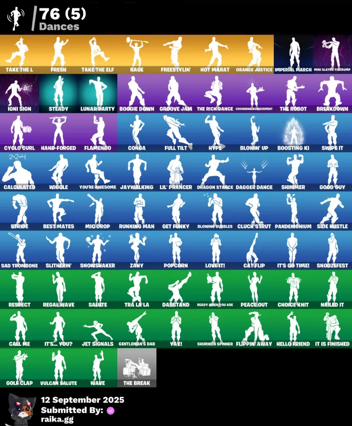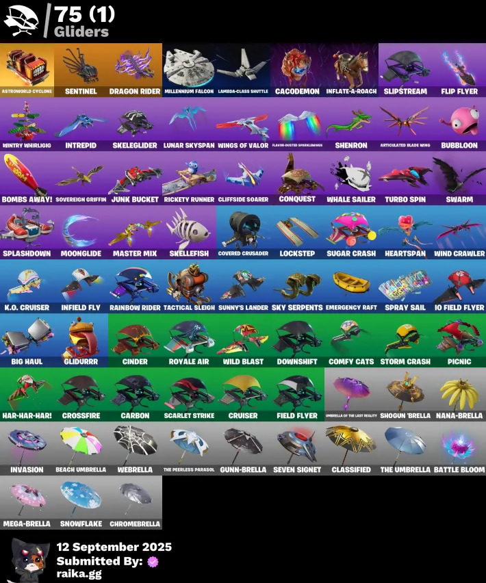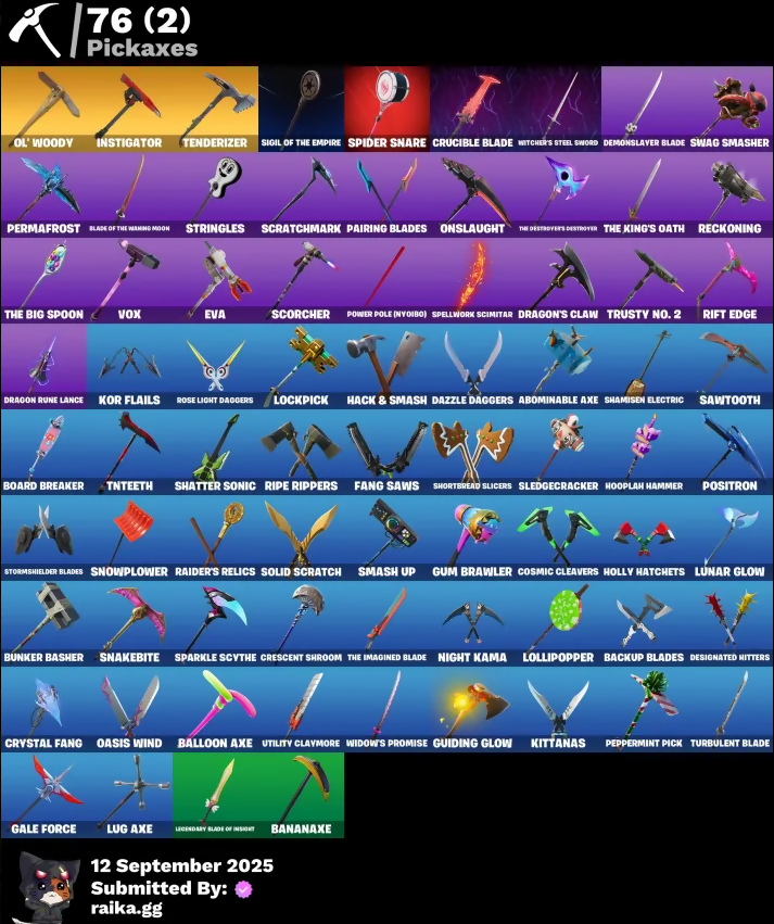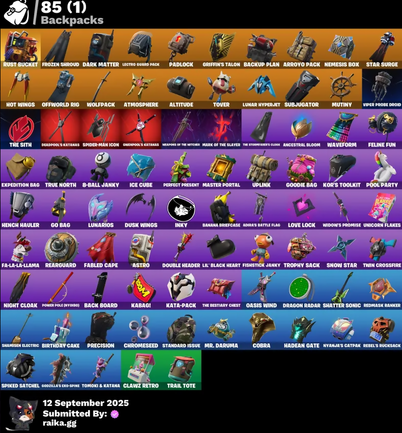 8-Ball Janky, Abominable Axe, Adira, Adira's Battle Flag, Agent Peely, Altitude, Ancestral Bloom, Arctic Adeline, Arroyo Pack, Articulated Blade Wing, Astro, Astroworld Cyclone, Atmosphere, Back Board, Backup Blades, Backup Plan, Balloon Axe, Banana Briefcase, Bananaxe, Battle Bloom, Battlehawk, Beach Umbrella, Best Mates, Big Haul, Birthday Cake, Blackheart, Blade, Blade Of The Waning Moon, Blowin' Up, Blowing Bubbles, Board Breaker, Bombs Away!, Boogie Down, Boosting Ki, Breakdown, Brutus, Bubloon, Bunker Basher, Bunker Jonesy, Cacodemon, Calamity, Calculated, Call Me, Carbide, Carbon, Cat Flip, Catalyst, Charlotte, Choice Knit, Chromebrella, Chromeseed, Cinder, Classified, Clawz Retro, Cliffside Soarer, Cluck Strut, Cobra, Comfy Cats, Conga, Conquest, Cosmic Cleavers, Covered Crusader, Crescent Shroom, Crossfire, Crucible Blade, Cruiser, Crystal Fang, Cyclo Curl, DJ Yonder, Dabstand, Dagger Dance, Dark Matter, Dark Voyager, Darth Vader, Dazzle Daggers, Deadpool, Deadpool's Katanas, Demonslayer Blade, Designated Hitters, Dire, Doom Slayer, Double Header, Downshift, Dragon Radar, Dragon Rider, Dragon Rune Lance, Dragon Stance, Dragon's Claw, Drift, Dusk, Dusk Wings, Dusty, Elite Agent, Emergency Raft, Enforcer, Eva, Evie, Expedition Bag, Fa-La-La-Llama, Fabio Sparklemane, Fable, Fabled Cape, Fade, Fang Saws, Feline Fun, Filed Flyer, Fishtick Janky, Flamenco, Flip Flyer, Flippin' Away, Freestylin', Fresh, Frozen Shroud, Full Tilt, Gale Force, Gear Specialist Maya, Gentleman's Dab, Geralt of Rivia, Get Funky, Giddy-Up, Glidurrr, Go Bag, Godzilla's Exo-Spine, Golf Clap, Good Guy, Goodie Bag, Griffin's Talon, Groove Jam, Guiding Glow, Gum Brawler, Gunn-Brella, Gwenpool's Katanas, Hack & Smash, Hadean Gate, Hand-Forged, Har-Har-Har!, Havoc, Heartspan, Hello Friend, Hench Hauler, Holly Hatchets, Hooplah Hammer, Hot Marat, Hot Wings, Huntress, Hybrid, Hype, IO Field Flyer, Ice Cube, Igni Sign, Imperial March, Indiana Jones, Infield Fly, Inflate-A-Roach, Inky, Instigator, Intrepid, Invasion, It Is Finished, It's Go Time!, It's... You?, Jaywalking, Jet Signals, Junk Bucket, K.O. Cruiser, Kabag!, Kata-Pack, Kittanas, Kor, Kor Flails, Kor's Toolkit, Krisabelle, Lambda-Class Shuttle, Lectro Guard Pack, Legendary Blade Of Insight, Lil' Black Heart, Lil' Prancer, Lockpick, Lockstep, Lollipopper, Love It!, Love Lock, Lug Axe, Lunar Glow, Lunar Hyperjet, Lunar Party, Lunar Skyspan, Lunarios, Lynx, Malik, Mark of the Slayer, Massai, Master Mix, Master Portal, Mega-Brella, Mic Drop, Millennium Falcon, Mini Slayer Fistbump, Mission Specialist, Moonglide, Moonwalker, Mr. Daruma, Mutiny, Nailed It, Nana-Brella, Nemesis Box, Night Cloak, Night Kama, Nightshade, Nyanja's Catpak, Oasis Wind, Ocean, Offworld Rig, Ol' Woody, Omega, Onesie, Onslaught, Orange Justice, Padlock, Pairing Blades, Pandemonium, Peace Out, Peely, Peppermint Pick, Perfect Present, Permafrost, Picnic, Polar Peely, Pool Party, Popcorn, Positron, Powder, Power Pole (Nyoibo), Precision, Rage, Ragnarok, Raider's Relics, Rainbow Rider, Ready When You Are, Rearguard, Rebel's Rucksack, Reckoning, Redline, Redmask Ranker, Regal Wave, Respect, Rickety Runner, Rift Edge, Ripe Rippers, Rook, Rose Light Daggers, Rox, Royale Air, Running Man, Rust Bucket, Rust Lord, Sabina, Sad Trombone, Salute, Sawtooth, Scarlet Strike, Scorcher, Scratchmark, Selene, Sentinel, Seven Signet, Sgt. Winter, Shamisen Electric, Shatter Sonic, Shenron, Shimmer, Shogun 'Brella, Shortbread Slicers, Shuriken Spinner, Side Hustle, Sidewinder, Sigil Of The Empire, Skelefish, Skeleglider, Sky Serpents, Sled Ready Guff, Sledgecracker, Sledgehammer, Slipstream, Slitherin', Smash Up, Snakebite, Snap, Snoozefest, Snow Star, Snowflake, Snowfoot, Snowplower, Snowshaker, Solid Scratch, Son Goku, Sovereign Griffin, Sparkle Scythe, Spellwork Scimitar, Spider Snare, Spider-Man (No Way Home), Spider-Man Icon, Spiked Satchel, Splashdown, Spray Sail, Squad Leader, Standard Issue, Star Surge, Steady, Storm Crash, Stormfarer, Stormshielder Blades, Stride, Stringles, Sub Commander, Subjugator, Sugar Crash, Sun Strider, Sunny's Lander, Swag Smasher, Swarm, Swipe It, Tactical Sleigh, Take The Elf, Take The L, Teknique, Tenderizer, The Bestiary Chest, The Big Spoon, The Break, The Destroyer's Destroyer, The Imagined Blade, The King's Oath, The Peerless Parasol, The Prisoner, The Reaper, The Rick Dance, The Robot, The Sith, The Stormfarer's Cloak, The Umbrella, The Visitor, Tilted Teknique, Tnteeth, Tntina, Tomoki & Katana, Toona Fish, Tover, Tra La La, Trail Tote, Trailblazer, Trog, Trophy Sack, True North, Trusty No. 2, Turbo Spin, Turbulent Blade, Twin Crossfire, Unicorn Flakes, Uplink, Utility Claymore, Valor, Vav!, Vega, Viper Probe Droid, Vox, Vulcan Salute, Wave, Waveform, Weapons of the Witcher, Webrella, Whale Sailer, Widow's Promise, Wiggle, Wild Blast, Wind Crawler, Wings Of Valor, Wintry Whirligig, Witcher's Steel Sword, Wolfpack, X-Lord, Xander, Yond3r, You're Awesome, Zany, Zenith, Zoey
