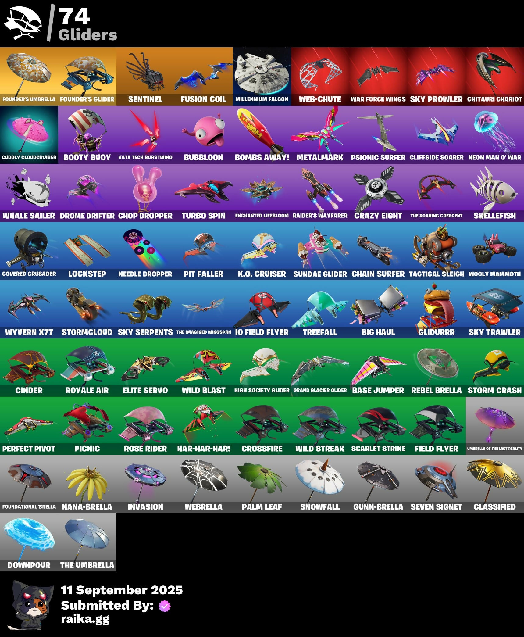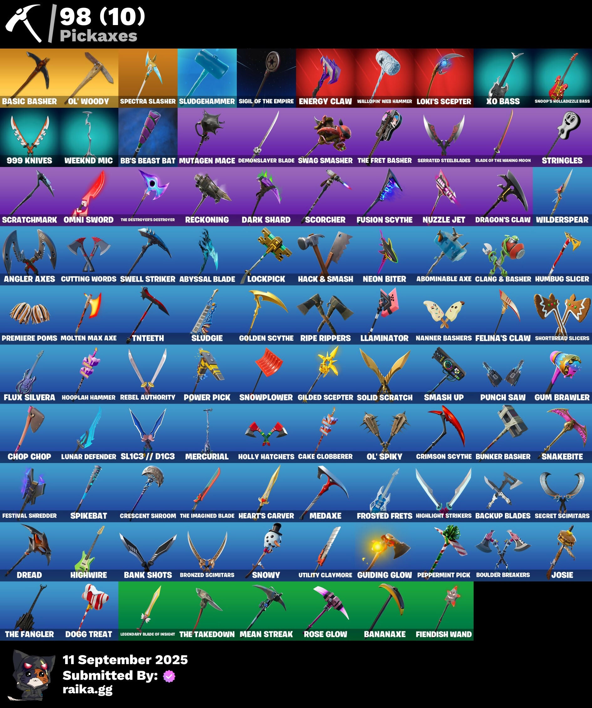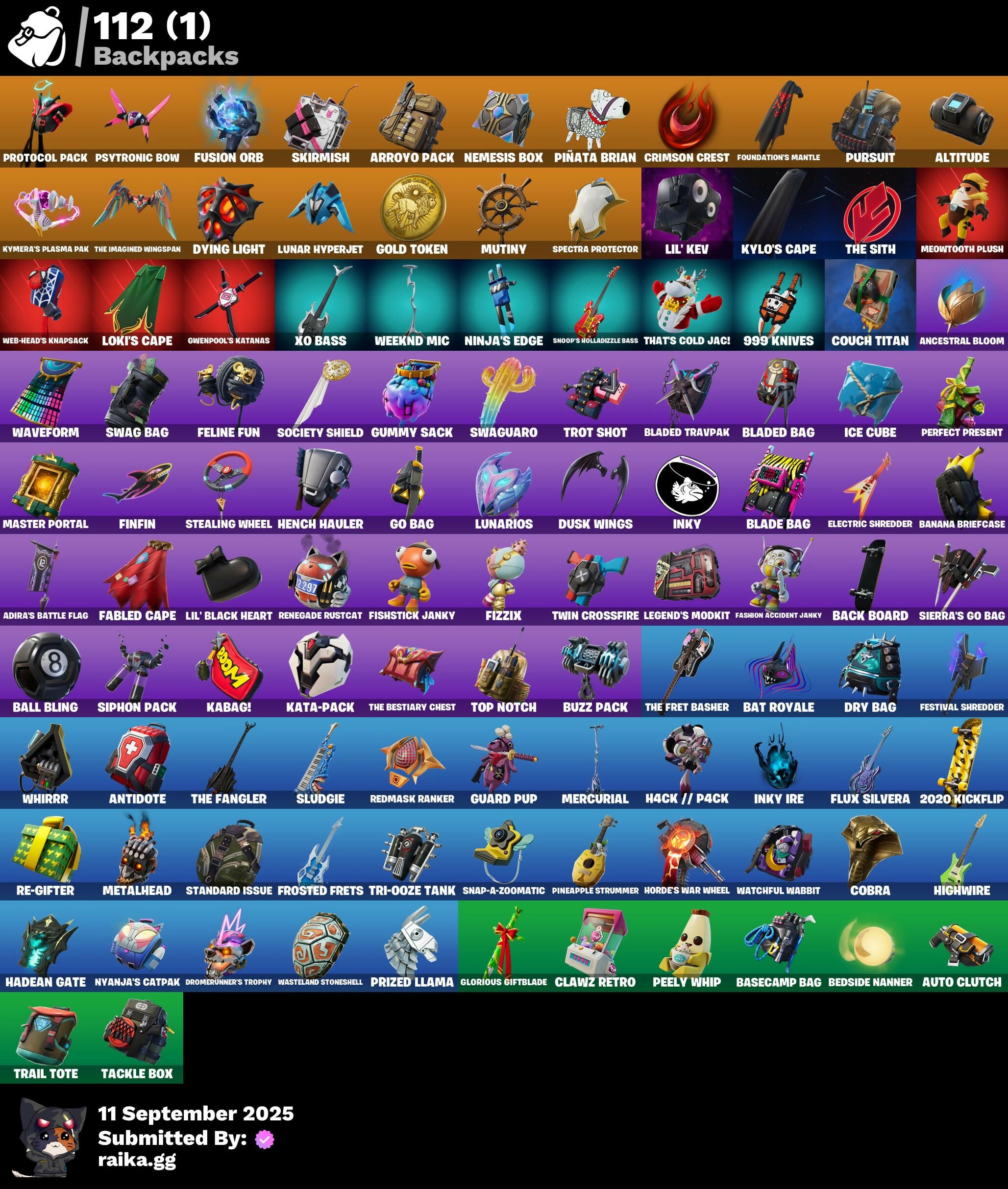 2020 Kickflip, 8-Ball Vs Scratch, 999 Knives, Abominable Axe, Absenz, Abyssal Blade, Adira's Battle Flag, Agent Peely, Altitude, Ancestral Bloom, Angler Axes, Antidote, Arroyo Pack, Auto Clutch, BB's Beast Bat, Back Board, Backup Blades, Ball Bling, Banana Briefcase, Bananaxe, Bank Shots, Base Jumper, Basecamp Bag, Basic Basher, Bat Royale, Bear Hug, Beast Boy, Bedside Nanner, Behold!, Big Haul, Blackheart, Blade Bag, Blade Of The Waning Moon, Bladed Bag, Bladed Travpak, Boing!, Bombs Away!, Boogie Down, Booty Buoy, Boulder Breakers, Bronzed Scimitars, Brutus, Bubbloon, Bunker Basher, Bunker Jonesy, Buzz Pack, Cake Clobberer, Calamity, Call Me, Cameo Vs Chic, Capoeira, Cat Flip, Chain Surfer, Chaos Origins, Charlotte, Chigusa, Chitauri Chariot, Choice Knit, Chop Chop, Chop Dropper, Cinder, Clang & Basher, Classified, Clawz Retro, Clean Sweep, Cliffside Soarer, Cluck Strut, Cobra, Committed, Conga, Couch Titan, Covered Crusader, Crazy Eight, Crescent Shroom, Crimson Crest, Crimson Scythe, Crossfire, Crowning Achievement, Cuddly Cloudcruiser, Cutting Words, Cyclo Curl, DJ Yonder, Dance Monkey, Dark Shard, Deadpool, Demonslayer Blade, Dogg Treat, Don't Start Now, Downpour, Dragon Stance, Dragon's Claw, Dread, Drome Drifter, Dromerunner's Trophy, Droop, Dry Bag, Dusk Wings, Dying Light, Electric Shredder, Elite Servo, Ember, Enchanted Lifebloom, Energy Claw, Everybody Loves Me, Fable, Fabled Cape, Fashion Accident Janky, Felina, Felina's Claw, Feline Fun, Festival Shredder, Field Flyer, Fiendish Wand, Finfin, Fishstick Janky, Fizzix, Flashback Breakdown, Flippin' Incredible, Flippin' Sexy, Flux Silvera, Foil Flex, Foundation's Mantle, Foundational 'Brella, Founder's Glider, Founder's Umbrella, Frosted Frets, Fusion, Fusion Coil, Fusion Orb, Fusion Scythe, Gear Specialist Maya, Get Funky, Giddy-Up, Gilded Scepter, Glidurr, Glorious Giftblade, Glumbunny, Go Bag, Gold Token, Golden Scythe, Golf Clap, Grand Glacier Glider, Ground Pound, Guard Pup, Guggimon, Guiding Glow, Gum Brawler, Gumbo, Gummy Sack, Gunn-Brella, Gunnar, Gwenpool's Katanas, H4ck // P4ck, Hack & Smash, Hadean Gate, Hand-Forged, Har-Har-Har!, Harlowe, Haven, Heart's Carver, Hello Friend, Hench Hauler, High Five, High Society Glider, Highlight Strikers, Highwire, Holiday Boxy, Holly Hatchets, Hooplah Hammer, Horde's War Wheel, Hot Marat, Howl, Hula Hoopin', Humbug Slicer, Hybrid, IO Field Flyer, Ice Cube, Imperial March, Inferno, Inky, Inky Ire, Invasion, It Is Finished, It's A Vibe, It's Go Time!, It's... You?, Josie, Journey Vs Hazard, Jubilation, K.O. Cruiser, Kabag!, Kata Tech Burstwing, Kata-Pack, Kaws Skeleton, Krisabelle, Kylo Ren, Kylo's Cape, Kymera, Kymera's Plasma Pak, Laguna, Legend's Modkit, Legendary Blade Of Insight, Lil Split, Lil' Black Heart, Lil' Bounce, Lil' Kev, Lil' Monster, Lil' Saucer, Llaminator, Lock It Up, Lockpick, Lockstep, Loki Laufeyson, Loki's Cape, Loki's Scepter, Love It!, Lt. Evergreen, Lt. John Llama, Lunar Charge, Lunar Defender, Lunar Hyperjet, Lunarios, Lynx, Lyric, Make A Seat, Master Key, Master Portal, Mean Streak, Mecha Cuddle Master, Medaxe, Megumi, Meowtooth Plush, Mercurial, Metalhead, Metalmark, Mic Drop, Millennium Falcon, Molten Max Axe, Mutagen Mace, Mutiny, Mwahaha, Nailed It, Nana Nana, Nana-Brella, Nanner Bashers, Needle Dropper, Nemesis Box, Neon Biter, Neon Man O' War, Ninja, Ninja Style, Ninja's Edge, Nuzzle Jet, Nyanja's Catpak, Ol' Spiky, Ol' Woody, Omni Sword, Palm Leaf, Pandemonium, Paradigm (Reality-659), Party Hips, Paws & Claws, Peace Out, Peely, Peely Whip, Peppermint Pick, Perfect Pivot, Perfect Present, Picnic, Pineapple Strummer, Pit Faller, Piñata Brian, Polar Peely, Powder, Power Pick, Premiere Poms, Prized Llama, Protocol Pack, Prowler, Psionic Surfer, Psytronic Bow, Pump Me Up, Punch Saw, Pursuit, Raider's Wayfarer, Re-Gifter, Ready When You Are, Rebel Authority, Rebel Brella, Reckoning, Red Strike, Redmask Ranker, Regal Wave, Remedy Vs Toxin, Renegade Rustcat, Respect The Peace, Ride The Pony, Ripe Rippers, Rippley Vs Sludge, Robo-Kevin, Ronin, Rose Glow, Rose Rider, Rose Team Leader, Rox, Royale Air, Ruin, Running Man, SL1C3 // D1C3, Sad Trombone, Scarlet Strike, Scorcher, Scratchmark, Secret Scimitars, Segway Tour, Sentinel, Serrated Steelblades, Serve Stance, Seven Signet, Sgt. Winter, Shake & Split, Shanta, Shaolin Sip, Sharpshooter, Shimmer, Shortbread Slicers, Side Hustle, Side Shuffle, Sidewinder, Sierra, Sierra's Go Bag, Sigil Of The Empire, Siphon Pack, Skellefish, Skirmish, Sky Prowler, Sky Serpents, Sky Trawler, Slayer Juice Wrld, Slitherin', Sludgehammer, Sludgie, Smash Up, Snakebite, Snap-A-Zoomatic, Snoop's Holladizzle Bass, Snoozefest, Snowfall, Snowplower, Snowshaker, Snowy, Society Shield, Solid Scratch, Spectra Knight, Spectra Protector, Spectra Slasher, Spider-Man, Spikebat, Standard Issue, Stay Afloat, Stealing Wheel, Storm Crash, Stormcloud, Stringles, Summit Striker, Sundae Glider, Sunny, Swag Bag, Swag Smasher, Swaguaro, Swell Striker, T-Pose, TNTeeth, TNTina, Tackle Box, Tactical Sleigh, That's Cold Jac!, The Ace, The Bestiary Chest, The Break Shot, The Destroyer's Destroyer, The Fangler, The Fret Basher, The Imagined, The Imagined Blade, The Imagined Wingspan, The Sith, The Soaring Crescent, The Takedown, The Umbrella, Toona Fish, Top Notch, Trail Tote, Treefall, Tri-Ooze Tank, Trog, Trot Shot, Tsuki 2.0, Turbo Spin, Turk Vs Riptide, Twin Crossfire, Umbrella Of The Last Reality, Utility Claymore, Vega, VuleJacket, Wallopin' Web Hammer, War Force Wings, Warpaint, Wasteland Stoneshell, Watchful Wabbit, Wavebreaker, Waveform, Wavy T, Web-Chute, Web-Head's Knapsack, Webrella, Weeknd Mic, Whale Sailer, Whirrr, Wild Blast, Wild Streak, Wilder, Wilderspear, Winterfest Bushranger, Without You, Wooly Mammoth, Wooly Warrior, Wyvern X77, XO Bass, Yay!, Yuki, Zenith