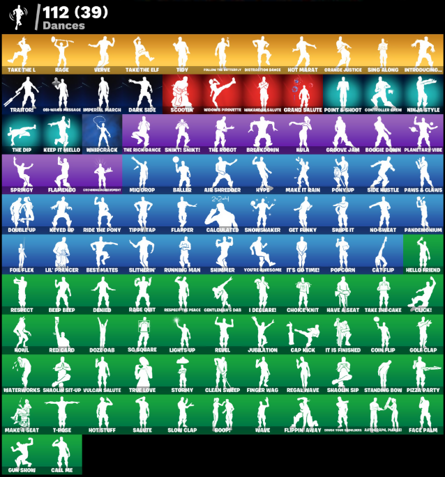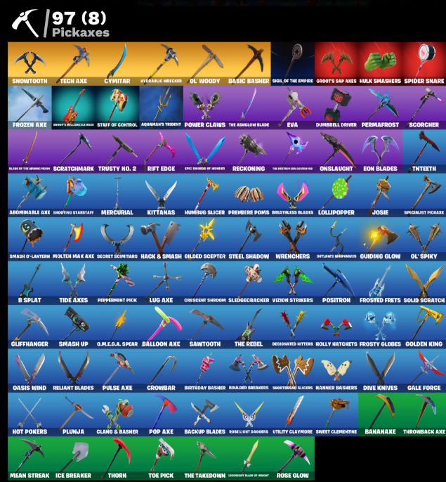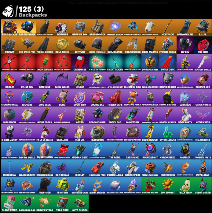 10 Field Flyer, 2020 Kickflip, 8-Ball Janky, A.I.M., Abominable Axe, Adira's Battle Flag, Adventure Pack, Agent Peely, Air Shredder, Alpha Trophy, Altitude, Ancestral Bloom, Apocalypse Shroud, Aquaman, Aquaman's Trident, Arctic Adeline, Armaments of the Last Realm, Arroyo Pack, Assault Trooper, Astro, Astroworld Cyclone, Aura, Auto Clutch, Autograph Please, B Splat, Backup Blades, Baller, Balloon Axe, Balls of Power, Banana Bomber, Banana Briefcase, Bananaaxe, Base Jumper, Basecamp Bag, Basic Basher, Bat Royale, Battle Bloom, Battlehawk, Beach Umbrella, Beachcomber, Beep Beep, Best Mates, Big Haul, Birthday Basher, Birthday Cake, Blade Raven, Blitz Wings, Blue Squire, Blue Streak, Blue Team Leader, Blustery Bag, Bobo, Bogey Bag, Bombs Away!, Boogie Down, Boop!, Boulder Breakers, Bounty 'Brella, Breakdown, Breathless Blades, Brella, Bullet Rider, Bullseye, Cacodemon, Calamity, Calculated, Call Me, Cap Kick, Carbide, Carbon, Cat Flip, Catalyst, Cazadora, Chaos Double Agent, Charge Pack, Choice Knit, Chromebrella, Chromeseed, Circuit Breaker, Clang & Basher, Classified, Clawz Retro, Clean Sweep, Cliffhanger, Cliffside Soarer, Cluck!, Coin Flip, Color Guard, Combat Wreath, Comet Crasher, Comfy Cats, Confettirotti T'Shirt Brella, Conquest, Controller Crew, Convergence, Covered Crusader, Crescent Shroom, Crewmate, Crimepool's Katanas, Crossfire, Crowbar, Cruiser, Crystal Llama, Cymitar, DJ Yonder, Dab, Dark Engine, Dark Matter, Dark Side, Dark Voyager, Deadpool, Deadpool's Katanas, Dealer's Deck, Deep Dive, Denied, Designated Hitters, Dieselback Pack, Dino Deck, Dire, Distraction Dance, Dive Knives, Dominoer's Trophy, Doom Chalice, Double Agent Hard Case, Double Agent Hush, Double Agent Ooze Unit, Double Agent Stripe, Double Agent Wildcard, Double Header, Double Up, Downpour, Downshift, Doze Dab, Drift, Drome Drifter, Dumbbell Driver, Dusk, Dusk Wings, E.L.I.M., Eclipse Brella, Electric Shredder, Elite Agent, Enforcer, Eon Blades, Equalizer, Eternal Knight, Eternal Shield, Eva, Fa-La-La-Llama, Fable, Fabled Cape, Face Palm, Fade, Feathered Flyer, Feline Fun, Finger Wag, Fishstick Janky, Fishy Flier, Flamenco, Flapjack Flyer, Flapper, Flippin’ Away, Foil Flex, Follow The Butterfly, Fortilla Flier, Foundational 'Brella, Founder's Glider, Founder's Umbrella, Fox Wayfinder, Frostburn, Frosted Frets, Frosty Globes, Frozen Axe, Frozen Shroud, Gale Force, Gear Specialist Maya, Gentleman’s Dab, Get Down!, Get Funky, Giddy-Up, Gilded Scepter, Glidurr, Gold Brutus, Gold Dagger Pack, Gold Meowscles, Gold Midas, Gold Token, Golden King, Gole Clap, Goodie Bag, Grand Salute, Groots Sap Axes, Groove Jam, Groovin’ Achievement, Guiding Glow, Gun Show, Hack & Smash, Hadean Gate, Har-Har-Har!, Have A Seat, Hello Friend, Hench Hauler, High Octane, Holly Hatchets, Hot Marat, Hot Pokers, Hot Stuff, Howl, Hula, Hulk Smashers, Humbug Slicer, Huntress, Hydraulic Wrecker, Hype, I Declare!, Ice Breaker, Ice Cube, Imperial March, Infinite Bloom, Intrepid, Introducing..., Invasion, Iris, It Is Finished, It’s Go Time!, Josie, Jubilation, Jules, Jumpshot, Kabagi, Keep It Mello, Keyed Up, Kit, Kittanas, Krisabelle, Lectro Guard Pack, Legend's Mookit, Lights Up, Lil' Black Heart, Lil' Kev, Lil’ Prancer, Liteshow, Llamacorn Express, Lollipopper, Lt. Evergreen, Lug Axe, Lunar Hyperjet, Lunar Skyspan, Lunarios, Lynx, Mae Jr., Major ManCake, Make A Seat, Make It Rain, Mean Streak, Mega-Brella, Mercurial, Metal Team Leader, Metalhead, Mic Drop, Mighty Marvel T'Rella, Millennium Falcon, Mini Moon, Mission Specialist, Modern, Molten Max Axe, Moonwalker, Mr. Daruma, Nana-Brella, Nanner Bashers, Needle Dropper, Nemesis Box, Neon Man O' War, Neon Wings, Night Cloak, Nightshade, Ninja Style, No Sweat, Nyanjas Catpak, O.M.E.G.A. Spear, Oasis Wind, Obi-Wan’s Message, Ocean, Offworld Rig, Ohm, Ol' Woody, Ollie, Ol’ Spiky, Omega, Onslaught, Oopsy Drones-y, Orange Justice, Outlaw's Knife Rack, Outlaws’ Whipknives, Palm Leaf, Pandemonium, Paper Parasol, Paws & Claws, Peely Whip, Peppermint Pick, Perfect Present, Permafrost, Picnic, Pit Faller, Pizza Party, Planetary Probe, Planetary Vibe, Plunja, Point & Shoot, Point Patroller, Polar Peely, Pony Up, Pool Party, Pop Axe, Popcorn, Positron, Powder, Powder Keg, Power Claws, Precision, Premiere Poms, Prized Llama, Psionic Surfer, Pulse Axe, Punk Powerglider, Pursuit, Rage, Rage Quit, Ragnarok, Rainbow Rider, Ranker's Tags, Re-Gifter, Rearguard, Rebel Brella, Rebel's Rucksack, Reckoning, Recon Specialist, Recon Strike, Red Card, Red Robin's Wings, Redline, Redmask Ranker, Regal Wave, Reliant Blades, Remnant Blossom, Respect, Respect The Peace, Revel, Ride The Pony, Rift Edge, Rogue Agent, Rook, Rose Glow, Rose Light Daggers, Rose Rider, Rose Team Leader, Roundabout, Royale Air, Royale Knight, Royale Shield, Running Man, Runway Racer, Rust Bucket, Rust Lord, Salute, Salvaged Chute, Santa Dogg, Sawtooth, Scales of Justice, Scootin’, Scorcher, Scratchmark, Scuba Jonesy, Secret Scimitars, Sentinel, Seven Signet, Sgt. Winter, Shadow Stalker, Shaolin Sip, Shaolin Sit-Up, Shimmer, Shooting Starstaff, Shortbread Slicers, Side Hustle, Sigil of the Empire, Silent Slicer, Sing Along, Siona, Skerran, Skirmish, Skye, Sled Ready Guff, Sledgecracker, Sledgehammer, Slitherin’, Slow Clap, Smash O’ Lantern, Smash Up, Smellefish, Snikt! Snikt!, Snow Sailer, Snowfall, Snowflake, Snowshaker, Snowtooth, So Square, Society Emblem Standard, Society Shield, Solid Scratch, Specialist Pickaxe, Spectra Protector, Spider Snare, Splashdown, Springy, Squad Leader, Squire Shield, Staff of Control, Standard Issue, Standing Bow, Star Strider, Stealing Wheel, Steel Shadow, Storm Crash, Stormcloud, Stormy, Stratosphere, Subjugator, Sugar Crash, Sultura, Sun Sprout, Sun Strider, Sunken Sackburner, Sunny's Lander, Super Cape, Supreme Shell, Sushi Sign, Swarm, Sweet Clementine, Swipe It, Swole Sailer, T-Pose, Tactical Sleigh, Tagged 'Brella, Take The Cake, Take The Elf, Take The L, Tech Axe, Teknique, The Ashglow 