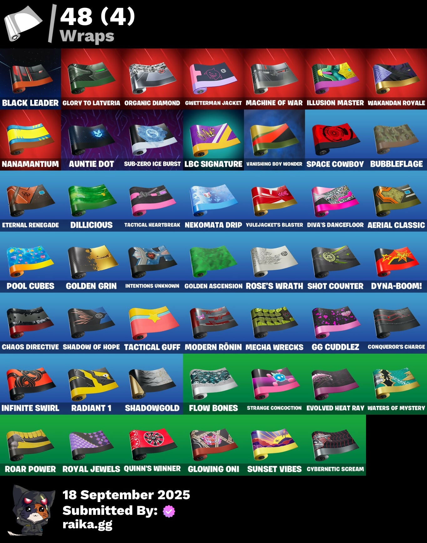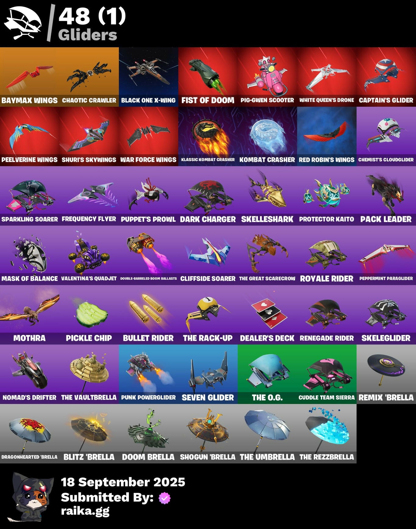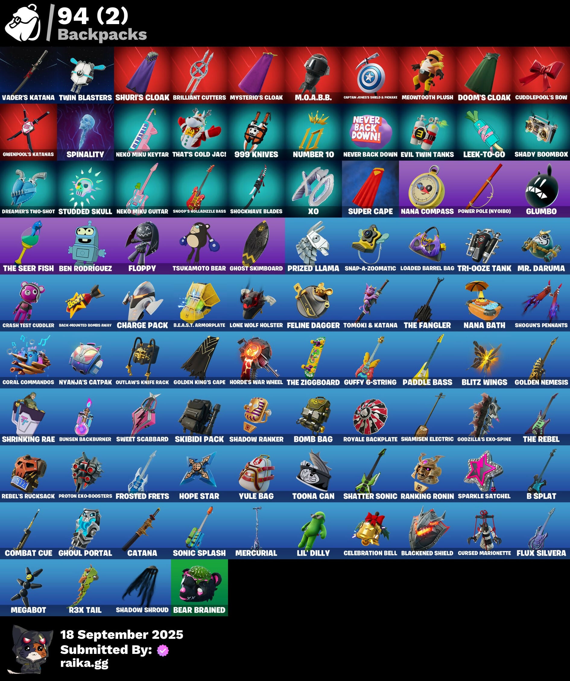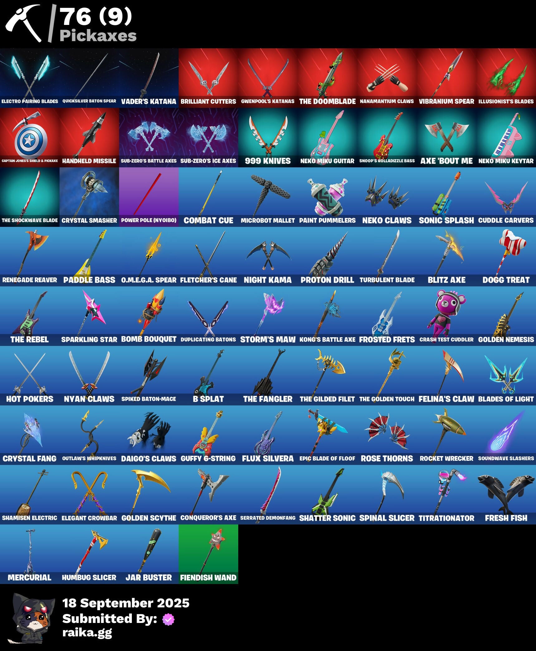 (Snikt!), 1-Ball, 999 Knives, Aang's Air Sphere, Aces Wild Card, Adventure Peely, Aerial Assault Bomber, Aerial Assault Captain, Aerial Assault Trooper, Aerial Classic, Aerial Swagger, Appeeling Drive, Ascendant Midas, Auntie Dot, Aura, Axe 'Bout Me, Axo's Big Moment, Azuki, B Splat, B.E.A.S.T. Armorplate, B.E.A.S.T. Glove, Babygirl!!!, Back-Mounted Bombs Away, Backlash, Baron's Hoard, Battle Blessing, Baymax Wings, Bear Brained, Bear Hug, Beerus, Ben Rodriguez, Bender Bending Rodriguez, Bi-Han, Big Dill, Bird Call, Birthday Bud, Black Leader, Black One X-Wing, Black Panther (Shuri), Blackened Shield, Blades of Light, Blitz 'Brella, Blitz Axe, Blitz Wings, Bomb Bag, Bomb Bouquet, Boogie Down, Brilliant Cutters, Brite Hatsune Miku, Bubbleflage, Bullet Rider, Bunsen Backburner, CTL, Camo War Machine, Cap Attack, Captain Jones, Captain Jones's Shield & Pickaxe, Captain Llamerica, Captain's Glider, Cassidy Quinn, Catana, Cauldron Chill, Celebration Bell, Chalked Up 1-Ball, Champion Stash'D, Chaos Directive, Chaos Director, Chaotic Crawler, Charge Pack, Chemist's Cloudglider, Choose Naughty, Chord Kahele, Cliffside Soarer, Color Splash Jellie, Combat Cue, Come Get Me!, Conqueror's Axe, Conqueror's Charge, Conqueror's Claim, Conqueror's Stare, Controlled Chaos, Coral Commandos, Crash Test Cuddler, Crashed Chiller, Crashed Shield, Cross Grand Entrance, Crowning Achievement, Crystal, Crystal Fang, Crystal Smasher, Cuddle Carvers, Cuddle Team Sierra, Cuddle Team Specialist, Cuddle's Garden, Cuddlepool, Cuddlepool's Bow, Cursed Marionette, Cybernetic Scream, Da Bomb, Daigo, Daigo's Claws, Dancefloor Diva, Dark Charger, Dark Gwenpool, Darth Vader Samurai, Dealer's Deck, Demon Hunter Hope, Determined Kendo, Digital Dream, Dillicious, Dillinger The Gherk, Diva Fever, Diva's Dancefloor, Diva's Grin, Dogg Treat, Doom, Doom Brella, Doom's Cloak, Double-Barreled Boom Ballasts, Dough On The Go, Doughberman, Dragonhearted 'Brella, Dreamer's Two-Shot, Duelist's Card Trick, Dupli-Kate, Duplicating Batons, Duplikates, Dyna-Boom!, Dynamic Tntina, Dynamo, Dynamo Tntina, Electro Pairing Blades, Elegant Crowbar, Emma Frost, Emma's Influence, Energized Godzilla, Epic Blade of Floof, Eternal Renegade, Evil Twin Tanks, Evolved Heat Ray, Eyes Of The Cuddle Team, Felina, Felina's Claw, Feline Dagger, Fiendish Wand, Fireworks Salvo, Fist Bump, Fist Of Doom, Fletcher Kane, Fletcher's Cane, Floppy, Flow Bones, Flux Silvera, Frequency Flyer, Fresh Fish, Front Page Pose, Frosted Frets, Frozen Treat Cart, Frozone's Stunt, Full Moon Fletcher Kane, Fusion! Hah!!, Get Griddy, Gg Cuddlez, Ghost Skimboard, Ghoul Portal, Ghoul Trooper, Glory To Latveria, Glowing Oni, Glumbo, Godzilla Awaits, Godzilla Evolved, Godzilla's Exo-Spine, Golden Ascension, Golden Conqueror, Golden Ghoul, Golden Grin, Golden King's Cape, Golden Nemesis, Golden Scythe, Golden Wolf, Grimey, Groovy!, Guardian Jade, Guffmas Tree, Guffy 6-String, Gunslinger Outlaw Midas, Gwen-Step, Gwenpool, Gwenpool's Glee, Gwenpool's Katanas, Gwetterman Jacket, Handheld Missile, Heart Chopper, Heavy Metal Omega, Hellfire Dance, Hero Baymax, Heroic Baymax, Hope Star, Horde's War Wheel, Hot 'n Sour, Hot Pokers, Howlin', Humbug Slicer, Hype!, Illusion Master, Illusionist's Blades, Incoming Illusion, Infinite Swirl, Intentions Unknown, Invisible Cut, Iron Man, It's Chemistry!, It's Miku!, Jabba Switchway, Jade, Jade's Curse, Jar Buster, Jet Signals, Joss, Joss' Chaos, Juice Wrld, Ka Boom!, Ka-Choohm!, Keisha Cross, Kendo, King Of The Outlaws, Kintsugi Daigo, Klassic Kombat Crasher, Knight Conqueror, Kombat Crasher, Kong, Kong's Battle Axe, Laughing Skull, Lbc Signature, Leek-To-Go, Lil' Dilly, Lil' Godzilla Attack, Lil' Tank, Lionel Messi, Loaded Barrel Bag, Lone Wolf Holster, Lucky Nyanja, M.O.A.B.B., Ma-Ya-Hi, Machine Of War, Marshinobi, Marshmello, Mask Of Balance, Maximum Bounce, Mecha Wrecks, Mechagodzilla, Megabot, Melty Team Leader, Meowdas, Meowdas Mark, Meowtooth Plush, Mercurial, Microbot Mallet, Midnight Skye, Midsummer Midas, Miku Live, Modern Rōnin, Mothra, Mr. Daruma, Mysterio, Mysterio's Cloak, Mysterio's Magic Trick, Nana Bath, Nana Compass, Nanamantium, Nanamantium Claws, Neko Claws, Neko Hatsune Miku, Neko Miku Guitar, Neko Miku Keytar, Nekomata Drip, Never Back Down, Never Yield, Nick Eh 30, Night Kama, Nightmare, Nighty Knight, Nitehare, Nomad's Drifter, Number 10, Number One, Nyan Claws, Nyanja, Nyanja's Catpak, O.M.E.G.A. Spear, Ones N Twos, Organic Diamond, Outlaw Midas, Outlaw's Knife Rack, Outlaw's Mugshot, Outlaw's Strut, Outlaw's Whipknives, Outta My Skull, Pack Leader, Paddle Bass, Paint Pummellers, Party Beats, Party Hips, Peel Out, Peelverine, Peelverine Classic, Peelverine Wings, Peelverine's Attack, Peely Bone, Peppermint Paraglider, Phthalo Blue Joss, Pickle Chip, Piercing Ace, Pig-Gwen Scooter, Plungerman, Polar Team Specialist, Pool Cubes, Popular Vibe, Power Pole (Nyoibo), Prized Llama, Protector Kaito, Proton Drill, Proton Exo-Boosters, Punk Powerglider, Puppet Dance, Puppet's Prowl, Purr-Demonium, Quicksilver Baton Spear, Quinn's Winner, R3X Tail, Racer Kendo, Radiant 1, Ranking Ronin, Rap Boy Reloaded, Raven's Legion, Ready. Set. Nyanja., Rebel Bubble, Rebel's Rucksack, Red Robin's Wings, Remix 'Brella, Renegade Racer, Renegade Raider, Renegade Reaver, Renegade Rebel, Renegade Rider, Renzo The Champion, Restored Night Rose, Rhythm Of Chaos, Rise & Brine, Roar Power, Rocket Wrecker, Rose Thorns, Rose's Wrath, Royal Jewels, Royale Backplate, Royale Rider, Samurai Baymax, Santa Dogg, Scootin' Circles, Serrated Demonfang, Seven Glider, Shadow Blade Hope, Shadow Meowdas, Shadow Of Hope, Shadow Ranker, Shadow Shroud, Shadowgold, Shadowstruck Director, Shady Boombox, Shamisen Electric, Shamisen-Sational, Shatter Sonic, Shockwave Blades, Shogun 'Brella, Shogun X, Shogun's Pennants, Shot Counter, Show 'Em Off, Shrinking Rae, Shuri, Shuri's Cloak, Shuri's Skywings, Shuri's Slashmark, Six String Sniper, Skatemonster, Skele-Dance, Skeleglider, Skelles
