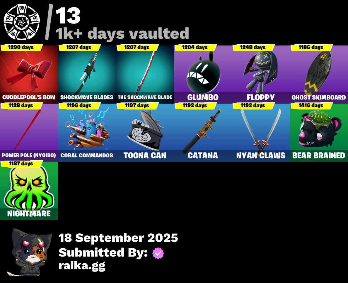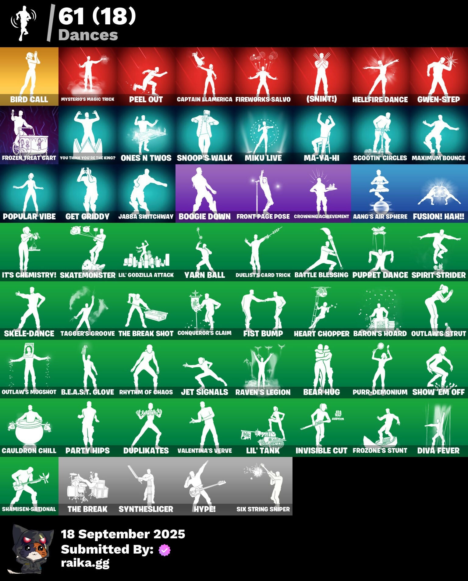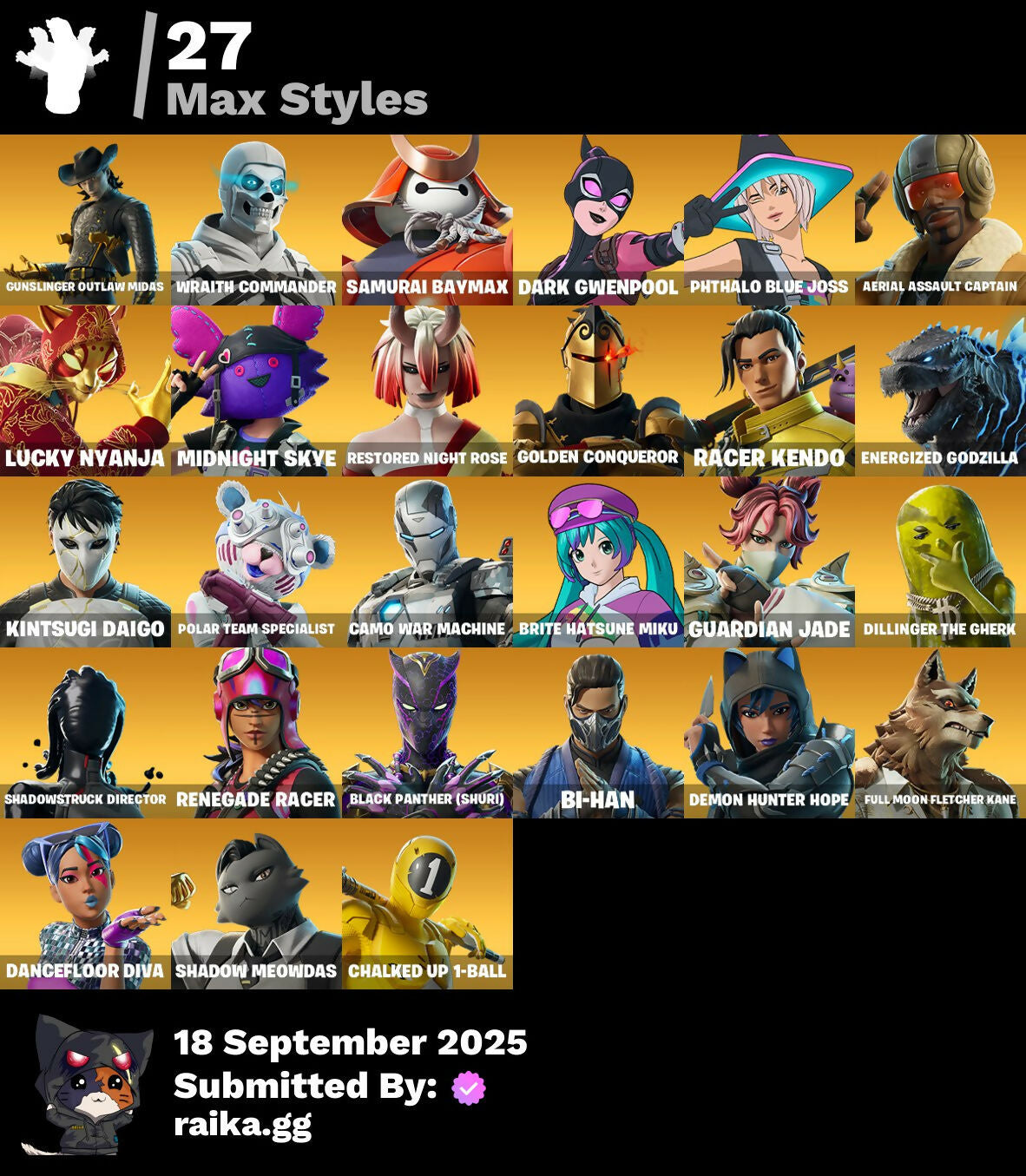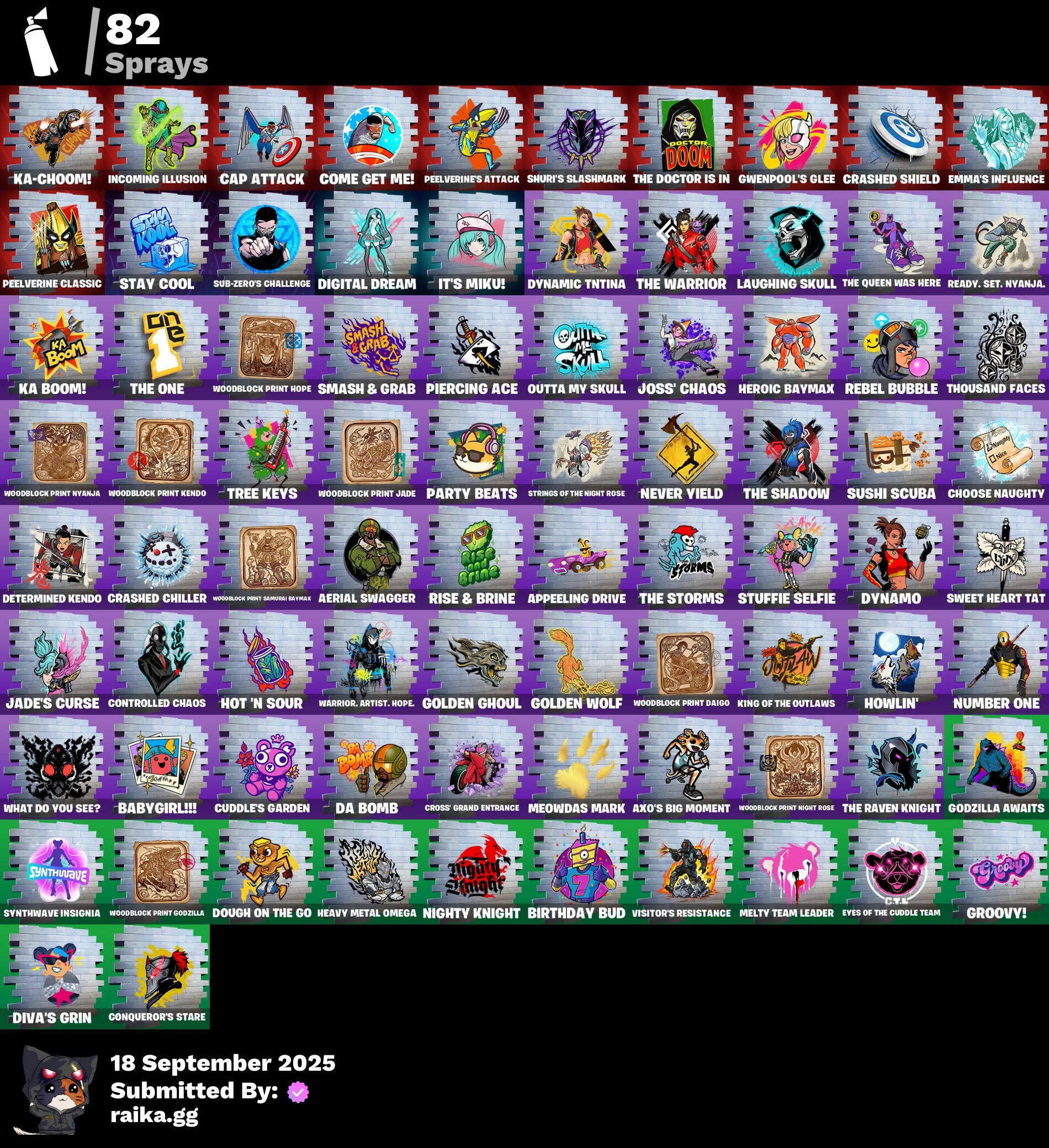 (Snikt!), 1-Ball, 999 Knives, Aang's Air Sphere, Aces Wild Card, Adventure Peely, Aerial Assault Bomber, Aerial Assault Captain, Aerial Assault Trooper, Aerial Classic, Aerial Swagger, Appeeling Drive, Ascendant Midas, Auntie Dot, Aura, Axe 'Bout Me, Axo's Big Moment, Azuki, B Splat, B.E.A.S.T. Armorplate, B.E.A.S.T. Glove, Babygirl!!!, Back-Mounted Bombs Away, Backlash, Baron's Hoard, Battle Blessing, Baymax Wings, Bear Brained, Bear Hug, Beerus, Ben Rodriguez, Bender Bending Rodriguez, Bi-Han, Big Dill, Bird Call, Birthday Bud, Black Leader, Black One X-Wing, Black Panther (Shuri), Blackened Shield, Blades of Light, Blitz 'Brella, Blitz Axe, Blitz Wings, Bomb Bag, Bomb Bouquet, Boogie Down, Brilliant Cutters, Brite Hatsune Miku, Bubbleflage, Bullet Rider, Bunsen Backburner, CTL, Camo War Machine, Cap Attack, Captain Jones, Captain Jones's Shield & Pickaxe, Captain Llamerica, Captain's Glider, Cassidy Quinn, Catana, Cauldron Chill, Celebration Bell, Chalked Up 1-Ball, Champion Stash'D, Chaos Directive, Chaos Director, Chaotic Crawler, Charge Pack, Chemist's Cloudglider, Choose Naughty, Chord Kahele, Cliffside Soarer, Color Splash Jellie, Combat Cue, Come Get Me!, Conqueror's Axe, Conqueror's Charge, Conqueror's Claim, Conqueror's Stare, Controlled Chaos, Coral Commandos, Crash Test Cuddler, Crashed Chiller, Crashed Shield, Cross Grand Entrance, Crowning Achievement, Crystal, Crystal Fang, Crystal Smasher, Cuddle Carvers, Cuddle Team Sierra, Cuddle Team Specialist, Cuddle's Garden, Cuddlepool, Cuddlepool's Bow, Cursed Marionette, Cybernetic Scream, Da Bomb, Daigo, Daigo's Claws, Dancefloor Diva, Dark Charger, Dark Gwenpool, Darth Vader Samurai, Dealer's Deck, Demon Hunter Hope, Determined Kendo, Digital Dream, Dillicious, Dillinger The Gherk, Diva Fever, Diva's Dancefloor, Diva's Grin, Dogg Treat, Doom, Doom Brella, Doom's Cloak, Double-Barreled Boom Ballasts, Dough On The Go, Doughberman, Dragonhearted 'Brella, Dreamer's Two-Shot, Duelist's Card Trick, Dupli-Kate, Duplicating Batons, Duplikates, Dyna-Boom!, Dynamic Tntina, Dynamo, Dynamo Tntina, Electro Pairing Blades, Elegant Crowbar, Emma Frost, Emma's Influence, Energized Godzilla, Epic Blade of Floof, Eternal Renegade, Evil Twin Tanks, Evolved Heat Ray, Eyes Of The Cuddle Team, Felina, Felina's Claw, Feline Dagger, Fiendish Wand, Fireworks Salvo, Fist Bump, Fist Of Doom, Fletcher Kane, Fletcher's Cane, Floppy, Flow Bones, Flux Silvera, Frequency Flyer, Fresh Fish, Front Page Pose, Frosted Frets, Frozen Treat Cart, Frozone's Stunt, Full Moon Fletcher Kane, Fusion! Hah!!, Get Griddy, Gg Cuddlez, Ghost Skimboard, Ghoul Portal, Ghoul Trooper, Glory To Latveria, Glowing Oni, Glumbo, Godzilla Awaits, Godzilla Evolved, Godzilla's Exo-Spine, Golden Ascension, Golden Conqueror, Golden Ghoul, Golden Grin, Golden King's Cape, Golden Nemesis, Golden Scythe, Golden Wolf, Grimey, Groovy!, Guardian Jade, Guffmas Tree, Guffy 6-String, Gunslinger Outlaw Midas, Gwen-Step, Gwenpool, Gwenpool's Glee, Gwenpool's Katanas, Gwetterman Jacket, Handheld Missile, Heart Chopper, Heavy Metal Omega, Hellfire Dance, Hero Baymax, Heroic Baymax, Hope Star, Horde's War Wheel, Hot 'n Sour, Hot Pokers, Howlin', Humbug Slicer, Hype!, Illusion Master, Illusionist's Blades, Incoming Illusion, Infinite Swirl, Intentions Unknown, Invisible Cut, Iron Man, It's Chemistry!, It's Miku!, Jabba Switchway, Jade, Jade's Curse, Jar Buster, Jet Signals, Joss, Joss' Chaos, Juice Wrld, Ka Boom!, Ka-Choohm!, Keisha Cross, Kendo, King Of The Outlaws, Kintsugi Daigo, Klassic Kombat Crasher, Knight Conqueror, Kombat Crasher, Kong, Kong's Battle Axe, Laughing Skull, Lbc Signature, Leek-To-Go, Lil' Dilly, Lil' Godzilla Attack, Lil' Tank, Lionel Messi, Loaded Barrel Bag, Lone Wolf Holster, Lucky Nyanja, M.O.A.B.B., Ma-Ya-Hi, Machine Of War, Marshinobi, Marshmello, Mask Of Balance, Maximum Bounce, Mecha Wrecks, Mechagodzilla, Megabot, Melty Team Leader, Meowdas, Meowdas Mark, Meowtooth Plush, Mercurial, Microbot Mallet, Midnight Skye, Midsummer Midas, Miku Live, Modern Rōnin, Mothra, Mr. Daruma, Mysterio, Mysterio's Cloak, Mysterio's Magic Trick, Nana Bath, Nana Compass, Nanamantium, Nanamantium Claws, Neko Claws, Neko Hatsune Miku, Neko Miku Guitar, Neko Miku Keytar, Nekomata Drip, Never Back Down, Never Yield, Nick Eh 30, Night Kama, Nightmare, Nighty Knight, Nitehare, Nomad's Drifter, Number 10, Number One, Nyan Claws, Nyanja, Nyanja's Catpak, O.M.E.G.A. Spear, Ones N Twos, Organic Diamond, Outlaw Midas, Outlaw's Knife Rack, Outlaw's Mugshot, Outlaw's Strut, Outlaw's Whipknives, Outta My Skull, Pack Leader, Paddle Bass, Paint Pummellers, Party Beats, Party Hips, Peel Out, Peelverine, Peelverine Classic, Peelverine Wings, Peelverine's Attack, Peely Bone, Peppermint Paraglider, Phthalo Blue Joss, Pickle Chip, Piercing Ace, Pig-Gwen Scooter, Plungerman, Polar Team Specialist, Pool Cubes, Popular Vibe, Power Pole (Nyoibo), Prized Llama, Protector Kaito, Proton Drill, Proton Exo-Boosters, Punk Powerglider, Puppet Dance, Puppet's Prowl, Purr-Demonium, Quicksilver Baton Spear, Quinn's Winner, R3X Tail, Racer Kendo, Radiant 1, Ranking Ronin, Rap Boy Reloaded, Raven's Legion, Ready. Set. Nyanja., Rebel Bubble, Rebel's Rucksack, Red Robin's Wings, Remix 'Brella, Renegade Racer, Renegade Raider, Renegade Reaver, Renegade Rebel, Renegade Rider, Renzo The Champion, Restored Night Rose, Rhythm Of Chaos, Rise & Brine, Roar Power, Rocket Wrecker, Rose Thorns, Rose's Wrath, Royal Jewels, Royale Backplate, Royale Rider, Samurai Baymax, Santa Dogg, Scootin' Circles, Serrated Demonfang, Seven Glider, Shadow Blade Hope, Shadow Meowdas, Shadow Of Hope, Shadow Ranker, Shadow Shroud, Shadowgold, Shadowstruck Director, Shady Boombox, Shamisen Electric, Shamisen-Sational, Shatter Sonic, Shockwave Blades, Shogun 'Brella, Shogun X, Shogun's Pennants, Shot Counter, Show 'Em Off, Shrinking Rae, Shuri, Shuri's Cloak, Shuri's Skywings, Shuri's Slashmark, Six String Sniper, Skatemonster, Skele-Dance, Skeleglider, Skelles