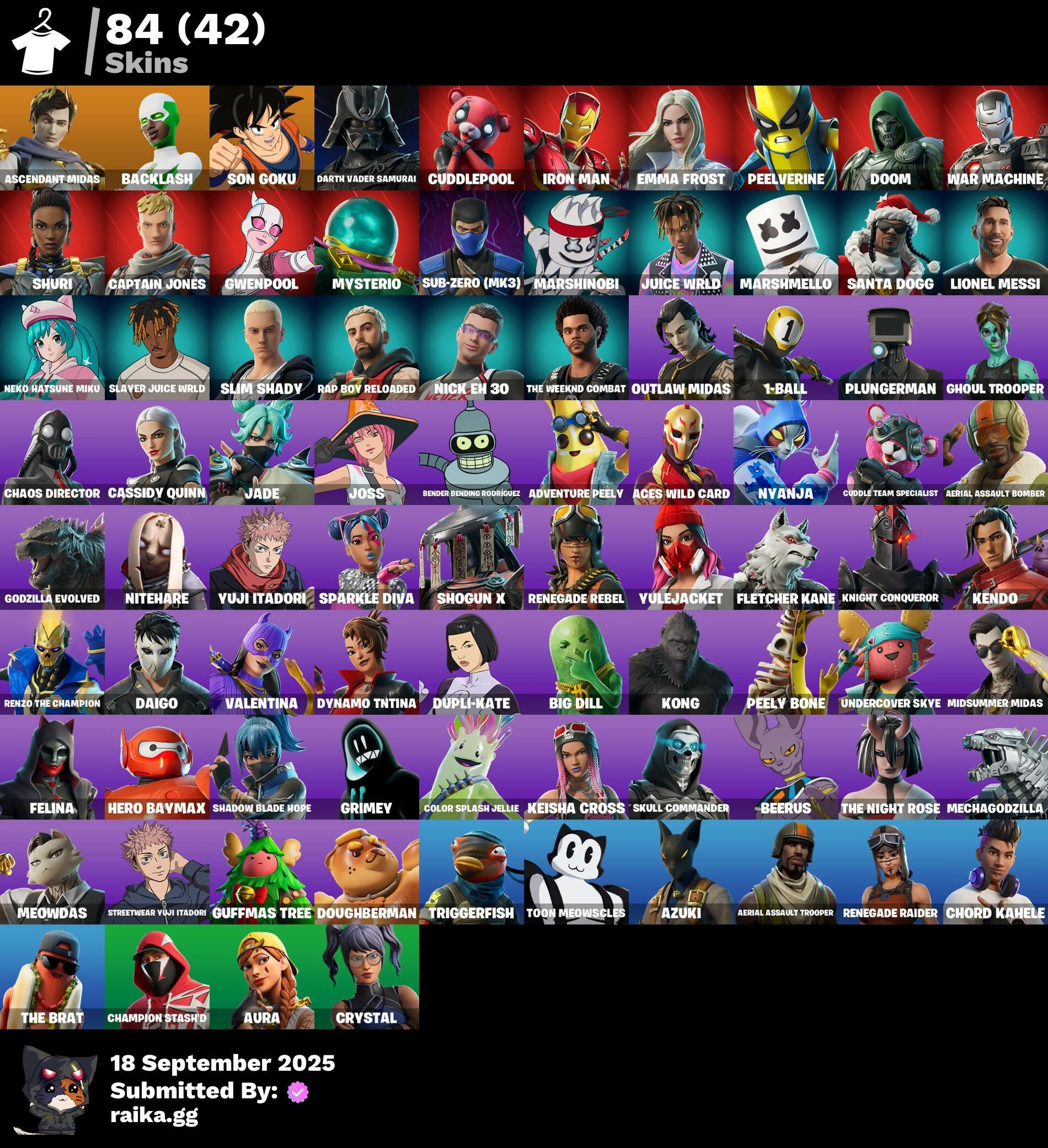[PC/PSN/XBOX] 84 skins | Renegade Raider | Aerial Assault Trooper | Ascendant Midas | Backlash | Son Goku | Darth Vader Samurai | Cuddlepool | Iron Man | 300 VB / Fortnite