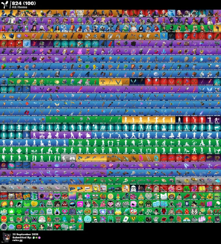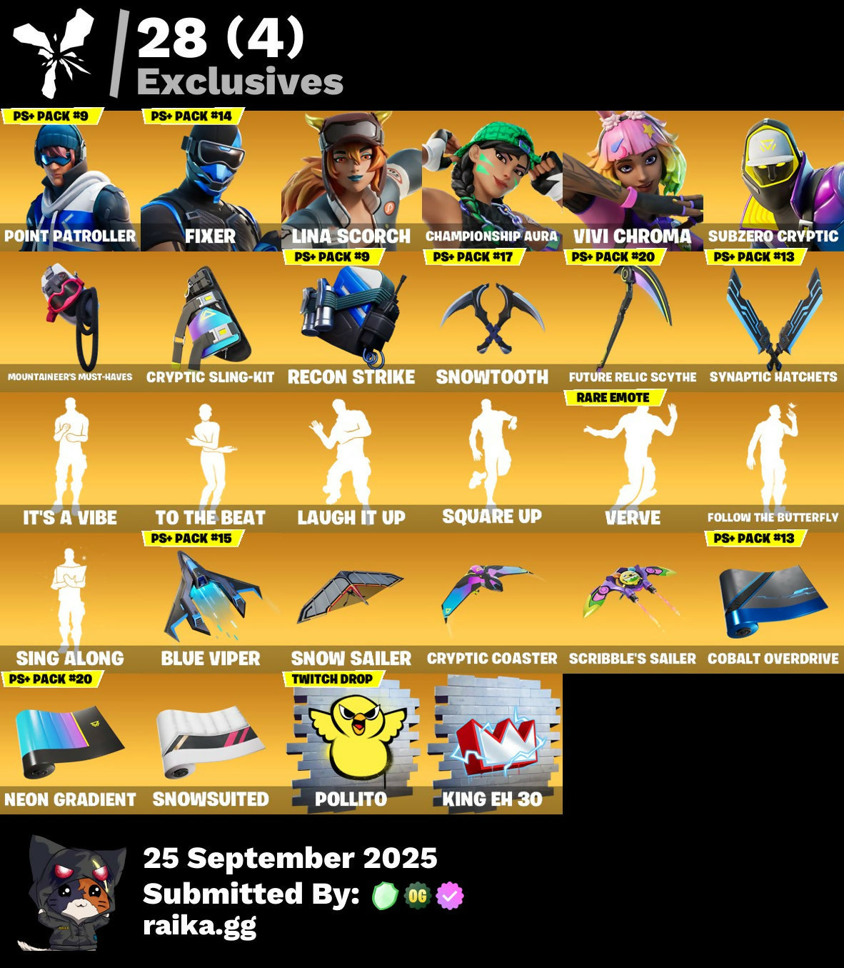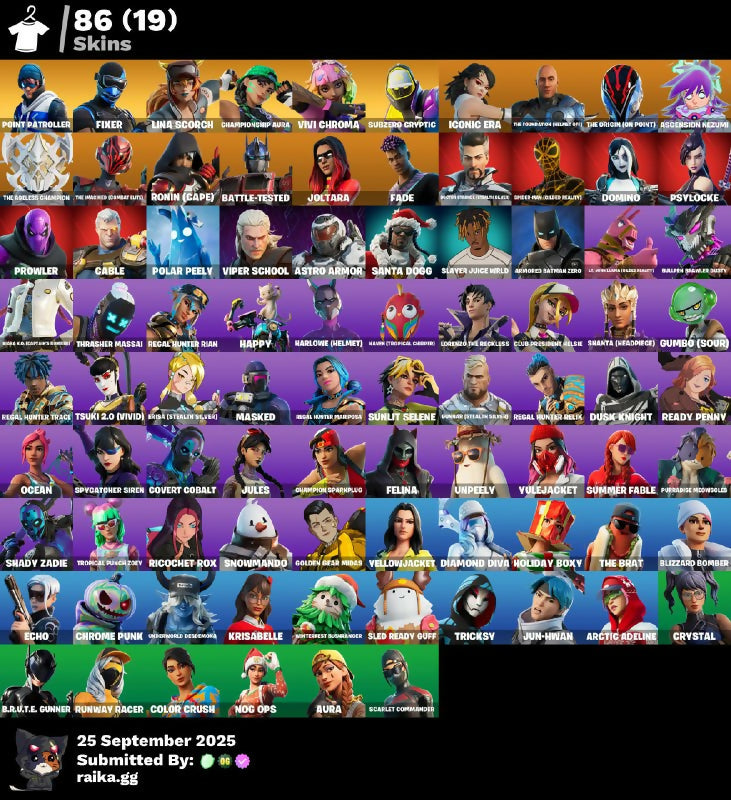 Arctic Adeline, Aria (Stealth Silver), Armored Batman Zero, Ascension Nezumi, Astro Armor, Atheist, Aura, B.R.U.T.E. Gunner, Ballen (Brawler Daisy), Battle-Tested, Blizzard Bomber, Blue Striker, Blue Viper, Bullpen Brawler Dusty, Cable, Champion Sparkplug, Championship Aura, Chrome Punk, Club President Helsie, Club President Kelsie, Cobalt Overdrive, Color Crush, Covert Cobalt, Cryptic Coaster, Cryptic Sling-Kit, Crystal, Dark Bomber, Diamond Diva, Doctor Strange (Stealth Silver), Domino, Dunker (Stealth Silver), Dusk Knight, Echo, Erisa (Stealth Silver), Eternal, Eternal Voyager, Fade, Felina, Firewalker, Fixer, Follow The Butterfly, Future Relic Scythe, Golden Gear Midas, Gumbo (Sour), Gunnar (Stealth Silver), Happy, Harlowe (Helmet), Haven (Tropical Chirper), Hawn (Tropical Caddie), Holiday Boxy, Iconic Era, It's A Vibe, Joltara, Jules, Jun-Hwan, Kiara K.O. (Captain's Bomber), King Eh 30, Krisabelle, Laugh It Up, Lina Scorch, Lorenzo The Reckless, Lt. Bella (Llama Linda Reality), Lt. John Llama (Gilded Reality), Luxe, Masked, Neon Gradient, Neon Tropics, Nog Ops, Ocean, Paradise Moonsoleil, Photo Sentinel (Stillmails Like), Point Patroller, Polar Peely, Pollito, Prowler, Psylocke, Ready Penny, Recon Strike, Regal Hunter Amadeus, Regal Hunter Mariposa, Regal Hunter Melia, Regal Hunter Relik, Regal Hunter Rian, Regal Hunter Trace, Ricochet Rox, Ronin (Cape), Runway Racer, Santa Dogg, Scarlet Commander, Scribble's Sailer, Scuba Jonesy, Shaanta (Headpiece), Shady Zadie, Shanta (Headpiece), Sheer Paw (Ouro Reality), Sing Along, Siona, Slayer Juice World, Sled Ready Guff, Snow Sailer, Snow Sniper, Snowmando, Snowsuited, Snowtooth, Spider-Man (Gilded Reality), Spycatcher Siren, Square Up, Subzero Cryptic, Summer Fable, Summit Seeker Archer, Summit Seeker Archon, Summit Seeker Battlehawk, Summit Seeker Battlehound, Summit Seeker Black Knight, Summit Seeker Blackheart, Summit Seeker Blue Team Leader, Summit Seeker Brite Bomber, Summit Seeker Brutus, Summit Seeker Cable, Summit Seeker Calamity, Summit Seeker Carbide, Summit Seeker Carnage, Summit Seeker Catalyst, Summit Seeker Clue, Summit Seeker Cr1tikal, Summit Seeker Crimsom Scout, Summit Seeker Cuddle Team Leader, Summit Seeker Cyclops, Summit Seeker Dark Beyonder, Summit Seeker Dark Voyager, Summit Seeker Deadpool, Summit Seeker Deadpool Classic, Summit Seeker Deadpool Haze, Summit Seeker Demi, Summit Seeker Doctor Doom, Summit Seeker Doom Slayer, Summit Seeker Drift, Summit Seeker Elite Agent, Summit Seeker Evie, Summit Seeker Fable, Summit Seeker Fade, Summit Seeker Galaxia, Summit Seeker Gambit, Summit Seeker Genesis, Summit Seeker Ghost Rider, Summit Seeker Groot, Summit Seeker Groot Floral, Summit Seeker Guggimon, Summit Seeker Gwen, Summit Seeker Hugo, Summit Seeker Huntress, Summit Seeker Iconic, Summit Seeker Infinity Blade, Summit Seeker Iron Man, Summit Seeker J.B. Chimpanski, Summit Seeker Jean Grey, Summit Seeker John Wick, Summit Seeker Jules, Summit Seeker Kit, Summit Seeker Kratos, Summit Seeker Leader 1, Summit Seeker Lightning, Summit Seeker Loki, Summit Seeker Lunara, Summit Seeker Lynx, Summit Seeker MJ, Summit Seeker Madcap, Summit Seeker Magma, Summit Seeker Magneto, Summit Seeker Magnus, Summit Seeker Mandy, Summit Seeker Marauder, Summit Seeker Mave, Summit Seeker Menace, Summit Seeker Mia, Summit Seeker Midas, Summit Seeker Moonwalker, Summit Seeker Morgan Freeman, Summit Seeker Mystique, Summit Seeker Nero, Summit Seeker Nexus War Thor, Summit Seeker NickMerk, Summit Seeker Nightcrawler, Summit Seeker Nitebeam, Summit Seeker Nyx, Summit Seeker Obi-Wan Kenobi, Summit Seeker Omega, Summit Seeker Omen, Summit Seeker Peely, Summit Seeker Phantom, Summit Seeker Predator, Summit Seeker Psylocke, Summit Seeker Queen, Summit Seeker Ragnarok, Summit Seeker Raptor, Summit Seeker Raven, Summit Seeker Rebirth Raven, Summit Seeker Red Knight, Summit Seeker Redline, Summit Seeker Rex, Summit Seeker Rick Sanchez, Summit Seeker Rigs, Summit Seeker Ripley, Summit Seeker Rocket Raccoon, Summit Seeker Ronin, Summit Seeker Sabretooth, Summit Seeker Scoundrel, Summit Seeker Shanta, Summit Seeker She-Hulk, Summit Seeker Shogun, Summit Seeker Skull Trooper, Summit Seeker Soldier, Summit Seeker Spawn, Summit Seeker Spider-Man, Summit Seeker Star-Lord, Summit Seeker Stark, Summit Seeker Steel, Summit Seeker Storm, Summit Seeker Sun Strider, Summit Seeker Sylus, Summit Seeker Tarana, Summit Seeker Teknique, Summit Seeker The Reaper, Summit Seeker Thor, Summit Seeker Tomatohead, Summit Seeker Triceratops, Summit Seeker Trog, Summit Seeker Tsuki 7, Summit Seeker Valor, Summit Seeker Vegeta, Summit Seeker Venom, Summit Seeker Warpaint, Summit Seeker Wild Card, Summit Seeker Wildcat, Summit Seeker Wolverine, Summit Seeker Wolverine Weapon X, Summit Seeker Wolverine X-23, Summit Seeker Wukong, Summit Seeker Yellowjacket, Summit Seeker Yond3r, Summit Seeker Zenith, Summit Seeker Zoe, Sunlit Selene, Synaptic Hatchets, The Ace, The Ageless Champion, The Brat, The Foundation (Hellfire Oil), The Foundation (Helmet Off), The Imagined (Combat Elite), The Madmen (Ombre Ultra), The Origin (On Point), Thrasher Massai, To The Beat, Triage Trooper, Tricksy, Tropical Punch Zoey, Tsuki 2.0 (Vivid), Underworld Desdemona, Unpeely, Valor, Verve, Viper School, Vivi Chroma, Vule Jacket, Whitefrest Subranger, Yellowjacket