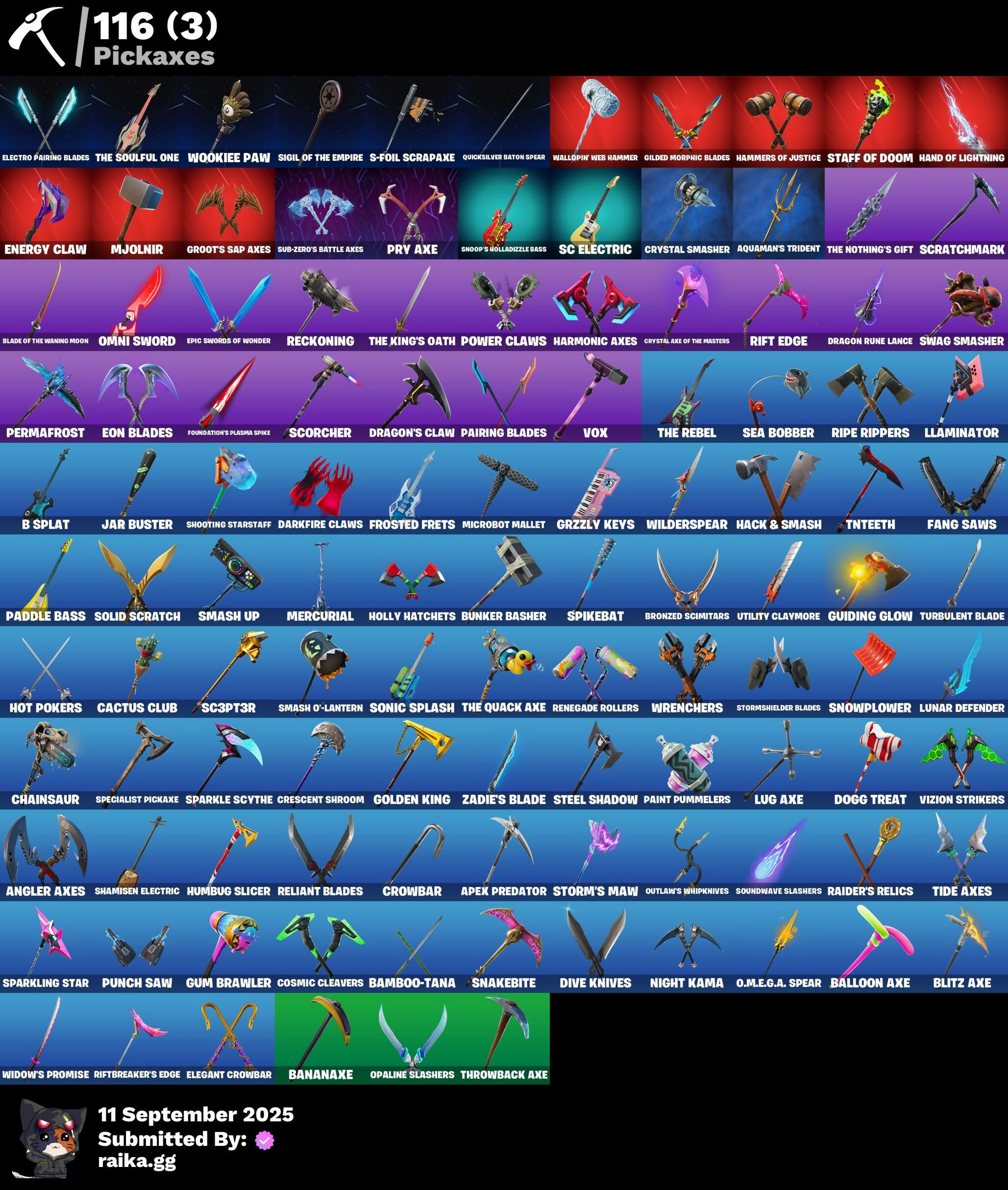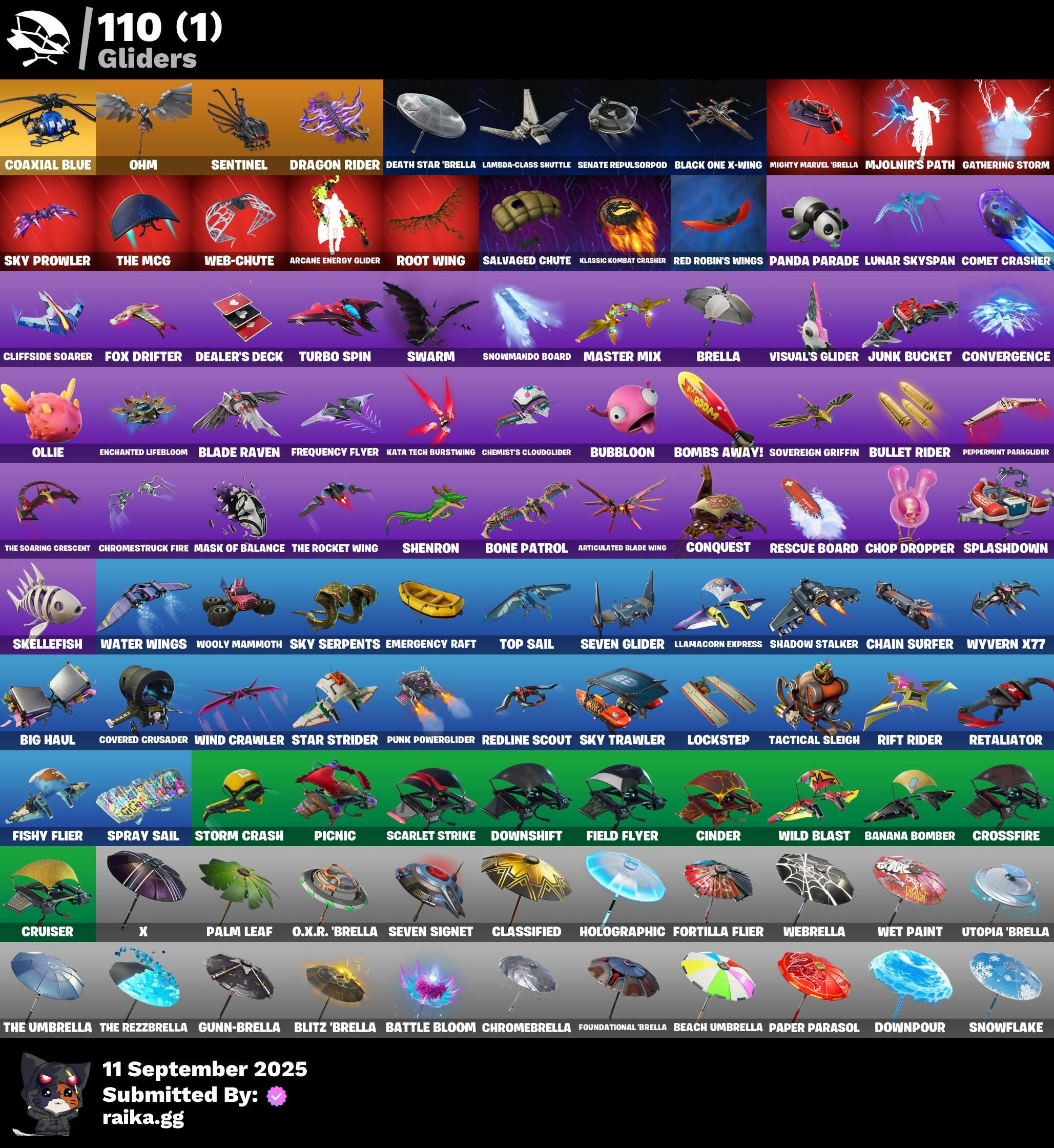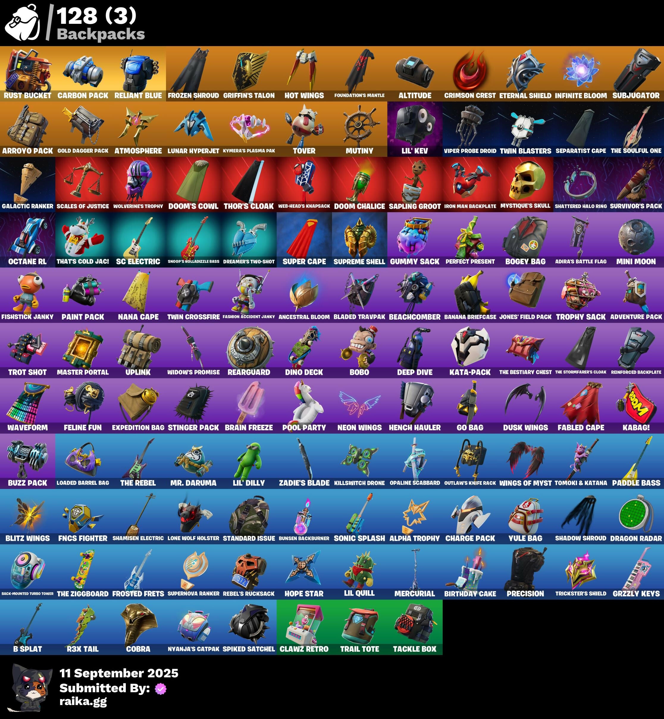 Adira, Adira's Battle Flag, Adventure Pack, Agent Jones, Agent Peely, Air Shredder, Alpha Trophy, Altitude, Ancestral Bloom, Angler Axes, Apex Predator, Aquaman, Aquaman's Trident, Arcane Energy Glider, Arroyo Pack, Articulated Blade Wing, Atmosphere, B Splat, Back-Mounted Turbo Tower, Balloon Axe, Bamboo-Tana, Banana Bomber, Banana Briefcase, Bananaxe, Baron's Hoard, Battle Bloom, Beach Umbrella, Beachcomber, Beep, Big Haul, Bike To Go, Birthday Cake, Black One X-Wing, Blackheart, Blade Of The Waning Moon, Blade Raven, Bladed Travpak, Blitz 'Brella, Blitz Axe, Blitz Wings, Bloomin' Bouquet, Blowin' Up, Blowing Bubbles, Bobo, Bogey Bag, Bombs Away!, Bone Patrol, Boogie Down, Boosting Ki, Brain Freeze, Breakdown, Brella, Bronzed Scimitars, Brutus, Bubbloon, Bullet Rider, Bunker Basher, Bunker Jonesy, Bunsen Backburner, Buzz Pack, Bytes, Cactus Club, Calamity, Calculated, Call Me, Carbon Commando, Carbon Pack, Cardistry, Cat Flip, Catalyst, Chain Surfer, Chainsaur, Charge Pack, Charging Up, Chemist's Cloudglider, Choice Knit, Chop Dropper, Chromebrella, Chromestruck Fire, Cinder, Classified, Clawz Retro, Clean Sweep, Cliffside Soarer, Cluck Strut, Coaxial Blue, Cobalt, Cobra, Coin Flip, Comet Crasher, Conga, Conquest, Convergence, Cosmic Cleavers, Covered Crusader, Crescent Shroom, Crimson Crest, Crossfire, Crowbar, Cruiser, Crystal Axe Of The Masters, Crystal Smasher, Cyclo Curl, DJ Yonder, Dabstand, Darkfire Claws, Darth Vader, Deadpool, Dealer's Deck, Death Star 'Brella, Deep Dive, Dino Deck, Dive Knives, Doctor Doom, Dogg Treat, Doom Chalice, Doom's Cowl, Downpour, Downshift, Dragon Radar, Dragon Rider, Dragon Rune Lance, Dragon Stance, Dragon's Claw, Dreamer's Two-Shot, Drift, Dusk, Dusk Knight, Dusk Wings, Electro Pairing Blades, Elegant Crowbar, Emergency Raft, Enchanted Lifebloom, Energy Claw, Enforcer, Eon Blades, Epic Swords Of Wonder, Eternal Knight, Eternal Shield, Evasive Maneuvers, Evie, Expedition Bag, FNCS Fighter, Fable, Fabled Cape, Fade, Fang Saws, Fashion Accident Janky, Feline Fun, Field Flyer, Fishstick Janky, Fishy Flier, Fist Bump, Flippin' Away, Fortilla Flier, Foundation's Mantle, Foundation's Plasma Spike, Foundational 'Brella, Fox Drifter, Frequency Flyer, Frosted Frets, Frozen Shroud, Full Tilt, Galactic Ranker, Gathering Storm, Gear Specialist Maya, Gentleman's Dab, Giddy-Up, Gilded Morphic Blades, Go Bag, Gold Dagger Pack, Gold Midas, Golden King, Golf Clap, Griffin's Talon, Grizzly Keys, Groot, Groot's Sap Axes, Grzzly Keys, Guiding Glow, Gum Brawler, Gumbo, Gummy Sack, Gunn-Brella, Gunnar, Hack & Smash, Hammers Of Justice, Hand Of Lightning, Harlowe, Harmonic Axes, Have A Seat, Haven, Hello Friend, Hench Hauler, Holly Hatchets, Holographic, Hope Star, Hot Pokers, Hot Wings, Humbug Slicer, Huntress, Hybrid, Hype!, Imperial March, Indiana Jones, Infinite Bloom, Iridia Vayne, Iron Man Backplate, It Is Finished, It's Go Time!, It's... You?, Jar Buster, Jaywalking, Jennifer Walters, Jet Signals, Jones' Field Pack, Journey vs Hazard, Jules, Jump Jets, Junk Bucket, Kabag!, Kata Tech Burstwing, Kata-Pack, Keyed Up, Killswitch Drone, Kit, Klassic Kombat Crasher, Krisabelle, Kymera, Kymera's Plasma Pak, Lambda-Class Shuttle, Lara Croft, Lil Quill, Lil' Dilly, Lil' Kev, Lil' Monster, Lil' Saucer, Llamacorn Express, Llaminator, Loaded Barrel Bag, Lockstep, Lone Wolf Holster, Love It!, Lt. John Llama, Lug Axe, Lunar Charge, Lunar Defender, Lunar Hyperjet, Lunar Skyspan, Lynx, Malik, Mask of Balance, Master Mix, Master Portal, Meowscles, Mercurial, Microbot Mallet, Mighty Marvel 'Brella, Mini Dogfight, Mini Moon, Mjolnir, Mjolnir's Path, Mr. Daruma, Mutiny, Mwahaha, Mystique, Mystique's Skull, Nana Cape, Neon Wings, Night Kama, Nyanja's Catpak, O.M.E.G.A Spear, O.X.R. 'Brella, Ocean, Octane RL, Ohm, Ollie, Omni Sword, Opaline Scabbard, Opaline Slashers, Orange Justice, Origami Battalion, Outlaw's Knife Rack, Outlaw's Whipknives, Paddle Bass, Paint Pack, Paint Pumpelers, Pairing Blades, Palm Leaf, Panda Parade, Pandemonium, Paper Parasol, Paradigm (Reality-859), Paws & Claws, Peace Out, Peppermint Paraglider, Perfect Present, Permafrost, Picnic, Planetary Vibe, Polar Peely, Pool Party, Power Claws, Precision, Prowler, Pry Axe, Punch Saw, Punk Powerglider, Quicksilver Baton Spear, R3X Tail, Ragnarok, Raider's Relics, Raven's Legion, Rearguard, Rebel's Rucksack, Reckoning, Red Robin's Wings, Redline, Redline Scout, Regal Wave, Reinforced Backplate, Reliant Blades, Reliant Blue, Renegade Rollers, Rescue Board, Respect The Peace, Retaliator, Rezzblocks, Rift Edge, Rift Rider, Riftbreaker's Edge, Ripe Rippers, Ronin, Rook, Root Wing, Rox, Running Man, Rust Bucket, S-Foil Scrapaxe, SC Electric, Sabina, Sad Trombone, Salute, Salvaged Chute, Santa Dogg, Sapling Groot, Sc3pt3r, Scales Of Justice, Scarlet Strike, Scorcher, Scratchmark, Scuba Jonesy, Sea Bobber, Senate Repulsorpod, Sentinel, Separatist Cape, Seven Glider, Seven Signet, Sgt. Winter, Shadow Shroud, Shadow Stalker, Shamisen Electric, Shanta, Shattered Halo Ring, Shenron, Shooting Starstaff, Show 'Em Off, Shuriken Spinner, Side Hustle, Sidewinder, Sigil Of The Empire, Sign Spinner, Siona, Skellefish, Sky Prowler, Sky Serpents, Sky Trawler, Skye, Sledgehammer, Slitherin', Smash O'-Lantern, Smash Up, Snakebite, Snap, Snoop's Holladizzle Bass, Snoop's Holladzizzle Bass, Snoozefest, Snowflake, Snowmando Board, Snowplower, So Square, Solid Scratch, Sonic Splash, Soundwave Slashers, Sovereign Griffin, Sparkle Scythe, Sparkling Star, Specialist Pickaxe, Spider-Man, Spikebat, Spiked Satchel, Splashdown, Spray Sail, Springy, Staff Of Doom, Standard Issue, Star Strider, Steady, Steel Shadow, Stinger Pack, Storm, Storm Crash, Storm's Maw, Stormfarer, Stormshielder Blades, Stormy, Stratus, Sub-Zero's Battle Axes, Subjugator, Summoning Jutsu, Sun Strider, Super Cape, Supernova Ranker, Supreme Shell, Survivor's Pack, Swag Smasher, Swarm, Swipe It, Tackle Box, Tactical Sleigh, Tagger's Groove, Take A Bow, Take The Cake, Tarana, That's