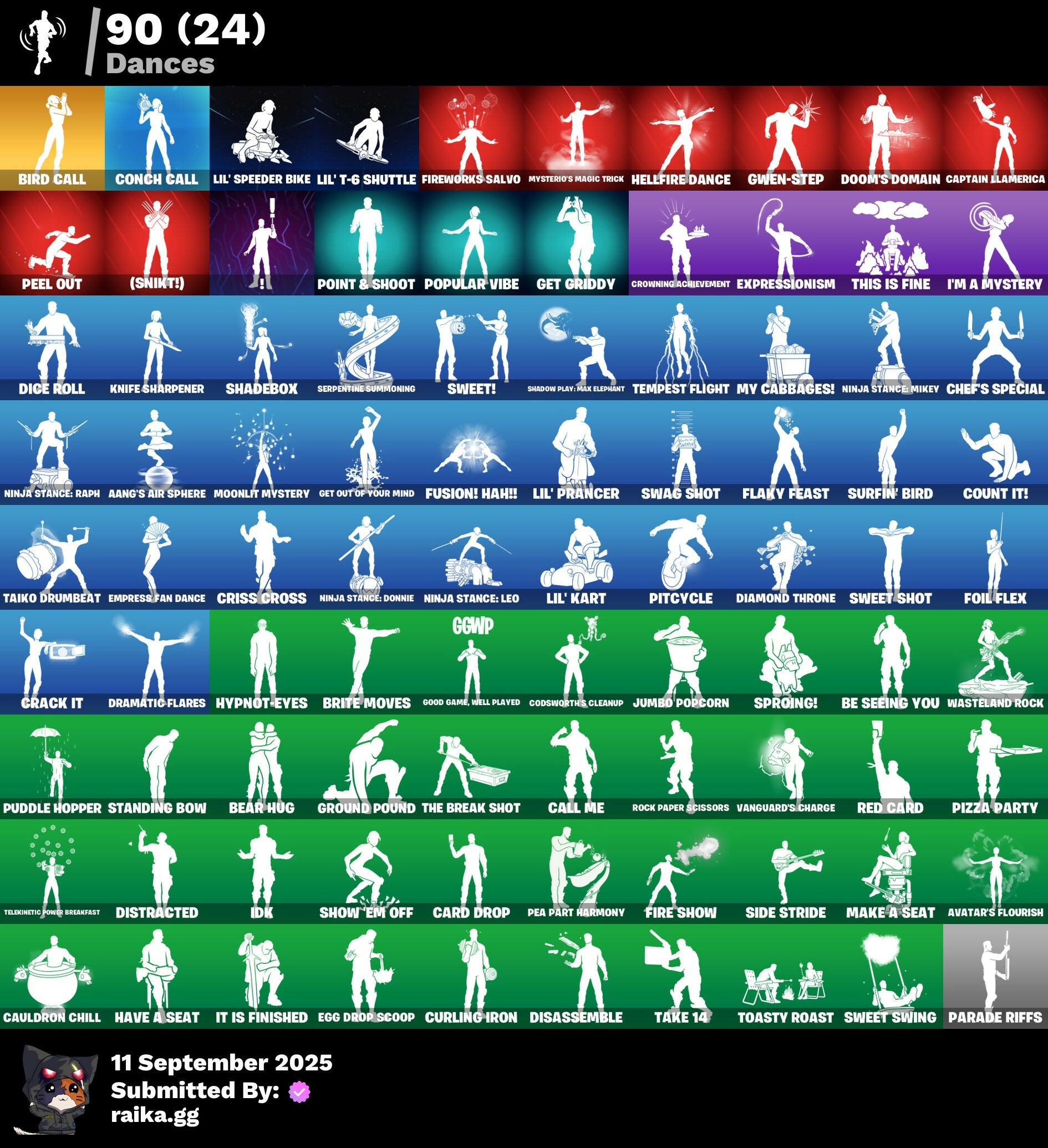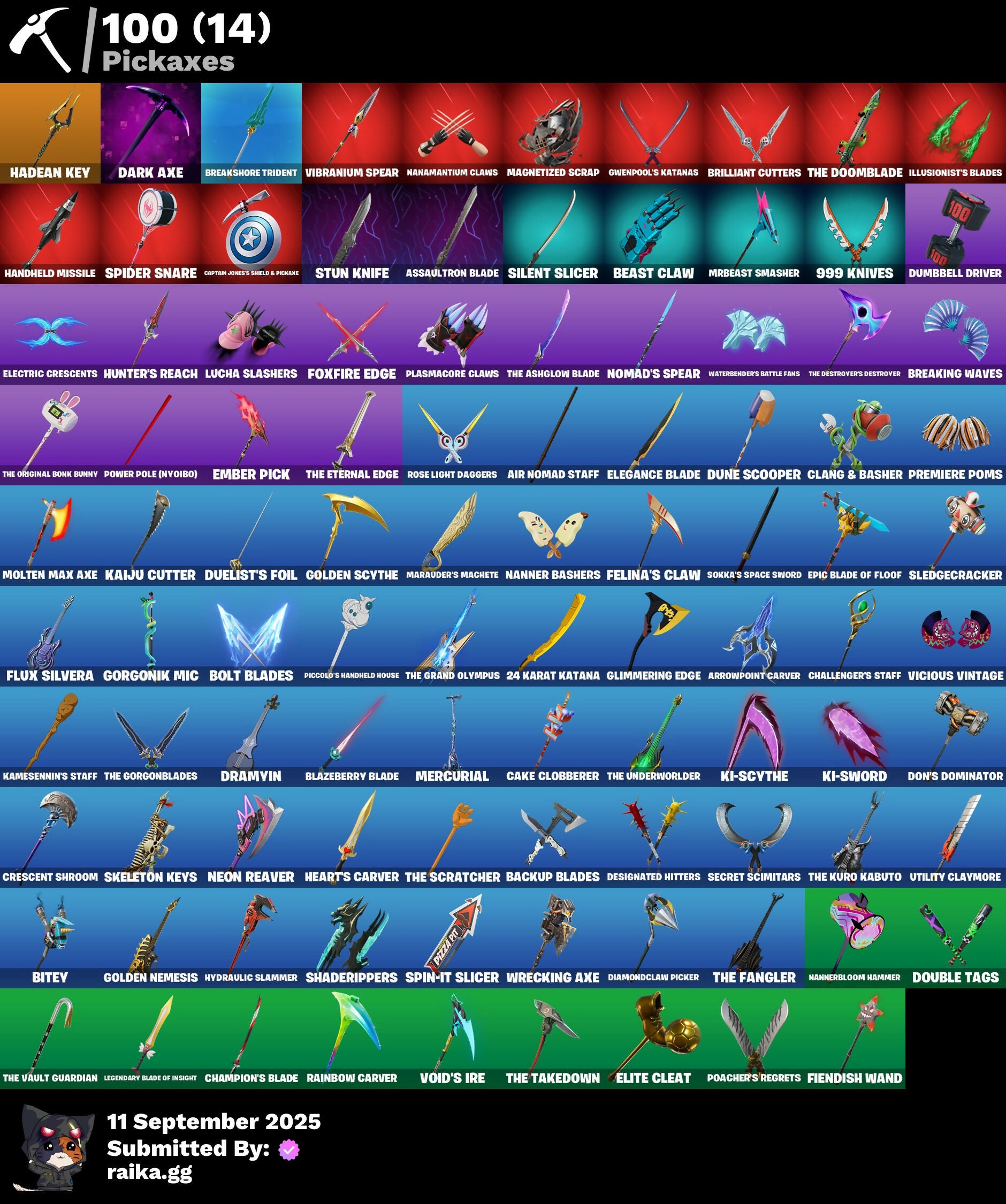 (Snikt!), 24 Karat Katana, 999 Knives, Aang, Aang's Air Sphere, Access Core, Adira's Battle Flag, Adventure Aerial, Air Nomad Staff, Airie, Antonia, Aphrodite, Appa, Arctic Adeline, Arrowpoint Carver, Artemis, Assaultron Blade, Aura, Avatar Cycle, Avatar State Aang, Avatar's Flourish, Awr Pack, B.R.U.T.E. Gunner, Backup Blades, Basement Key, Bat Royale, Be Seeing You, Beach Breezer, Beacon Glass, Bear Hug, Beast Claw, Bedside Nanner, Bird Call, Birthstone Backplate, Bitey, Blazeberry Blade, Bloomback Sack, Boba Bling, Bolt Blades, Breaking Waves, Brilliant Cutters, Brite Moves, Brite Raider, Buzzsaw Breacher, Cacodemon, Cake Clobberer, Calico-Conut, Call Me, Captain Jones, Captain Jones's Shield & Pickaxe, Captain Llamerica, Captain's Glider, Carbon Fiber Holster, Card Drop, Cash Stash, Cauldron Chill, Cazadora, Cazadora Wings, Cerberus, Challenger's Staff, Champion Stash'd, Champion's Blade, Chef's Special, Chrome Punk, Chromebrella, Chromeseed, Chronos Lock, Clang & Basher, Clawbox, Clawz Retro, Cliffside Soarer, Clip Show Carry-All, Clutch & Dagger, Codsworth's Cleanup, Combocopter, Comfy Cats, Conch Call, Count It!, Cozy Conch, Crack It, Crescent Shroom, Criss Cross, Crowning Achievement, Curling Iron, Dark Axe, Dark Jonesy, Dark Red Knight, Dark Shield, Dark Wild Card, Deck Ducky, Delivery Diver, Designated Hitters, Diamond Throne, Diamondclaw Picker, Dice Roll, Disassemble, Distracted, Don's Dominator, Doom, Doom Brella, Doom's Cloak, Doom's Domain, Double Header, Double Tags, Dramatic Flares, Dramyin, Drome Drifter, Dromerunner's Trophy, Duelist's Foil, Dumbbell Driver, Dune Scooper, Eclipse Brella, Egg Drop Scoop, Electric Crescents, Electric Shredder, Electro-Crest, Elegance Blade, Elite Cleat, Elite Servo, Ember Pick, Emma Frost, Empress Fan Dance, Epic Blade of Floof, Era, Eternal Ranker, Expressionism, FNCS Aegis, Fa-La-La-Llama, Feathered Flames, Felina, Felina's Claw, Fiendish Wand, Fire Show, Fireworks Salvo, Fish Thicc, Fist of Doom, Flakes Power, Flaky Feast, Flaming Dual Kama, Flight Risk, Flux Silvera, Foil Flex, Four Elements Banner, Fox Wayfinder, Foxfire Edge, Fusion! Hah!!, Get Griddy, Get Out Of Your Mind, Glimmering Edge, Glorious Giftblade, Goku Black, Golden Crash, Golden Gear Midas, Golden Nemesis, Golden Scythe, Goldy Lock, Good Game, Well Played, Gorgonik Mic, Gorgon’s Aegis, Grand Glacier Glider, Grim Emblem, Ground Pound, Gwen-Step, Gwenpool, Gwenpool's Katanas, Hadean Chariot, Hadean Gate, Hadean Key, Hades, Handheld Missile, Har-Har-Har!, Have A Seat, Heart's Carver, Heart's Rest, Heartwinder, Heist Flier, Hellfire Dance, High Society Glider, Highwire, Holiday Boxy, Hope, Horde’s War Wheel, Hunter's Reach, Huntress Lyre, Hydraulic Slammer, Hypnot-Eyes, I'm A Mystery, IDK, Ignition Pack, Illusionist's Blades, Imani, Incinerator Kuno, It Is Finished, Jumbo Popcorn, Junker 'Brella, Kado Thorne, Kaiju Cutter, Kamesennin's Shell, Kamesennin's Staff, Khaby Lame, Ki-Scythe, Ki-Sword, King Wings, Knife Sharpener, Korra, Korra's Air Glider, Krang, Lectro Guard Pack, Legendary Blade of Insight, Legend’s Modkit, Lil' Kart, Lil' Prancer, Lil' Speeder Bike, Lil' T-6 Shuttle, Little Black Bag, Lorenzo, Lost Meteor, Lucha Slashers, Lunar Hyperjet, Lunar Skyspan, Lunarios, Luxury Lockbox, M.O.A.B.B., Mae, Mae Jr., Magnetic Steps, Magnetized Scrap, Make A Seat, Marauder's Machete, Mariposa, Maxx Stacks, Maxxed Out Max, Medusa, Mega-Brella, Megalo Don, Megalopak, Meowtooth Plush, Mercurial, Metal Gear Mk. II, Metalhead, Mizuki, Mobile Megalodon, Molten Max Axe, Molten Ragnarok, Momo Messenger, Montague, Moonbow Breezer, Moonlit Mystery, Mr. Daruma, MrBeast, MrBeast Smasher, MrBeast6000, Mrdiamond Eyes, My Cabbages!, Mysterio, Mysterio's Cloak, Mysterio's Magic Trick, Mystica, Nana Bath, Nana-Brella, Nanamantium Claws, Nanner Bashers, Nannerbloom Hammer, Needle Dropper, Nemesis Box, Neon Man O' War, Neon Menagerie, Neon Reaver, Ninja Stance: Donnie, Ninja Stance: Leo, Ninja Stance: Mikey, Ninja Stance: Raph, Nisha, Nitro’d Ranker, Nolan Chance, Nomad's Spear, Northquester Deluxe, Nyanja's Catpak, Oni's Curse, Oopsy Drones-V, Order Remnant, Oscar, Parade Riffs, Pea Buddies, Pea Part Harmony, Pea-Rigibles, Peabody, Peel Out, Peelverine, Peelverine Plush, Peelverine Wings, Peely Whip, Perfect Pivot, Peter Griffin, Petercopter, Piccolo, Piccolo's Cape and Turban, Piccolo's Demon Symbol, Piccolo's Handheld House, Pig-Gwen Scooter, Pinata Brian, Pink Plushie, Pip-Boy, Piper Pace, Pit Faller, Pitcycle, Pizza Party, Plasmacore Claws, Poacher's Regrets, Point & Shoot, Poised Playmaker, Popular Vibe, Poseidon, Powder Keg, Power Pole (Nyoibo), Premiere Poms, Prize Package, Prized Llama, Psionic Surfer, Puddle Hopper, Pure Sole Boombox, Purradise Meowscles, Raider’s Trophy, Rainbow Carver, Ratacat, Ratacat Roamer, Ready Penny, Rebel Brella, Red Card, Red Ribbon Army Aircraft, Redmask Ranker, Relik, Remnant Blossom, Renzo The Destroyer, Republic Army Backpack, Revenant Rider, Rhinestone Rider, Rian, Ricochet Rox, Rift Ribbon, Ringmaster Scarr, River Guardian, Roast Lord, Rock Paper Scissors, Rose Light Daggers, Rose of Avarice, Rosy Rift Goddess Ariana, Ruby Relic, Rust, Sea Chariot, Secret Scimitars, Serpentine Summoning, Shadebox, Shaderippers, Shadow Play: Max Elephant, Shadow Ranker, Shadow's Bite, Shattercore, Shore Trident, Show 'Em Off, Shuri, Shuri's Cloak, Shuri's Skywings, Side Stride, Signal Tracer, Silent Slicer, Sir Beurre, Skeleton Keys, Skelleshark, Skull and Crossed Swords, Skull-A-Tron, Sky Scout, Skycarver, Slayer Juice Wrld, Sled Ready Guff, Sledgecracker, Slider, Snakebite Keyring, Snap-A-Zoomatic, Society Emblem Ranker, Society Shield, Sokka's Space Sword, Solid Snake, Son Goku, Space Pod, Spectra Protector, Spider Snare, Spider-Man (Miles Morales), Spider-Verse Portal, Spin-It Slicer, Sproing!, Standing Bow, Stealing Wheel, Storm Crash, Stormcloud, Stray, Stun Knife, Summer Sail Shark, Surfin' Bird, Sushi Sign, Swag Shot, Sweet Shot, Sweet Swing, Sweet!,