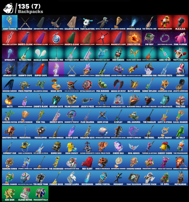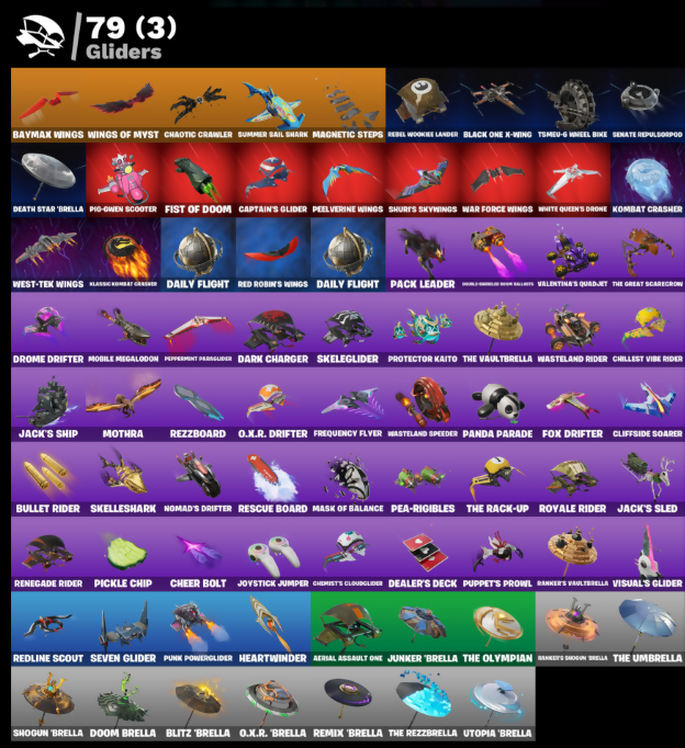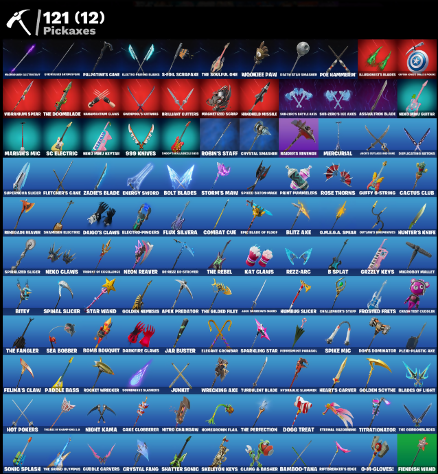 (Snikt!), 1-Ball, 999 Knives, Aerial Assault Bomber, Aerial Assault One, Aerial Assault Trooper, Agent Patch, All Planned For Christmas Is You, Alpha Trophy, Angelic Wings, Apex Predator, Apprentice Evie, Apt., Arcane Research, Assaultron Blade, Aura, B Splat, B Splatt, Back-A-Moments Breaker Bag, Backlash, Bamboo Patch, Bamboo-Tana, Baron’s Hoard, Batti, Battle Blessing, Battle Gamer Rae, Baymax Wings, Bear Hug, Been Aging Turn Turn, Big Dill, Bike To Go, Billy, Billy’s Tricycle, Bim Bam Boom, Bird Call, Birdracing Flourish, Bitey, Black One X-Wing, Blackened Shield, Blades of Light, Blaze, Blitz 'Brella, Blitz Axe, Blitz Wings, Boardwalk Ruby, Bolt Blades, Bomb Bag, Bomb Bouquet, Boogie Down, Breadcrumb Spiral Gage, Brilliant Cutters, Bring It Around, Brite Moves, Brite Raider, Bug Punk Sunny, Bullet Rider, Bundles, Cactus Club, Cake Clobberer, Captain America, Captain America's Shield & Rocket, Captain Jones, Captain's Glider, Cassidy Quinn, Cattagoria Cake Girl Otter, Cauldron Chill, Challenger's Stuff, Champion Siren, Chaos Director, Chaotic Crawler, Charge Pack, Cheer Bag, Cheer Bolt, Cheery Chime, Chemist's Cloudglider, Chickenwing It, Chillest Vibe Rider, Clang & Basher, Clawz Retro, Cliffside Soarer, Combat Cue, Cozy Conch, Crash Test Cuddler, Crossblades Death Saber, Crystal Fang, Crystal Smasher, Cuddle Carvers, Cupid’s Arrow, Cursed Jack Sparrow, Cursed Marionette, Daigo, Daigo's Claws, Daily Flight, Dansen Backburner, Dark Charger, Darkfire Claws, De-Rezz De-Stroyer, Dealer's Deck, Death Star 'Brella, Death Star Smasher, Deck Ducky, Dilly With It, Disassemble, Dogg Treat, Don's Dominator, Doom, Doom 'Brella, Doom's Cloak, Doom’s Domain, Double-Barreled Boom Ballers, Dralljus Cape, Dreamers Two-Shot, Drome Drifter, Duelist’s Card Trick, Dupli-Kate, Duplicated Batons, Duplikates, Dusk Knight, Dynamo Tntina, Electro Fishing Blades, Electro-Pincers, Elegant Crowbar, Emma Frost, Emperor Palpatine, Energy Sword, Epic Blade of Floof, Eternal Ranker, Eternal Razorwing, Experts Emblem, F.I.L.A. Llamafishito, FNCS Fighter, Feel The Force, Felina, Felina's Claw, Feline Dagger, Fiendish Wand, Fire Show, Firestarter, Fireworks Salvo, Fist Bump, Fist Of Doom, Fletcher Kane, Fletcher's Cane, Flexi-Plastic Axe, Flux Silvera, Focused, For O.K.R.!, Force Lightning, Forget Me Not, Fox Drifter, Frequency Flyer, Frontpage Pose, Frosted Frets, Frozen Treat Cart, Galactic Ranker, General Grievous, General’s War Table, Get Griddy, Ghoul Portal, Gilded Honey Wings, Godzilla Evolved, Golden Nemesis, Golden Scythe, Good Morning, Cleanup, Good Sportsmanship, Grizzly Keys, Groundhog Day Event, Grzly Keys, Guffy 6-string, Guffy G-String, Gwen-Step, Gwenny, Gwenpool, Gwopool's Katanas, Hadean Gate, Handheld Missile, Hawklander's Glare, Haylee Skye, Heart's Carver, Heartwinder, Hellfire Dance, Hero Baymax, Hillswitch Drone, Homegrown Flail, Hope Star, Horror's Mars Mask, Hot Pokers, Humbug Slicer, Hunter's Knife, Hyana's Catpak, Hydraulic Slammer, Hype!, Idol Wings, Ignition Pack, Illusionist's Blades, Imperial Holo, Invisible Cut, It’s Chemistry!, Jack Skellington, Jack Sparrow, Jack Sparrow's Sword, Jack's Compass, Jack's Prize, Jack's Scorpion Smasher, Jack's Ship, Jack's Sled, Jade, Jar Buster, Jar Of Dirt, Jet Signals, Jeweled Cat, Jolly Jammer, Joss, Joystick Jumper, Junker 'Brella, Junkit, Junkrit, Kalesh Cape, Kat Claws, Katalina, Keisha Cross, Kendo, Killswitch, Kitty Peeper, Klassic Kombat Crasher, Kombat Crasher, Lax Resistance Dancer, Leafy Longboardin’, Leek-To-Go, Lexa Hexbringer, Lightrider, Lil Quill, Lil' Dilly, Lil’ Ghost, Lil’ Godzilla Attack, Lil’ Tank, Live From Rad Dondon III, Loaded Barrel Bag, Lone Wolf Holster, Look, Shock And Grab’s You, Lt. Ripp Slade, M.O.A.B.B., Machinist Electrostaff, Magnetic Steps, Magnetized Scrap, Magneto's Cape, Make A Seat, Make Some Waves, Mantra, Mariah Carey, Mariah's Mic, Marion's Mic, Mask Of Balance, Megabot, Megalo Don, Megalopak, Meowdas, Meowtooth Plush, Mercurial, Metal Team Morph, Metalhead, Microbot Mallet, Microflip, Miku Live, Mini Dogfight, Mobile Megalodon, Morgan Myst, Mothra, Mr. Daruma, Mysterio, Mysterio's Cloak, Mystery’s Magic Trick, Nana Bath, Nana Katman Claws, Natalia's Kit Bag, Neko Claws, Neko Hatsune Miku, Neko Miku Guitar, Neko Mimi Guitar, Neko Mimi Keytar, Nemo Miku Keytar, Neon Reaver, Night Kama, Nitro Chainsaw, Nitroid Ranker, Nomad's Drifter, Nyanja, O-M-Gloves!, O.M.E.G.A. Spear, O.X.R. 'Brella, O.X.R. Drifter, O.X.R. Field Pack, O.X.R. Holo-Slate, O.X.R. Ranker, Olras Test Outlier, Onyx Winter, Ooz Rearranged's Trophy, Oozzilla's End-Spine, Outlaw Midas, Outlaw's Heirlee Pack, Outlaw's Ninepence, Outlaws Strut, Outlaw’s Hotshot, Overnoon Katarras, Pack Leader, Paddle Bass, Paint Pummellers, Palpatine's Cane, Panda Parade, Parade Riffs, Party Hips, Pea Buddies, Pea Part Harmony, Pea-Rigibles, Peabody, Peel Out, Peelverine, Peelverine Wings, Peppermint Paraglider, Peppermint Parasol, Pickle Chip, Pig-owen Scooter, Pink Plushie, Pip-Boy, Poe Dameron, Poe Hammerin', Point And Strut, Poised Playmaker, Pot's Model X-HMB, Prized Llama, Protector Kaito, Punk Powerglider, Puppet Dance, Puppet's Prowl, Purr Demonium, R3X Tail, Raider's Revenge, Raider's Trophy, Ranker's Shadow 'Brella, Ranker's Vaultbrella, Ranking Ronin, Raven’s Legion, Rebel Wookie Lander, Rebel's Rucksack, Red Alert, Red Robin's Wings, Redline Scout, Remix 'Brella, Renegade Raider, Renegade Reaver, Renegade Rebel, Renegade Rider, Reporting For Duty, Rescue Board, Rezz Blocks, Rezz-Arc, Rezzboard, Rhythm Of Chaos, Riftbreaker's Edge, Ringmaster Scarr, Robin, Robin's Cape, Robin's Staff, Rocket Wrecker, Rose Thorns, Royale Backplate, Royale Rider, Ruby, Rust, S-foil Scrapaxe, SC Electric, Samishan Electric, Santa Dogg, Santa Suit Marian, Savage, Say So, Sea Bobber, Seahorn Electric, Senate Repulsordrone, Separatist Cape, Serpentine Slide, Seven Glider, Shadow Blade Mobe, Shadow Ranker, Shadow Shroud, Shamisen-Sational, Shatter Son