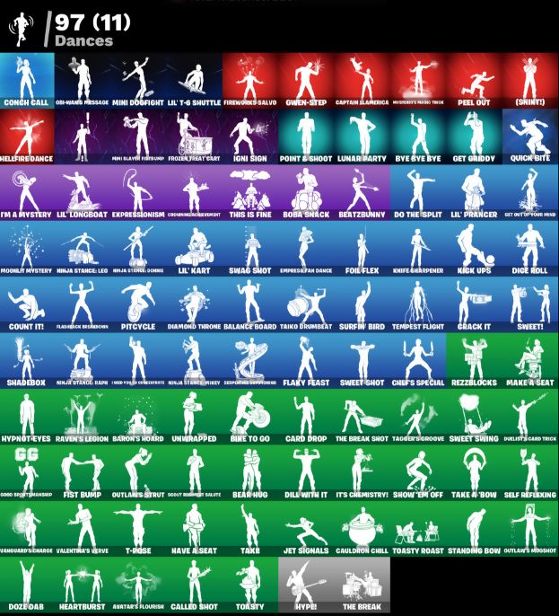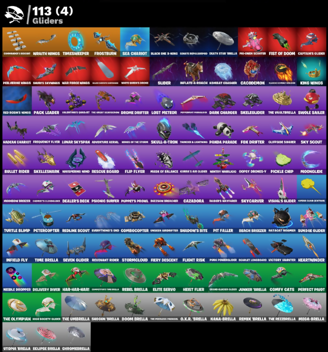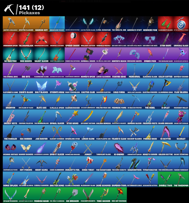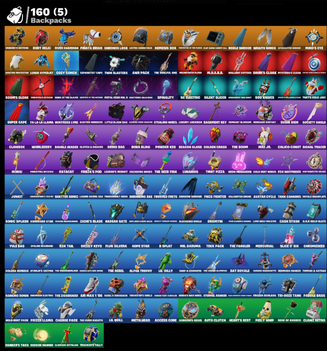 (Shnit!), 24 Karat Katana, 8 Splat, 999 Knives, Access Core, Adventure Aerial, Aeromont Jet Carver, Ahsoka Tano, Ahsoka's Staff, Air Max 1 '86, Alpha Trophy, Antonia, Aphrodite, Arctic Adeline, Artemis, Assault Trooper, Aura, Auto Clutch, Avatar Cycle, Avatar's Flourish, Awr Pack, B Splat, Backup Blades, Balance Board, Bamboo-Tana, Baron's Hoard, Basement Key, Bat Royale, Beach Breezer, Beacon Glass, Bear Hug, Beatzbunny, Bedside Manner, Beerus, Big Bite, Big Dill, Bike To Go, Birdie, Birthday Basher, Black One X-Wing, Blackened Shield, Blazeberry Blade, Blitz Axe, Board Breaker, Boba Bling, Boba Snack, Bolt Blades, Brainiac, Breaking Waves, Breakshore Trident, Brilliant Cutters, Bullet Rider, Buzzsaw Breacher, Bye Bye Bye, Cacodemon, Cactus Club, Cainbesti's Glideglider, Cake Clobberer, Calico-Conut, Called Shot, Captain Jones, Captain Lamerica, Captain's Glider, Card Drop, Cash Stash, Cassidy Quinn, Cauldron Chill, Cazadora, Cazadora Wings, Cerberus, Charge Pack, Chef's Special, Chiefpollo's Guitars, Chrome Punk, Chromebrella, Chromeseed, Chronos Lock, Clang & Basher, Clawbox, Clawz Retro, Cliffside Soarer, Clip Snap Cannon, Clutch & Dagger, Cold Furia, Cold Heat Wings, Combocopter, Comfy Cats, Commander's Descent, Competitor's Time Brella, Conch Call, Count It!, Cozy Conch, Crack It, Crash Test Coulor, Crash Test Cuddler, Crazier Jassy of Victory, Crimson Enforcer's Teddy, Crimson Polestar, Crowning Achievement, Crucible Blade, Crucible Mace, Cuddle Carvers, Cursed Marquess, Dark Charger, Dazzler's Ice Spine, De-Rezz De-Stroyer, Dealer's Deck, Death Star 'Brella, Delivery Diver, Designated Hitters, Diamond Throne, Diamondclan Pickers, Dice Roll, Dieselpool's Katana, Dill With It, Do The Split, Dogg Treat, Doom, Doom Brella, Doom Slayer, Doom's Cloak, Double Header, Double Tags, Doze Dab, Dramvin, Dramyin, Dreamers Twin Shot, Drome Drifter, Drops of Manganese Blue, Duality's Ember Back, Duelist's Card Trick, Duelist's Foil, Dumbbell Driver, Dune Scooper, Dusk Knight, Dusty, Eclectic Shredder, Eclipse Brella, Electro Falxion Blades, Electro-Pingers, Elegance Blade, Elegant Crowbar, Elite Servo, Ember Pick, Emma Frost, Empressian Dance, Epic Blade of Floof, Era, Eternal Ranger, Everything's End, Expressionism, FNCS Fighter, Fa-La-La-Llama, Fanged Foresight, Felina, Feline's Claw, Fiendish Wand, Fiery Descent, Firebreaker's Edge, Fireworks Salvo, Fish Thicc, Fist Bump, Fist of Doom, Flaky Feast, Flashback Breakdown, Fletcher Kane, Fletcher's Cane, Flight Risk, Flip Flyer, Flux Silvera, Foil Flex, Four Elements' Darker, Fox Drifter, Fox Wayfinder, Foxfire Edge, Frequency Flyer, Frieza, Frieza's Pod, Frostburn, Frosted Frets, Frozen Ocularea, Frozen Treat Cart, Garden Fiber Holster, Geralt Of Rivia, Get Griddy, Get Out Of Your Mind, Glimmering Edge, Glorious Outblade, Goku Black, Gold Midas's Overboard, Golden Bear Midas, Golden Crash, Golden Nemesis, Golden Scythe, Good Sportsmanship, Gordon's Eggs, Grand Glacier Glider, Grind Bag, Grizzly Keys, Gwen-Step, Gwenpool, Hadean Chariot, Hadean Gate, Hadean Key, Hades, Handheld Missile, Har-Har-Har!, Have A Seat, Heartburst, Hearts Carver, Hearts Rest, Heartwinder, Heist Flier, Hellfire Dance, Helsie, High Society Glider, Highwire, Hold-Body Pack, Holiday Boxy, Hope, Hope Star, Horde's War Helmet, Hot Pokers, Humbug Slicer, Hunter's Reach, Huntress Lyre, Hydroglide Desdemona, Hype!, Hypnot-Eyes, Hysteria's Cloak, I Need Your Concentrate, I'm A Mystery, Ice Breaker, Igni Sign, Imani, Infield Fly, Inflate-A-Roach, It's Chemistry!, Jack-o'-lantern Bat, Jake The Dog, Jar Buster, Jet Signals, Joss, Junker 'Brella, Junkit, Junkt, Kado Thorne, Kaiju Cutter, Keisha Cross, Khaby Lame, Ki-Scythe, Ki-Sword, Kick Ups, Killswitch Drone, King Wings, Knife Sharpener, Kobra's Air Glider, Kombat Crasher, Korra, Legend Grand Pack, Legend's Modkit, Lil Quill, Lil Split, Lil' Dilly, Lil' Kart, Lil' Longboat, Lil' Prancer, Lil' T-G Shuttle, Liquidshots Blades, Little Black Bag, Loaded Barrel Bag, Lone Wolf Holster, Longbone Smasher, Lost Meteor, Lucha Slashers, Lunar Glow, Lunar Hyperset, Lunar Party, Lunar Skyspan, Lunarios, Luxury Lockbox, M.O.A.B.B., Mae, Mae Jr., Make A Seat, Mandalorian Claws, Manic, Marauder's Hornset, Mariposa, Mark of the Slayer, Mask of Balance, Massai, Mechromeptor Flush, Medusa, Mega-Brella, Mercurial, Metal Gear Mk. II, Metalhead, Microbot Mallet, Minds Eye, Mini Dogfight, Mini Slayr FastBump, Mithra's Stell Sword, Mizuki, Molten Max Axe, Montague, Moonbow Breezer, Moonglide, Moonlit Mystery, Morai, Mr. Daruma, Mysterio, Mystery's Magic Trick, Mystica, Mythra's Captain, Nana-Brella, Nannery Bashers, Needle Dropper, Nemesis Box, Neon Menagerie, Nezumi, Night Kama, Ninja Stance: Donnie, Ninja Stance: Leo, Ninja Stance: Mikey, Ninja Stance: Raph, Nisha, Noble Shroud, Nolan Chance, Nomad's Spear, Northquestor Deluxe, O.M.E.G.A. Spear, O.X.R. 'Brella, Obi-Wan's Message, Omegarok, Oopsy Drones-Y, Opaline Scabbard, Opaline Slashers, Oscar, Outlaw Midas, Outlaw's Midshot, Outlaw's Shovepicks, Outlaw's Strut, Pack Leader, Paddle Bass, Paint Pumplers, Panda Parade, Peel Out, Peel V-Bine Wings, Peelverine, Peely Whip, Peppermint Paraslider, Perfect Pivot, Peter Griffin, Petercopter, Pickle Chip, Pig-O-Matic Scooter, Piper Pace, Pit Faller, PityCycle, Piñata Brian, Plasmacore Claws, Plexi-Plastic Ax, Poacher's Daggers, Point & Shoot, Poseidon, Powder Keg, Power Pole (Kyogre), Power Pole (Ryukoji), Premiere Poms, Prized Llama, Psionic Surfer, Punk Powerglider, Puppet's Prowl, Purgatory MedusaCls, Quick Bite, R3X Tail, Raider's Wayfarer, Ranker's Tags, Ranking Ronin, Ratcat, Raven's Legion, Raycat Roamer, Ready Penny, Rebel Brella, Rebel's Rucksack, Red Hot Revenge, Red Robin's Wings, Redline Scout, Redmark Banner, Relik, Remix 'Brella, Remnant Blossom, Renegade Lynx, Renegade Rustcat, Renzo The Destroyer, Rescue Board, Revenant Rider, RezZBlocks, Rian, Ricochet Rox, River Guardian, Rose Light Daggers, Rose of Avance, Royale Backplate, Ruby Relic, Ru