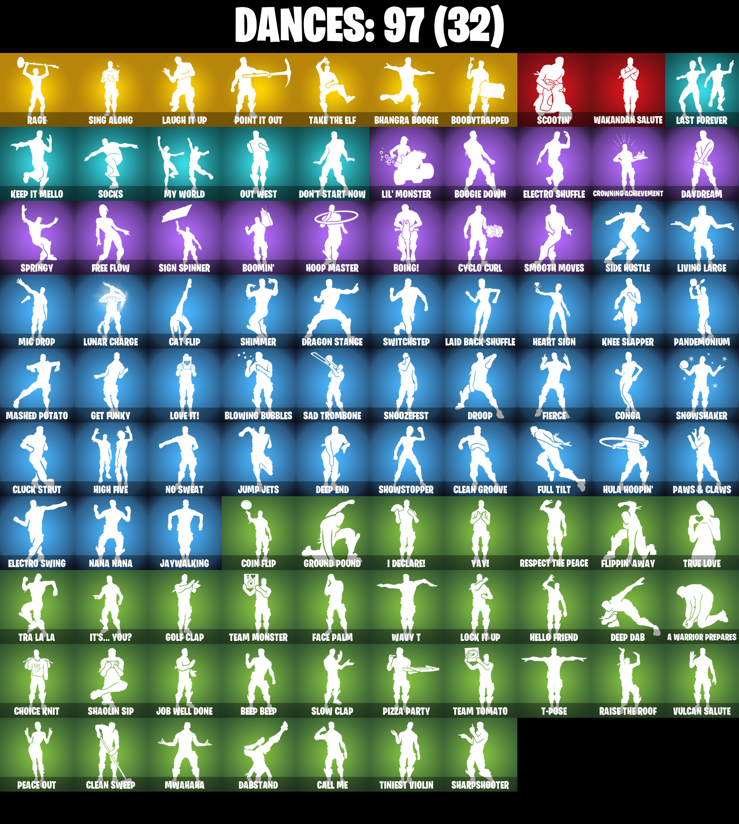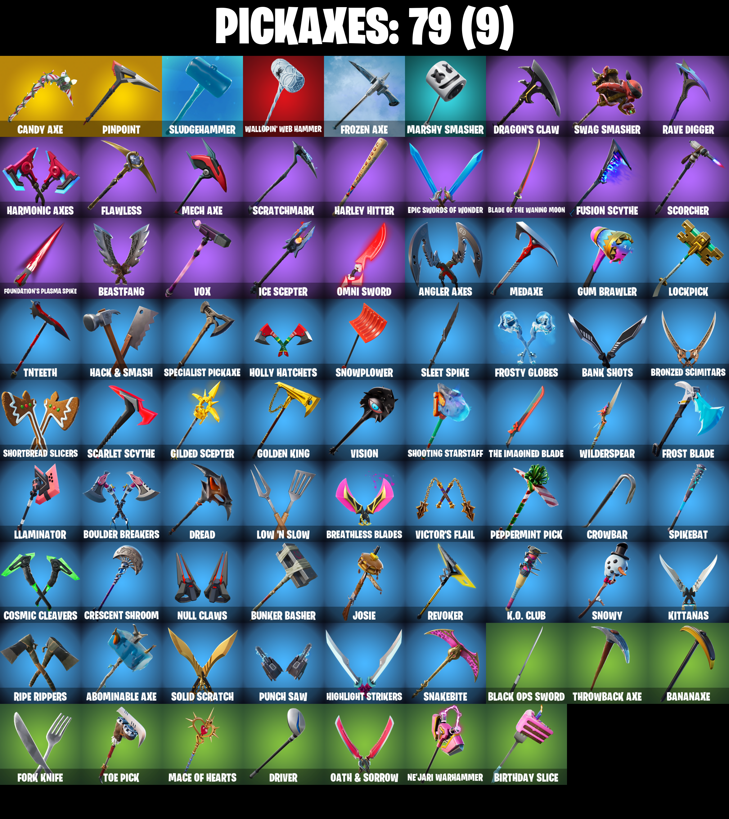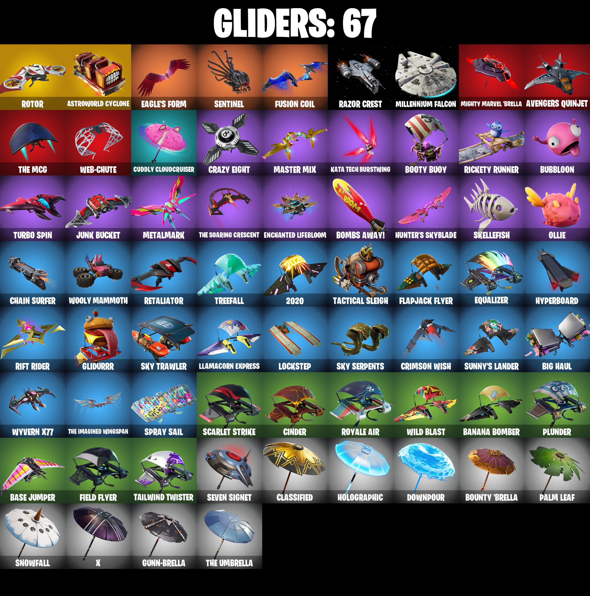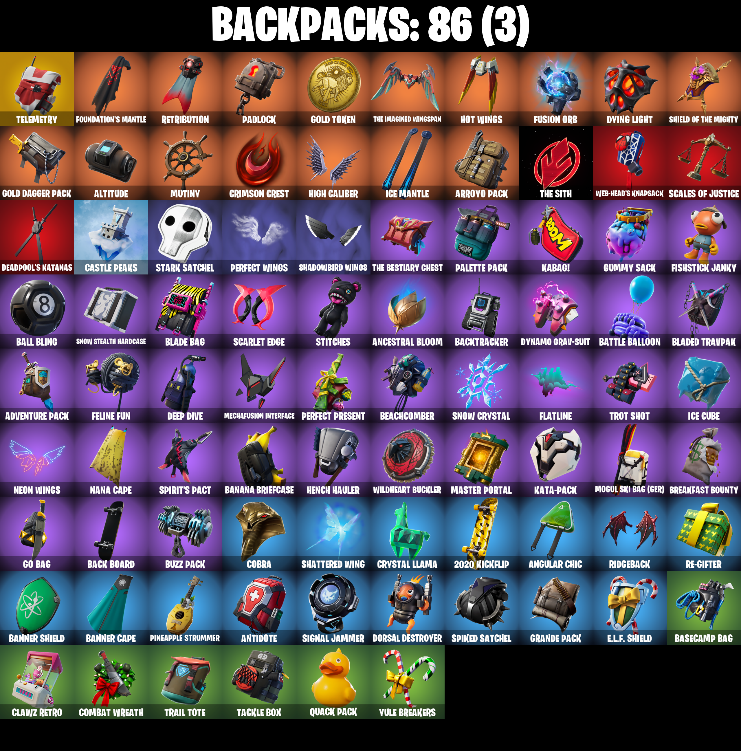 2020, 2020 Kickflip, 8-Ball vs Scratch, A Warrior Prepares, Abominable Axe, Adeline, Adventure Pack, Aftermath, Agent Peely, Altitude, Ancestral Bloom, Angler Axes, Angular Chic, Antidote, Arroyo Pack, Aspen, Astroworld Cyclone, Aura, Avengers Quinjet, Back Board, Backtracker, Ball Bling, Banana Bomber, Banana Briefcase, Bananaxe, Bank Shots, Banner Cape, Banner Shield, Base Jumper, Basecamp Bag, Battle Balloon, Beachcomber, Beastfang, Beep Beep, Bhangra Boogie, Big Haul, Birthday Slice, Black Ops Sword, Blackheart, Blackheart (Stage 8), Blade Bag, Blade Of The Waning Moon, Bladed Travpak, Blowing Bubbles, Boing!, Bombs Away!, Boobytrapped, Boogie Down, Boomin', Booty Buoy, Boulder Breakers, Bounty 'Brella, Breakfast Bounty, Breakpoint, Breathless Blades, Bronzed Scimitars, Bubbloon, Bunker Basher, Bunker Jonesy, Buzz Pack, Call Me, Cameo vs Chic, Candy Axe, Castle Peaks, Cat Flip, Catalyst, Chain Surfer, Choice Knit, Cinder, Classified, Clawz Retro, Clean Groove, Clean Sweep, Cluck Strut, Cobra, Codename E.L.F., Coin Flip, Combat Wreath, Conga, Contract Giller, Cosmic Cleavers, Crazy Eight, Crescent Shroom, Crimson Crest, Crimson Wish, Crowbar, Crowning Achievement, Crystal Llama, Cuddly Cloudcruiser, Cyclo Curl, Dabstand, Daydream, Deadpool, Deadpool Unmasked, Deadpool's Katanas, Deep Dab, Deep Dive, Deep End, Demi, Don't Start Now, Dorsal Destroyer, Double Helix, Downpour, Dragon Stance, Dragon's Claw, Dread, Dream, Driver, Droop, Dying Light, Dynamo Grav-Suit, E.L.F. Shield, Eagle's Form, Electro Shuffle, Electro Swing, Ember, Ember (Night), Enchanted Lifebloom, Epic Swords Of Wonder, Equalizer, Face Palm, Feline Fun, Field Flyer, Fierce, Fishstick Janky, Flapjack Flyer, Flatline, Flawless, Flippin' Away, Fork Knife, Foundation's Mantle, Foundation's Plasma Spike, Free Flow, Frost Blade, Frosty Globes, Frozen Axe, Frozen Fishstick, Frozen Nog Ops, Full Tilt, Fusion, Fusion Coil, Fusion Orb, Fusion Scythe, Gear Specialist Maya, Gear Specialist Maya (Hat - Dark), Get Funky, Gilded Scepter, Glidurr, Go Bag, Gold Brutus, Gold Dagger Pack, Gold Midas, Gold Token, Golden King, Golf Clap, Grande Pack, Ground Pound, Gum Brawler, Gumbo, Gumbo (Sour), Gummy Sack, Gunn-Brella, Gunnar, Hack & Smash, Harley Hitter, Harlowe, Harlowe (Helmet), Harmonic Axes, Haven, Haven (Tropical Chirper), Haze, Heart Sign, Hello Friend, Hench Hauler, Heron Stance Hero, High Caliber, High Five, Highlight Strikers, Holly Hatchets, Holographic, Hoop Master, Hot Wings, Hula Hoopin', Hunter's Skyblade, Hybrid, Hybrid (Stage 4), Hyperboard, I Declare!, Ice Cube, Ice King (Gold), Ice Mantle, Ice Scepter, It's... You?, Jaywalking, Job Well Done, Josie, Journey vs Hazard, Jump Jets, Junk Bucket, K.O. Club, Kabag!, Kata Tech Burstwing, Kata-Pack, Keep It Mello, Kittanas, Knee Slapper, Kondor, Krisabelle, Lace, Laguna, Laid Back Shuffle, Last Forever, Laugh It Up, Lexa, Lil' Monster, Living Large, Llamacorn Express, Llaminator, Lock It Up, Lockpick, Lockstep, Love It!, Low 'n Slow, Lt. Evergreen, Lt. John Llama, Lt. John Llama (Gilded Reality), Lunar Charge, Luxe, Luxe (Gold Clothing), Lynx, Lynx (Stage 4 - No Ponytail), Mace Of Hearts, Mancake, Mandalorian, Marshy Smasher, Mashed Potato, Master Key, Master Key (Masked), Master Mix, Master Portal, Mave, Mave (Reactive Hair Off), Mech Axe, Mechafusion Interface, Medaxe, Menace, Menace (Challenger Menace - Flame), Meowscles, Metalmark, Mic Drop, Mighty Marvel 'Brella, Millennium Falcon, Mogul Master (Ger), Mogul Ski Bag (GER), Mutiny, Mwahaha, My World, Nana Cape, Nana Nana, Ne'Jari Warhammer, Neon Wings, Nightlife, No Sweat, Null Claws, Oath & Sorrow, Ollie, Omni Sword, Onesie, Onesie (Winter), Out West, Padlock, Palette Pack, Palm Leaf, Pandemonium, Paws & Claws, Peace Out, Peekaboo, Peely, Peppermint Pick, Perfect Present, Perfect Shadow, Perfect Wings, Pineapple Strummer, Pinpoint, Pizza Party, Pj Patroller, Plunder, Point It Out, Polar Peely, Powder, Powder (White), Punch Saw, Quack Pack, Rage, Raise The Roof, Rave Digger, Razor Crest, Re-Gifter, Reese, Relay, Remedy (Purple), Remedy vs Toxin, Respect The Peace, Retaliator, Retribution, Revoker, Rickety Runner, Ridgeback, Rift Rider, Rio Grande, Ripe Rippers, Rippley vs Sludge, Ronin, Ronin (Cape), Rotor, Rox, Rox (Stage 5), Royale Air, Ruin, Sad Trombone, Scales of Justice, Scarlet Commander, Scarlet Edge, Scarlet Scythe, Scarlet Strike, Scootin', Scorcher, Scratch (Virus), Scratchmark, Sentinel, Sentinel (Dark), Seven Signet, Sgt. Winter, Sgt. Winter Headgear, Shadow Skully, Shadowbird, Shadowbird Wings, Shanta, Shanta (Headpiece), Shaolin Sip, Sharpshooter, Shattered Wing, Shield of the Mighty, Shimmer, Shooting Starstaff, Shortbread Slicers, Showstopper, Side Hustle, Sidewinder, Sidewinder (Dark), Sign Spinner, Signal Jammer, Sing Along, Singularity, Singularity (Stage 3), Skellefish, Sky Serpents, Sky Trawler, Skye, Sleet Spike, Slow Clap, Sludgehammer, Smooth Moves, Snakebite, Snoozefest, Snow Crystal, Snow Stealth Hardcase, Snow Stealth Slone, Snowfall, Snowplower, Snowshaker, Snowy, Socks, Solid Scratch, Specialist Pickaxe, Spider-Man, Spider-Man (Gilded Reality), Spikebat, Spiked Satchel, Spirit's Pact, Spray Sail, Springy, Stage 4, Stark Satchel, Stitches, Stratus, Stratus (Red), Sunny's Lander, Swag Smasher, Switchstep, T-Pose, Tackle Box, Tactical Sleigh, Tailwind Twister, Take The Elf, Team Monster, Team Tomato, Telemetry, The Bestiary Chest, The Devourer, The Foundation, The Ice King, The Imagined, The Imagined Blade, The Imagined Wingspan, The McG, The Prisoner, The Sith, The Soaring Crescent, The Umbrella, Throwback Axe, Tilted Teknique, Tilted Teknique (Hoodie), Tiniest Violin, Tnteeth, Tntina, Toe Pick, Tra La La, Trail Tote, Treefall, Trog, Trog (Tribal), Trot Shot, True Love, Tsuki 2.0, Turbo Spin, Turk vs Riptide, Vega, Vega (Teal), Vendetta, Vendetta (Stage 5), Victor's Flail, Vision, Vond3r, Vox, Vulcan Salute, Wakandan Salute, Wallopin' Web Hammer, Wavy T, Web-Chute, Web-Head's Knapsack, Wild Blas