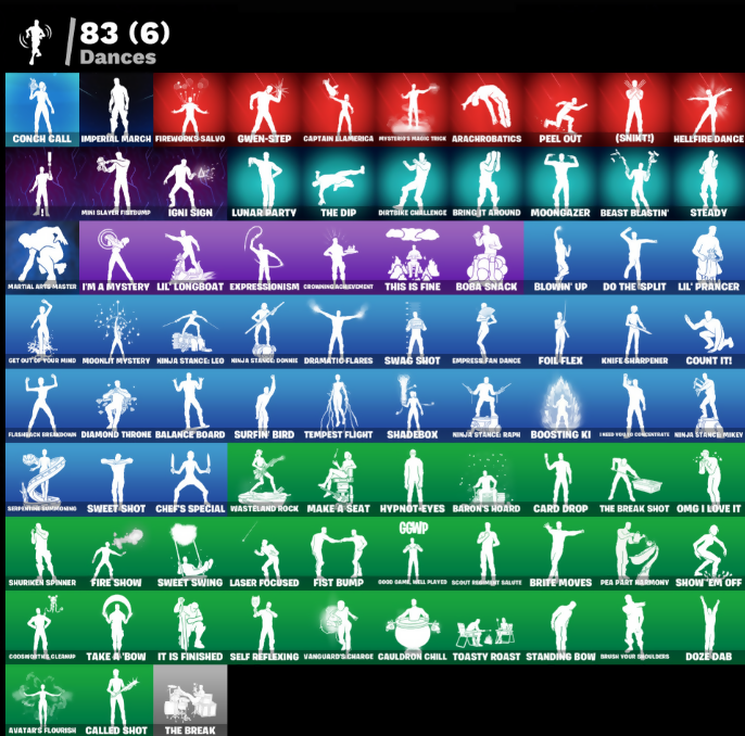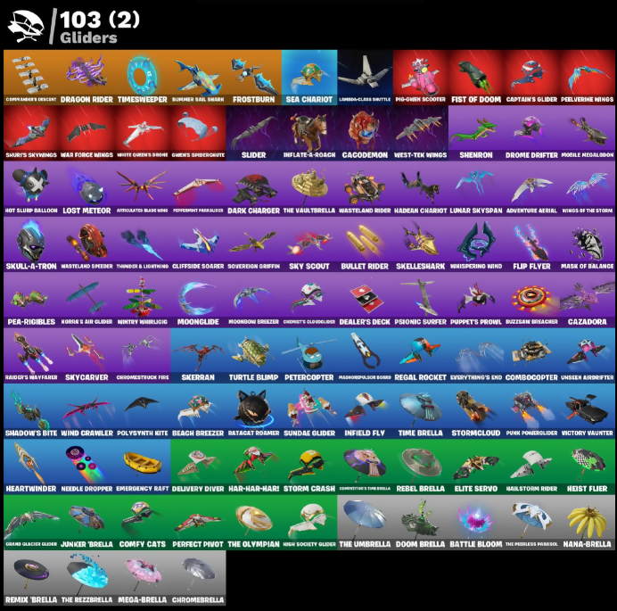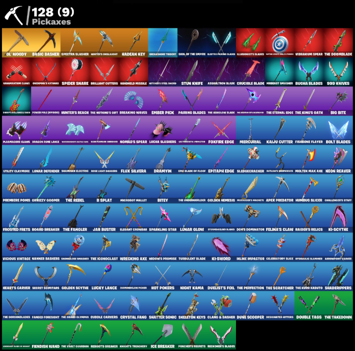 (Snimt!), 8 Splat, 999 Knives, AWR Pack, Access Core, Acrobatics, Adira, Adira's Battle Flag, Adventure Aerial, Alpha Trophy, Apex Predator, Aphrodite, Apocalypse Shroud, Arctic Adeline, Arrowpoint Carver, Artemis, Articulated Blade Wings, Assaultron Blade, Auto Clutch, Avatar Cycle, Avatar's Flourish, B Splat, Back Board, Balance Board, Bangin Backburner, Baron's Hoard, Basic Basher, Battle Bloom, Beach Breezer, Beacon Glass, Beast Blastin', Bedside Manner, Beerus, Big Bite, Bitey, Blackened Shield, Bloomback Sack, Blowin' Up, Blue Aura Scooper, Board Breaker, Boba Bling, Boba Snack, Bolt Blades, Boosting Ki, Breaking Waves, Breakshore Trident, Brilliant Cutters, Bring It Around, Brite Bomber, Brite Moves, Brite Raider, Brush Your Shoulders, Bugha, Bugha Blades, Bullet Rider, Bun Bun Bang Bang, Buzzsaw Breacher, Bytes, Cacodemon, Calico-Conut, Called Shot, Captain America's Shield & Hammer, Captain Blamerca, Captain Jones, Captain Winter's Go-Kart, Captain's Glider, Carbon Fiber Holster, Card Drop, Cash Stash, Cauldron Chill, Celebratory Slice, Cerberus, Challenger's Staff, Chef's Special, Chemist's Cloudglider, Chrombrella, Chrome Cage, Chrome Punk, Chromeseed, Chromestruck Fire, Chronos Lock, Clang & Basher, Clawbox, Clawz Retro, Cliffside Soarer, Clip Show Garry-All, Combocopter, Comfy Cats, Commander’s Descent, Competitor's Time Brella, Conch Call, Coruscant Guard, Count It!, Cozy Conch, Crowning Achievement, Crucible Blade, Crystal Fang, Cuddle Carvers, Cursed Marionette, Dark Charger, Darth Vader, Dealer's Deck, Deck Ducky, Delivery Diver, Designated Hitters, Diamond Throne, Diamondclan Picker, Dieselback Pack, Dirtbike Challenge, Do The I'Split, Don's Dominator, Doom, Doom Brella, Doom Slayer, Doom's Cloak, Doombrawler's Trophy, Double Header, Double Tags, Doze Dab, Dragon Radar, Dragon Rider, Dragon Rune Lance, Dramatic Flares, Dramyin, Drome Drifter, Duelist's Foil, Dune Scooper, Dusty, Electric Shredder, Electro Fang Blades, Electrostatic Impactor, Elegant Crowbar, Elite Servo, Ember Pick, Emergency Raft, Emma Frost, Empressian Dance, Epic Blade Of Floof, Epitaph Edge, Era, Eternal Ranker, Everything's End, Evie, Expedition Bag, Expressionism, FNCS Fighter, Fa-la-la-llama, Fading Ember Cloak, Fanged Foresight, Felina, Felina's Claw, Fiendish Wand, Fire Show, Fireworks Salvo, Fishbone Flayer, Fist Bump, Fist of Doom, Flashback Breakdown, Flip Flyer, Flux Silvera, Foil Flex, Four Elements Banner, Fox Wayfinder, Foxfire Edge, Frostburn, Frosted Frets, Fuzzetti Cake, Gazadora, Gazadora Wings, Geralt Of Rivia, Get Out Of Your Mind, Glorious Giftblade, Gohan's Cape, Goku Black, Golden Nemesis, Golden Scythe, Good Game, Well Played, Goodfight Cleanup, Gorgon's Aegis, Gozilla's Eco-Spine, Grand Glacier Glider, Griffin's Talon, Grind Bag, Grizzy Cooper, Grriz, Gwen's Spidergrute, Gwen-Step, Gwenpool, Hadean Chariot, Hadean Gate, Hadean Key, Hades, Hailstorm Rider, Handheld Missile, Har-Har-Har!, Heart's Carver, Heart's Rest, Heartwinder, Heist Flier, Hellfire Dance, Helsie, High Society Glider, Highwire, Holiday Boxy, Holo-Boot Pack, Hope, Hope Star, Horde's War Wheel, Hornquester Deluxe, Hot Pokers, Hot Slurp Balloon, Humbug Slicer, Hunter's Reach, Huntress Lyre, Hydraulic Slammer, Hypnot-Eyes, I Need Yoggi To Concentrate, I'm A Mystery, Ice Breaker, Igni Sign, Ignition Pack, Illusonsist's Blades, Imani, Imperial March, Indiana Jones, Infield Fly, Inflate-a-Roach, Inline Impactor, It Is Finished, Jar Buster, Junker 'Brella, Kaiju Cutter, Ki-Scythe, Ki-Sword, Knife Sharpener, Knight's Treachery, Korra, Korra's Air Glider, Lambda-Class Shuttle, Laser Focused, Lectro Guard Pack, Legend's Mookit, Lennox Rose, Leviathan's Blade Of Wrath, Lil Split, Lil' Dilly, Lil' Longboat, Lil' Prancer, Loaded Barrel Bag, Lone Wolf Holster, Lorenzo, Lost Meteor, Lucha Slashers, Lucky Lance, Lunar Defender, Lunar Glow, Lunar Hyperjet, Lunar Party, Lunar Skyspan, Lunarios, M.O.A.B.B., Magnopulsor Board, Make A Seat, Malik, Mana-Brella, Marauder's Machete, Mariposa, Mark of the Slayer, Martial Arts Master, Mask of Balance, Massai, Meanwhile..., Medusa, Mega-Brella, Megalo Don, Megalopak, Meow Skulls, Meowtoon Plush, Mercurial, Metal Gear Mk. II, Metalhead, Metchor's Steel Sword, Microbot Mallet, Mind's Eye, Mini Slayer Firstbump, Mizuki, Mobile Megalodon, Molten Max Axe, Montague, Moonbow Breezer, Moongazer, Moonglide, Moonlit Mystery, Mr. Daruma, MrBeast Smasher, Mrbeast, Mysterio, Mysterious Magic Trick, Mystero's Cloak, Mystica, Nana Bath, Nana Ice Criusted Horns, Nanner Bashers, Nanomantinum Claws, Needle Dropper, Nemesis Box, Neon Menagerie, Neon Reaver, Nezumi, Night Kama, Ninja Stance Donnie, Ninja Stance Lou, Ninja Stance Mikey, Ninja Stance Raph, Nisha, Nitro'd Ranker, Noble Shroud, Nomad's Spear, Nyanja's Catpak, Ol' Woody, Ollie-Oop, Omega Rok, Omg I Love It, Oscar, Outlaw's Knife Rack, Outlaw's Machete, Overpool's Katanas, Owenpool's Katars, Pairing Blades, Paradox Meowscles, Paradox Reality 2.0, Pea Buddies, Pea Part Harmony, Pea-Rigibles, Peabody, Peel Out, Peelverine, Peelverine Wings, Peely Whip, Peppermint Para-Glider, Perfect Pivot, Peter Griffin, Petercopter, Pig-Gwen Scooter, Pinata Brian, Pink Plushie, Pip-Boy, Plasmacore Claws, Poacher's Regrets, Polysynth Kite, Poseidon, Power Pole (Hybrid), Power Pole (Yunboi), Premiere Poms, Prized Llama, Promotion of the Playlist, Psionic Surfer, Punk Powerglider, Puppet's Prowl, R3X Tail, Raider's Relics, Raider's Trophy, Raider's Wayfarer, Ranker's Tags, Ranking Ronin, Ratacat, Ratcat Roamer, Rebel Brella, Rebel's Rucksack, Reboot'D Breaker, Reckoner's Blades, Recon Expert, Regal Rocket, Relik, Remix 'Brella, Remnant Blossom, Renegade Lynx, Renegade Rustcat, Renzo The Destroyer, Rian, Ringmaster Scarr, River Guardian, Rocket League Trophy, Rose Light Daggers, Ruby Relic, Runway Racer, Rust, Sabina, Santa Dogg, Sardeenz!, Scout Regiment Salute, Scratchclaw Shredder, Sea Chariot, Secret Scimitars, Selene, Self Reflexing, Serpentine Summoning, Sha