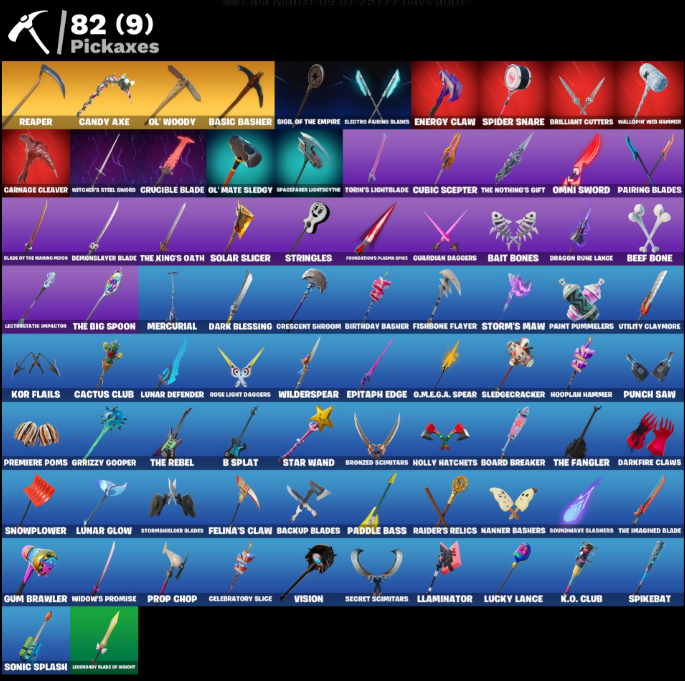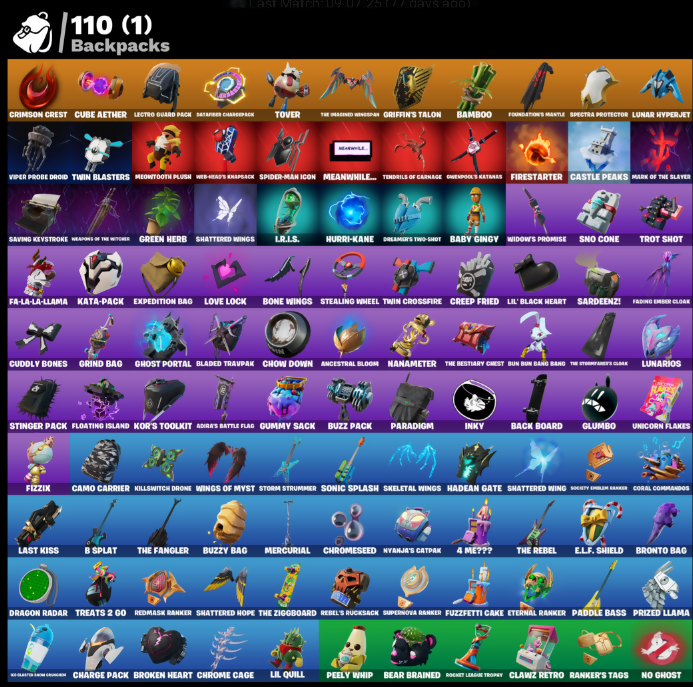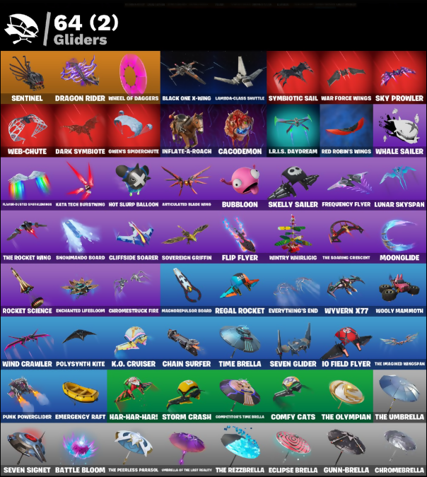 4 Me???, Adira, Adira's Battle Flag, Ancestral Bloom, Arachrobatics, Archetype, Arctic Adeline, Articulated Blade Wing, Aura, B Splat, Baby Gingy, Back Board, Backlash, Backup Blades, Bait Bones, Balance Board, Bamboo, Basic Basher, Battle Bloom, Bear Brained, Beef Bone, Bim Bam Boom, Birdie, Birthday Basher, Black One X-Wing, Bladed Travpak, Blaze, Blaze of the Hawng Hook, Blowin' Up, Board Breaker, Bone Boss, Bone Ravage, Bone Wings, Boneless, Boogie Down, Boosting Ki, Brilliant Cutters, Bring It Around, Broken Heart, Bronto, Bronto Bag, Bronzed Scimitars, Bubbloon, Build Up, Bun Bun Bang Bang, Bushranger, Buzz Pack, Buzzy Bag, Bytes, Cacodemon, Cactus Club, Camo Carrier, Candy Axe, Captain L. America, Carnage, Carnage Cleaver, Castle Peaks, Celebratory Slice, Chain Surfer, Charge Pack, Charlotte, Chicken Wing It, Choice Knit, Chow Down, Chris Redfield, Chrome Cage, Chrome Punk, Chromebrella, Chromeseed, Chromestruck Fire, Clawz Retro, Cliffside Soarer, Cloud-Busted Spaceblowers, Codename E.L.F., Color Crush, Comfy Cats, Competitor's Time Brella, Copines, Coral Commandos, Creep Fried, Crescent Shroom, Crimson Crest, Crucible Blade, Crystal, Cube Aether, Cuddly Bones, Curic Scepter, Curling-Iron, Cyclo Curl, D'Ark, Dab, Dagger Dance, Dark Blessing, Dark Symbiote, Darkfire Claws, Darth Vader, Datafire Chargepack, Deep Dab, Demonslayer Blade, Dirtbike Challenge, Doggo, Don't Stare Now, Doom Slayer, Dragon Radar, Dragon Rider, Dragon Rune Lance, Dream, Dreamer's Two-Shot, Drippin' Flavor, Dusk Knight, E.L.F. Shield, Eagle, Eclipse Brella, Electro Faming Blades, Electrostatic Impactor, Emergency Raft, Enchanted Lifebloom, Energy Claw, Epitaph Edge, Erisa, Eternal Ranker, Everything's End, Evie, Expedition Bag, Fa-La-La-Llama, Fabio Sparklemane, Fading Ember Cloak, Felina's Claw, Firestarter, Fishbone Flayer, Fishskull, Fizzix, Flip Flyer, Floating Island, Foundation's Mantle, Foundation's Plasma Spike, Frequency Flyer, Fright Funk, Frozen Fishstick, Frozen Nog Ops, Fuzzfetti Cake, Gangnam Style, Geometrik, Geralt of Rivia, Get Gone, Get Griddy, Ghost Portal, Ghoul Trooper, Glumbo, Green Herb, Griffin's Talon, Grimey, Grind Bag, Grizzly Gooper, Grriz, Guardian Daggers, Gum Brawler, Gumbo, Gummy Sack, Gunhar, Gunn-Brella, Gwen's Spiderchute, Gwenpool's Katanas, Hadean Gate, Hand-Forged, Har-Har-Har!, Harlowe, Harry Kane, Haven, Heart Sign, Hey Now!, Hit It, Holly Hatchets, Hooplah Hammer, Hot Slurp Balloon, Hurri-Kane, Hype!, I.R.I.S., I.R.I.S. Daydream, IO Field Flyer, Igni Sign, Imperial March, Indiana Jones, Inflate-A-Roach, Inky, It Is Finished, It's A Vibe, It's... You?, J.B. Chimpanski, Jiggle Jiggle, Jill Valentine, Jubilation, K.O. Club, K.O. Cruiser, Kata Tech Burstwing, Kata-Pack, Kaws Skeleton, Kiara K.O., Kid-Blaster Beam Gunner, Killswitch Drone, Kor, Kor Flails, Kor's Toolkit, Krisabelle, Lambda-Class Shuttle, Lars, Laser Focused, Last Forever, Last Kiss, Laugh It Up, Lazarbeam, Lectro Guard Pack, Legendary Blade of Insight, Lennon Rose, Lil DiploDoculus, Lil Quill, Lil Whip, Lil' Black Heart, Lil' Bounce, Lil' Monster, Lil' Prancer, Lil' Rover, Llaminator, Lock It Up, Love It!, Love Lock, Lt. John Llama, Lucky Lance, Lunar Charge, Lunar Defender, Lunar Glow, Lunar Hyperjet, Lunar Party, Lunar Skyspan, Lunarios, Lunch Break, Magnorpulsor Board, Malik, Mark of the Slayer, Massai, Meow Skulls, Meowtooth Plush, Mercurial, Monarch, Moonglide, Mwahaha, My World, Mystify, Nailed It, Nanameter, Nanner Bashers, Never Gonna, No Ghost, Nyanja's Catpak, O.M.E.G.A. Spear, Ol' Mate Sledgy, Ol' Woody, Omg I Love It, Omni Sword, Paddle Bass, Paint Pummeler, Pairing Blades, Panda Team Leader, Paradigm, Paradox (Default Mode), Party Hips, Peely Whip, Phone It In, Polar Peely, Polysynth Kite, Premiere Poms, Prized Llama, Prop Chop, Prowler, Pump Me Up, Punch Saw, Punk Powerglider, Raider's Relics, Ranker's Tags, Ready When You Are, Reaper, Rebel's Rucksack, Rebirth Harley Quinn, Recon Expert, Red Jade, Red Robin's Wings, Redmask Ranker, Regal Rocket, Rezzblocks, Ring It On, Rocket League Trophy, Rocket Science, Rollie, Ronin, Rose Light Daggers, Sabina, Sackin', Santa Doggo, Sardeenz!, Savage, Saving Keystroke, Scarlett Commander, Secret Scimitars, Segway Tour, Selene, Sentinel, Seven Glider, Seven Signet, Shady Doggo, Shanta, Shattered Hope, Shattered Wing, Shattered Wings, Shuriken Spinner, Sigil of the Empire, Siren, Skeletal Wings, Skelly Sailer, Skull Squad Leader, Skull Trooper, Sky Prowler, Sled Ready Goof, Sledgecracker, Snap, Sno Cone, Snowmando Board, Snowplower, Snuggs, Society Emblem Ranker, Socks, Solar Slicer, Sonic Splash, Soundwave Slashers, Sovereign Griffin, Spacefarer Lightscythe, Spacewire Aaron Garcia, Spectra Protector, Spider Snare, Spider-Gwen, Spider-Man, Spider-Man (No Way Home), Spider-Man Icon, Spike It, Spikebat, Star Wand, Steady, Stealing Wheel, Stinger Pack, Storm Crash, Storm Strummer, Storm's Maw, Stormfarer, Stormshield Blades, Stringles, Supernova Ranker, Symbiotic Sail, Sypher's Strut, Tagger's Groove, Take A Bow, Taxi!, Tendrils of Carnage, The Bestiary Chest, The Big Spoon, The Cube Queen, The Devourer, The Dip, The Fangler, The Foundation, The Herald, The Imagined, The Imagined Blade, The Imagined Wingspan, The King's Oath, The Nothing's Gift, The Olympian, The Origin, The Peerless Parasol, The Rebel, The Renegade, The Rezzbrella, The Rocket Wing, The Soaring Crescent, The Stormfarer's Cloak, The Umbrella, The Ziggboard, Time Brella, Toasty Roast, Toona Fish, Toosie Slide, Torin, Torin's Lightblade, Tover, Treats 2 Go, Tricksy, Triggerfish, Trot Shot, Tsuki 2.0, Twin Blasters, Twin Crossfire, Twyn, Umbrella Of The Last Reality, Unicorn Flakes, Utility Claymore, Viper Probe Droid, Vision, Wake Up, Wallopin' Web Hammer, Wanna See Me, War Force Wings, Weapons of the Witcher, Web-Chute, Web-Head's Knapsack, Whale Sailer, Wheel Of Daggers, Widow's Promise, Wilderspear, Wind Crawler, Wings of Myst, Wintry Whirligig, Witcher's Steel Sword, Wooly Mammoth, Wyvern X7