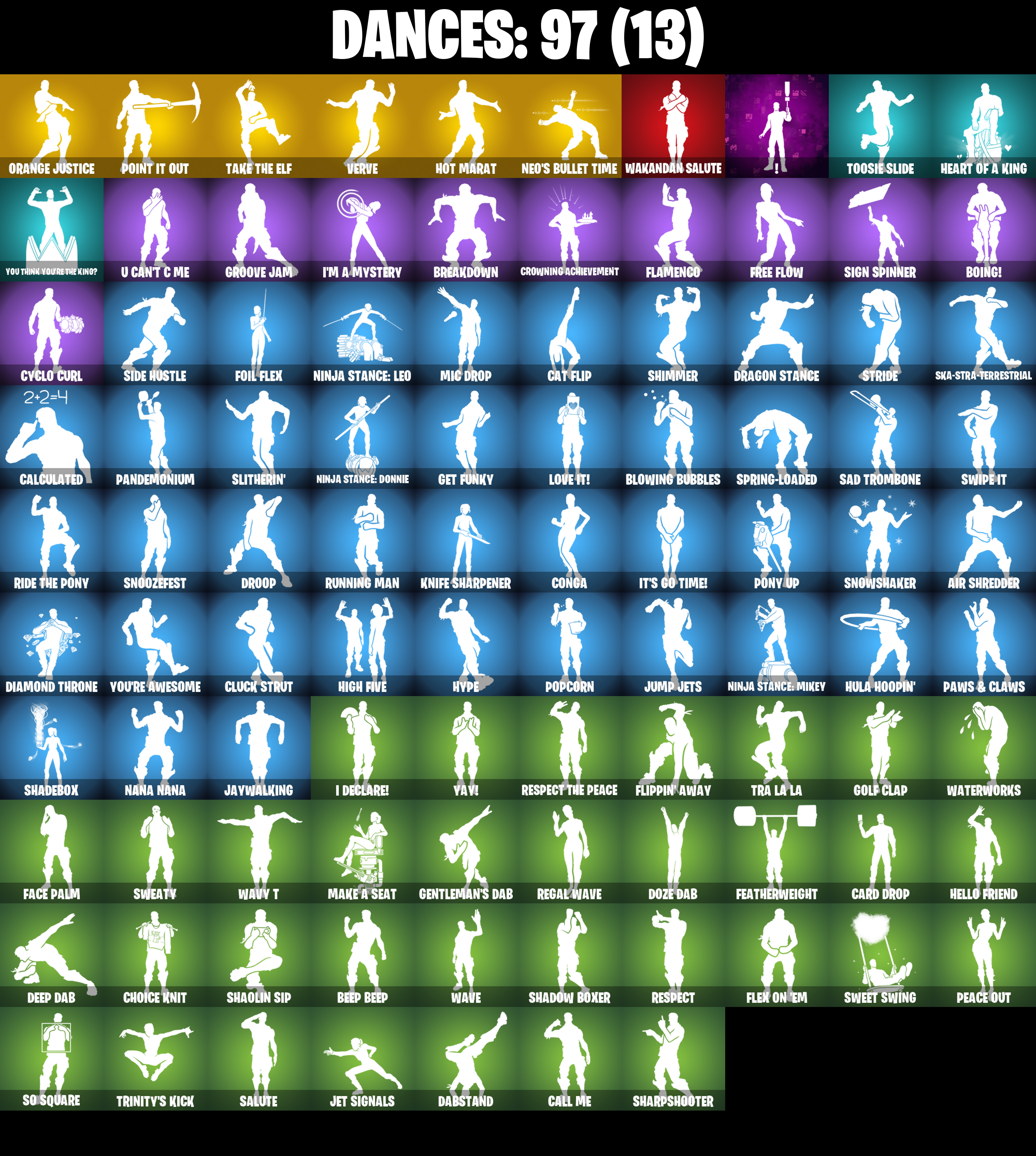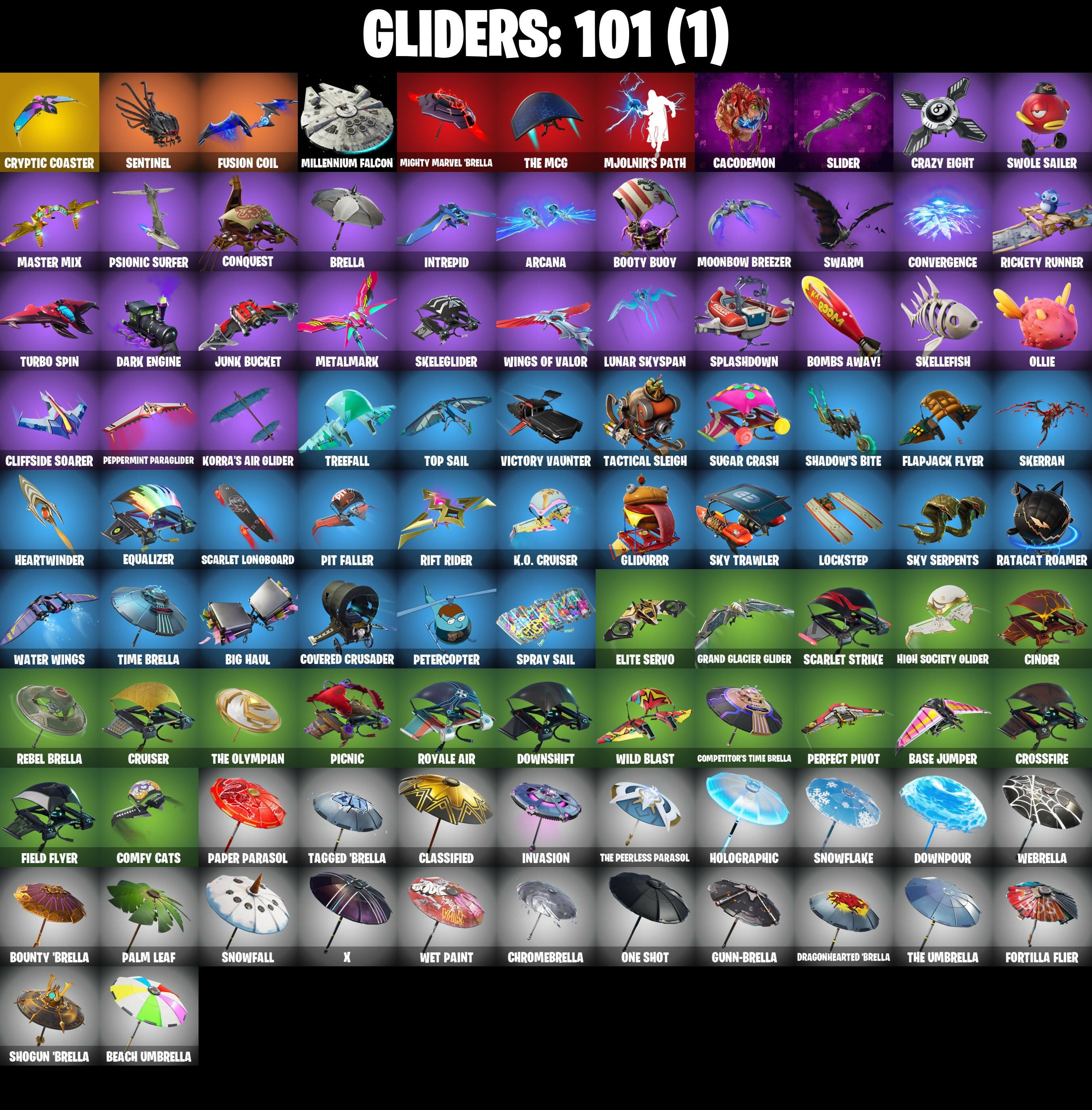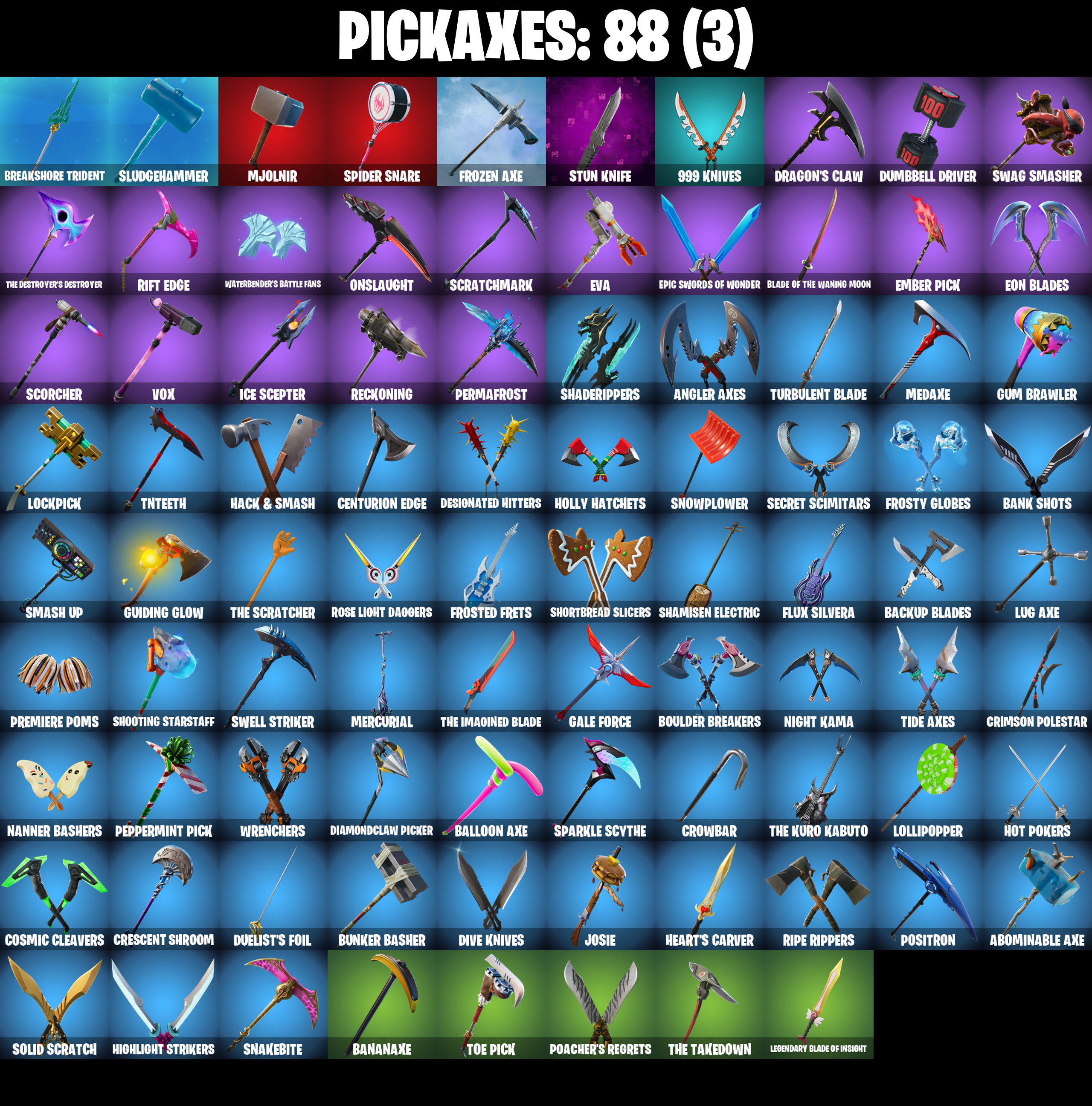 2020 Kickflip, 8-Ball Vs Scratch, 999 Knives, A.I.M., Abominable Axe, Adventure Pack, Agent Peely, Air Shredder, Altitude, Ancestral Bloom, Angler Axes, Antidote, Aphrodite, Apocalypse Shroud, Arcana, Arroyo Pack, Auto Clutch, Backup Blades, Ball Bling, Balloon Axe, Banana Briefcase, Bananaxe, Bank Shots, Base Jumper, Basecamp Bag, Battlehawk, Beach Umbrella, Beachcomber, Bedside Nanner, Beep Beep, Big Haul, Black Werewolf, Blackheart, Blackheart (Stage 8), Blade Bag, Blade of the Waning Moon, Bladed Bag, Blazing Fire Cerberus, Blowing Bubbles, Boing!, Bombs Away!, Booty Buoy, Boulder Breakers, Bounty 'Brella, Breakdown, Breakshore Trident, Brella, Brutus, Bunker Basher, Bunker Jonesy, Burning Ambition Valeria, Cacodemon, Calamity, Calamity Stage 5, Calculated, Call Me, Cameo Vs Chic, Carbide, Carbon Fiber Holster, Card Drop, Cat Flip, Catalyst, Catalyst (Overcharged), Centurion, Centurion Edge, Cerberus, Choice Knit, Chromebrella, Cinder, Classified, Clawbox, Clawz Retro, Cliffside Soarer, Cluck Strut, Cobra, Combat Wreath, Comfy Cats, Competitor's Time Brella, Conga, Conquest, Convergence, Cosmic Cleavers, Covered Crusader, Cozy Conch, Crazy Eight, Crescent Shroom, Crimson Polestar, Crossfire, Crowbar, Crowning Achievement, Cruiser, Cryptic Coaster, Cryptic Sling-Kit, Cyclo Curl, Dabstand, Dark Engine, Deadpool, Deadpool Unmasked, Deep Dab, Deep Dive, Designated Hitters, Diamond Throne, Diamondclaw Picker, Dire, Dive Knives, Dj Yonder, Double Header, Downpour, Downshift, Doze Dab, Dragon Stance, Dragon's Claw, Dragonhearted 'Brella, Drift, Drift Stage 5, Droop, Dry Bag, Duelist's Foil, Dumbbell Driver, Dusk, Dusk Wings, Dynamic Dribbler, E.L.I.M., Elite Servo, Ember, Ember (Night), Ember Pick, Enforcer, Eon Blades, Epic Swords of Wonder, Equalizer, Eva, Fable, Fabled Cape, Face Palm, Fade, Fancy Peter Griffin, Featherweight, Feline Fun, Field Flyer, Finn, Flamenco, Flapjack Flyer, Flex On 'Em, Flippin' Away, Flux Silvera, Foil Flex, Fortilla Flier, Free Flow, Frosted Frets, Frosty Globes, Frozen Axe, Frozen Shroud, Fusion Coil, Fusion Orb, Gale Force, Gallant Gear, Gear Specialist Maya, Gentleman's Dab, Get Funky, Giddy-Up, Glidurrr, Glorious Giftblade, Go Bag, Gold Token, Golf Clap, Goodie Bag, Grand Glacier Glider, Groove Jam, Guiding Glow, Gum Brawler, Gunn-Brella, Gwenpool's Katanas, Hack & Smash, Hadean Gate, Heart Of A King, Heart's Carver, Heart's Rest, Heartwinder, Hello Friend, Hench Hauler, High Five, High Society Glider, Highlight Strikers, Holiday Boxy, Holly Hatchets, Holographic, Hope, Hope Star, Hot Marat, Hot Pokers, Hot Wings, Hula Hoopin', Huntress, Hybrid, Hybrid (Stage 4), Hype, I Declare!, I'm A Mystery, Ice Cube, Ice King (Gold), Ice Mantle, Ice Scepter, Imperial Stormtrooper, Intrepid, Invasion, It's Go Time!, Jack Skellington, Jaywalking, Jet Signals, Josie, Journey Vs Hazard, Jules, Jump Jets, Junk Bucket, K.O. Cruiser, Kabag!, Kata-Pack, Knife Sharpener, Korra, Korra's Air Glider, Krisabelle, Kymera, Lectro Guard Pack, Legend's Modkit, Legendary Blade of Insight, Lil' Kev, Lockpick, Lockstep, Lollipopper, Love It!, Lt. Evergreen, Lug Axe, Lunar Hyperjet, Lunar Skyspan, Lunarios, Lynx, Lynx (Stage 4 - No Ponytail), Make A Seat, Master Mix, Master Portal, Medaxe, Meowscles, Mercurial, Metal Gear Mk. II, Metalhead, Metalmark, Mic Drop, Mighty Marvel 'Brella, Millennium Falcon, Mjolnir, Mjolnir's Path, Montague, Moonbow Breezer, Mr. Daruma, Mutiny, Nana Nana, Nanner Bashers, Neo's Bullet Time, Night Cloak, Night Kama, Nightshade, Ninja Stance: Donnie, Ninja Stance: Leo, Ninja Stance: Mikey, Nisha, Nyanja's Catpak, Ocean, Offworld Rig, Old Snake, Ollie, Omega, One Shot, Onesie, Onslaught, Orange Justice, Oscar, Palette Pack, Palm Leaf, Pandemonium, Paper Parasol, Paws & Claws, Peace Out, Peely, Peely Whip, Peppermint Paraglider, Peppermint Pick, Perfect Pivot, Perfect Present, Permafrost, Peter Griffin, Petercopter, Picnic, Pit Faller, Piñata Brian, Poacher's Regrets, Point It Out, Polar Peely, Pony Up, Pool Party, Popcorn, Positron, Powder, Powder (White), Powder Keg, Precision, Premiere Poms, Prized Llama, Psionic Surfer, Ragnarok, Ragnarok (No Shoulder Pad), Ranker's Tags, Ratacat, Ratacat Roamer, Re-Gifter, Rearguard, Rebel Brella, Rebel's Rucksack, Reckoning, Red Strike, Redline, Redmask Ranker, Regal Wave, Relay, Remedy Vs Toxin, Respect, Respect The Peace, Rickety Runner, Ride The Pony, Rift Edge, Rift Rider, Ripe Rippers, Rippley Vs Sludge, Rook, Rose Light Daggers, Rough Cut Montague, Rox, Rox (Stage 5), Royale Air, Ruby Relic, Running Man, Runway Racer, Rust Bucket, Sad Trombone, Salute, Santa Dogg, Scarlet Longboard, Scarlet Strike, Scorcher, Scratchmark, Scuba Jonesy, Secret Scimitars, Sentinel, Sgt. Green Clover, Sgt. Winter, Sgt. Winter Headgear, Shadebox, Shaderippers, Shadow Boxer, Shadow's Bite, Shamisen Electric, Shaolin Sip, Sharpshooter, Shimmer, Shock Brawler Oscar, Shogun 'Brella, Shooting Starstaff, Shortbread Slicers, Side Hustle, Sidewinder, Sidewinder (Dark), Sign Spinner, Ska-Stra-Terrestrial, Skeleglider, Skellefish, Skerran, Sky Serpents, Sky Trawler, Slayer Juice Wrld, Sledgehammer, Slider, Slitherin', Sludgehammer, Smash Up, Snakebite, Snakebite Keyring, Snoozefest, Snow Crystal, Snowfall, Snowflake, Snowplower, Snowshaker, So Square, Society Emblem Ranker, Society Shield, Solid Scratch, Solid Snake, Sparkle Scythe, Spectra Protector, Spider Snare, Spiked Satchel, Splashdown, Spray Sail, Spring-Loaded, Squad Leader, Standard Issue, Stealing Wheel, Stride, Stun Knife, Subjugator, Subzero Cryptic, Sugar Crash, Summit Striker, Sun Strider, Sunflower, Swag Smasher, Swarm, Sweaty, Sweet Swing, Swell Striker, Swipe It, Swole Sailer, TMNT Pizza, Tackle Box, Tactical Sleigh, Tagged 'Brella, Take The Elf, Tekk Pack, Teknique, That's Cold Jac!, The Bestiary Chest, The Destroyer's Destroyer, The Ice King, The Imagined Blade, The Kuro Kabuto, The Mcg, The Olympian, The Peerless Parasol, The Resistance, The Scratcher, The Sith, The Takedown, The 