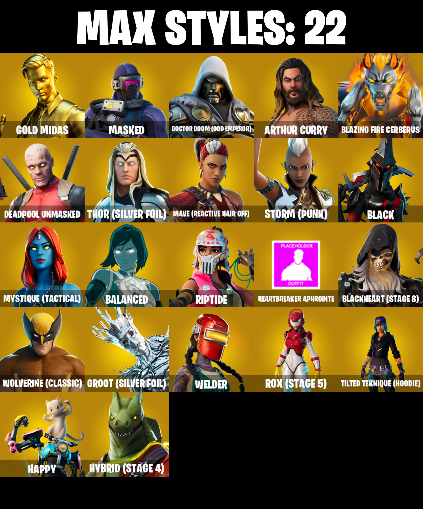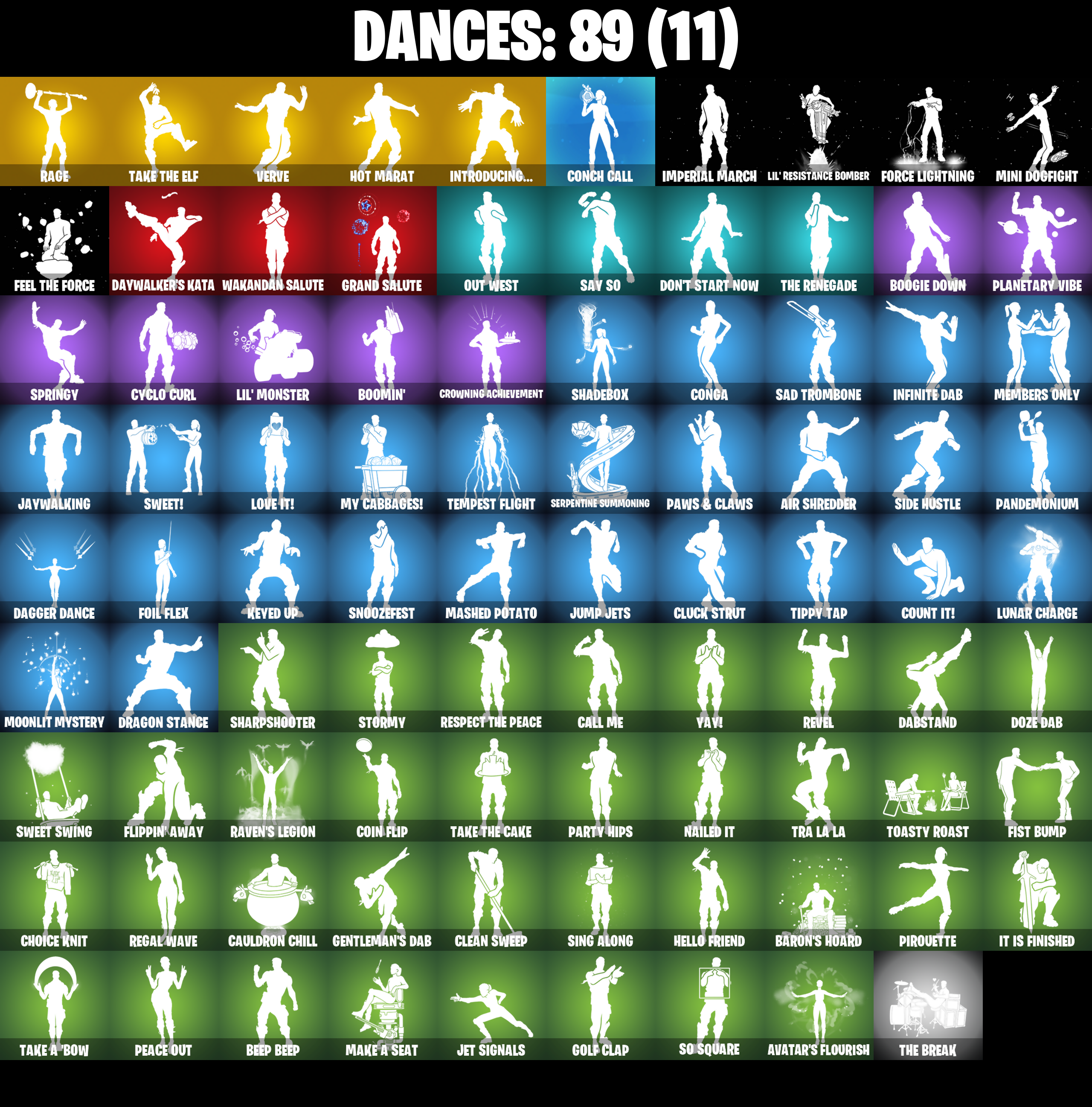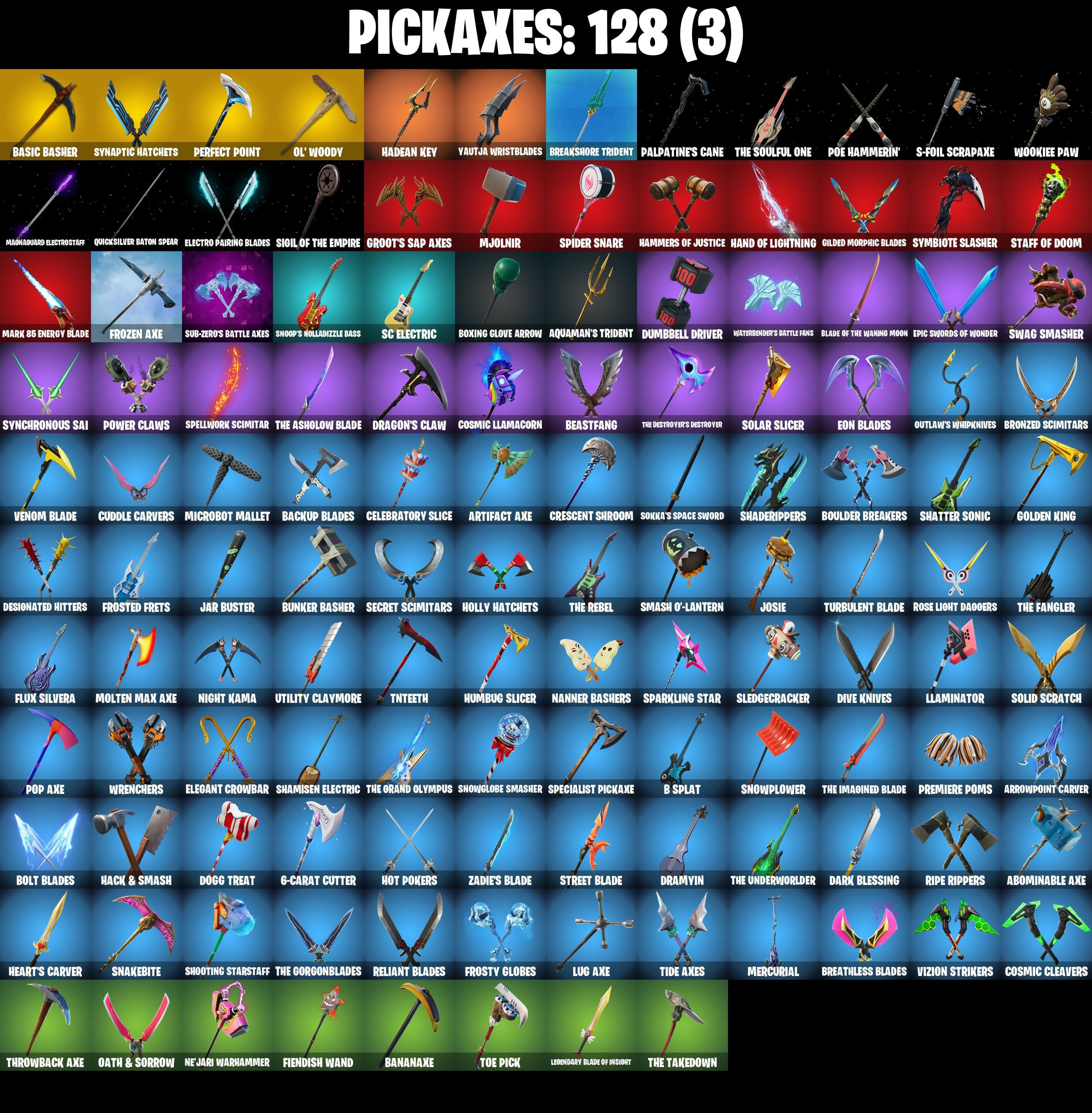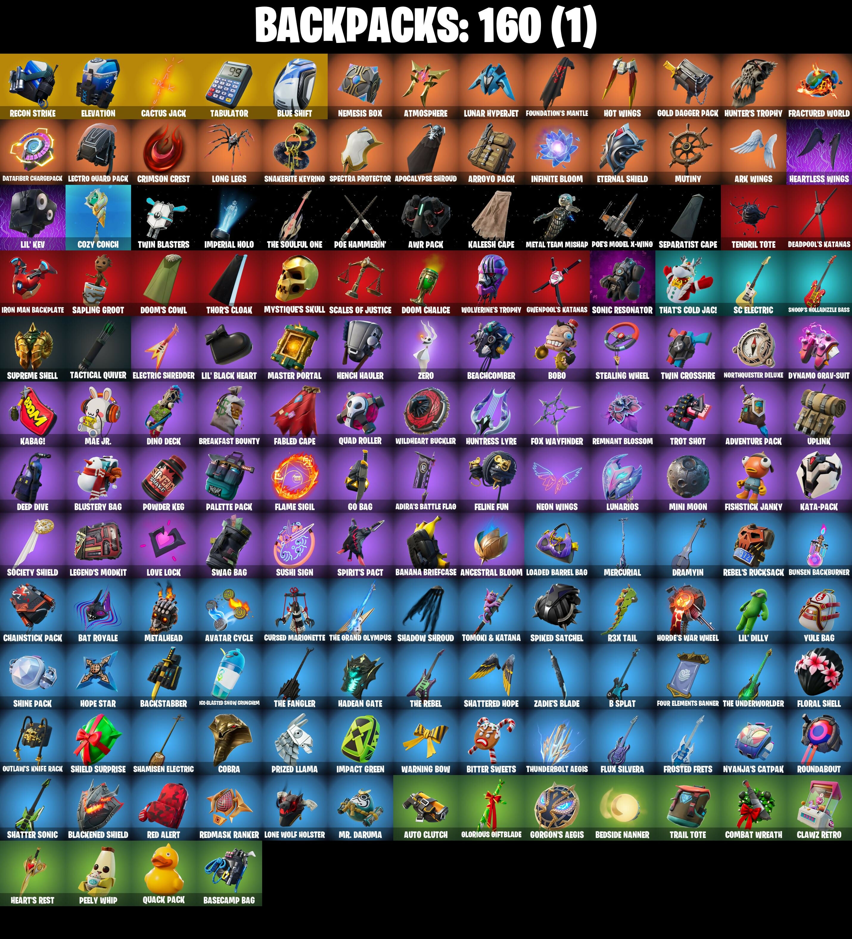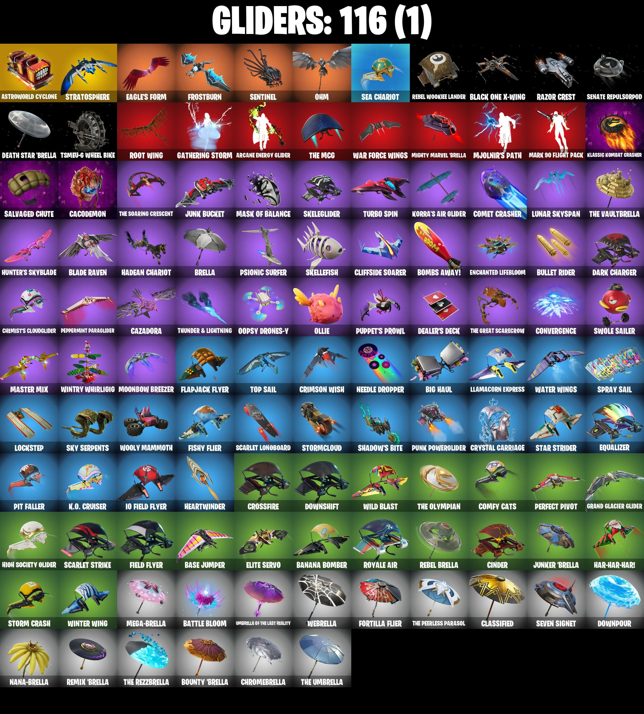 10 Field Flyer, 6-Carat Cutter, Abominable Axe, Adira's Battle Flag, Adventure Pack, Agent Peely, Air Shredder, Ancestral Bloom, Aphrodite, Apocalypse Shroud, Apprentice Evie, Aquaman, Aquaman's Trident, Arachne, Arcane Energy Glider, Ark, Ark Wings, Arrowpoint Carver, Arroyo Pack, Artemis, Arthur Curry, Artifact Axe, Astroworld Cyclone, Atmosphere, Aura, Auto Clutch, Avatar Cycle, Avatar's Flourish, Awr Pack, B Splat, B.R.U.T.E. Gunner, Backstabber, Backup Blades, Balanced, Banana Bomber, Banana Briefcase, Bananaxe, Baron's Hoard, Base Jumper, Basecamp Bag, Basic Basher, Bat Royale, Battle Bloom, Beachcomber, Beastfang, Bedside Nanner, Beep Beep, Big Haul, Bitter Sweets, Black, Black One X-Wing, Blackened Shield, Blackheart, Blackheart (Stage 8), Blade Raven, Blade of the Waning Moon, Blazing Fire Cerberus, Blue Shift, Blue Striker, Blustery Bag, Bobo, Bolt Blades, Bombs Away!, Boogie Down, Boomin', Boulder Breakers, Bounty 'Brella, Boxing Glove Arrow, Breakfast Bounty, Breakshore Trident, Breathless Blades, Brella, Bronzed Scimitars, Brutus, Bullet Rider, Bunker Basher, Bunker Jonesy, Bunsen Backburner, Cacodemon, Cactus Jack, Call Me, Catalyst, Cauldron Chill, Cazadora, Celebratory Slice, Cerberus, Chainstick Pack, Chemist's Cloudglider, Choice Knit, Chromebrella, Cinder, Classified, Clawz Retro, Clean Sweep, Cliffside Soarer, Cloud Striker, Cluck Strut, Cobra, Coin Flip, Combat Wreath, Comet Crasher, Comfy Cats, Conch Call, Conga, Convergence, Cosmic Cleavers, Cosmic Llamacorn, Count It!, Cozy Conch, Crescent Shroom, Crimson Crest, Crimson Wish, Crossfire, Crowning Achievement, Crystal, Crystal Carriage, Cuddle Carvers, Cursed Marionette, Cyclo Curl, D'ark, Dabstand, Dagger Dance, Dark Blessing, Dark Charger, Darkheart, Datafiber Chargepack, Daywalker's Kata, Deadpool, Deadpool Unmasked, Deadpool's Katanas, Dealer's Deck, Death Star 'Brella, Deep Dive, Derby Dynamo, Desionated Hitters, Diamond Diva, Dino Deck, Dive Knives, Doctor Doom, Doctor Doom (God Emperor), Dogg Treat, Dominion, Don't Start Now, Doom Chalice, Doom's Cowl, Doublecross, Downpour, Downshift, Doze Dab, Dragon Stance, Dragon's Claw, Dramyin, Dumbbell Driver, Dynamo Grav-Suit, Eagle's Form, Electric Shredder, Electro Pairing Blades, Elegant Crowbar, Elevation, Elite Servo, Emperor Palpatine, Enchanted Lifebloom, Eon Blades, Epic Swords of Wonder, Equalizer, Eternal Knight, Eternal Shield, Fabled Cape, Fade, Feel The Force, Feline Fun, Field Flyer, Fiendish Wand, Fishstick Janky, Fishy Flier, Fist Bump, Flame Sigil, Flapjack Flyer, Flippin' Away, Floral Shell, Flux Silvera, Foil Flex, Force Lightning, Fortilla Flier, Foundation's Mantle, Four Elements Banner, Fox Wayfinder, Fractured World, Frost Squad, Frostburn, Frosted Frets, Frosty Globes, Frozen Axe, Galaxia, Gathering Storm, Gear Specialist Maya, General Grievous, Gentleman's Dab, Gilded Morphic Blades, Gingerbread Raider, Glorious Giftblade, Go Bag, Gold Dagger Pack, Gold Midas, Golden King, Golf Clap, Gorgon's Aegis, Grand Glacier Glider, Grand Salute, Green Arrow, Groot, Groot (Silver Foil), Groot's Sap Axes, Gwenpool's Katanas, Hack & Smash, Hadean Chariot, Hadean Gate, Hadean Key, Hades, Hammers of Justice, Hand of Lightning, Happy, Har-Har-Har!, Heart's Carver, Heart's Rest, Heartbreaker Aphrodite, Heartless Wings, Heartwinder, Hello Friend, Hench Hauler, High Society Glider, Holiday Boxy, Holly Hatchets, Hope Star, Horde's War Wheel, Hot Marat, Hot Pokers, Hot Wings, Humbug Slicer, Hunter's Skyblade, Hunter's Trophy, Huntress Lyre, Hybrid, Hybrid (Stage 4), Ice-Blasted Snow Crunchiem, Impact Green, Imperial Holo, Imperial March, Infinite Bloom, Infinite Dab, Introducing..., Iris, Iron Man Backplate, It Is Finished, Jack Skellington, Jar Buster, Jaywalking, Jennifer Walters, Jet Signals, Josie, Jules, Jump Jets, Junk Bucket, Junker 'Brella, K.O. Cruiser, Kabag!, Kaleesh Cape, Kata-Pack, Keyed Up, Kit, Klassic Kombat Crasher, Kondor, Korra, Korra's Air Glider, Kyra, Lectro Guard Pack, Legend's Modkit, Legendary Blade of Insight, Lil' Black Heart, Lil' Dilly, Lil' Kev, Lil' Monster, Lil' Resistance Bomber, Llamacorn Express, Llaminator, Loaded Barrel Bag, Lockstep, Lone Wolf Holster, Long Legs, Love It!, Love Lock, Lt. John Llama, Lug Axe, Lunar Charge, Lunar Hyperjft, Lunar Skyspan, Lunarios, Mae Jr., Make A Seat, Mancake, Mandalorian, Maquaard Electrostaff, Marcus Fenix, Mark 85 Energy Blade, Mark 90 Flight Pack, Mashed Potato, Mask of Balance, Masked, Master Mix, Master Portal, Mave, Mave (Reactive Hair Off), Medusa, Mega-Brella, Members Only, Meowscles, Mercurial, Metal Team Leader, Metal Team Mishap, Metalhead, Microbot Mallet, Mighty Marvel 'Brella, Mini Dogfight, Mini Moon, Mjolnir, Mjolnir's Path, Molten Max Axe, Moonbow Breezer, Moonlit Mystery, Mr. Daruma, Mutiny, My Cabbages!, Mystique, Mystique (Tactical), Mystiques Skull, Nailed It, Nana-Brella, Nanner Bashers, Needle Dropper, Nemesis Box, Neon Wings, Nfjari Warhammer, Night Kama, Northquester Deluxe, Nyanja's Catpak, Oath & Sorrow, Ocean, Ohm, Ol' Woody, Ollie, Oopsy Drones-Y, Out West, Outlaw's Knife Rack, Outlaw's Whipknives, Palette Pack, Palpatine's Cane, Pandemonium, Party Hips, Paws & Claws, Peace Out, Peely, Peely Whip, Peppermint Paraglider, Perfect Pivot, Perfect Point, Pirouette, Pit Faller, Planetary Vibe, Poe Dameron, Poe Hammerin', Poe's Model X-Wing, Point Patroller, Polar Peely, Pop Axe, Poseidon, Powder Keg, Power Claws, Predator, Premiere Poms, Prized Llama, Prodigy, Psionic Surfer, Punk Powerglider, Puppet's Prowl, Quack Pack, Quad Roller, Quicksilver Baton Spear, R3X Tail, Rage, Raven's Legion, Razor Crest, Rebel Brella, Rebel Wookiee Lander, Rebel's Rucksack, Recon Strike, Red Alert, Redmask Ranker, Reese, Regal Wave, Reliant Blades, Remix 'Brella, Remnant Blossom, Respect The Peace, Revel, Ripe Rippers, Riptide, Ronin, Root Wing, Rose Light Daggers, Roundabout, Rox, Rox (Stage 5), Royale Air, Ruby, Runway Racer, S-Foil Scrapaxe, SC Electric, Sad Trombone, Salvaged Chute, San