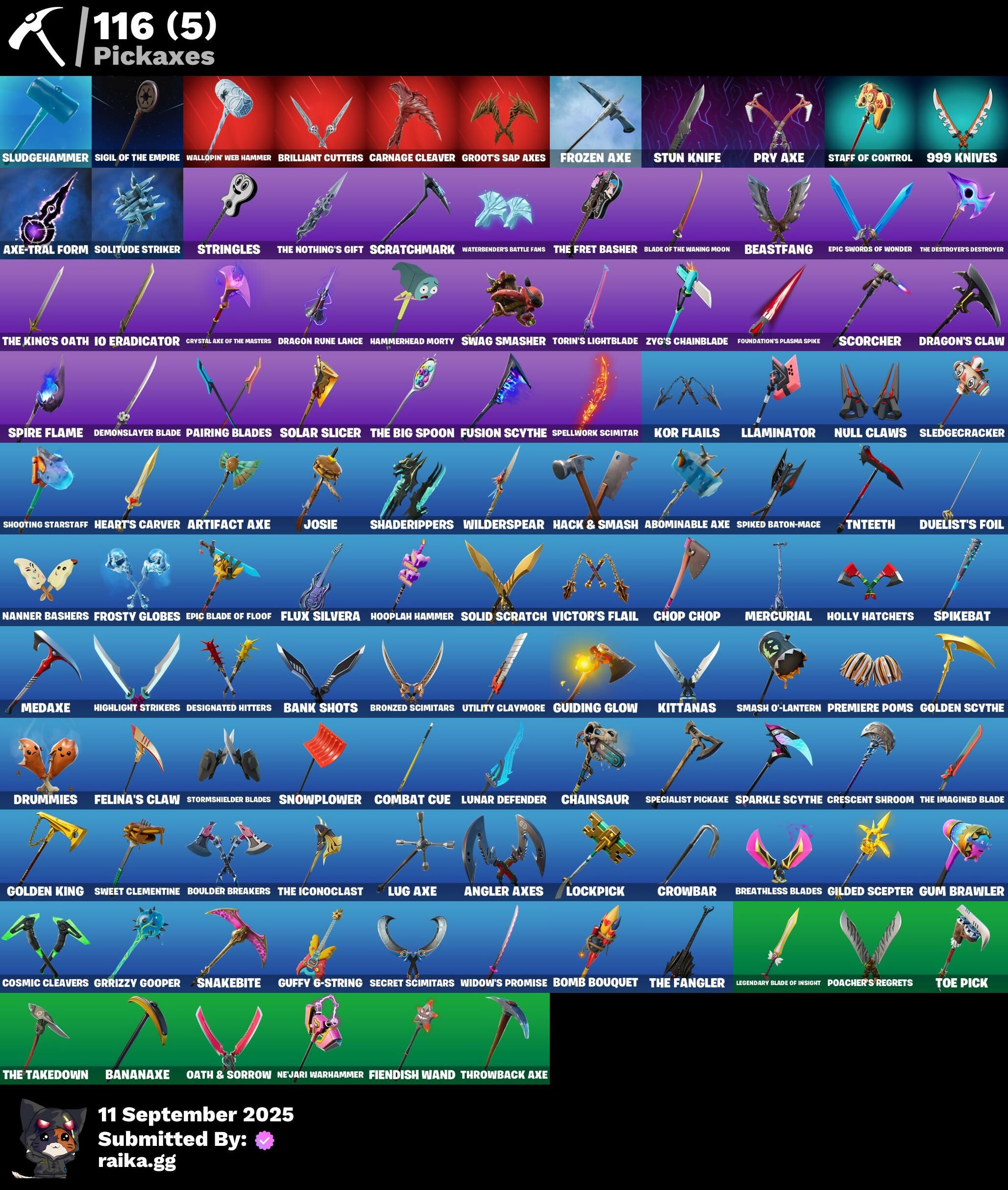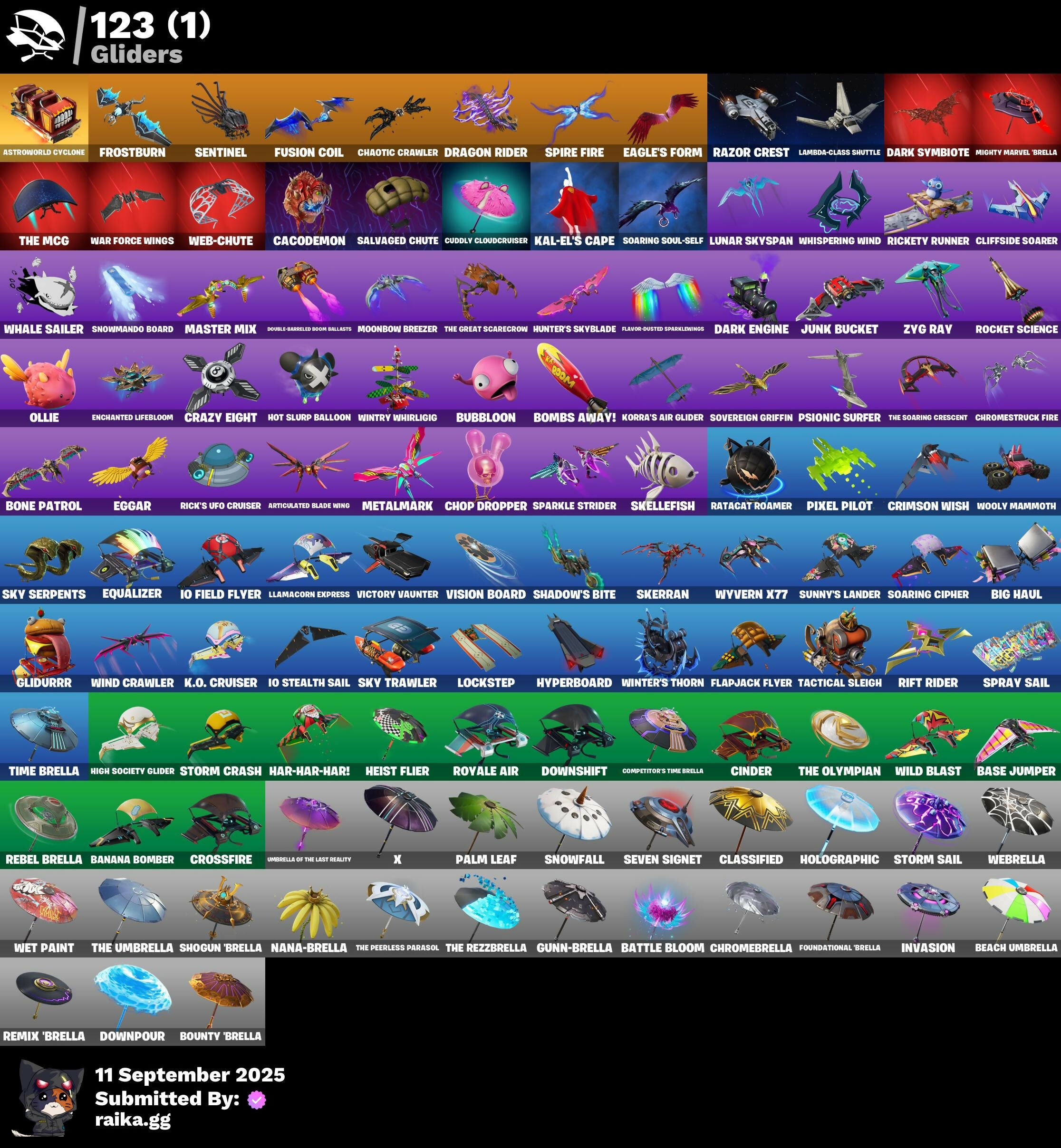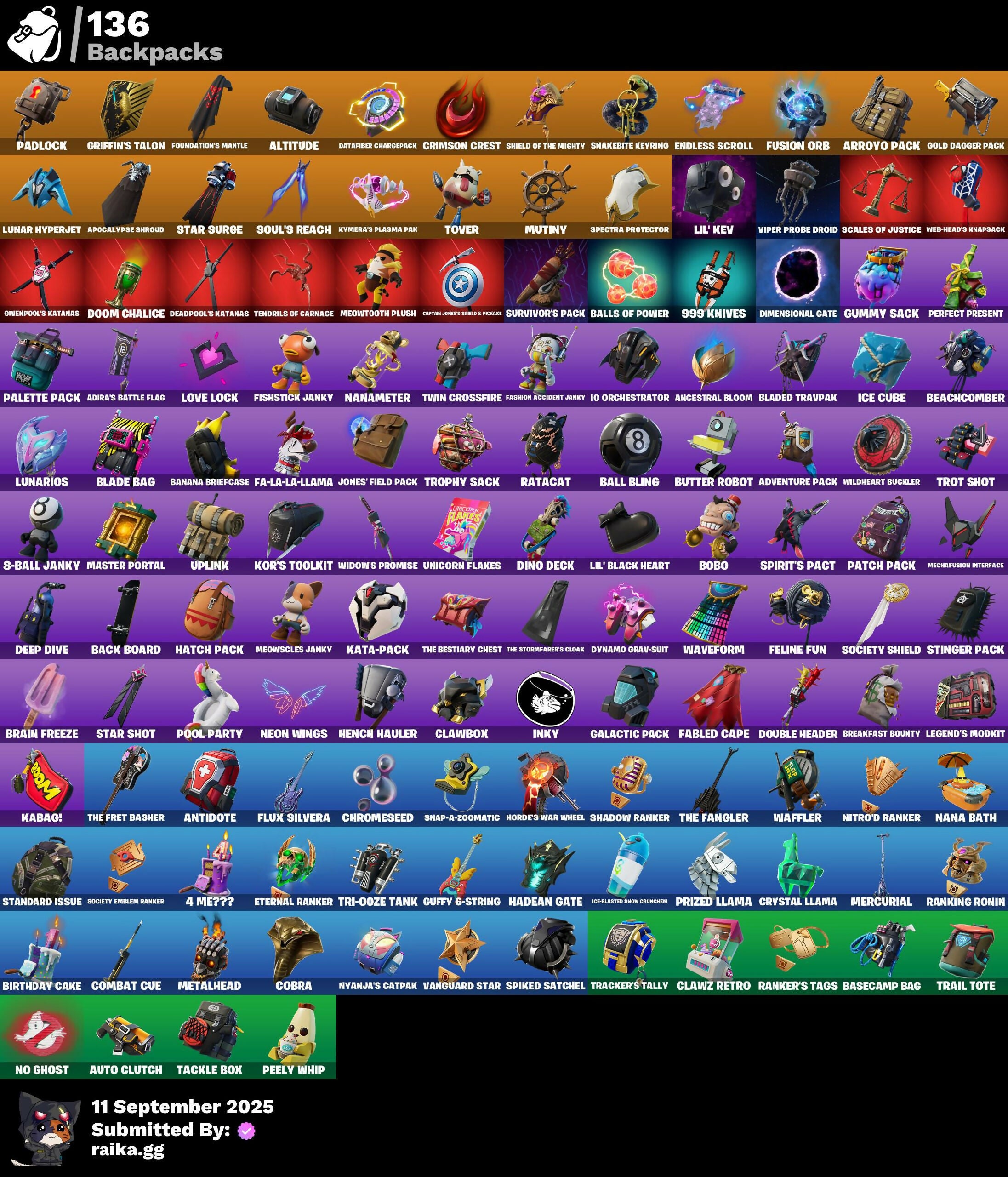 1-Ball, 10 Orchestrator, 4 Me???, 8-Ball Janky, 8-Ball Vs Scratch, 999 Knives, A Warrior Prepares, Abominable Axe, Adira, Adira's Battle Flag, Adventure Pack, Agent Jones, Agent Peely, Altitude, Ancestral Bloom, Angler Axes, Antidote, Aphrodite, Apocalypse Shroud, Arctic Adeline, Arroyo Pack, Articulated Blade Wing, Artifact Axe, Astroworld Cyclone, Auto Clutch, Axe-Tral Form, Azarath Metron Zinthos!, Back Board, Ball Bling, Balls of Power, Banana Bomber, Banana Briefcase, Bananaxe, Bank Shots, Base Jumper, Basecamp Bag, Battle Bloom, Battle Call, Beach Umbrella, Beachcomber, Bean Bag, Beastfang, Beep Beep, Big Haul, Birthday Cake, Blackheart, Blade Bag, Blade Of The Waning Moon, Bladed Travpak, Blowin' Up, Blowing Bubbles, Bobo, Boing!, Bomb Bouquet, Bombs Away!, Bone Patrol, Boogie Down, Boomin', Boots 'N' Cats, Boulder Breakers, Bounty 'Brella, Brain Freeze, Breakfast Bounty, Breakneck, Breathless Blades, Brilliant Cutters, Bronzed Scimitars, Bubbloon, Butter Robot, Bytes, Cacodemon, Calculated, Call Me, Cameo Vs Chic, Captain Jones's Shield & Pionake, Captain Tlamerica, Cardistry, Carnage, Carnage Cleaver, Cat Flip, Catalyst, Cauldron Chill, Cerberus, Chainsaur, Chaos Director, Chaotic Crawler, Charlotte, Choice Knit, Chop Chop, Chop Dropper, Chromebrella, Chromeseed, Chromestruck Fire, Cinder, Classified, Clawbox, Clawz Retro, Clean Sweep, Cliffside Soarer, Cluck, Cobra, Coin Flip, Combat Cue, Competitor's Time Brella, Conga, Controller Crew, Cosmic Cleavers, Crazy Eight, Crescent Shroom, Crimson Crest, Crimson Wish, Crossfire, Crowbar, Crowning Achievement, Crystal Axe Of The Masters, Crystal Llama, Cuddly Cloudcruiser, Cyclo Curl, Dabstand, Dagger Dance, Dark Engine, Dark Symbiote, Darth Vader, Datafiber Chargepack, Deadpool, Deadpool's Katanas, Deep Dive, Demonslayer Blade, Designated Hitters, Dimensional Gate, Dino Deck, Doctor Slone, Doom Chalice, Double Header, Downpour, Downshift, Doze Dab, Dragon Rider, Dragon Rune Lance, Dragon Stance, Dragon's Claw, Droop, Drummies, Duelist's Foil, Dynamo Grav-Suit, Dynamo TNTina, Eagle's Form, Eggar, Enchanted Lifebloom, Endless Scroll, Epic Blade Of Floof, Epic Swords Of Wonder, Equalizer, Eternal Ranker, Evasive Maneuvers, Evie, Fa-La-La-Llama, Fabio Sparklemane, Fabled Cape, Fashion Accident Janky, Featherweight, Felina, Felina's Claw, Feline Fun, Fiendish Wand, Fishstick Janky, Flapjack Flyer, Flavor-Dusted Sparklewings, Flippin' Away, Flux Silvera, Foil Flex, Foundation's Mantle, Foundation's Plasma Spike, Foundational Brella, Free Flow, Frostburn, Frosty Globes, Frozen Axe, Fusion, Fusion Coil, Fusion Orb, Fusion Scythe, Galactic Pack, Gear Specialist Maya, Gentleman's Dab, Get Funky, Gilded Scepter, Glidurrr, Gold Brutus, Gold Dagger Pack, Gold Midas, Golden King, Golden Scythe, Golf Clap, Good Guy, Griffin's Talon, Groots Sap Axes, Grriz, Grrrizzy Gooper, Guffy 6-String, Guggimon, Guiding Glow, Gum Brawler, Gumbo, Gummy Sack, Gunn-Brella, Gwenpool's Katanas, Hack & Smash, Hadean Gate, Hammerhead Morty, Hand-Forged, Har-Har-Har!, Harlowe, Hatch Pack, Haven, Heart's Carver, Heist Flier, Hello Friend, Hench Hauler, High Five, High Society Glider, Highlight Strikers, Holly Hatchets, Holographic, Hooplah Hammer, Hope, Horde's War Wheel, Hot Slurp Balloon, Hula Hoopin', Hunter's Skyblade, Hybrid, Hyperboard, I Declare!, I'm A Mystery, IO Field Flyer, IO Stealth Sail, Ice Cube, Ice-Blasted Snow Cruncher, Imperial March, In Da Party, Inky, Invasion, Io Eradicator, It Is Finished, It's Go Time!, It's... You?, J.B. Chimpanski, Jaywalking, Jazz Hands, Joey, Jones' Field Pack, Josie, Journey Vs Hazard, Junk Bucket, K.O. Cruiser, Kabag!, Kal-El's Cape, Kata-Pack, Keep It Mello, Kick Back, Kittanas, Kondor, Kor, Kor Flails, Kor's Toolkit, Korra, Korra's Air Glider, Krisabelle, Kymera, Kymera's Plasma Pak, Lambda-Class Shuttle, Lara Croft, Legend's Modkit, Legendary Blade Of Insight, Lexa, Lil' Black Heart, Lil' Kev, Lil' Monster, Lil' Prancer, Lil' Rover, Lil' Saucer, Llamacorn Express, Llaminator, Lockpick, Lockstep, Love It!, Love Lock, Lt. John Llama, Lug Axe, Lunar Charge, Lunar Defender, Lunar Hyperjet, Lunar Skyspan, Lunarios, Lynx, Make A Seat, Malik, Mancake, Mandalorian, Mashed Potato, Master Mix, Master Portal, Mave, Mechafusion Interface, Medaxe, Menace, Meowscles, Meowscles Janky, Meowtooth Plush, Mercurial, Metalhead, Metalmark, Mic Drop, Mighty Marvel 'Brella, Moonbow Breezer, Mutiny, Mwahaha, Nailed It, Nana Bath, Nana Nana, Nana-Brella, Nanameter, Nanner Bashers, Ne'Jari Warhammer, Neon Wings, Neymar Jr, Nisha, Nitro'd Ranker, No Ghost, Null Claws, Nyanja's Catpak, Oath & Sorrow, Ollie, Onesie, Orange Justice, Oscar, Padlock, Pairing Blades, Palette Pack, Palm Leaf, Pandemonium, Paradigm (Reality-659), Patch Pack, Paws & Claws, Peely, Peely Whip, Perfect Present, Phew!, Pixel Pilot, Poacher's Regrets, Polar Peely, Pool Party, Powder, Premiere Poms, Prized Llama, Pry Axe, Psionic Surfer, Rage Quit, Ranker's Tags, Ranking Ronin, Ratacat, Ratacat Roamer, Raz, Razor Crest, Ready When You Are, Rebel Brella, Rebirth Raven, Reese, Regal Wave, Remedy Vs Toxin, Remix 'Brella, Respect The Peace, Rhythm Of Chaos, Rick Sanchez, Rick's UFO Cruiser, Rickety Runner, Rift Rider, Rippley Vs Sludge, Rocket Science, Ronin, Royale Air, Sabina, Salvaged Chute, Scales of Justice, Scorcher, Scratchmark, Secret Scimitars, Sentinel, Seven Signet, Sgt. Winter, Shadebox, Shaderippers, Shadow Ranker, Shadow's Bite, Shanta, Sharpshooter, Shield of the Mighty, Shimmer, Shogun 'Brella, Shooting Starstaff, Shuriken Spinner, Side Hustle, Sidewinder, Sigil Of The Empire, Ska-Stra-Terrestrial, Skellefish, Skerran, Sky Serpents, Sky Trawler, Skye, Slayer Juice Wrld, Sled Ready Guff, Sledgecracker, Slick, Sludgehammer, Smash O'-Lantern, Snakebite, Snakebite Keyring, Snap, Snap-A-Zoomatic, Snikt! Snikt!, Snoozefest, Snowfall, Snowmando Board, Snowplower, Soaring Cipher, Soaring Soul-Self, Society Emblem Ranker, Society Shield, Solar Slicer, Solid Scratch, Solid Snak