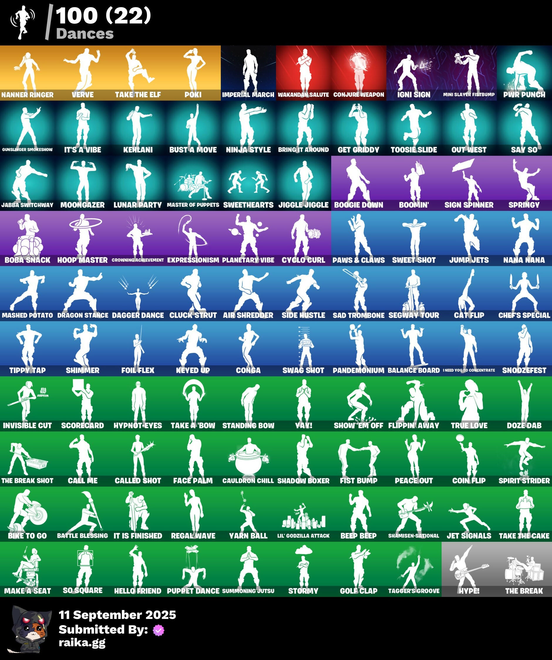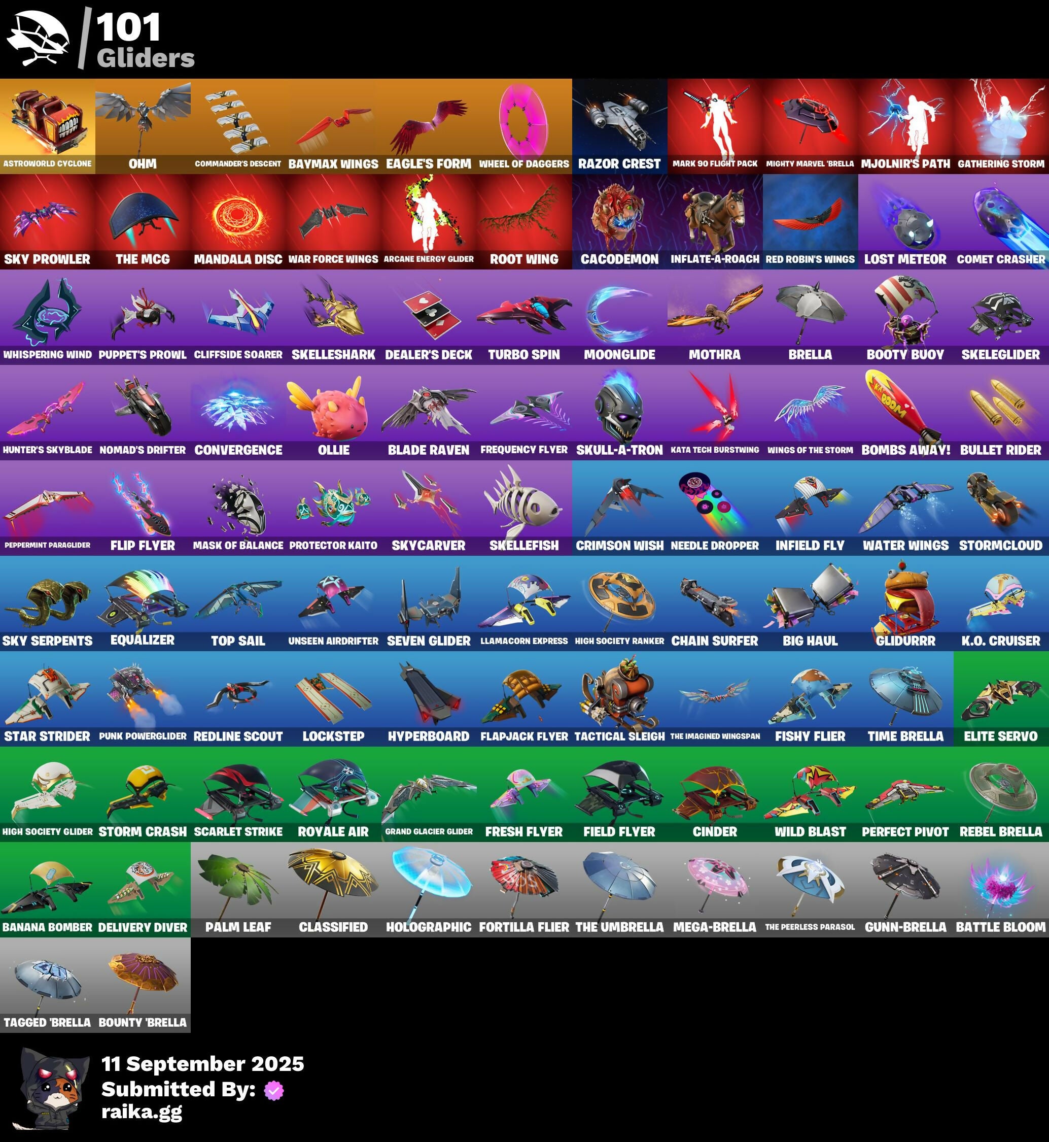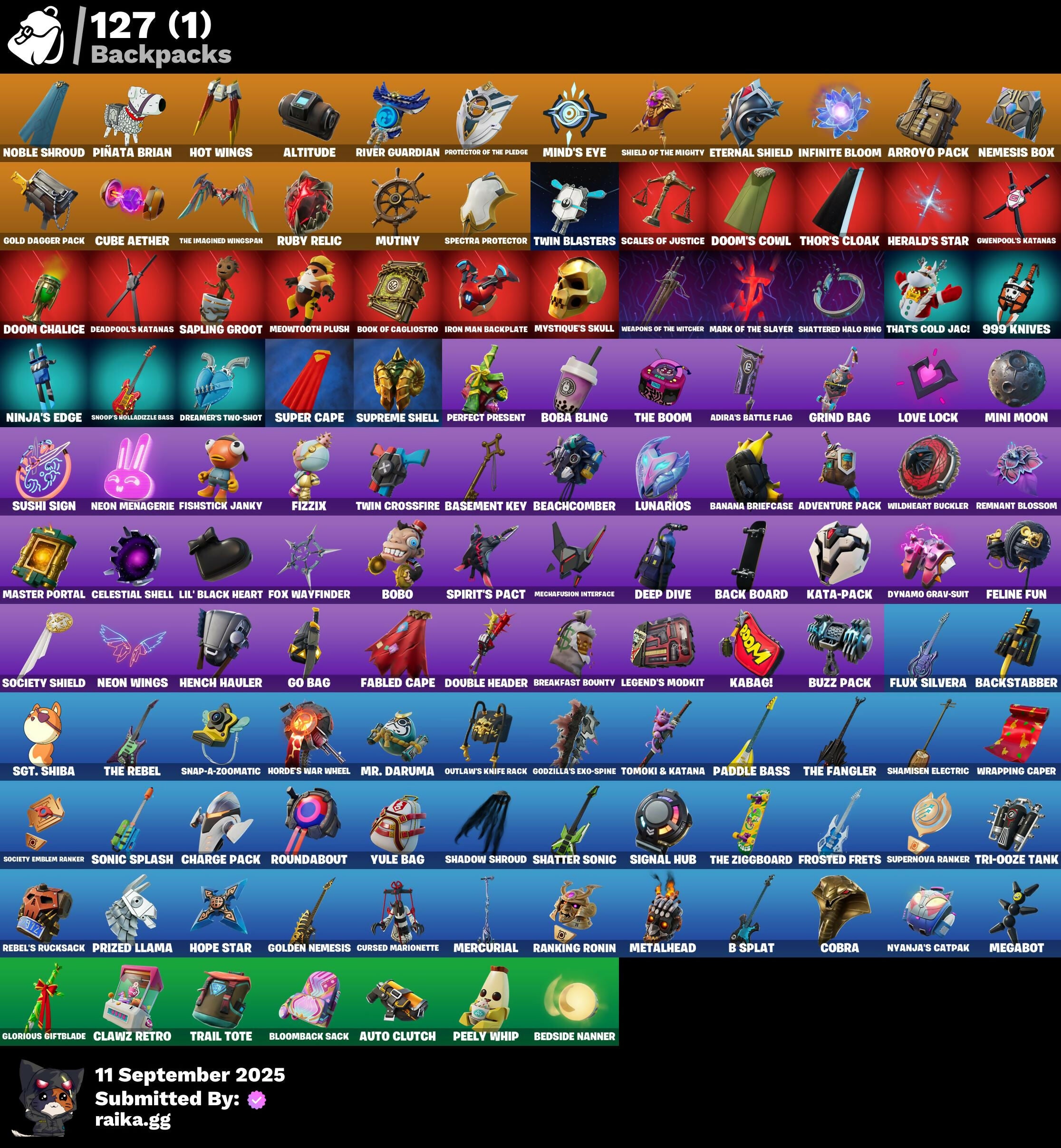 999 Knives, Abominable Axe, Adira's Battle Flag, Adventure Pack, Agent Peely, Air Shredder, Altitude, Aquaman, Aquaman's Trident, Arcane Energy Glider, Arroyo Pack, Astroworld Cyclone, Auto Clutch, Axion Sentinel, B Splat, Back Board, Backstabber, Balance Board, Banana Bomber, Banana Briefcase, Bananaxe, Basement Key, Battle Blessing, Battle Bloom, Baymax Wings, Beachcomber, Beastfang, Bedside Nanner, Beep & Boop, Beep Beep, Big Bite, Big Haul, Bike To Go, Blackheart, Blackstar Edge, Blade Raven, Blades Of Light, Blitz Axe, Bloomback Sack, Board Breaker, Boba Bling, Boba Snack, Bobo, Bombs Away!, Boogie Down, Book Of Cagliostro, Boomin', Booty Buoy, Bounty 'Brella, Bracer, Breakfast Bounty, Breaking Waves, Breathless Blades, Brella, Brilliant Cutters, Bring It Around, Brutus, Bullet Rider, Bunker Basher, Bunker Jonesy, Bunya, Bust A Move, Buzz Pack, Cacodemon, Call Me, Called Shot, Cat Flip, Cauldron Chill, Celestial Shell, Chain Surfer, Championship Jonesy, Charge Pack, Chef's Special, Cinder, Classified, Clawz Retro, Cliffside Soarer, Cluck Strut, Cobra, Coin Flip, Comet Crasher, Commander's Descent, Conga, Conjure Weapon, Convergence, Crimson Wish, Crowning Achievement, Crucible Blade, Crystal Fang, Crystal Smasher, Cube Aether, Cubic Scepter, Cursed Marionette, Cyclo Curl, Dagger Dance, Daigo, Daigo's Claws, Deadpool, Deadpool's Katanas, Dealer's Deck, Deep Dive, Delivery Diver, Designated Hitters, Dive Knives, Doctor Doom, Doctor Strange, Dogg Treat, Doom Chalice, Doom Slayer, Doom's Cowl, Double Header, Double Tags, Doze Dab, Dragon Stance, Dragon's Claw, Dreamer's Two-Shot, Dusk Knight, Dusty, Dynamo Grav-Suit, Eagle's Form, Electro Pairing Blades, Elite Servo, Ember, Ember Pick, Energy Claw, Eon Blades, Epic Blade Of Floof, Epic Swords Of Wonder, Equalizer, Erisa, Eternal Knight, Eternal Shield, Expressionism, Fabled Cape, Face Palm, Fade, Fanged Foresight, Felina, Felina's Claw, Feline Fun, Field Flyer, Fiendish Wand, Fishstick Janky, Fishy Flier, Fist Bump, Fizzix, Flapjack Flyer, Flip Flyer, Flippin' Away, Flux Silvera, Foil Flex, Fortilla Flier, Fox Wayfinder, Foxfire Edge, Frequency Flyer, Fresh Flyer, Frosted Frets, Frozen Axe, Gathering Storm, Gear Specialist Maya, Geralt Of Rivia, Get Griddy, Gilded Morphic Blades, Glidurrr, Glorious Giftblade, Go Bag, Godzilla Evolved, Godzilla's Exo-Spine, Gold Dagger Pack, Gold Midas, Golden King, Golden Nemesis, Golden Scythe, Golf Clap, Grand Glacier Glider, Grind Bag, Groot, Groots Sap Axes, Guardian Daggers, Gunn-Brella, Gunnar, Gunslinger Smokeshow, Gwenpool's Katanas, Hack & Smash, Hammers Of Justice, Hand Of Lightning, Hello Friend, Helsie, Hench Hauler, Herald's Star, Hero Baymax, High Society Glider, High Society Ranker, Highwire, Holiday Boxy, Holographic, Hoop Master, Hope Star, Horde's War Wheel, Hot Pokers, Hot Wings, Humbug Slicer, Hunter's Skyblade, Hybrid, Hype!, Hyperboard, Hypnot-Eyes, Igni Sign, Imani, Imperial March, Infield Fly, Infinite Bloom, Inflate-A-Roach, Invisible Cut, Iris, Iron Man Backplate, It Is Finished, It's A Vibe, Jabba Switchway, Jade, Jennifer Walters, Jet Signals, Jiggle Jiggle, Josie, Jules, Jump Jets, K.O. Club, K.O. Cruiser, Kabag!, Kaiju Cutter, Kata Tech Burstwing, Kata-Pack, Kehlani, Kendo, Keyed Up, Kiara K.O., Kit, Kondor, Legend's Modkit, Legendary Blade Of Insight, Lexa, Lil' Black Heart, Lil' Godzilla Attack, Llamacorn Express, Lockpick, Lockstep, Lost Meteor, Love Lock, Lunar Glow, Lunar Party, Lunarios, Lynx, Make A Seat, Mancake, Mandala Disc, Mandalorian, Manic, Mark 85 Energy Blade, Mark 90 Flight Pack, Mark Of The Slayer, Mashed Potato, Mask of Balance, Massai, Master Key, Master Of Puppets, Master Portal, Mave, Mechafusion Interface, Mega-Brella, Megabot, Meowscles, Meowtooth Plush, Mercurial, Metalhead, Microbot Mallet, Mighty Marvel 'Brella, Mind's Eye, Mini Moon, Mini Slayer Fistbump, Mizuki, Mjolnir, Mjolnir's Path, Moongazer, Moonglide, Mothra, Mr. Daruma, Mutiny, Mystica, Mystique, Mystique's Skull, Nana Nana, Nanner Bashers, Nanner Ringer, Nannerbloom Hammer, Ne'Jari Warhammer, Needle Dropper, Neko Claws, Nemesis Box, Neon Menagerie, Neon Wings, Nezumi, Night Kama, Ninja, Ninja Style, Ninja's Edge, Noble Shroud, Nomad's Drifter, Null Claws, Nyanja, Nyanja's Catpak, O.M.E.G.A. Spear, Oath & Sorrow, Ocean, Ohm, Ollie, Omni Sword, Out West, Outlaw's Knife Rack, Outlaw's Whipknives, Paddle Bass, Paint Pummellers, Palm Leaf, Pandemonium, Paws & Claws, Peace Out, Peely, Peely Whip, Peppermint Paraglider, Perfect Pivot, Perfect Present, Piñata Brian, Planetary Vibe, Plasmacore Claws, Plastic Patroller, Poised Playmaker, Poki, Pop Axe, Power Claws, Predator, Premiere Poms, Prized Llama, Protector Kaito, Protector Of The Pledge, Prowler, Punch Saw, Punk Powerglider, Puppet Dance, Puppet's Prowl, Pwr Punch, Ranking Ronin, Razor Crest, Rebel Brella, Rebel's Rucksack, Recon Expert, Red Robin's Wings, Redline Scout, Reese, Regal Wave, Reliant Blades, Remnant Blossom, Renzo The Destroyer, Ripe Rippers, River Guardian, Root Wing, Rose Thorns, Roundabout, Rox, Royale Air, Ruby Relic, Runway Racer, Sad Trombone, Santa Dogg, Sapling Groot, Say So, Scales Of Justice, Scarlet Strike, Scorcher, Scorecard, Scratchmark, Scuba Jonesy, Secret Scimitars, Segway Tour, Selene, Sentinel, Seven Glider, Sgt. Shiba, Sgt. Winter, Shadow Blade Hope, Shadow Boxer, Shadow Shroud, Shamisen Electric, Shamisen-sational, Shatter Sonic, Shattered Halo Ring, Shield Of The Mighty, Shimmer, Shooting Starstaff, Show 'Em Off, Side Hustle, Sidewinder, Sigil Of The Empire, Sign Spinner, Signal Hub, Silver Surfer, Siona, Skeleglider, Skellefish, Skelleshark, Skull-A-Tron, Sky Prowler, Sky Serpents, Skycarver, Skye, Slayer Juice Wrld, Smash O'-Lantern, Snakebite, Snap-A-Zoomatic, Snoop's Holladazzle Bass, Snoop's Holladizzle Bass, Snoozefest, So Square, Society Emblem Ranker, Society Shield, Solid Scratch, Sonic Splash, Soundwave Slashers, Sparkling Star, Specialist Pickaxe, Spectra Protector, Spellwork Scimitar, Spinal