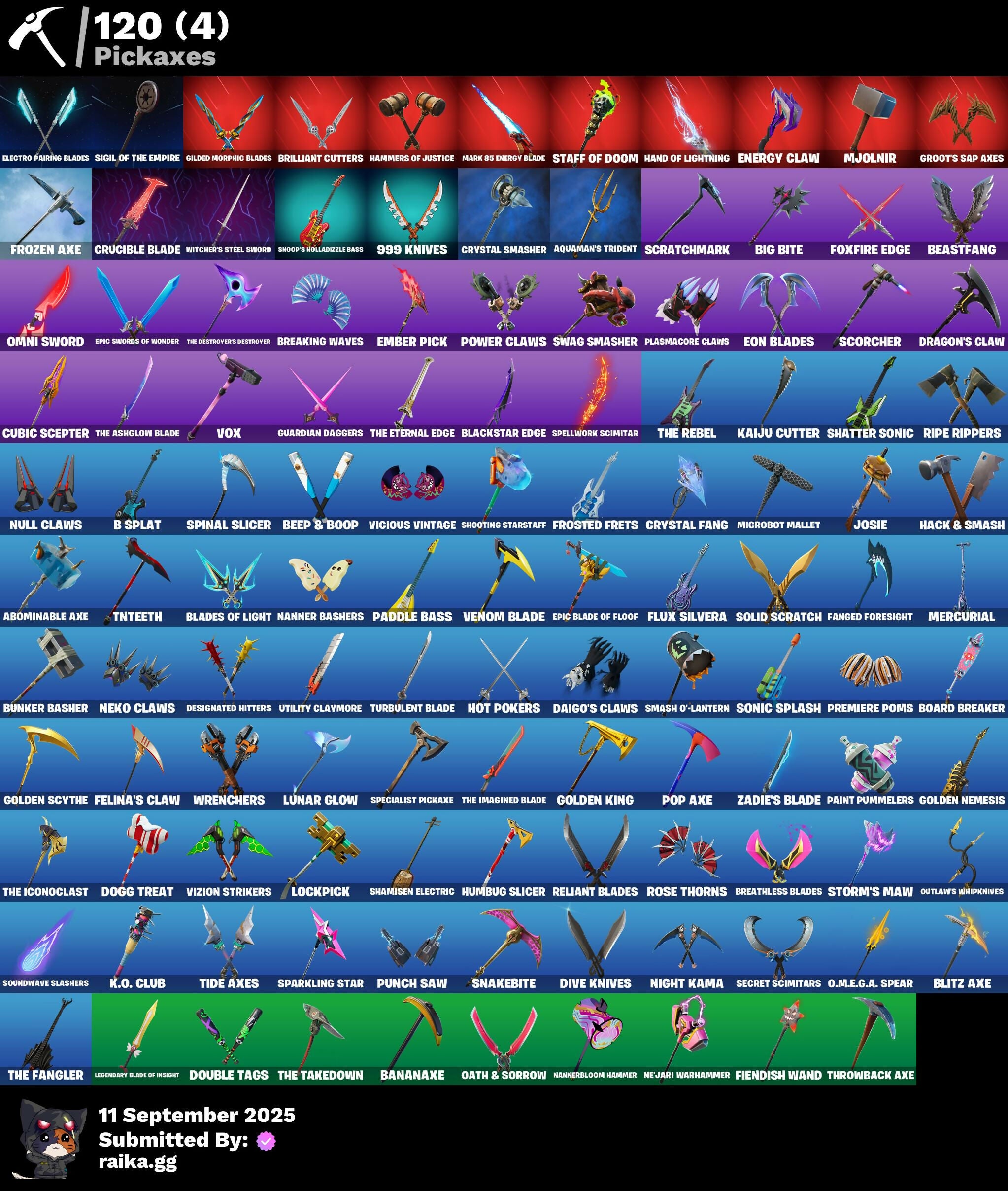 999 Knives, Abominable Axe, Adira's Battle Flag, Adventure Pack, Agent Peely, Air Shredder, Altitude, Aquaman, Aquaman's Trident, Arcane Energy Glider, Arroyo Pack, Astroworld Cyclone, Auto Clutch, Axion Sentinel, B Splat, Back Board, Backstabber, Balance Board, Banana Bomber, Banana Briefcase, Bananaxe, Basement Key, Battle Blessing, Battle Bloom, Baymax Wings, Beachcomber, Beastfang, Bedside Nanner, Beep & Boop, Beep Beep, Big Bite, Big Haul, Bike To Go, Blackheart, Blackstar Edge, Blade Raven, Blades Of Light, Blitz Axe, Bloomback Sack, Board Breaker, Boba Bling, Boba Snack, Bobo, Bombs Away!, Boogie Down, Book Of Cagliostro, Boomin', Booty Buoy, Bounty 'Brella, Bracer, Breakfast Bounty, Breaking Waves, Breathless Blades, Brella, Brilliant Cutters, Bring It Around, Brutus, Bullet Rider, Bunker Basher, Bunker Jonesy, Bunya, Bust A Move, Buzz Pack, Cacodemon, Call Me, Called Shot, Cat Flip, Cauldron Chill, Celestial Shell, Chain Surfer, Championship Jonesy, Charge Pack, Chef's Special, Cinder, Classified, Clawz Retro, Cliffside Soarer, Cluck Strut, Cobra, Coin Flip, Comet Crasher, Commander's Descent, Conga, Conjure Weapon, Convergence, Crimson Wish, Crowning Achievement, Crucible Blade, Crystal Fang, Crystal Smasher, Cube Aether, Cubic Scepter, Cursed Marionette, Cyclo Curl, Dagger Dance, Daigo, Daigo's Claws, Deadpool, Deadpool's Katanas, Dealer's Deck, Deep Dive, Delivery Diver, Designated Hitters, Dive Knives, Doctor Doom, Doctor Strange, Dogg Treat, Doom Chalice, Doom Slayer, Doom's Cowl, Double Header, Double Tags, Doze Dab, Dragon Stance, Dragon's Claw, Dreamer's Two-Shot, Dusk Knight, Dusty, Dynamo Grav-Suit, Eagle's Form, Electro Pairing Blades, Elite Servo, Ember, Ember Pick, Energy Claw, Eon Blades, Epic Blade Of Floof, Epic Swords Of Wonder, Equalizer, Erisa, Eternal Knight, Eternal Shield, Expressionism, Fabled Cape, Face Palm, Fade, Fanged Foresight, Felina, Felina's Claw, Feline Fun, Field Flyer, Fiendish Wand, Fishstick Janky, Fishy Flier, Fist Bump, Fizzix, Flapjack Flyer, Flip Flyer, Flippin' Away, Flux Silvera, Foil Flex, Fortilla Flier, Fox Wayfinder, Foxfire Edge, Frequency Flyer, Fresh Flyer, Frosted Frets, Frozen Axe, Gathering Storm, Gear Specialist Maya, Geralt Of Rivia, Get Griddy, Gilded Morphic Blades, Glidurrr, Glorious Giftblade, Go Bag, Godzilla Evolved, Godzilla's Exo-Spine, Gold Dagger Pack, Gold Midas, Golden King, Golden Nemesis, Golden Scythe, Golf Clap, Grand Glacier Glider, Grind Bag, Groot, Groots Sap Axes, Guardian Daggers, Gunn-Brella, Gunnar, Gunslinger Smokeshow, Gwenpool's Katanas, Hack & Smash, Hammers Of Justice, Hand Of Lightning, Hello Friend, Helsie, Hench Hauler, Herald's Star, Hero Baymax, High Society Glider, High Society Ranker, Highwire, Holiday Boxy, Holographic, Hoop Master, Hope Star, Horde's War Wheel, Hot Pokers, Hot Wings, Humbug Slicer, Hunter's Skyblade, Hybrid, Hype!, Hyperboard, Hypnot-Eyes, Igni Sign, Imani, Imperial March, Infield Fly, Infinite Bloom, Inflate-A-Roach, Invisible Cut, Iris, Iron Man Backplate, It Is Finished, It's A Vibe, Jabba Switchway, Jade, Jennifer Walters, Jet Signals, Jiggle Jiggle, Josie, Jules, Jump Jets, K.O. Club, K.O. Cruiser, Kabag!, Kaiju Cutter, Kata Tech Burstwing, Kata-Pack, Kehlani, Kendo, Keyed Up, Kiara K.O., Kit, Kondor, Legend's Modkit, Legendary Blade Of Insight, Lexa, Lil' Black Heart, Lil' Godzilla Attack, Llamacorn Express, Lockpick, Lockstep, Lost Meteor, Love Lock, Lunar Glow, Lunar Party, Lunarios, Lynx, Make A Seat, Mancake, Mandala Disc, Mandalorian, Manic, Mark 85 Energy Blade, Mark 90 Flight Pack, Mark Of The Slayer, Mashed Potato, Mask Of Balance, Massai, Master Key, Master Of Puppets, Master Portal, Mave, Mechafusion Interface, Mega-Brella, Megabot, Meowscles, Meowtooth Plush, Mercurial, Metalhead, Microbot Mallet, Mighty Marvel 'Brella, Mind's Eye, Mini Moon, Mini Slayer Fistbump, Mizuki, Mjolnir, Mjolnir's Path, Moongazer, Moonglide, Mothra, Mr. Daruma, Mutiny, Mystica, Mystique, Mystique's Skull, Nana Nana, Nanner Bashers, Nanner Ringer, Nannerbloom Hammer, Ne'jari Warhammer, Needle Dropper, Neko Claws, Nemesis Box, Neon Menagerie, Neon Wings, Nezumi, Night Kama, Ninja, Ninja Style, Ninja's Edge, Noble Shroud, Nomad's Drifter, Null Claws, Nyanja, Nyanja's Catpak, O.M.E.G.A. Spear, Oath & Sorrow, Ocean, Ohm, Ollie, Omni Sword, Out West, Outlaw's Knife Rack, Outlaw's Whipknives, Paddle Bass, Paint Pummelers, Palm Leaf, Pandemonium, Paws & Claws, Peace Out, Peely, Peely Whip, Peppermint Paraglider, Perfect Pivot, Perfect Present, Piñata Brian, Planetary Vibe, Plasmacore Claws, Plastic Patroller, Poised Playmaker, Poki, Pop Axe, Power Claws, Predator, Premiere Poms, Prized Llama, Protector Kaito, Protector Of The Pledge, Prowler, Punch Saw, Punk Powerglider, Puppet Dance, Puppet's Prowl, Pwr Punch, Ranking Ronin, Razor Crest, Rebel Brella, Rebel's Rucksack, Recon Expert, Red Robin's Wings, Redline Scout, Reese, Regal Wave, Reliant Blades, Remnant Blossom, Renzo The Destroyer, Ripe Rippers, River Guardian, Root Wing, Rose Thorns, Roundabout, Rox, Royale Air, Ruby Relic, Runway Racer, Sad Trombone, Santa Dogg, Sapling Groot, Say So, Scales Of Justice, Scarlet Strike, Scorcher, Scorecard, Scratchmark, Scuba Jonesy, Secret Scimitars, Segway Tour, Selene, Sentinel, Seven Glider, Sgt. Shiba, Sgt. Winter, Shadow Blade Hope, Shadow Boxer, Shadow Shroud, Shamisen Electric, Shamisen-Sational, Shatter Sonic, Shattered Halo Ring, Shield Of The Mighty, Shimmer, Shooting Starstaff, Show 'Em Off, Side Hustle, Sidewinder, Sigil Of The Empire, Sign Spinner, Signal Hub, Silver Surfer, Siona, Skeleglider, Skellefish, Skelleshark, Skull-A-Tron, Sky Prowler, Sky Serpents, Skycarver, Skye, Slayer Juice Wrld, Smash O'-Lantern, Snakebite, Snap-A-Zoomatic, Snoop's Holladazzle Bass, Snoop's Holladizzle Bass, Snoozefest, So Square, Society Emblem Ranker, Society Shield, Solid Scratch, Sonic Splash, Soundwave Slashers, Sparkling Star, Specialist Pickaxe, Spectra Protector, Spellwork Scimitar, Spinal 