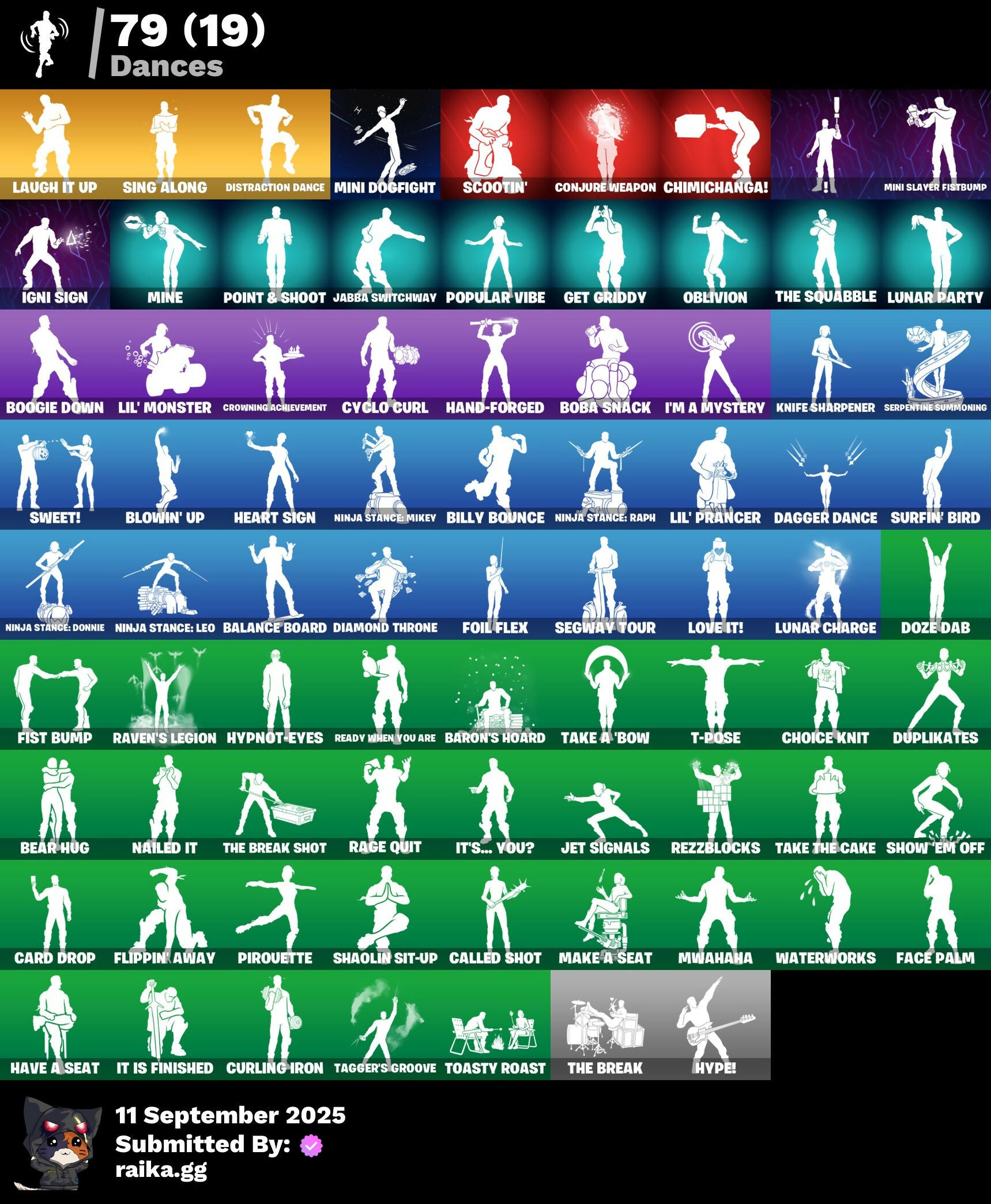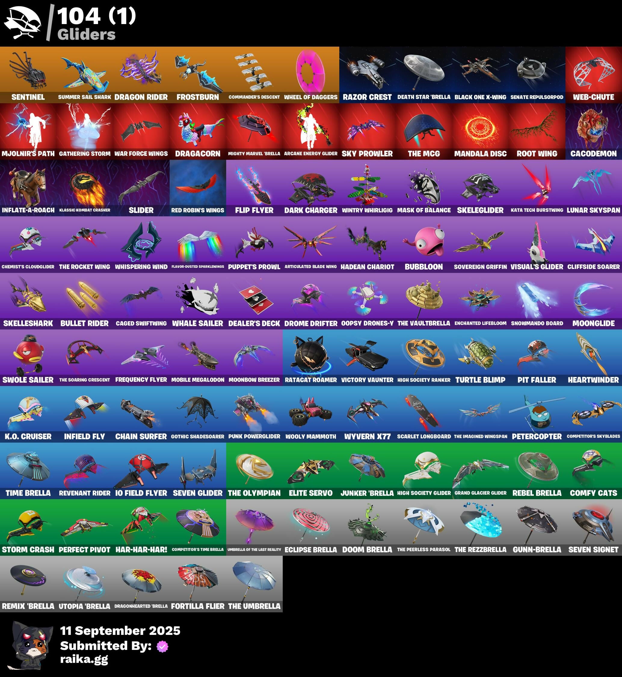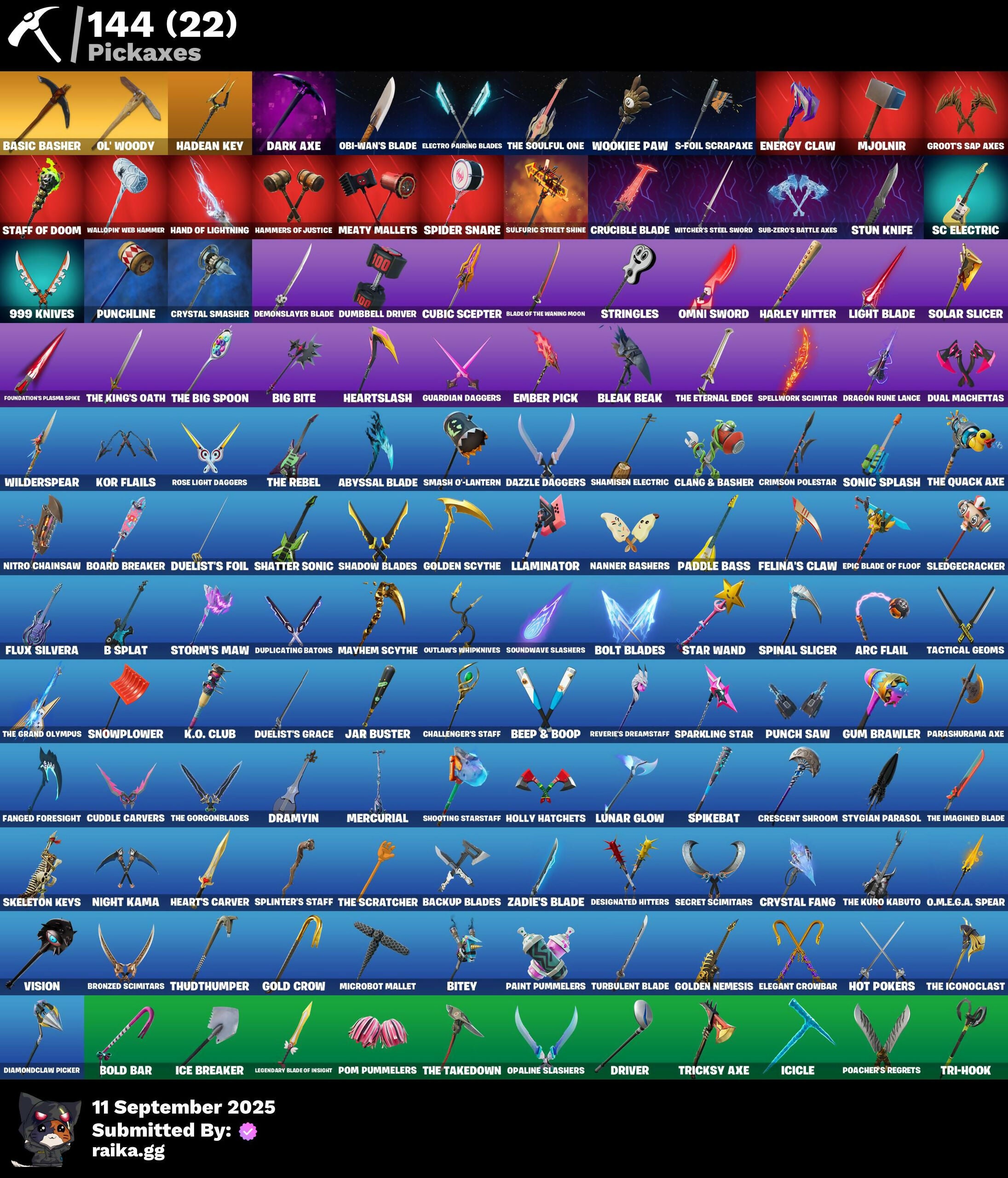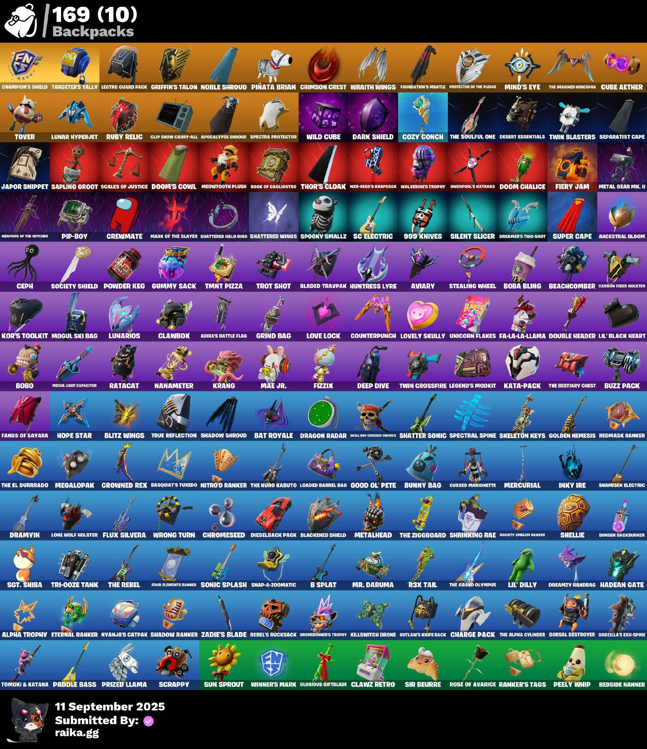 999 Knives, Absenz, Abyssal Blade, Adira's Battle Flag, Alpha Trophy, Ancestral Bloom, Andre, Apocalypse Shroud, Arc Flail, Arcane Energy Glider, Arctic Adeline, Articulated Blade Wing, Aviary, B Splat, Backup Blades, Balance Board, Baron's Hoard, Basic Basher, Basquiat's Tuxedo, Bat Royale, Beachcomber, Bear Hug, Bedside Nanner, Beep & Boop, Big Bite, Billy Bounce, Bitey, Black One X-Wing, Blackened Shield, Blade of the Waning Moon, Bladed Travpak, Bleak Beak, Blitz Wings, Blowin' Up, Board Breaker, Boba Bling, Boba Snack, Bobo, Bold Bar, Bolt Blades, Boogie Down, Book of Cagliostro, Bronzed Scimitars, Bubbloon, Bullet Rider, Bunny Bag, Bunsen Backburner, Buzz Pack, Cacodemon, Caged Swiftwing, Called Shot, Caper, Carbon Fiber Holster, Card Drop, Ceph, Chain Surfer, Challenger's Staff, Champion's Shield, Charge Pack, Charlotte, Chemist's Cloudglider, Chimichanga!, Choice Knit, Chrome Punk, Chromeseed, Clang & Basher, Clawbox, Clawz Retro, Cliffside Soarer, Clip Show Carry-All, Comfy Cats, Commander's Descent, Competitor's Skyblades, Competitor's Time Brella, Conjure Weapon, Contract Giller, Counterpunch, Cozy Commander, Cozy Conch, Crescent Shroom, Crewmate, Crimson Crest, Crimson Polestar, Crowned Rex, Crowning Achievement, Crucible Blade, Cryptic, Crystal Fang, Crystal Smasher, Cube Aether, Cubic Scepter, Cuddle Carvers, Curling Iron, Cursed Marionette, Cyclo Curl, Dagger Dance, Dark Axe, Dark Charger, Dark Jonesy, Dark Red Knight, Dark Shield, Dark Wild Card, Dazzle Daggers, Dealer's Deck, Death Star 'Brella, Deep Dive, Demonslayer Blade, Desert Essentials, Designated Hitters, Diamond Throne, Diamondclaw Picker, Dieselback Pack, Distraction Dance, Doctor Doom, Doctor Strange, Doom Brella, Doom Chalice, Doom Slayer, Doom's Cowl, Dorsal Destroyer, Double Header, Doze Dab, Dragacorn, Dragon Radar, Dragon Rider, Dragon Rune Lance, Dragonhearted 'Brella, Dramyin, Dreamer's Two-Shot, Dreamzv Handbag, Driver, Drome Drifter, Dromerunner's Trophy, Dual Machettas, Duelist's Foil, Duelist's Grace, Dumbbell Driver, Dummy, Dupli-Kate, Duplicating Batons, Duplikates, Dusk Knight, Dusty, Echo, Eclipse Brella, Electro Pairing Blades, Elegant Crowbar, Elite Servo, Ember Pick, Enchanted Lifebloom, Energy Claw, Epic Blade of Floof, Erisa, Eternal Ranker, Evie, Fa-La-La-Llama, Fabio Sparklemane, Face Palm, Fanged Foresight, Fangs of Sayara, Felina, Felina's Claw, Fiery Jam, Fist Bump, Fizzix, Flip Flyer, Flippin' Away, Flux Silvera, Fncs Champion Seeker, Foil Flex, Fortilla Flier, Foundation's Mantle, Foundation's Plasma Spike, Four Elements Banner, Frequency Flyer, Frostburn, Gathering Storm, Geralt Of Rivia, Get Griddy, Glorious Giftblade, Godzilla's Exo-Spine, Gold Crow, Golden Nemesis, Golden Scythe, Good Ol' Pete, Gothic Shadesoarer, Grand Glacier Glider, Griffin's Talon, Grind Bag, Groot, Groots Sap Axes, Guardian Daggers, Guff Gringle, Gum Brawler, Gumbo, Gummy Sack, Gunn-Brella, Gunnar, Gwenpool's Katanas, Hadean Chariot, Hadean Gate, Hadean Key, Hammers of Justice, Hand of Lightning, Hand-Forged, Har-Har-Har!, Harley Hitter, Harley Quinn, Harlowe, Have A Seat, Haven, Heart Sign, Heart's Carver, Heartslash, Heartwinder, Helsie, Heron Stance Hero, High Society Glider, High Society Ranker, Holiday Boxy, Holly Hatchets, Hope, Hope Star, Hopper, Hot Pokers, Huntress Lyre, Hype!, Hypnot-Eyes, I'm A Mystery, Ice Breaker, Icicle, Igni Sign, Infield Fly, Inflate-A-Roach, Inky Ire, Io Field Flyer, It Is Finished, It's... You?, Jabba Switchway, Japor Snippet, Jar Buster, Jellie, Jennifer Walters, Jet Signals, Joltara, Junker 'Brella, K.O. Club, K.O. Cruiser, Kata Tech Burstwing, Kata-Pack, Kiara K.O., Killswitch Drone, Klassic Kombat Crasher, Knife Sharpener, Kor, Kor Flails, Kor's Toolkit, Krang, Krisabelle, Laugh It Up, Lectro Guard Pack, Legend's Modkit, Legendary Blade of Insight, Light Blade, Lil' Black Heart, Lil' Dilly, Lil' Monster, Lil' Prancer, Llaminator, Loaded Barrel Bag, Lone Wolf Holster, Love It!, Love Lock, Lovely Skully, Lt. John Llama, Lunar Charge, Lunar Glow, Lunar Hyperjet, Lunar Party, Lunar Skyspan, Lunarios, Mae Jr., Make A Seat, Mandala Disc, Mandalorian, Manic, Mark of the Slayer, Mask of Balance, Massai, Mayhem Scythe, Meaty Mallets, Mecha Light Capacitor, Mecha Strike Commander, Megalopak, Meowtooth Plush, Mercurial, Metal Gear Mk. II, Metalhead, Microbot Mallet, Mighty Marvel 'Brella, Min-Joon, Mind's Eye, Mine, Mini Dogfight, Mini Slayer Fistbump, Mjolnir, Mjolnir's Path, Mobile Megalodon, Mogul Master, Mogul Ski Bag, Monarch, Montague, Moonbow Breezer, Moonglide, Mr. Daruma, Mwahaha, Myna, Nailed It, Nanameter, Nanner Bashers, Nezumi, Night Kama, Ninja Stance: Donnie, Ninja Stance: Leo, Ninja Stance: Mikey, Ninja Stance: Raph, Nisha, Nitro Chainsaw, Nitro D Ranker, Noble Shroud, Nyanja's Catpak, O.M.E.G.A. Spear, Obi-Wan Kenobi, Obi-Wan's Blade, Oblivion, Ol' Woody, Omni Sword, Oopsy Drones-V, Opaline Slashers, Oscar, Outlaw's Knife Rack, Outlaw's Whipknives, Paddle Bass, Padmé Amidala, Paint Pummelers, Parashurama Axe, Party Diva, Peely Whip, Perfect Pivot, Peter Griffin, Petercopter, Phaedra, Pip-Boy, Pirouette, Pit Faller, Piñata Brian, Poacher's Regrets, Point & Shoot, Poised Playmaker, Polar Peely, Pom Pummelers, Popular Vibe, Powder Keg, Prized Llama, Protector of the Pledge, Prowler, Punch Saw, Punchline, Punk Powerglider, Puppet's Prowl, R3X Tail, Rage Quit, Ranker's Tags, Ratacat, Ratacat Roamer, Raven's Legion, Razor Crest, Ready When You Are, Rebel Brella, Rebel's Rucksack, Recon Expert, Red Robin's Wings, Redmask Ranker, Remix 'Brella, Renee, Revenant Rider, Reverie, Reverie's Dreamstaff, Rezzblocks, Ronin, Root Wing, Rose Light Daggers, Rose of Avarice, Ruby Relic, S-Foil Scrapaxe, SC Electric, Sapling Groot, Sayara, Scales of Justice, Scarlet Longboard, Scootin', Scrappy, Scuba Crystal, Secret Scimitars, Segway Tour, Selene, Senate Repulsorpod, Sentinel, Separatist Cape, Serpentine Summoning, Seven Glider, Seven Signet, Sgt. Shiba, Shadow Blades, Shadow Ranke