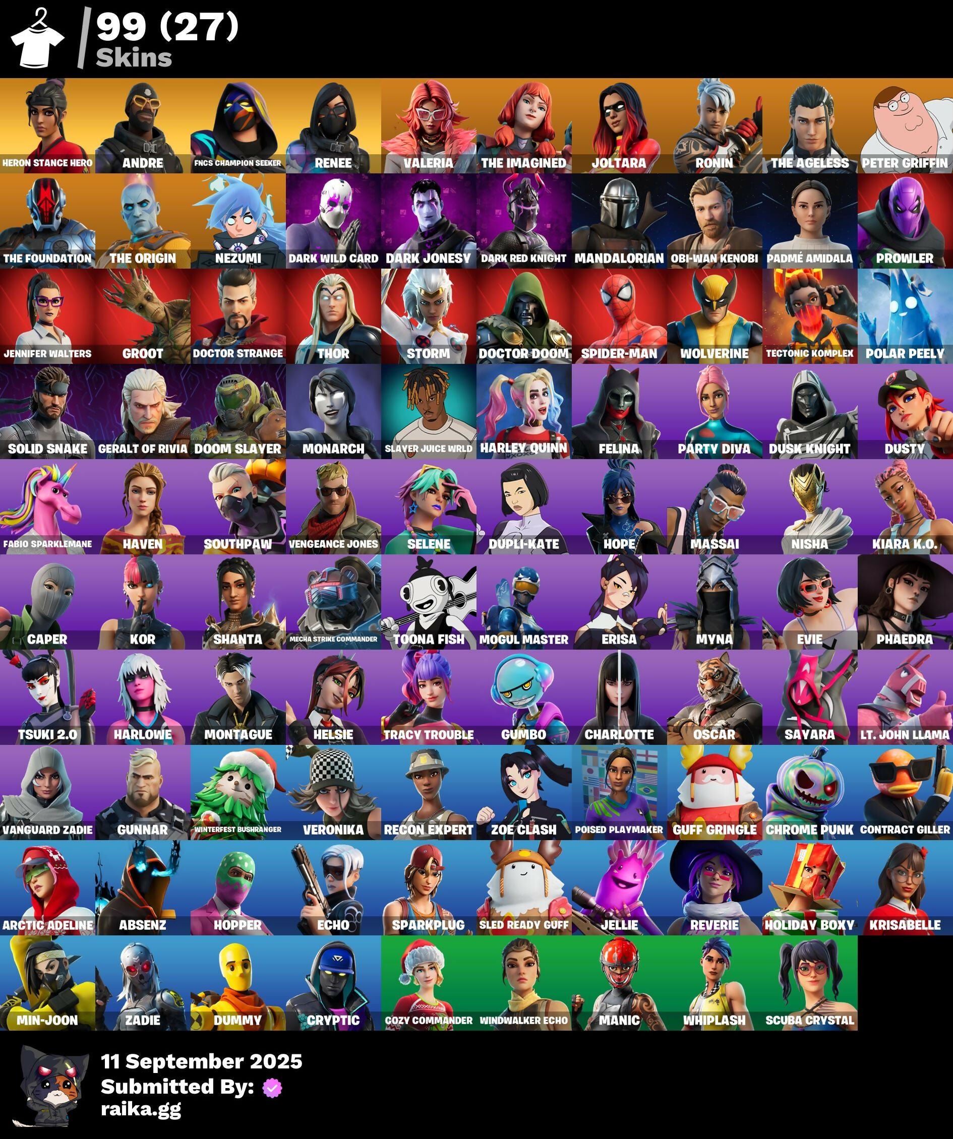 [PC/PSN/XBOX] 99 skins | Heron Stance Hero | Andre | FNCS Champion Seeker | Renee | Valeria | The Imagined | Joltara | Ronin | The Ageless | Peter Griffin | 350 VB