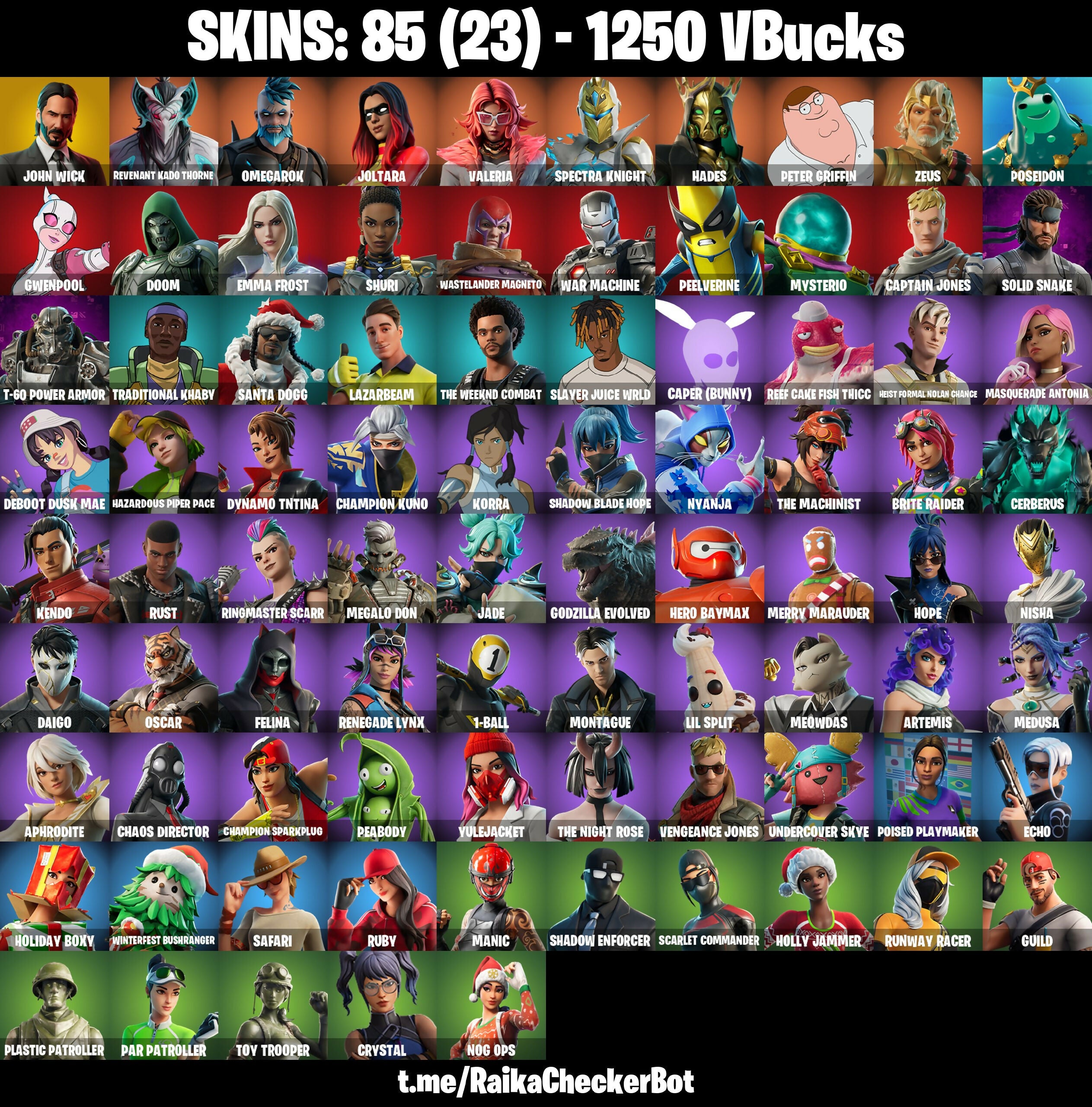 [PC/PSN/XBOX/NINTENDO/MOBILE] 85 SKINS | JOHN WICK | REVENANT KADO THORNE | OMEGAROK | JOLTARA | VALERIA | SPECTRA KNIGHT | HADES | PETER GRIFFIN | ZEUS | POSEIDON | GWENPOOL | DOOM | EMMA FROST | SHURI | WASTELANDER MAGNETO | WAR MACHINE | PEELVERINE | MYSTERIO | CAPTAIN JONES | SOLID SNAKE | T-60 POWER ARMOR | 1250 VBUCKS | FULL EMAIL ACCESS