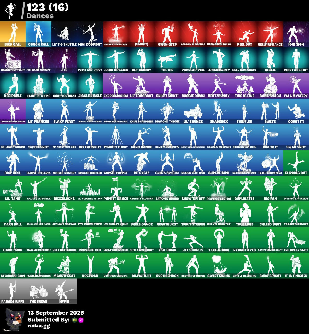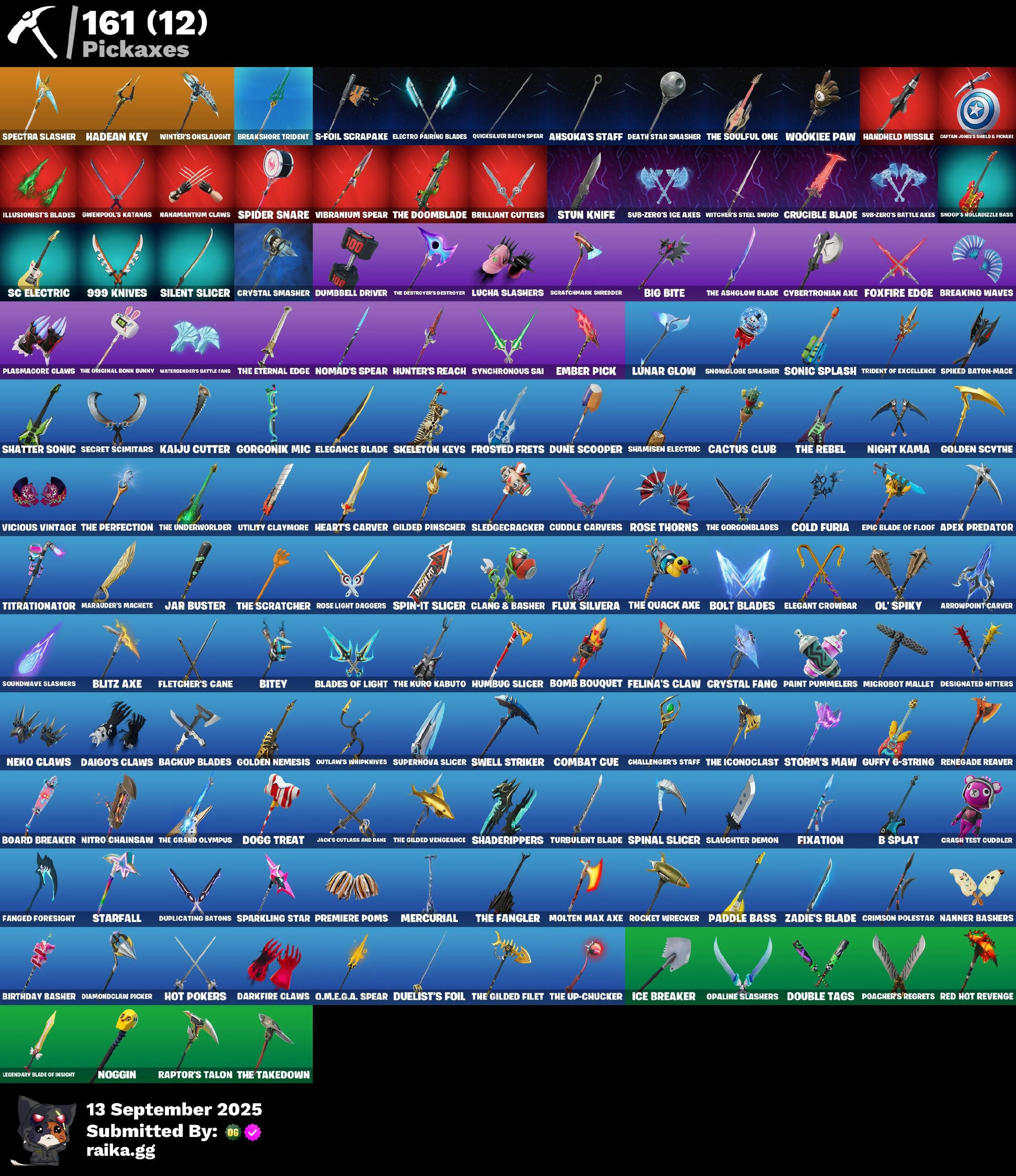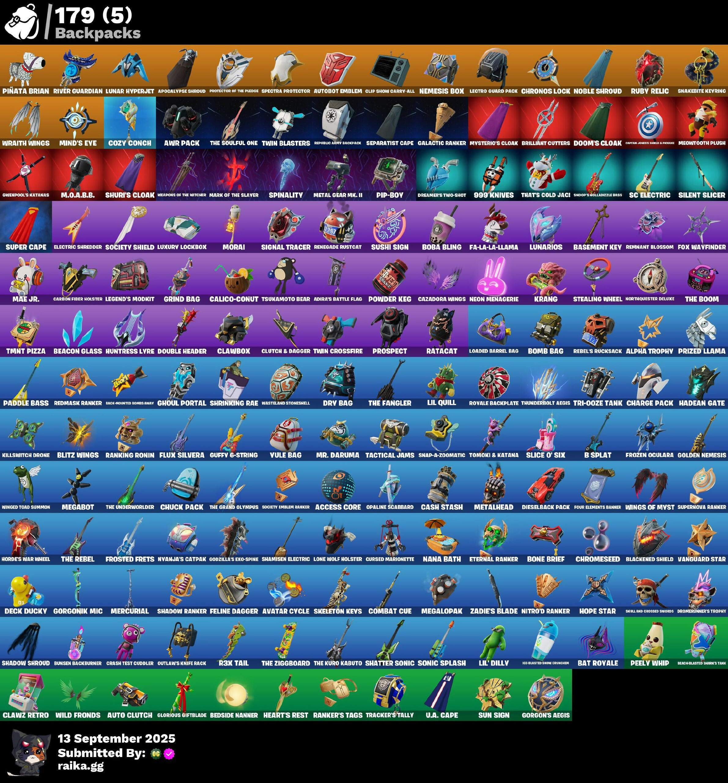 (Snikt!), 1-Ball, 999 Knives, AWR Pack, Access Core, Adira's Battle Flag, Aerial Assault Bomber, Ahsoka Tano, Ahsoka's Staff, Alpha Trophy, Antonia, Apex Predator, Aphrodite, Apocalypse Shroud, Arctic Adeline, Arrowpoint Carver, Artemis, Auto Clutch, Autobot Emblem, Avatar Cycle, Avatar's Flourish, B Splat, Back-Mounted Bombs Away, Backup Blades, Balance Board, Baron's Hoard, Basement Key, Bat Royale, Battle Blessing, Beachblasted Shark's Tank, Beacon Glass, Beatzbunny, Bedside Nanner, Big Bite, Big Dill, Big Fan, Billy's Tricycle, Bird Call, Birthday Basher, Bitev, Blackened Shield, Blades of Light, Blitz Axe, Blitz Wings, Board Breaker, Boba Bling, Boba Snack, Bolt Blades, Bomb Bag, Bomb Bouquet, Bone Brief, Boogie Down, Breaking Waves, Breakshore Trident, Brilliant Cutters, Bunsen Backburner, Burn Bright, Cactus Club, Calico-Conut, Called Shot, Captain Jones, Captain Jones's Shield & Pickaxe, Captain Jones's Shield & Pikeaxe, Captain LLamerica, Carbon Fiber Holster, Card Drop, Cash Stash, Cassidy Quinn, Cazadora Wings, Cerberus, Challenger's Staff, Chaos Director, Charge Pack, Chef's Special, Chrome Punk, Chromeseed, Chronos Lock, Chuck Pack, Clang & Basher, Clawbox, Clawz Retro, Clip Show Carry-All, Clutch & Dagger, Cold Furia, Combat Cue, Commando, Conch Call, Count It!, Cozy Conch, Crack It, Crash Test Cuddler, Crimson Polestar, Crowning Achievement, Crucible Blade, Crystal, Crystal Fang, Crystal Smasher, Cuddle Carvers, Curling Iron, Cursed Energy, Cursed Marionette, Cybertronian Axe, Daigo, Daigo's Claws, Dark Doggo, Darkfire Claws, Death Star Smasher, Deck Ducky, Designated Hitters, Desirable, Diamond Throne, Diamondclaw Picker, Dice Roll, Dieselback Pack, Dill With It, Do The Split, Dogg Treat, Doom, Doom Slayer, Doom's Cloak, Double Header, Double Tags, Doze Dab, Dramatic Flares, Dreamer's Two-Shot, Dromemurner's Trophy, Dry Bag, Duelist's Card Trick, Duelist's Foil, Dumbbell Driver, Dune Scooper, Dupli-Kate, Duplicates, Duplicating Batons, Dusk Knight, Dusty, Dynamo Tntina, Electric Shredder, Electro Pairing Blades, Elegance Blade, Elegant Crowbar, Ember Pick, Emma Frost, Empress Fan Dance, Epic Blade of Floof, Era, Eternal Ranker, Expressionism, Fa-La-La-Llama, Fang Dance, Fanged Foresight, Felina, Felina's Claw, Feline Dagger, Firebrand, Fireworks Salvo, Fish Thicc, Fist Bump, Fixation, Flaky Feast, Flashback Breakdown, Fletcher Kane, Fletcher's Cane, Flipping Out, Flux Silvera, Focus, Foil Flex, Four Elements Banner, Fox Wayfinder, Foxfire Edge, Frosted Frets, Frozen Oculiara, Frozen Treat Cart, GGWP, Galactic Ranker, Geralt Of Rivia, Get Griddy, Get Out Of Your Mind, Ghoul Portal, Gilded Pinscher, Glorious Giftblade, Godzilla Evolved, Godzilla's Exo-Spine, Golden Nemesis, Golden Scythe, Good Game, Well Played, Gorgon's Aegis, Gorgonik Mic, Grind Bag, Guffy 6-String, Gwen-Step, Gwenpool, Gwenpool's Katanas, Hadean Gate, Hadean Key, Hades, Handheld Missile, Heart Of A King, Heart's Rest, Heartburst, Hearts Carver, Hellfire Dance, Helsie, Hero Baymax, Highwire, Holiday Boxy, Hope, Hope Star, Horde's War Wheel, Hot Pokers, Humbug Slicer, Hunter's Reach, Huntress Lyre, Hype!, Hypnot Eyes, I Need You To Concentrate, I'm A Mystery, Ice Breaker, Ice-Blasted Snow Cruncher, Igni Sign, Illusionist's Blades, Imani, Invisible Cut, Iridia Vayne, It Is Finished, It's Chemistry!, Jack's Cutlass and Bane, Jackie, Jade, Jar Buster, Jet Signals, Jiggle Jiggle, Joss, Kado Thorne, Kaiju Cutter, Keisha Cross, Kendo, Khaby Lame, Killswitch Drone, Knife Sharpener, Korra, Krang, Lectro Guard Pack, Legend's Modkit, Legendary Blade of Insight, Lil Quill, Lil Split, Lil' Bounce, Lil' Dilly, Lil' Godzilla Attack, Lil' Longboat, Lil' Prancer, Lil' T-6 Shuttle, Lil' Tank, Loaded Barrel Bag, Lone Wolf Holster, Lorenzo, Lucha Slashers, Lucid Dreams, Lunar Glow, Lunar Hyperjet, Lunar Party, Lunarios, Luxury Lockbox, M.O.A.B.B., Mae, Mae Jr., Make A Seat, Marauder's Machete, Mariposa, Mark Of The Slayer, Massai, Medusa, Megabot, Megalopak, Meowdas, Meowtooth Plush, Mercurial, Metal Gear Mk. II, Metalhead, Microbot Mallet, Mind's Eye, Mini Dogfight, Mini Slayer Fistbump, Mizuki, Molten Max Axe, Montague, Moonlit Mystery, Morai, Mr. Daruma, Mysterio, Mysterio's Cloak, Mysterio's Magic Trick, Mystica, Nana Bath, Nanamatnium Claws, Nanner Bashers, Neko Claws, Nemesis Box, Neon Menagerie, Nezumi, Night Kama, Ninja Stance: Donnie, Ninja Stance: Leo, Ninja Stance: Mikey, Ninja Stance: Raph, Nisha, Nitro Chainsaw, Nitro D Ranker, Noble Shroud, Noggin, Nolan Chance, Nomad's Spear, Northquester Deluxe, Nyanja, Nyanja's Catpak, O.M.E.G.A. Spear, Ol' Spiky, Omegarok, Opaline Scabbard, Opaline Slashers, Optimus Prime, Origami Battalion, Oscar, Outlaw Midas, Outlaw's Knife Rack, Outlaw's Mugshot, Outlaw's Strut, Outlaw's WhipKnives, Paddle Bass, Paint Pummelers, Parade Riffs, Peel Out, Peelverine, Peely Whip, Peter Griffin, Pinata Brian, Pip-Boy, Piper Pace, Pitcycle, Plasmacore Claws, Poacher's Regrets, Point & Shoot, Point And Strut, Popular Vibe, Poseidon, Powder Keg, Premiere Poms, Prized Llama, Prospect, Protector Of The Pledge, Puppet Dance, Purr.Demonium, Purradise Meowscles, Quicksilver Baton Spear, R3X Tail, Ranker's Tags, Ranking Ronin, Raptor's Talon, Ratacat, Raven's Legion, Real Slim Shady, Rebel's Rucksack, Recon Raptor, Red Hot Revenge, Redmask Ranker, Relik, Remnant Blossom, Renegade Lynx, Renegade Reaver, Renegade Rebel, Renegade Rustcat, Renzo The Destroyer, Republic Army Backpack, Rezzblocks, Rhythm Of Chaos, Rian, River Guardian, Rocket Wrecker, Rollie, Rose Light Daggers, Rose Thorns, Royale Backplate, Ruby Relic, Runway Racer, S-Foil Scrapaxe, SC Electric, Santa Dogg, Scout Regiment Salute, Scratchmark Shredder, Secret Scimitars, Selene, Self Reflexing, Separatist Cape, Serpentine Summoning, Shadebox, Shaderippers, Shadow Blade Hope, Shadow Ops, Shadow Play: Toad, Shadow Ranker, Shadow Shroud, Shamisen Electric, Shamisen-Sational, Shatter Sonic, Show 'Em Off, Shrinking Rae, Shuri, Shuri's Cloak, Si