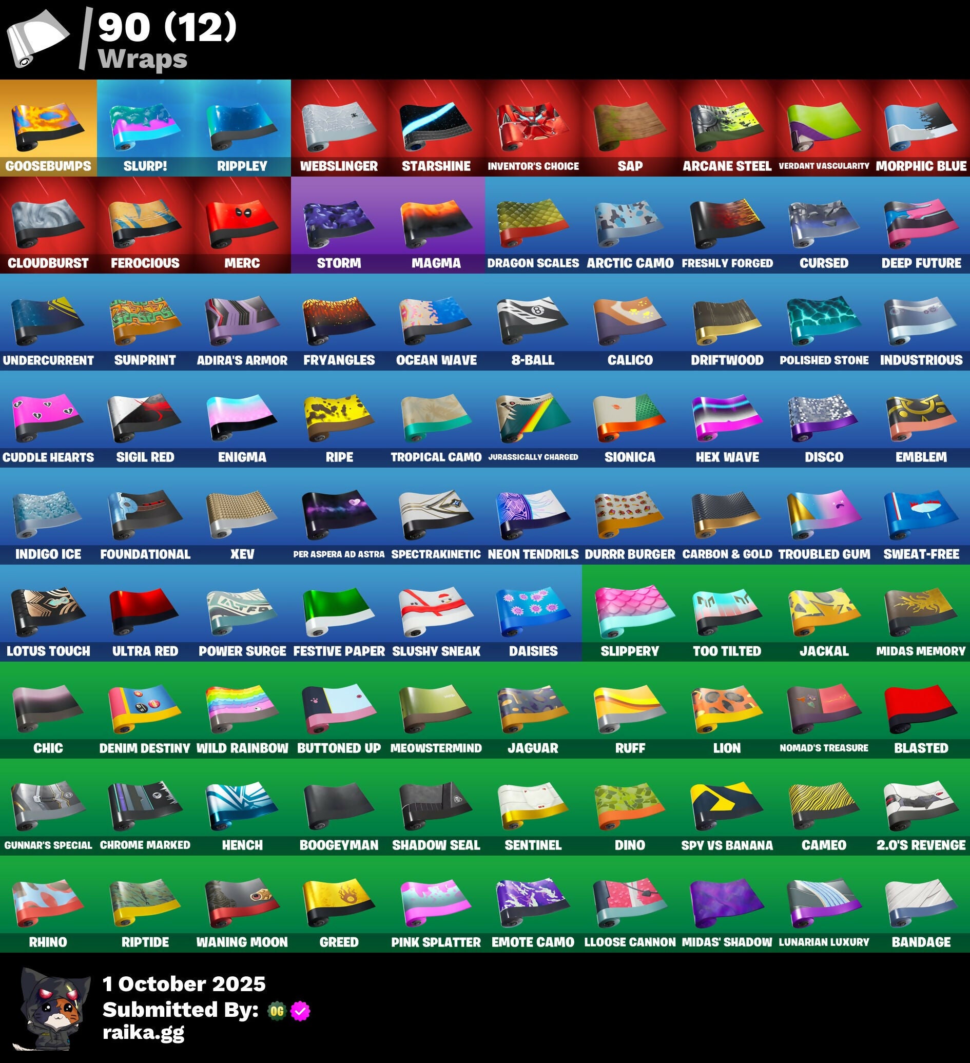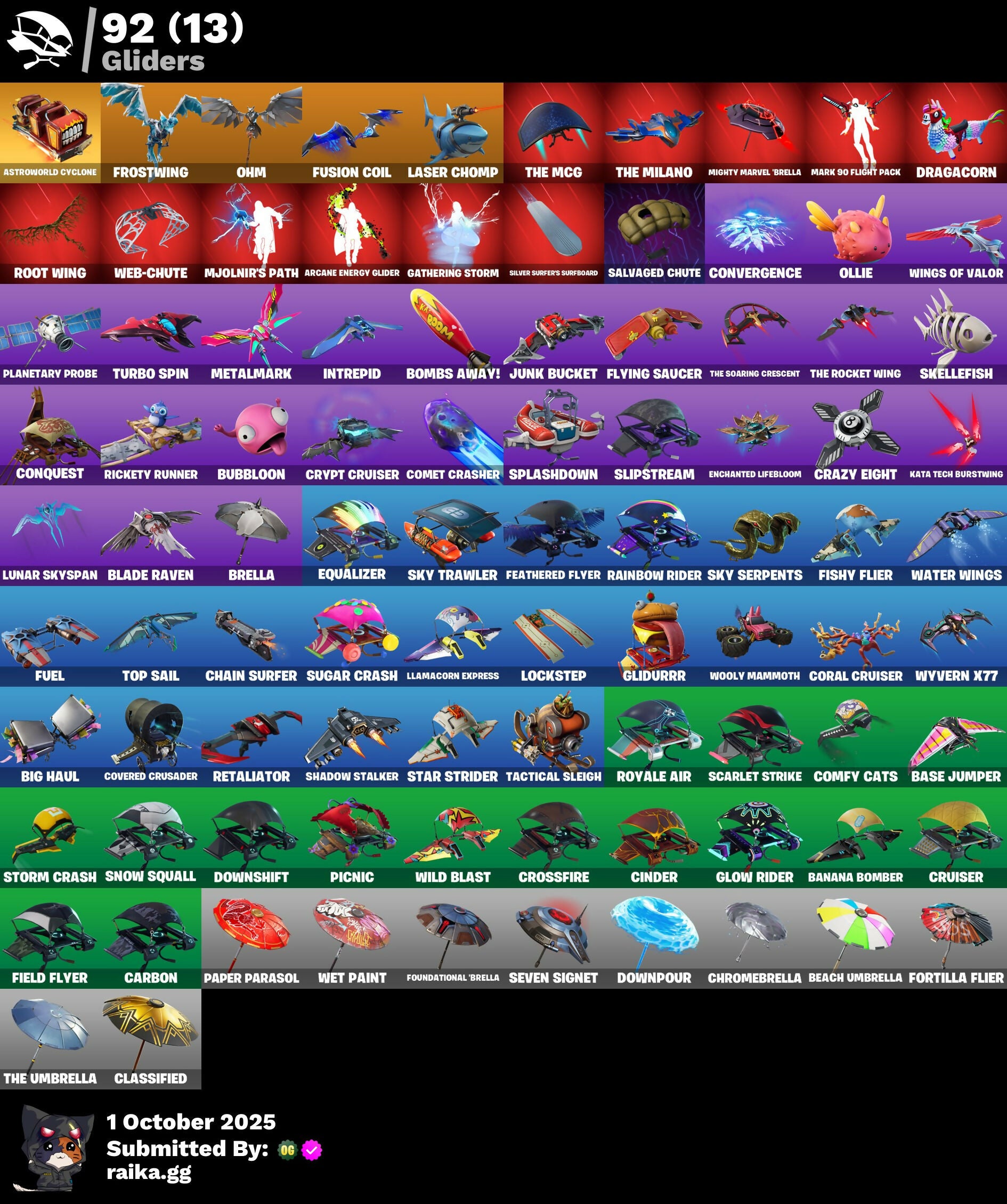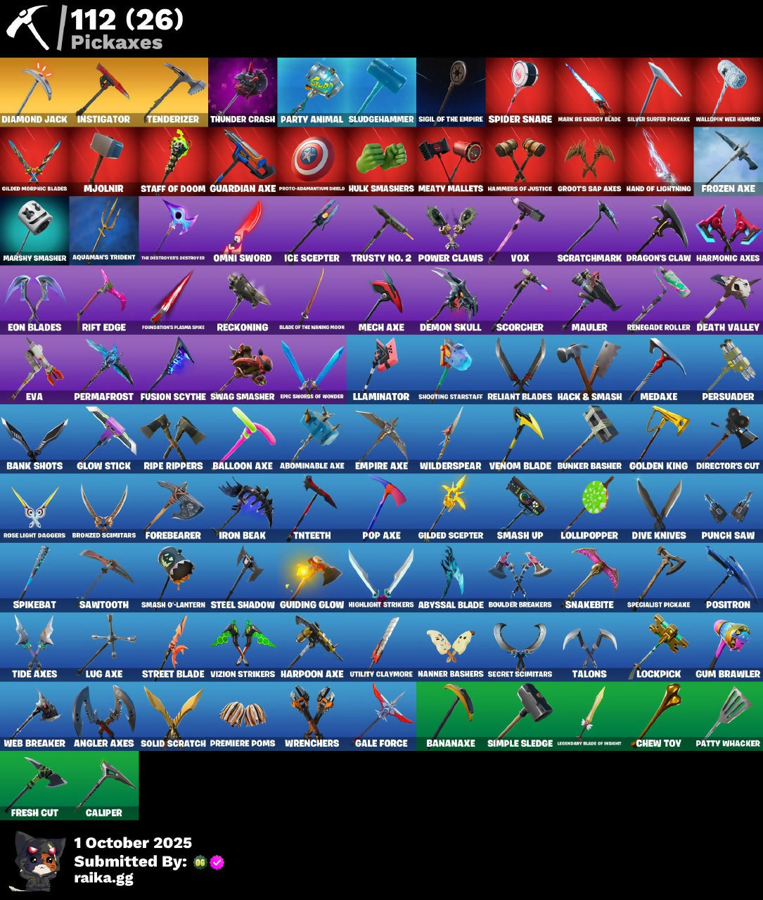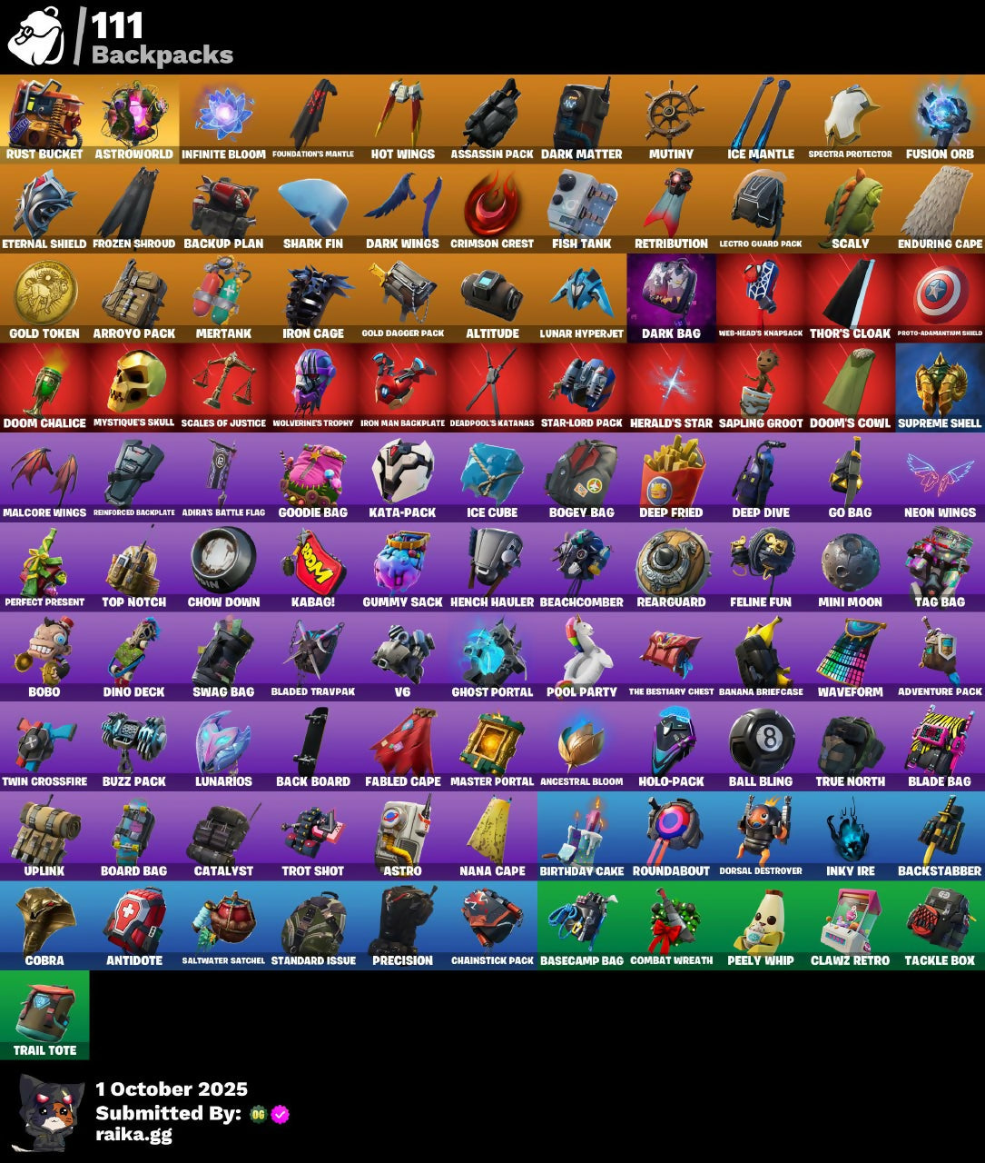 2.0's Revenge, 8-Ball, 8-Ball vs Scratch, Abominable Axe, Absenz, Abstrakt, Abyssal Blade, Adira's Armor, Adira's Battle Flag, Adventure Pack, Agent Peely, Air Shredder, Altitude, Ancestral Bloom, Angler Axes, Antidote, Aquaman, Aquaman's Trident, Arcane Energy Glider, Arcane Steel, Arctic Assassin, Arctic Camo, Arroyo Pack, Assassin Pack, Astro, Astro Antidote, Astro Jack, Astroworld, Astroworld Cyclone, Back Board, Backstabber, Backup Plan, Ball Bling, Baller, Balloon Axe, Banana Bomber, Banana Briefcase, Bananaxe, Bandage, Bank Shots, Base Jumper, Basecamp Bag, Battlehawk, Beach Umbrella, Beachcomber, Beastmode, Beef Boss, Beep Beep, Best Mates, Big Haul, Birthday Cake, Blackheart, Blade Bag, Blade Of The Waning Moon, Blade Raven, Bladed Travpak, Blasted, Board Bag, Bobo, Bogey Bag, Boing!, Bombs Away!, Boogeyman, Boogie Down, Boulder Breakers, Breakdown, Brella, Bring It, Bronzed Scimitars, Brush Your Shoulders, Bubbloon, Buckets, Bulletproof, Bunker Basher, Bunker Jonesy, Buttoned Up, Buzz Pack, Calamity, Calculated, Calico, Caliper, Call Me, Cameo, Cameo vs Chic, Captain America, Carbide, Carbon, Carbon & Gold, Cat Flip, Catalyst, Chain Surfer, Chainstick Pack, Chew Toy, Chic, Chimichanga!, Chomp Sr., Chow Down, Chrome Marked, Chromebrella, Cinder, Classified, Clawz Retro, Clean Sweep, Cloudburst, Cluck Strut, Clutch, Cobalt, Cobra, Coin Flip, Combat Wreath, Comet Crasher, Comfy Cats, Conga, Conquest, Contract Giller, Convergence, Coral Cruiser, Covered Crusader, Crazy Eight, Crimson Crest, Crossfire, Crowning Achievement, Cruiser, Crypt Cruiser, Cuddle Hearts, Cursed, Cyclo Curl, DJ Yonder, Dab, Daisies, Dark Bag, Dark Bomber, Dark Matter, Dark Voyager, Dark Wings, Deadpool, Deadpool's Katanas, Death Valley, Deep Dive, Deep Fried, Deep Future, Demi, Demon Skull, Denim Destiny, Diamond Jack, Diecast, Dino, Dino Deck, Director's Cut, Disco, Dive Knives, Doctor Doom, Doggo, Doom Chalice, Doom's Cowl, Dorsal Destroyer, Downpour, Downshift, Dragacorn, Dragon Scales, Dragon Stance, Dragon's Claw, Drift, Driftwood, Droop, Durrr Burger, Elite Agent, Emblem, Emote Camo, Empire Axe, Enchanted Lifebloom, Enduring Cape, Enigma, Eon Blades, Epic Swords Of Wonder, Equalizer, Eternal Knight, Eternal Shield, Eva, Fable, Fabled Cape, Fade, Feathered Flyer, Feline Fun, Ferocious, Festive Paper, Field Flyer, Finger Guns, Fish Tank, Fishstick, Fishy Flier, Flippin' Away, Flippin' Sexy, Flying Saucer, Forebearer, Fortilla Flier, Foundation's Mantle, Foundation's Plasma Spike, Foundational, Foundational 'Brella, Free Flow, Freestylin', Fresh Cut, Freshly Forged, Frostwing, Frozen Axe, Frozen Shroud, Fryangles, Fuel, Fusion, Fusion Coil, Fusion Orb, Fusion Scythe, Gale Force, Gathering Storm, Gear Specialist Maya, Gentleman's Dab, Get Funky, Ghost Portal, Giddy-Up, Gilded Morphic Blades, Gilded Scepter, Glidurrr, Glow Rider, Glow Stick, Go Bag, Gold Brutus, Gold Dagger Pack, Gold Meowscles, Gold Midas, Gold Token, Golden King, Golf Clap, Goodie Bag, Goosebumps, Grand Salute, Greed, Grind, Groot, Groot's Sap Axes, Groove Jam, Guardian Axe, Guiding Glow, Gum Brawler, Gumbo, Gummy Sack, Gun Show, Gunnar, Gunnar's Special, Hack & Smash, Hammers Of Justice, Hand Of Lightning, Harlowe, Harmonic Axes, Harpoon Axe, Have A Seat, Haven, Havoc, Heart Sign, Hello Friend, Hench, Hench Hauler, Herald's Star, Hex Wave, High Five, Highlight Strikers, Holo-Pack, Hot Wings, Hula Hoopin', Hulk Smashers, Huntress, Hybrid, Hype, I Declare!, Ice Cube, Ice Mantle, Ice Scepter, Imperial March, Indigo Ice, Industrious, Infinite Bloom, Inky Ire, Instigator, Intrepid, Inventor's Choice, Iris, Iron Beak, Iron Cage, Iron Man Backplate, It Is Finished, It's Go Time!, It's... You?, Jackal, Jaguar, Jennifer Walters, Job Well Done, John Wick, Journey vs Hazard, Jubilation, Jules, Jump Jets, Junk Bucket, Jurassically Charged, Kabag!, Kata Tech Burstwing, Kata-Pack, Keep It Mello, Keyed Up, Kit, Laid Back Shuffle, Laser Chomp, Lectro Guard Pack, Legendary Blade Of Insight, Leviathan, Lil' Monster, Lion, Liteshow, Llama Bell, Llamacorn Express, Llaminator, Lloose Cannon, Lockpick, Lockstep, Lollipopper, Lotus Touch, Love It!, Lt. John Llama, Lug Axe, Lunar Charge, Lunar Hyperjet, Lunar Skyspan, Lunarian Luxury, Lunarios, Lynx, Magma, Magnus, Make A Seat, Malcore, Malcore Wings, Mark 85 Energy Blade, Mark 90 Flight Pack, Marshy Smasher, Master Portal, Mauler, Meaty Mallets, Mech Axe, Medaxe, Meowstermind, Merc, Mertank, Metalmarnk, Mic Drop, Midas Memory, Midas' Shadow, Mighty Marvel 'Brella, Mini Moon, Mission Specialist, Mjolnir, Mjolnir's Path, Moisty Merman, Moonwalker, Morphic Blue, Mutiny, Mwahaha, Mystique, Mystique's Skull, Nana Cape, Nana Nana, Nanner Bashers, Neon Tendrils, Neon Wings, Never Gonna, Nomad's Treasure, Ocean, Ocean Wave, Ohm, Ollie, Omega, Omni Sword, Onesie, Orange Justice, Pandemonium, Paper Parasol, Party Animal, Patty Whacker, Paws & Claws, Peace Out, Peely, Peely Whip, Per Aspera Ad Astra, Perfect Present, Permafrost, Persuader, Picnic, Pink Splatter, Planetary Probe, Planetary Vibe, Point It Out, Polished Stone, Pool Party, Pop Axe, Popcorn, Positron, Powder, Power Claws, Power Surge, Precision, Premiere Poms, Proto-Adamantium Shield, Punch Saw, Rage, Rage Quit, Ragnarok, Rainbow Rider, Ravage, Raven, Rawr, Reanimated, Rearguard, Reckoning, Red Card, Redline, Regal Wave, Reinforced Backplate, Reliant Blades, Remedy vs Toxin, Renegade Roller, Respect, Respect The Peace, Retaliator, Retribution, Revolt, Rex, Rhino, Rickety Runner, Rift Edge, Ripe, Ripe Rippers, Rippley, Rippley vs Sludge, Riptide, Rocket Rodeo, Rogue Agent, Ronin, Rook, Root Wing, Rose Light Daggers, Roundabout, Rox, Royale Air, Ruff, Running Man, Rust Bucket, Rust Lord, Sad Trombone, Saltwater Satchel, Salute, Salvaged Chute, Sap, Sapling Groot, Sawtooth, Scales Of Justice, Scaly, Scarlet Strike, Scimitar, Scootin', Scorcher, Scratchmark, Scuba Jonesy, Secret Scimitars, Seeker, Sentinel, Seven Signet, Sgt. Winter, Shadow Seal, Shadow Spar, Shad
