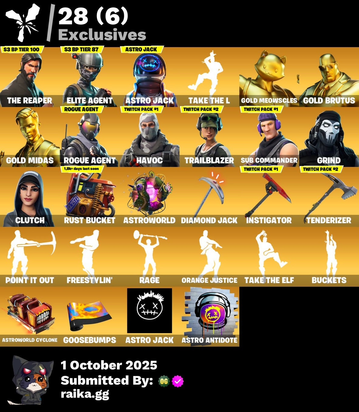 [PC/PSN/XBOX/NITTENDO] 127 skins | The Reaper | Elite Agent | Astro Jack | Gold Meowscles | Gold Brutus | Gold Midas | Rogue Agent | Havoc | Trailblazer | 300 VB
