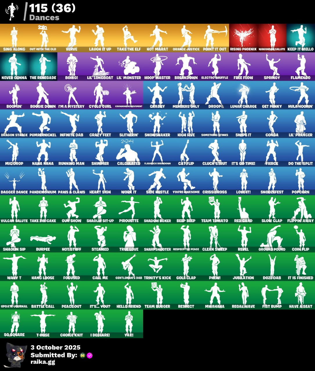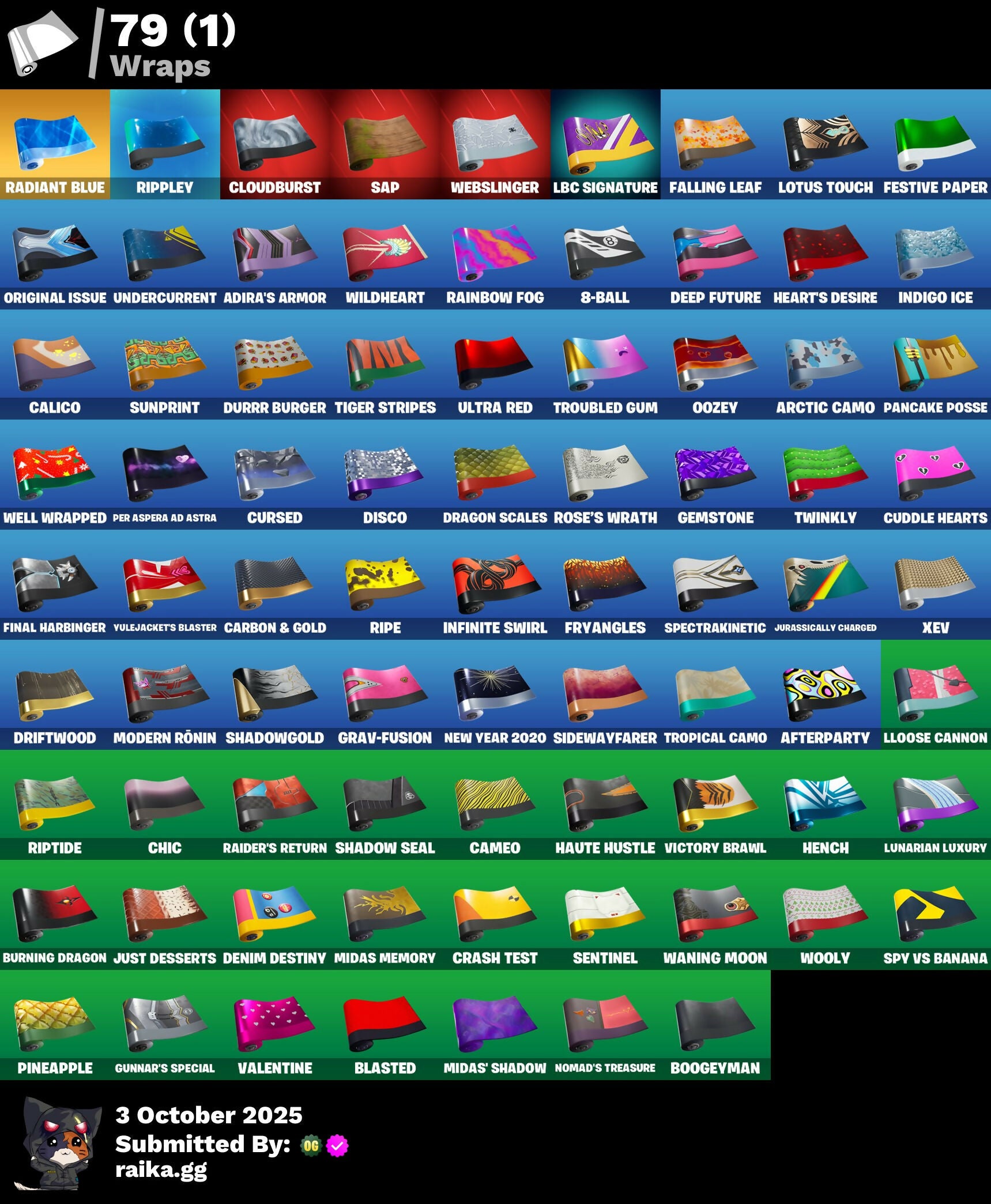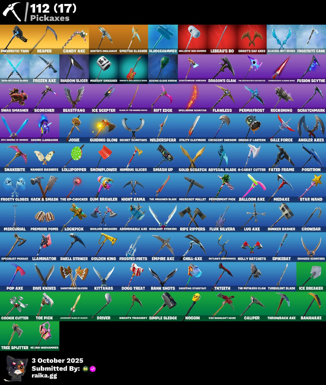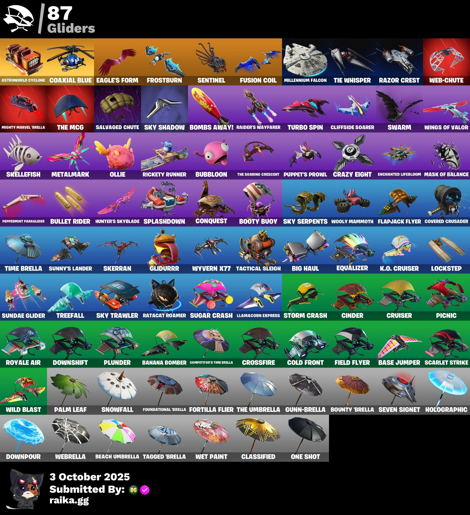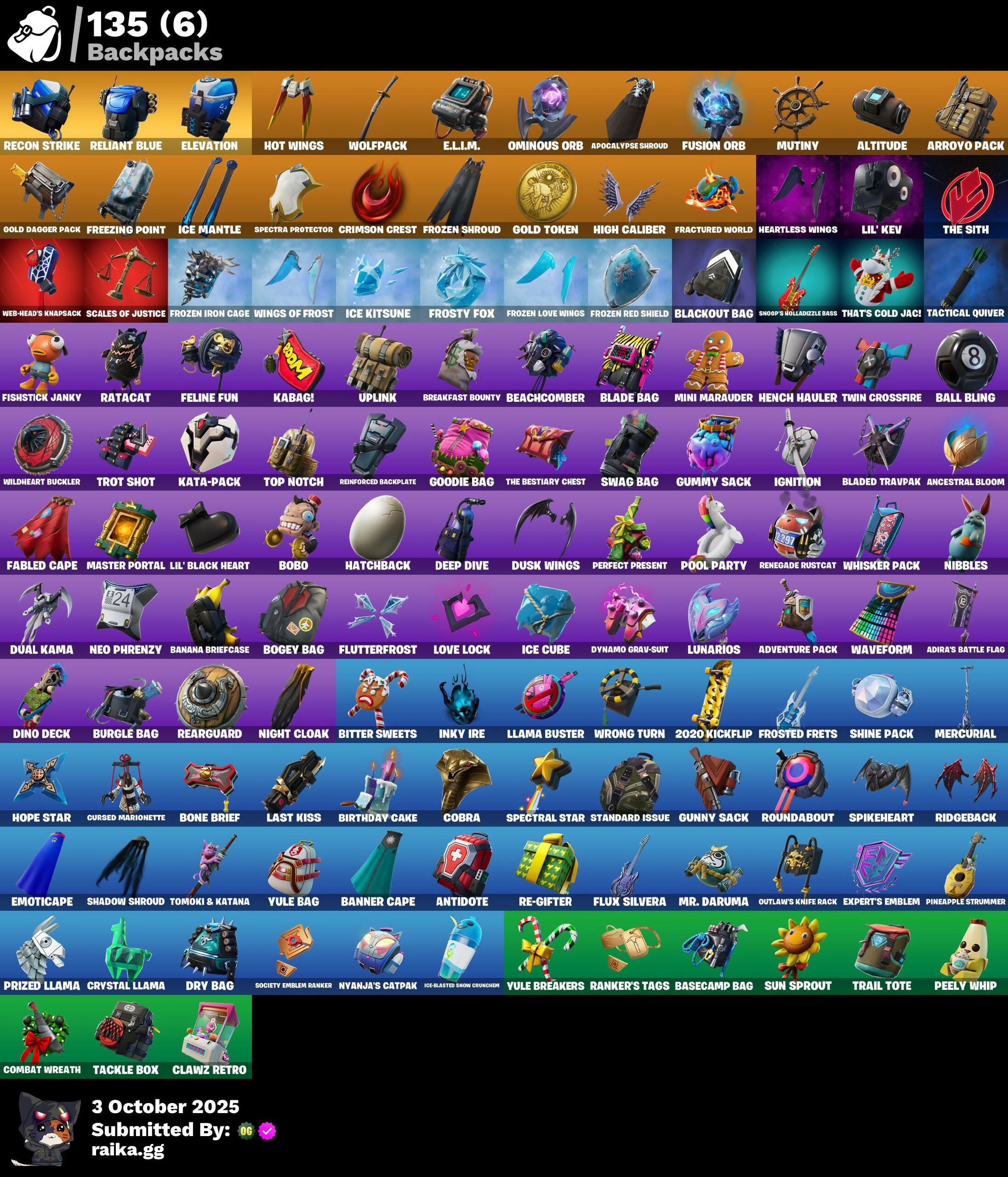 2020 Kickflip, 6-Carat Cutter, 8-Ball, 8-Ball Vs Scratch, A.I.M., Abominable Axe, AbseNz, Abyssal Blade, Adira's Armor, Adira's Battle Flag, Adventure Pack, Afterparty, Agent Peely, Altitude, Ancestral Bloom, Angler Axes, Antidote, Apocalypse Shroud, Arctic Assassin, Arctic Camo, Arroyo Pack, Aspen, Assault Trooper, Astroworld Cyclone, Aura, Ball Bling, Balloon Axe, Banana Bomber, Banana Briefcase, Bananaxe, Bank Shots, Banner Cape, Base Jumper, Basecamp Bag, Battle Call, Battlehawk, Beach Umbrella, Beachcomber, Beastfang, Beep Beep, Big Haul, Birthday Cake, Bitter Sweets, Blackheart, Blackout Bag, Blade Bag, Blade of the Waning Moon, Bladed Travpak, Blasted, Blizzabelle, Bobo, Bogey Bag, Boing!, Bombs Away!, Bone Brief, Boogeyman, Boogie Down, Boomin', Booty Buoy, Boulder Breakers, Bounty 'Brella, Boxing Glove Arrow, Breakdown, Breakfast Bounty, Brite Bomber, Bronzed Scimitars, Brrr-Witching Blades, Brutus, Bubbloon, Bullet Rider, Bullseye, Bunker Basher, Bunker Jonesy, Burgle Bag, Burning Dragon, Burpee, Calamity, Calculated, Calico, Caliper, Call Me, Cameo, Cameo Vs Chic, Candy Axe, Carbide, Carbon & Gold, Cat Flip, Celeste, Chic, Chill-Axe, Choice Knit, Cinder, Classified, Clawz Retro, Clean Sweep, Cliffside Soarer, Cloud Striker, Cloudburst, Cluck Strut, Coaxial Blue, Cobalt, Cobra, Coin Flip, Cold Front, Combat Wreath, Commando, Competitor's Time Brella, Conga, Conquest, Cookie Cutter, Cosmic Llamacorn, Covered Crusader, Crabby, Crash Test, Crazy Eight, Crazy Feet, Crescent Shroom, Crimson Crest, Criss Cross, Crossfire, Crowbar, Crowning Achievement, Cruiser, Crystal Llama, Cuddle Hearts, Cursed, Cursed Marionette, Cyclo Curl, Dagger Dance, Dark Doggo, Darkheart, Deadpool, Deep Dive, Deep Future, Denim Destiny, Diamond Diva, Dino Deck, Dire, Disco, Dive Knives, Dj Yonder, Do The 'Split, Dogg Treat, Downpour, Downshift, Doze Dab, Dragon Scales, Dragon Stance, Dragon's Claw, Drift, Driftwood, Driver, Droop, Dry Bag, Dual Kama, Dummy, Durr Burger, Dusk, Dusk Wings, Dynamo, Dynamo Grav-Suit, E.L.I.M., Eagle's Form, Electro Shuffle, Elevation, Ember, Emoticae, Empire Axe, Enchanted Lifebloom, Epic Swords of Wonder, Equalizer, Expert's Emblem, Fable, Fabled Cape, Falling Leaf, Fate, Fated Frame, Feline Fun, Festive Paper, Field Flyer, Fierce, Final Harbinger, Fishstick Janky, Fist Bump, Flamenco, Flapjack Flyer, Flapjackie, Flashback Breakdown, Flawless, Flippin' Away, Flutterfrost, Flux Silvera, Focused, Fortilla Flier, Foundation's Plasma Spike, Foundational 'Brella, Fractured World, Free Flow, Freezing Point, Frost Broker, Frostbite, Frostbite Cane, Frostburn, Frosted Frets, Frosty Fox, Frosty Globes, Frozen Axe, Frozen Iron Cage, Frozen Love Wings, Frozen Loveranger, Frozen Raven, Frozen Red Knight, Frozen Red Shield, Frozen Shroud, Fryangles, Fusion, Fusion Coil, Fusion Orb, Fusion Scythe, Galaxia, Gale Force, Gear Specialist Maya, Gemstone, Gentleman's Dab, Get Funky, Giddy-Up, Gingerbread Raider, Glacial Rift Edges, Glidurrr, Gold Dagger Pack, Gold Token, Golden King, Golf Clap, Goodie Bag, Grav-Fusion, Green Arrow, Groot's Sap Axes, Ground Pound, Guiding Glow, Gum Brawler, Gumbo, Gummy Sack, Gun Show, Gunn-Brella, Gunnar's Special, Gunny Sack, Hack & Smash, Hang Loose, Harlowe, Hatchback, Haute Hustle, Have A Seat, Haven, Haze, Heart Sign, Heart's Desire, Heartless Wings, Hello Friend, Hench, Hench Hauler, High Caliber, High Five, Highlight Strikers, Holly Hatchets, Holographic, Hoop Master, Hope, Hope Star, Hot Marat, Hot Stuff, Hot Wings, Hula Hoopin', Humbug Slicer, Hunter's Skyblade, Huntress, Hybrid, I Declare!, I'm A Mystery, Ice Breaker, Ice Cube, Ice Kitsune, Ice Mantle, Ice Scepter, Ice-Blasted Snow Cruncher, Ignition, Indigo Ice, Infinite Dab, Infinite Swirl, Inky Ire, Iris, It Is Finished, It's Go Time!, It's... You?, Joltara, Josie, Journey Vs Hazard, Jubilation, Jurassically Charged, Just Desserts, K.O. Cruiser, Kabag!, Kata-Pack, Keep It Mello, Kittanas, Knights Treachery, Krisabelle, Kuno, LBC Signature, Laguna, Last Kiss, Laugh It Up, Lebeau's Bo, Legendary Blade of Insight, Lil Split, Lil' Black Heart, Lil' Kev, Lil' Longboat, Lil' Monster, Lil' Prancer, Liteshow, Llama Buster, Llaminator, Lllamacorn Express, Lloose Cannon, Lockpick, Lockstep, Lollipopper, Lotus Touch, Love It!, Love Lock, Lt. Evergreen, Lt. John Llama, Lug Axe, Lunar Charge, Lunarian Luxury, Lunarios, Luxe, Lynx, Mancake, Mandalorian, Manic, Marshy Smasher, Mask Of Balance, Master Key, Master Portal, Mave, Medaxe, Melody Maverick, Members Only, Meowscles, Mercurial, Merry Marauder, Metalmark, Mic Drop, Microbot Mallet, Midas, Midas Memory, Midas' Shadow, Mighty Marvel 'Brella, Millennium Falcon, Mina Park, Mini Marauder, Modern Rōnin, Mr. Daruma, Mutiny, Mwahaha, Nana Nana, Nanner Bashers, Nejari Warhammer, Neo Phrenzy, Neo Versa, Never Gonna, New Year 2020, Nibbles, Night Cloak, Night Kama, Nightshade, Nog Ops, Noggin, Nomad's Treasure, Nyanja's Catpak, Ollie, Omegarok, Ominous Orb, One Shot, Onesie, Oozey, Orange Justice, Original Issue, Out With The Old, Outlaw's Knife Rack, Outlaw's Whipknives, Palm Leaf, Pancake Posse, Pandemonium, Paws & Claws, Peace Out, Peely, Peely Whip, Peppermint Paraglider, Peppermint Pick, Per Aspera Ad Astra, Perfect Present, Permafrost, Phew!, Picnic, Pineapple, Pineapple Strummer, Pirouette, Pj Patroller, Plunder, Pneumatic Twin, Point It Out, Point Patroller, Poised Playmaker, Polar Peely, Pool Party, Pop Axe, Popcorn, Positron, Powder, Premiere Poms, Prized Llama, Pumpernickel, Puppet's Prowl, Radiant Blue, Ragnarok, Raider's Return, Raider's Wayfarer, Rainbow Fog, Ranker's Tags, Rapscallion, Ratacat, Ratacat Roamer, Razor Crest, Re-Gifter, Reaper, Rearguard, Reckoning, Recon Expert, Recon Strike, Red Card, Redline, Reese, Regal Wave, Reinforced Backplate, Reliant Blue, Remedy Vs Toxin, Renegade Lynx, Renegade Rustcat, Respect, Respect The Peace, Revel, Rickety Runner, Ridgeback, Rift Edge, Ripe, Ripe Rippers, Rippley, Rippley Vs Sludge, Riptide, Rising Phoeni