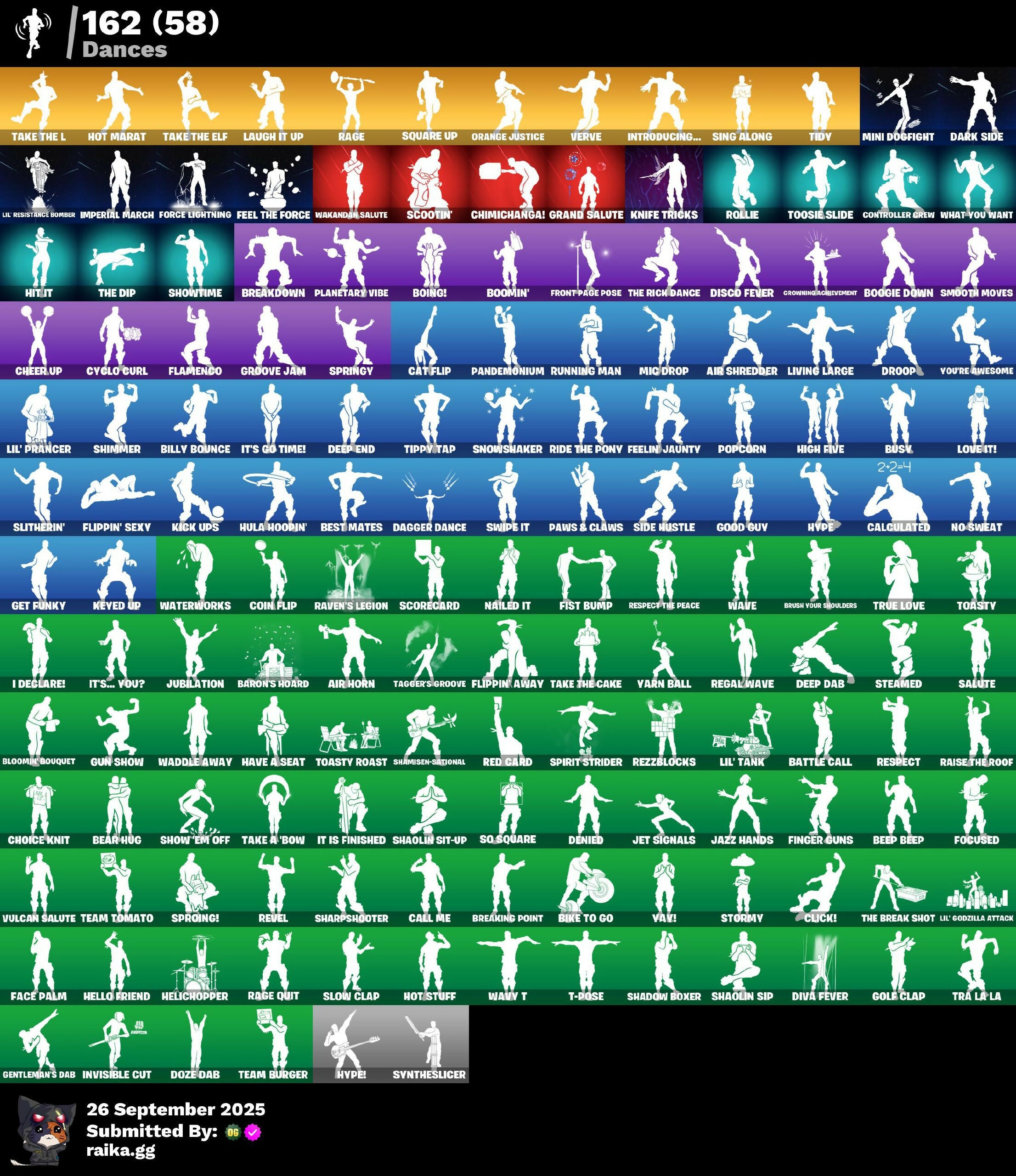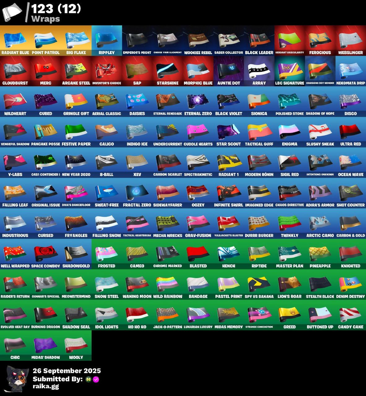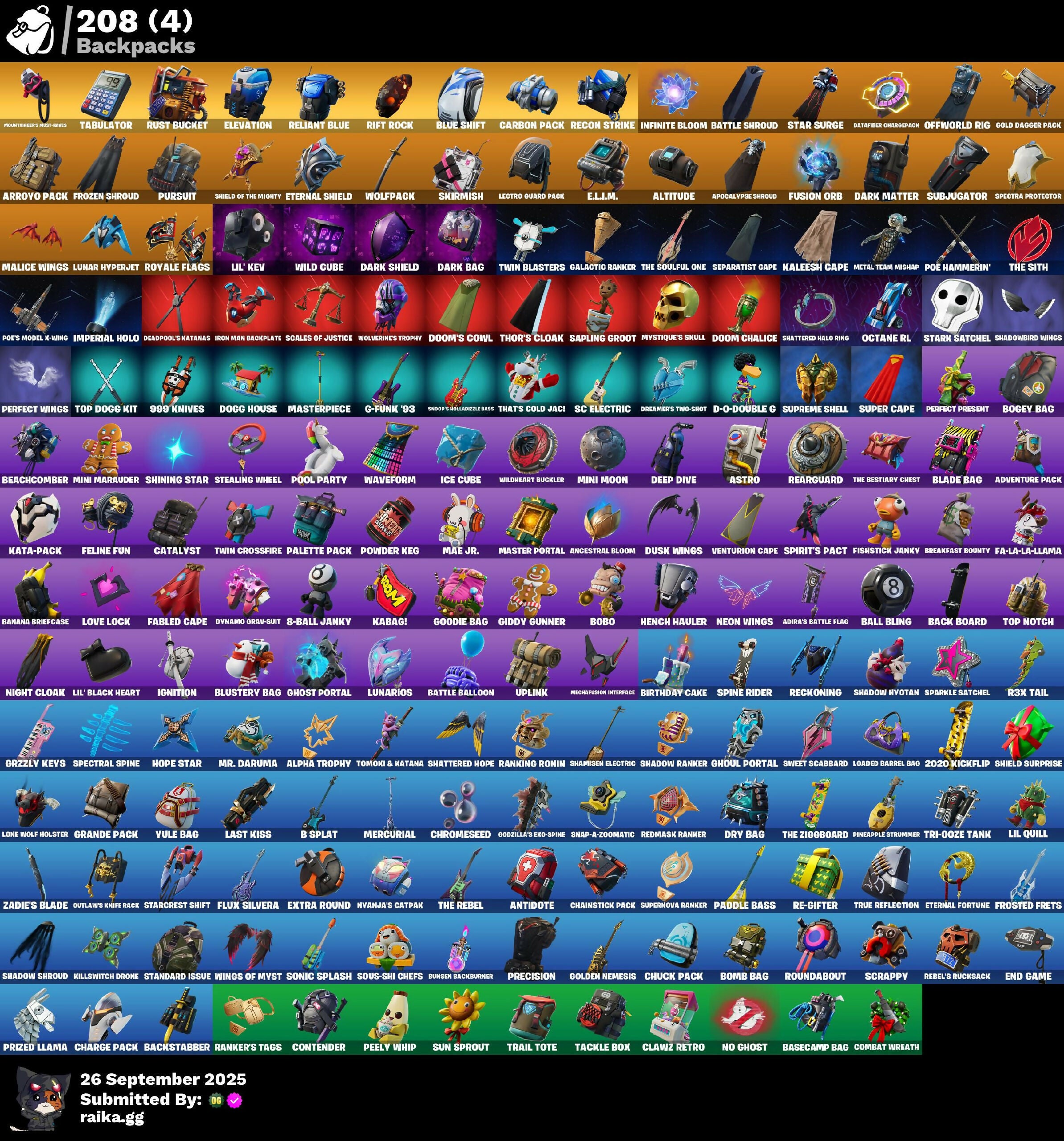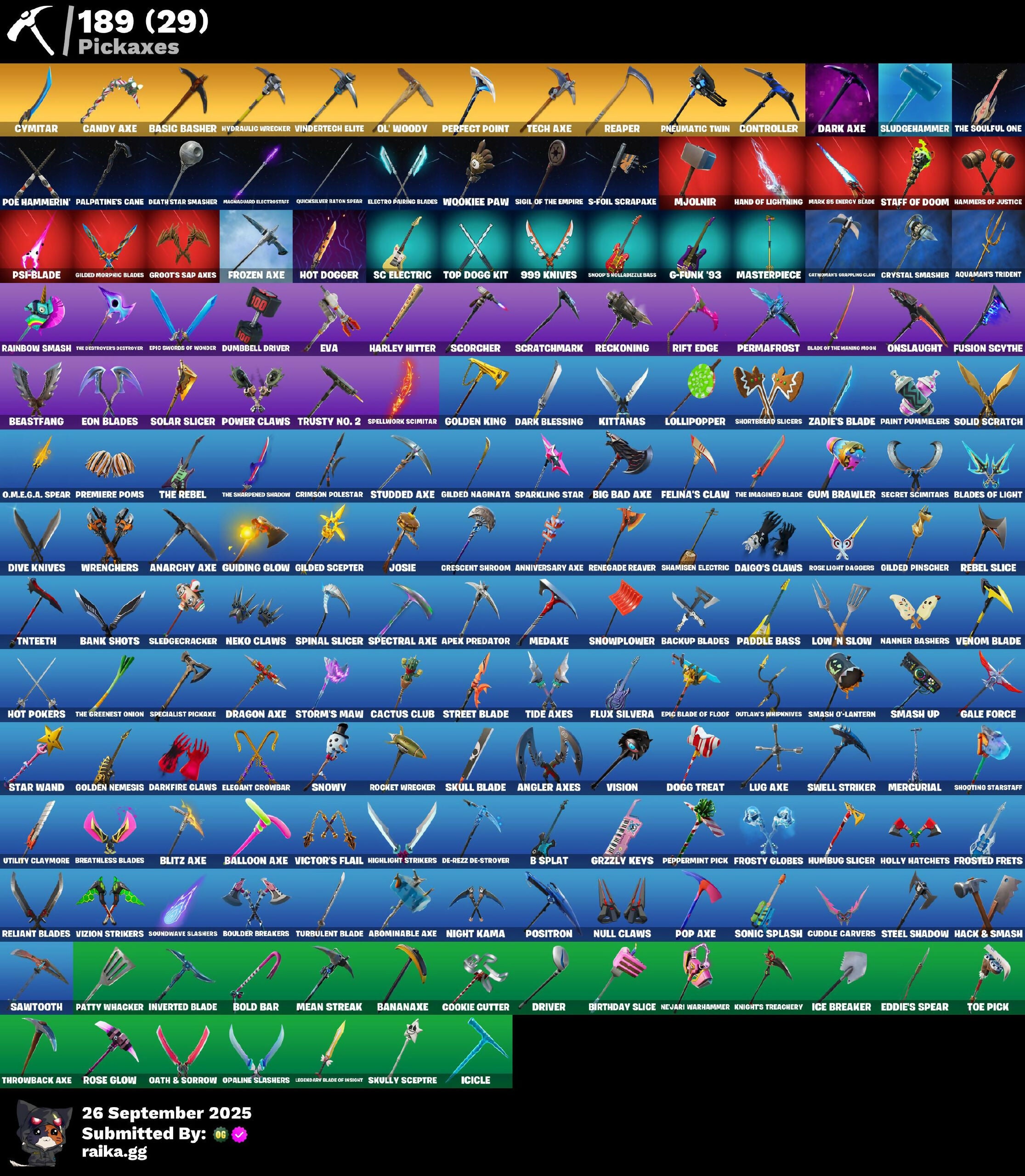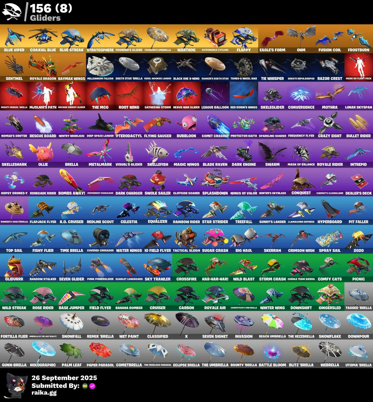 2020, 2020 Kickflip, 8-Ball, 8-Ball Janky, 8-Ball Vs Scratch, 999 Knives, A.I.M., Abominable Axe, Adira's Armor, Adira's Battle Flag, Adventure Pack, Aerial Assault Bomber, Aerial Classic, Agent Peely, Air Horn, Air Shredder, Alpha Trophy, Altitude, Anarchy Axe, Ancestral Bloom, Andy Fangerson, Angler Axes, Anniversary Axe, Antidote, Apex Predator, Apocalypse Shroud, Apprentice Evie, Aquaman, Aquaman's Trident, Arcane Energy Glider, Arcane Steel, Arctic Adeline, Arctic Camo, Array, Arroyo Pack, Astra, Astro, Astro Antidote, Astro Jack, Astroworld Cyclone, Auntie Dot, B Splat, Back Board, Backstabber, Backup Blades, Ball Bling, Balloon Axe, Banana Bomber, Banana Briefcase, Bananaxe, Bandage, Bank Shots, Baron's Hoard, Base Jumper, Basecamp Bag, Basic Basher, Battle Balloon, Battle Bloom, Battle Bus, Battle Call, Battle Shroud, Battlehawk, Baymax Wings, Beach Umbrella, Beachcomber, Bear Hug, Beastfang, Beep Beep, Best Mates, Big Bad Axe, Big Flake, Big Haul, Bike To Go, Billy Bounce, Birthday Cake, Birthday Slice, Black Leader, Black One X-Wing, Black Violet, Blade Bag, Blade Of The Waning Moon, Blade Raven, Blades Of Light, Blasted, Blitz 'Brella, Blitz Axe, Blizzabelle, Blizzard Bomber, Bloomin' Bouquet, Blue Shift, Blue Streak, Blue Striker, Blue Team Leader, Blue Viper, Blustery Bag, Bobo, Bogey Bag, Boing!, Bold Bar, Bomb Bag, Bombs Away!, Bonejamin, Bones, Boogie Down, Boomin', Boulder Breakers, Bounty 'Brella, Brawler, Breakdown, Breakfast Bounty, Breaking Point, Breathless Blades, Brella, Brush Your Shoulders, Bubbloon, Bullet Rider, Bunsen Backburner, Burning Dragon, Burnoff, Busy, Buttoned Up, C4S1 Contender I, Cactus Club, Calamity, Calculated, Calico, Call Me, Cameo, Cameo Vs Chic, Candy Axe, Candy Cane, Carbide, Carbon, Carbon & Gold, Carbon Commando, Carbon Pack, Carbon Scarlet, Cassidy Quinn, Cat Flip, Catalyst, Catwoman Zero, Catwoman's Grappling Claw, Celestia, Chainstick Pack, Chaos Directive, Charge Pack, Cheer Up, Chemist's Cloudglider, Chic, Chill Count, Chimichanga!, Choice Knit, Choose Your Alignment, Chrome Marked, Chromeseed, Chuck Pack, Classified, Clawz Retro, Click!, Cliffside Soarer, Cloud Striker, Cloudburst, Coaxial Blue, Coin Flip, Combat Wreath, Comet Crasher, Cometbrella, Comfy Cats, Competitor's Time Brella, Conquest, Constructor, Contender, Controller, Controller Crew, Convergence, Cookie Cutter, Covered Crusader, Crazy Eight, Crescent Shroom, Crimson Polestar, Crimson Scout, Crimson Wish, Crossfire, Crowning Achievement, Cruiser, Cryptic, Crystal, Crystal Smasher, Cubed, Cuddle Carvers, Cuddle Hearts, Cuddle Team Sierra, Cursed, Cyclo Curl, Cymitar, D-O-Double G, Dagger Dance, Daigo, Daigo's Claws, Daisies, Dark, Dark Axe, Dark Bag, Dark Blessing, Dark Bomber, Dark Charger, Dark Engine, Dark Jonesy, Dark Matter, Dark Red Knight, Dark Shield, Dark Side, Dark Voyager, Dark Wild Card, Darkfire Claws, Datafiber Chargepack, De-Rezz De-Stroyer, Deadpool, Deadpool's Katanas, Dealer's Deck, Death Star 'Brella, Deathstar Smasher, Deep Dab, Deep Dive, Deep End, Deep Space Lander, Denied, Denim Destiny, Dire, Disco, Disco Fever, Diva Fever, Diva's Dancefloor, Dive Knives, Dizzie, Dj Yonder, Doctor Doom, Dogg House, Dogg Treat, Doom Chalice, Doom's Cowl, Downpour, Downshift, Doze Dab, Dragon Axe, Dreamer's Two-Shot, Drift, Driver, Droop, Dry Bag, Dumbbell Driver, Durrr Burger, Durrr Taisho, Dusk, Dusk Knight, Dusk Wings, Dynamo Gravi-Suit, E.L.I.M., Eagle's Form, Echo, Eclipse Brella, Eddie's Spear, Electro Pairing Blades, Elegant Crowbar, Elevation, Emperor Palpatine, Emperor's Might, End Game, Enforcer, Enigma, Eon Blades, Epic Blade Of Floof, Epic Swords Of Wonder, Equalizer, Eternal Fortune, Eternal Knight, Eternal Renegade, Eternal Shield, Eternal Zero, Eva, Evolved Heat Ray, Extra Round, Fa-La-La-Llama, Fable, Fabled Cape, Face Palm, Fade, Falling Leaf, Falling Snow, Feel The Force, Feelin' Jaunty, Felina, Felina's Claw, Feline Fun, Ferocious, Festive Paper, Field Flyer, Finger Guns, Fishstick Janky, Fishy Flier, Fist Bump, Fixer, Flamenco, Flapjack Flyer, Flappy, Flippin' Away, Flippin' Sexy, Flux Silvera, Flying Saucer, Focus, Focused, Force Lightning, Fortilla Flier, Founder's Glider, Founder's Umbrella, Fractal Zero, Frequency Flyer, Front Page Pose, Frost Squad, Frostburn, Frosted, Frosted Frets, Frosty Globes, Frozen Axe, Frozen Shroud, Fryangles, Fusion, Fusion Coil, Fusion Orb, Fusion Scythe, G-Funk '93, Galactic Ranker, Gale Force, Gathering Storm, Gear Specialist Maya, General Grievous, Gentleman's Dab, Get Funky, Ghost Portal, Ghoul Portal, Giddy Gunner, Giddy-Up, Gilded Morphic Blades, Gilded Naginata, Gilded Pinscher, Gilded Scepter, Ginger Gunner, Gingersled, Glidurrr, Godzilla Evolved, Godzilla's Exo-Spine, Gold Brutus, Gold Dagger Pack, Gold Midas, Golden King, Golden Nemesis, Golf Clap, Good Guv, Goodie Bag, Grand Salute, Grande Pack, Grav-Fusion, Greed, Gringle Gift, Grizzly Keys, Grood, Groots Sap Axes, Groove Jam, Grzzly Keys, Guff Gringle, Guiding Glow, Gum Brawler, Gun Show, Gunn-Brella, Gunnar's Special, Hack & Smash, Hammers Of Justice, Hand Of Lightning, Har-Har-Har!, Harley Hitter, Haruka of the Masks, Have A Seat, Helichopper, Hello Friend, Hench, Hench Hauler, Hero Baymax, High Five, Highlight Strikers, Hit It, Ho Ho Ho, Holly Hatchets, Holographic, Hope Star, Hot Dogger, Hot Marat, Hot Pokers, Hot Stuff, Hula Hoopin', Humbug Slicer, Hunter's Skyblade, Huntress, Hydraulic Wrecker, Hype, Hype!, Hyperboard, I Declare!, IO Field Flyer, Ice Breaker, Ice Cube, Icicle, Idol Lights, Ignition, Imagined Edge, Imperial Holo, Imperial March, Indigo Ice, Industrious, Infinite Bloom, Infinite Swirl, Intentions Unknown, Intrepid, Introducing..., Invasion, Inventor's Choice, Inverted Blade, Invisible Cut, Iris, Iron Man Backplate, It Is Finished, It's Go Time!, It's... You?, Jack-O-Pattern, Jade, Jazz Hands, Jennifer Walters, Jet Signals, Josie, Journey Vs Hazard, Jubilation, Jules, K.O. Cruiser, Kab-llama!, Kabag!, Kaleesh Cape, Kata-Pack, Kendo