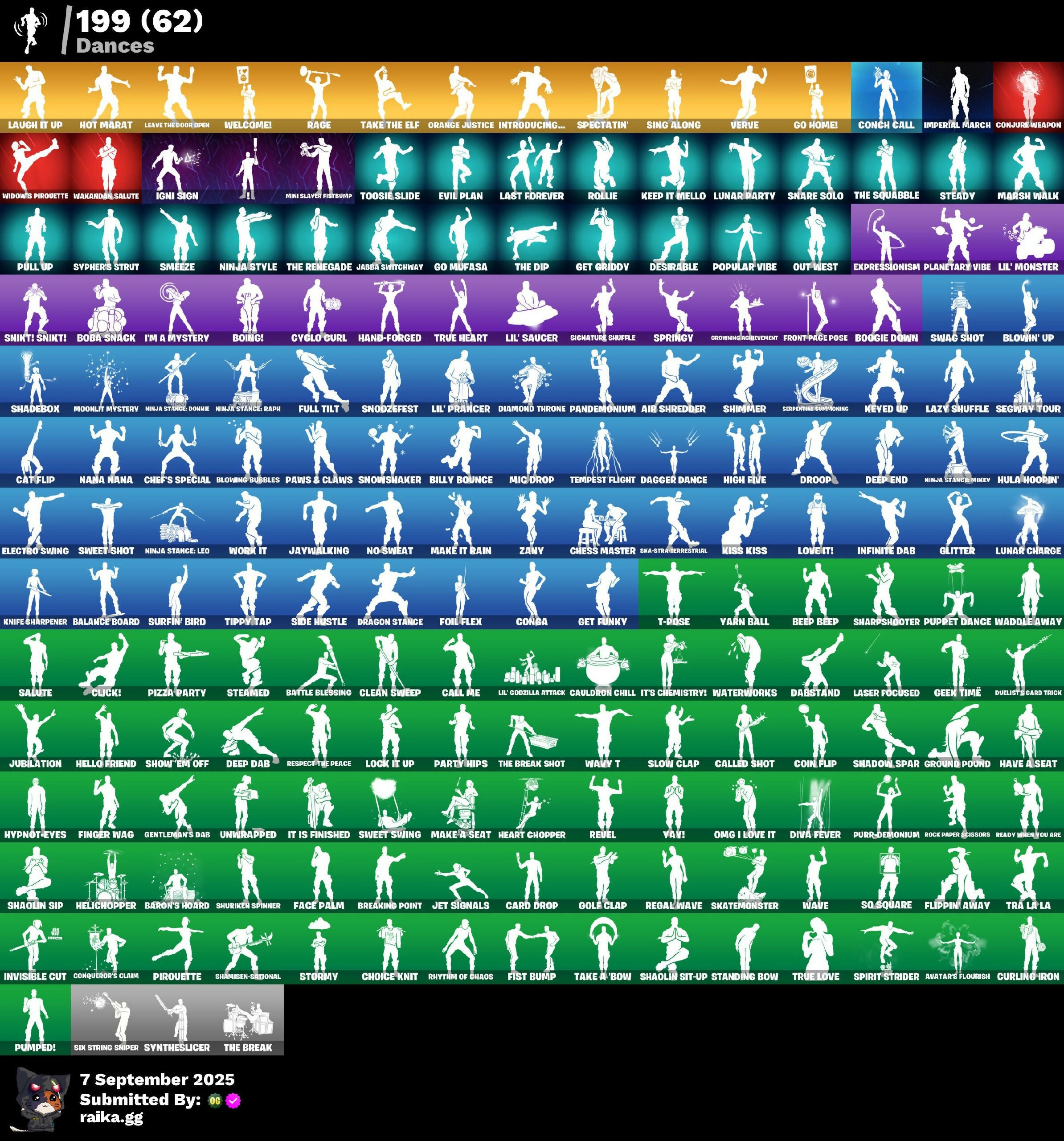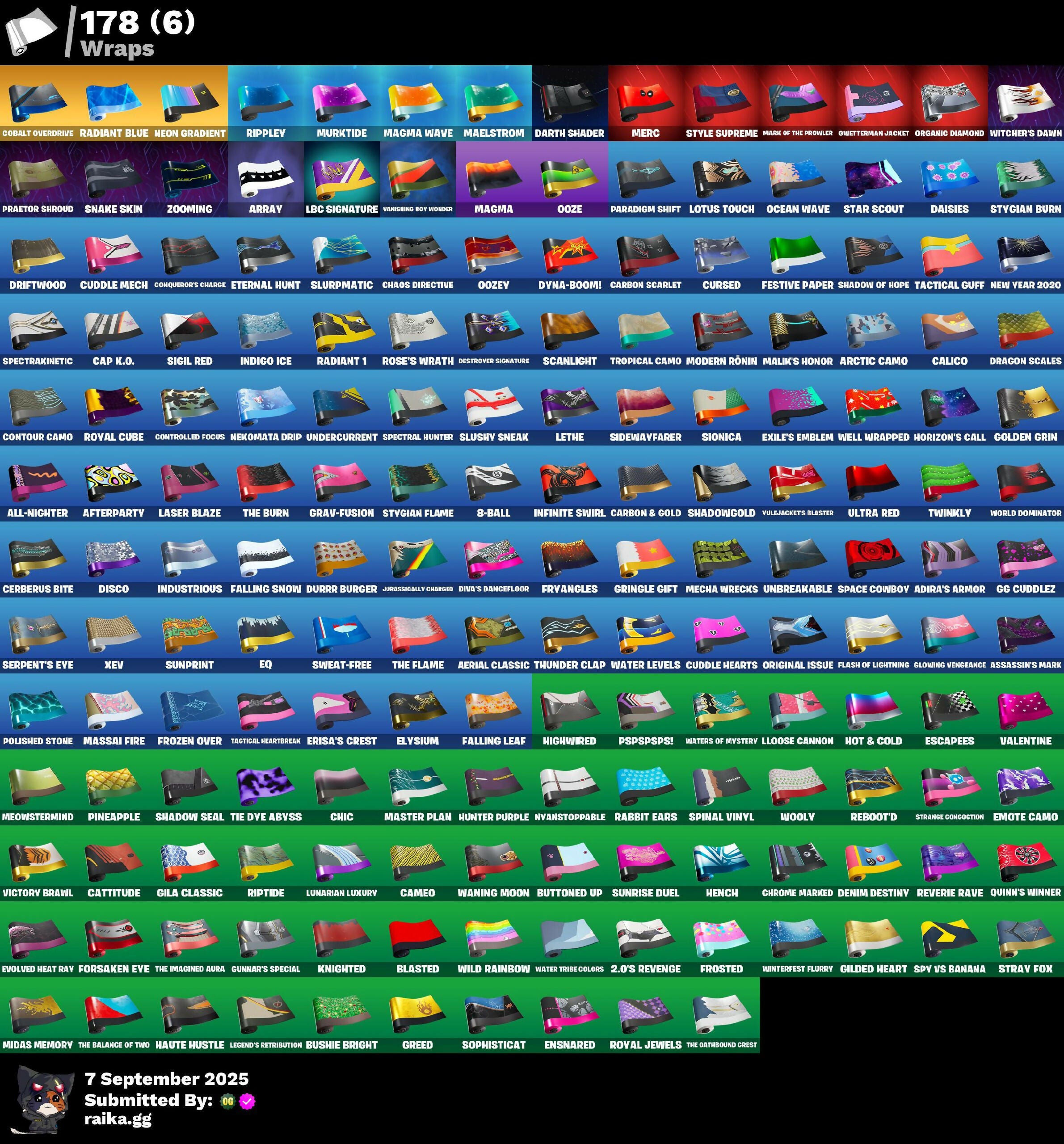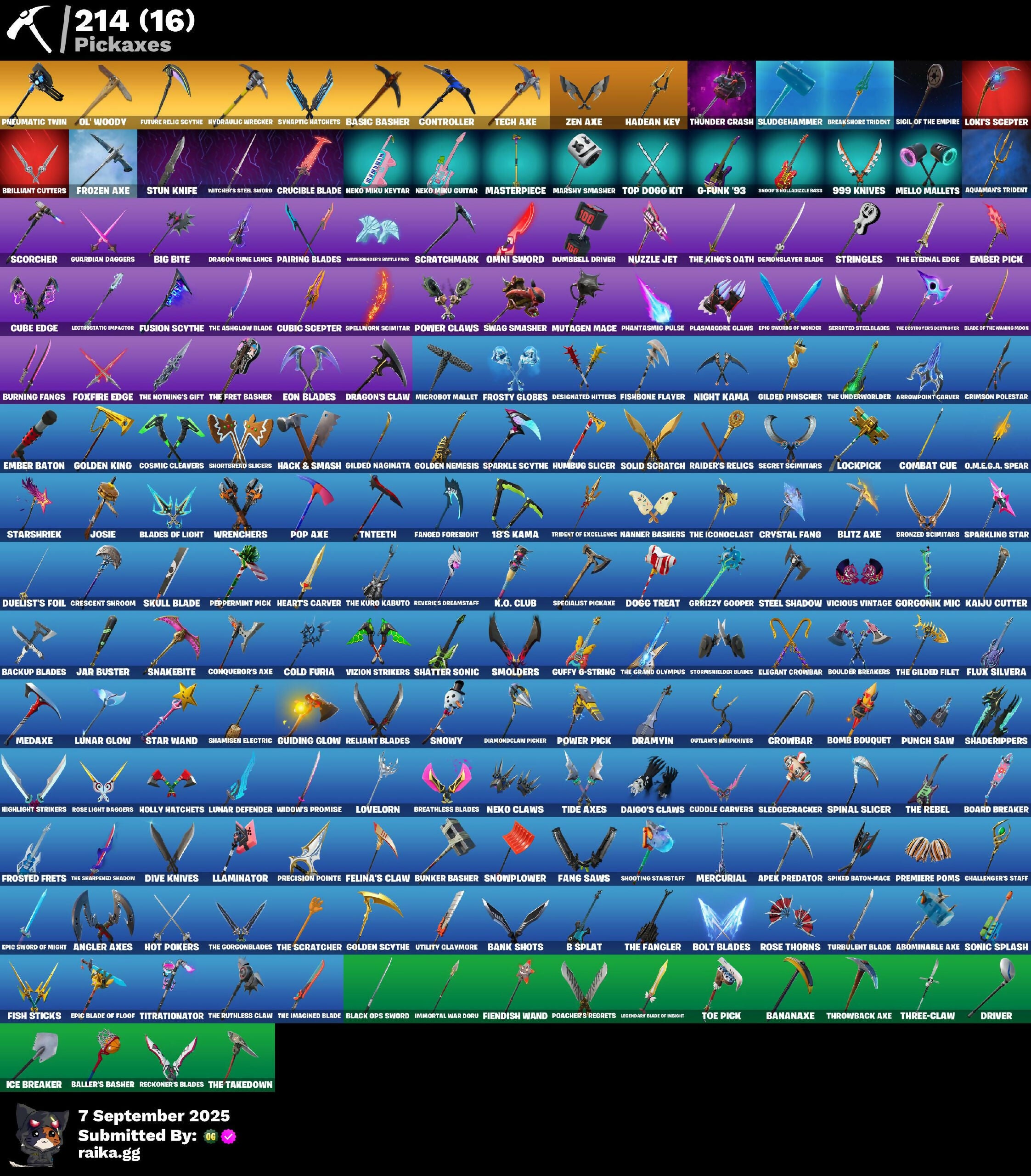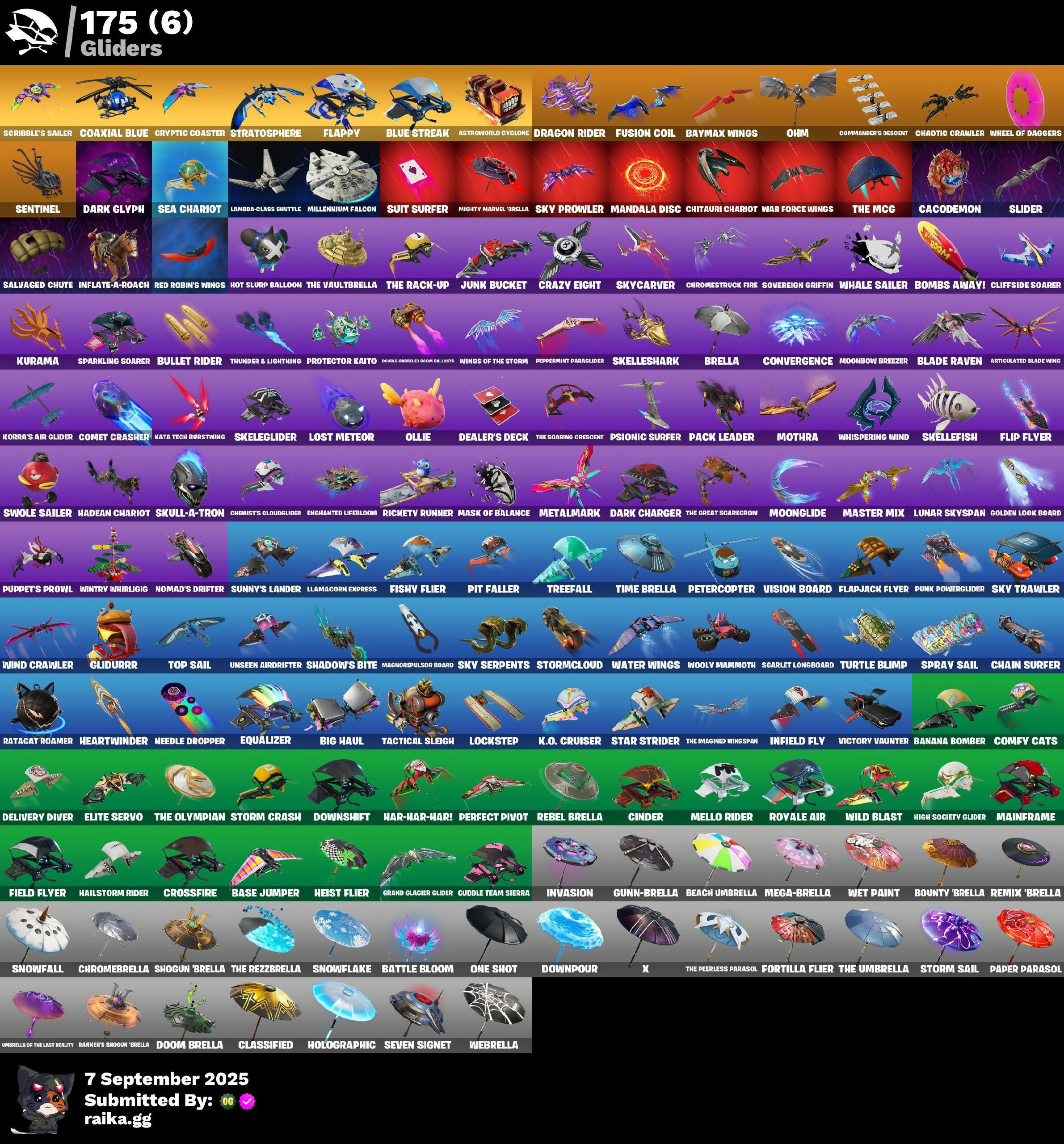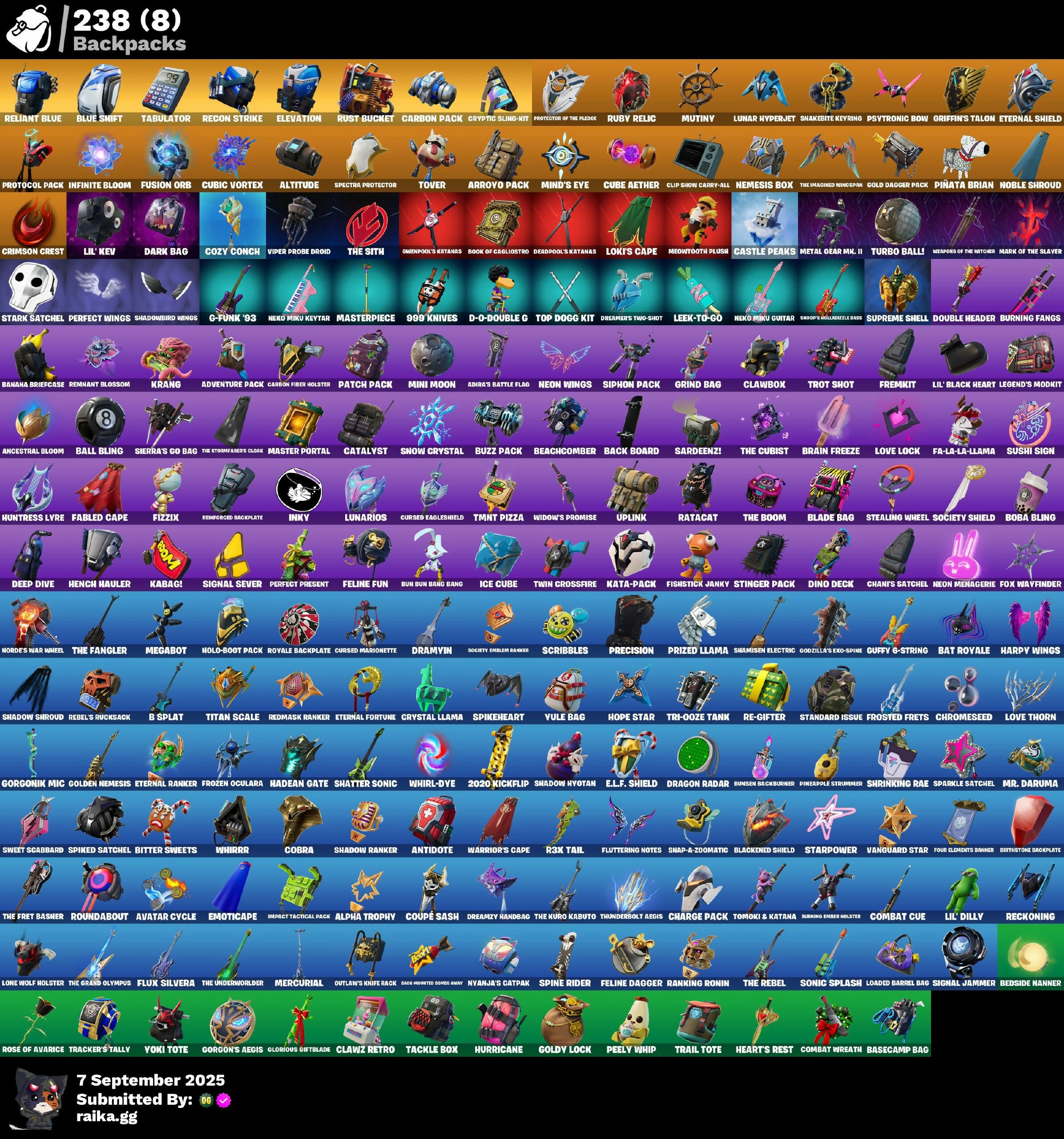 1-Ball, 18's Kama, 2.0's Revenge, 2020 Kickflip, 8-Ball, 8-Ball Vs Scratch, 999 Knives, Abominable Axe, Adira, Adira's Armor, Adira's Battle Flag, Adventure Pack, Aerial Classic, Afterparty, Agent Peely, Air Shredder, All-Nighter, Alpha Trophy, Altitude, Ancestral Bloom, Andy Fangerson, Angler Axes, Antidote, Apex Predator, Aphrodite, Aquaman, Aquaman's Trident, Arctic Adeline, Arctic Camo, Ares, Array, Arrowpoint Carver, Arroyo Pack, Artemis, Articulated Blade Wing, Assassin’s Mark, Astro Antidote, Astro Jack, Astroworld Cyclone, Atlantean Fishstick, Avatar Cycle, Avatar's Flourish, B Splat, Back Board, Back-Mounted Bones Away, Backlash, Backup Blades, Balance Board, Ball Bling, Baller's Basher, Banana Bomber, Banana Briefcase, Bananaxe, Bank Shots, Banner Trooper, Baron's Hoard, Base Jumper, Basecamp Bag, Basic Basher, Bat Royale, Battle Blessing, Battle Bloom, Baymax Wings, Beach Umbrella, Beachcomber, Bedside Nanner, Beep Beep, Big Bite, Big Haul, Billy Bounce, Birthstone Backplate, Bitter Sweets, Black Ops Sword, Blackened Shield, Blackheart, Blade Bag, Blade Raven, Blade of the Waning Moon, Blades of Light, Blasted, Blitz Axe, Blowin' Up, Blowing Bubbles, Blue Shift, Blue Streak, Blue Striker, Blue Team Leader, Board Breaker, Boba Bling, Boba Snack, Boing!, Bolt Blades, Bomb Bouquet, Bombs Away!, Bones, Boogie Down, Book Of Cagliostro, Boulder Breakers, Bounty Brella, Brain Freeze, Breaking Point, Breakpoint, Breakshore Trident, Breathless Blades, Brella, Brilliant Cutters, Bronzed Scimitars, Bullet Rider, Bun Bun Bang Bang, Bunker Basher, Bunsen Backburner, Burning Ember Holster, Burning Fangs, Bushie Bright, Buttoned Up, Buzz Pack, Bytes, Cacodemon, Calico, Call Me, Called Shot, Cameo, Cameo Vs Chic, Cap K.O., Carbon & Gold, Carbon Commando, Carbon Fiber Holster, Carbon Pack, Carbon Scarlet, Card Drop, Cassidy Quinn, Castle Peaks, Cat Flip, Catalyst, Cattitude, Cauldron Chill, Cerberus, Cerberus Bite, Chain Surfer, Chain's Satchel, Challengers Staff, Chani, Chaos Directive, Chaos Director, Chaos Origins, Chaotic Crawler, Charge Pack, Charlotte, Chef's Special, Chemist's Cloudglider, Chess Master, Chic, Chitauri Chariot, Choice Knit, Chrome Marked, Chrome Punk, Chromebrella, Chromeseed, Chromestruck Fire, Cinder, Clara, Classified, Clawbox, Clawz Retro, Clean Sweep, Click!, Cliffside Soarer, Clip Show Carry-All, Cloud Striker, Coaxial Blue, Cobalt, Cobalt Overdrive, Cobra, Codename E.L.F., Coin Flip, Cold Furia, Combat Cue, Combat Wreath, Comet Crasher, Comfy Cats, Commander's Descent, Conch Call, Conga, Conjure Weapon, Conqueror's Axe, Conqueror's Charge, Conqueror's Claim, Contour Camo, Controlled Focus, Controller, Convergence, Cosmic Cleavers, Coupe Sash, Cozy Conch, Crazy Eight, Crescent Shroom, Crimson Crest, Crimson Polestar, Crossfire, Crowbar, Crowning Achievement, Crucible Blade, Cryptic Coaster, Cryptic Sling-Kit, Crystal, Crystal Fang, Crystal Llama, Cube Aether, Cube Assassin, Cube Edge, Cubic Scepter, Cubic Vortex, Cuddle Carvers, Cuddle Hearts, Cuddle Mech, Cuddle Team Sierra, Cuddle Team Specialist, Curling Iron, Cursed, Cursed Eagleshield, Cursed Marionette, Cyclo Curl, D-O-Double G, Dabstand, Dagger Dance, Daigo, Daigo's Claws, Daisies, Dark Bag, Dark Bomber, Dark Charger, Dark Glyph, Darth Shader, Darth Vader, Deadpool, Deadpool's Katanas, Dealer's Deck, Deep Dab, Deep Dive, Deep End, Delivery Diver, Demonslayer Blade, Denim Destiny, Designated Hitters, Desirable, Destroyer Signature, Diamond Throne, Diamondclaw Picker, Dino Deck, Disco, Diva Fever, Diva's Dancefloor, Dive Knives, Doctor Strange, Dogg Treat, Doom Brella, Doom Slayer, Double Header, Double-Barreled Boom Ballasts, Downpour, Downshift, Dragon Radar, Dragon Rider, Dragon Rune Lance, Dragon Scales, Dragon Stance, Dragon's Claw, Dramvin, Dreamer's Two-Shot, Dreamzy Handbag, Driftwood, Driver, Droop, Duelist's Card Trick, Duelist's Foil, Dumbbell Driver, Dunk Powerglider, Durr Burger, Dusty, Dyna-Boom!, Dynamo Tntina, EQ, Electro Swing, Electrostatic Impactor, Elegant Crowbar, Elevation, Elf. Shield, Elite Servo, Elysium, Ember Baton, Ember Pick, Emote Camo, Emoticape, Enchanted Lifebloom, Ensnared, Eon Blades, Epic Blade of Floof, Epic Sword of Micht, Epic Swords of Wonder, Equalizer, Erisa, Erisa's Crest, Escapees, Eternal Fortune, Eternal Hunt, Eternal Knight, Eternal Ranker, Eternal Shield, Evie, Evil Plan, Evolved Heat Ray, Exile's Emblem, Expressionism, Fa-La-La-Llama, Fabled Cape, Face Palm, Fade, Falling Leaf, Falling Snow, Fang Saws, Fanged Foresight, Felina, Felina's Claw, Feline Dagger, Feline Fun, Festive Paper, Field Flyer, Fiendish Wand, Finger Wag, Fish Sticks, Fishbone Flayer, Fishstick Janky, Fishy Flier, Fist Bump, Fixer, Fizzix, Flapjack Flyer, Flappy, Flash of Lightning, Fletcher Kane, Flip Flyer, Flippin' Away, Fluttering Notes, Flux Silvera, Foil Flex, Forsaken Eye, Fortilla Flier, Four Elements Banner, Fox Wayfinder, Foxfire Edge, Fremkit, Front Page Pose, Frosted, Frosted Frets, Frosty Globes, Frozen Axe, Frozen Fishstick, Frozen Nog Ops, Frozen Oculara, Frozen Over, Fryangles, Full Tilt, Fusion, Fusion Coil, Fusion Orb, Fusion Scythe, Future Relic Scythe, G-Funk '93, GG Cuddlez, Gear Specialist Maya, Geek Time, Gentleman's Dab, Geralt Of Rivia, Get Funky, Get Griddy, Gila Classic, Gilded Heart, Gilded Naginata, Gilded Pinscher, Gingerbread Raider, Glidurrr, Glitch, Glitter, Glorious Giftblade, Glowing Vengeance, Go Home!, Go Mufasa, Godzilla Evolved, Godzilla's Exo-Spine, Gold Brutus, Gold Dagger Pack, Gold Midas, Golden Grin, Golden King, Golden Look Board, Golden Nemesis, Golden Scythe, Goldy Lock, Golf Clap, Gorgon's Aegis, Gorgonik Mic, Grand Glacier Glider, Grav-Fusion, Greed, Griffin's Talon, Grind Bag, Gringle Gift, Grizzly Gooper, Ground Pound, Grriz, Guardian Daggers, Guffy 6-String, Guffy G-String, Guiding Glow, Gunn-Brella, Gunnar, Gunnar's Special, Gwenpool's Katanas, Gweterman Jacket, Hack & Smash, Hadean Chariot, Hadean Gate, Hadean Key, Hades, Hailstorm Rider, 