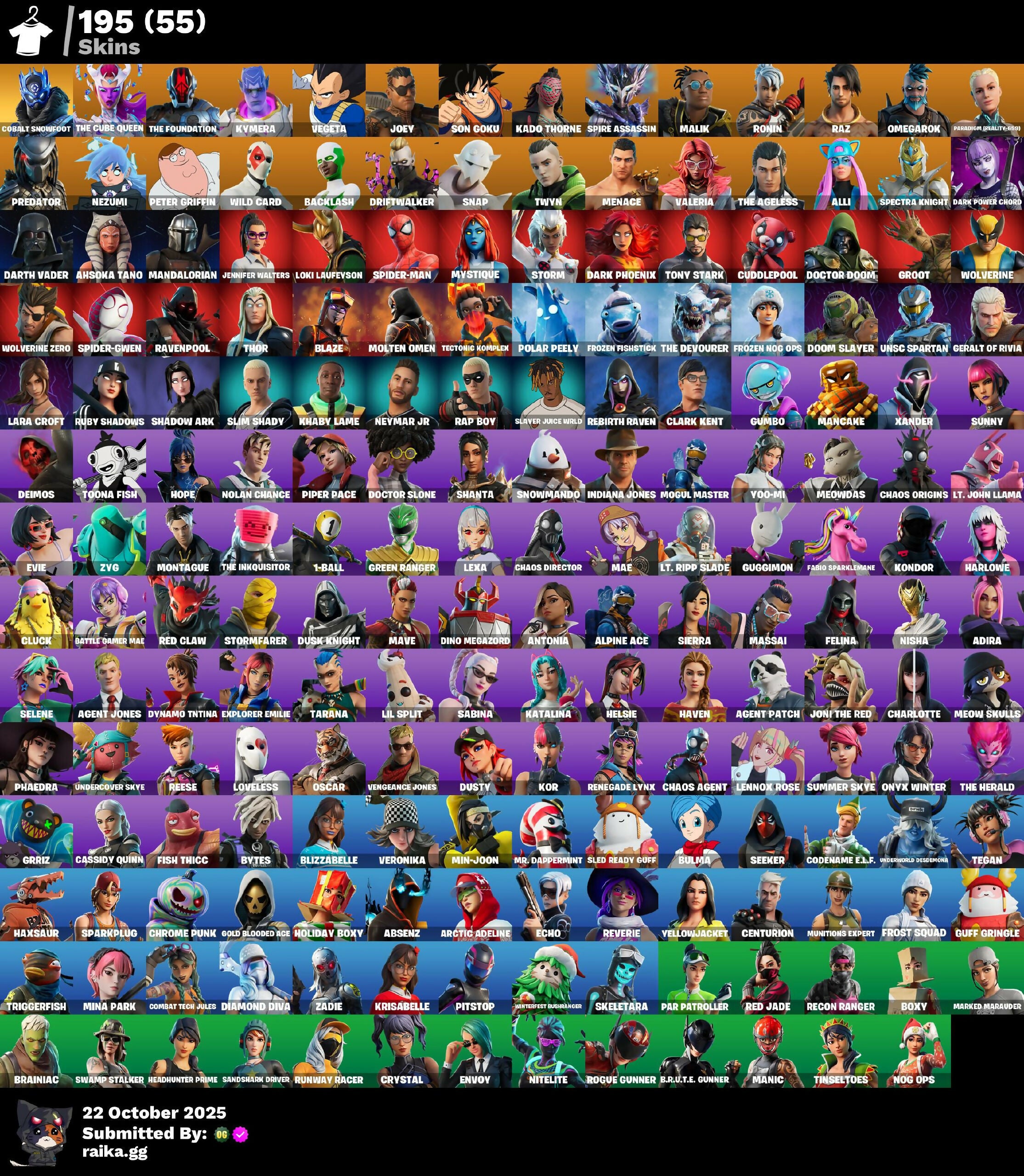 [PC/PSN/XBOX/NITTENDO] 195 skins | Cobalt Snowfoot | The Cube Queen | The Foundation | Kymera | Vegeta | Joey | Son Goku | Kado Thorne | Spire Assassin | Malik | 1100 VB