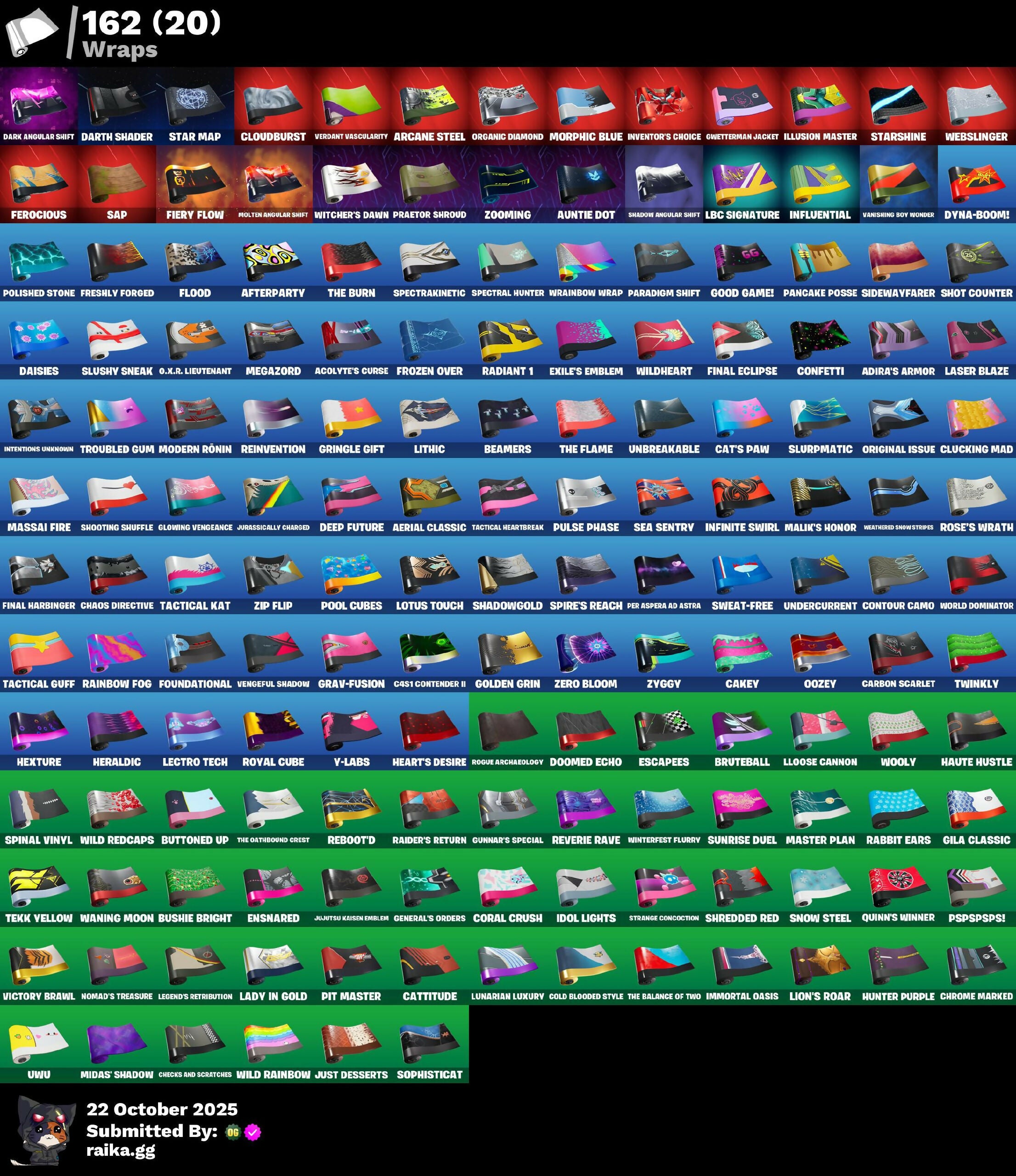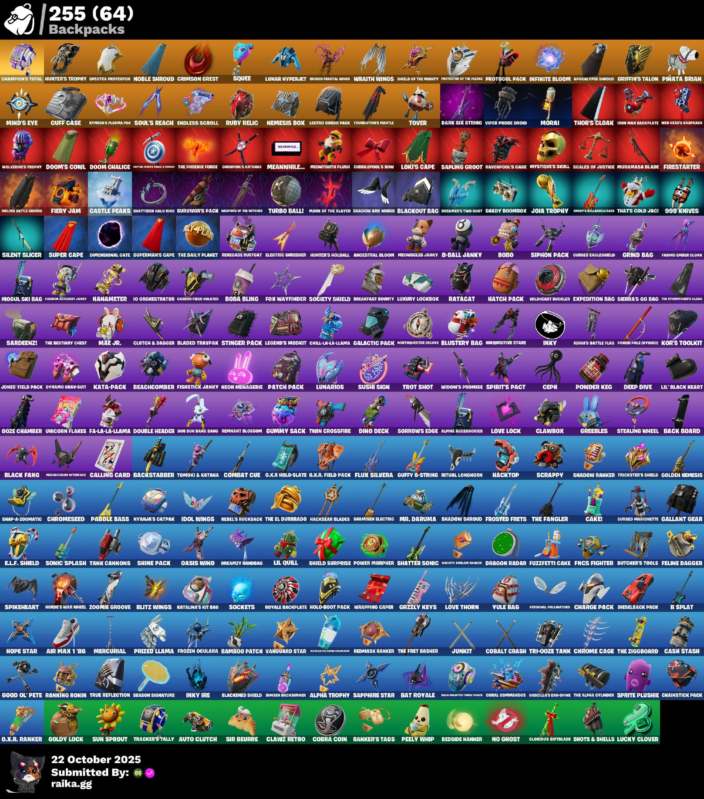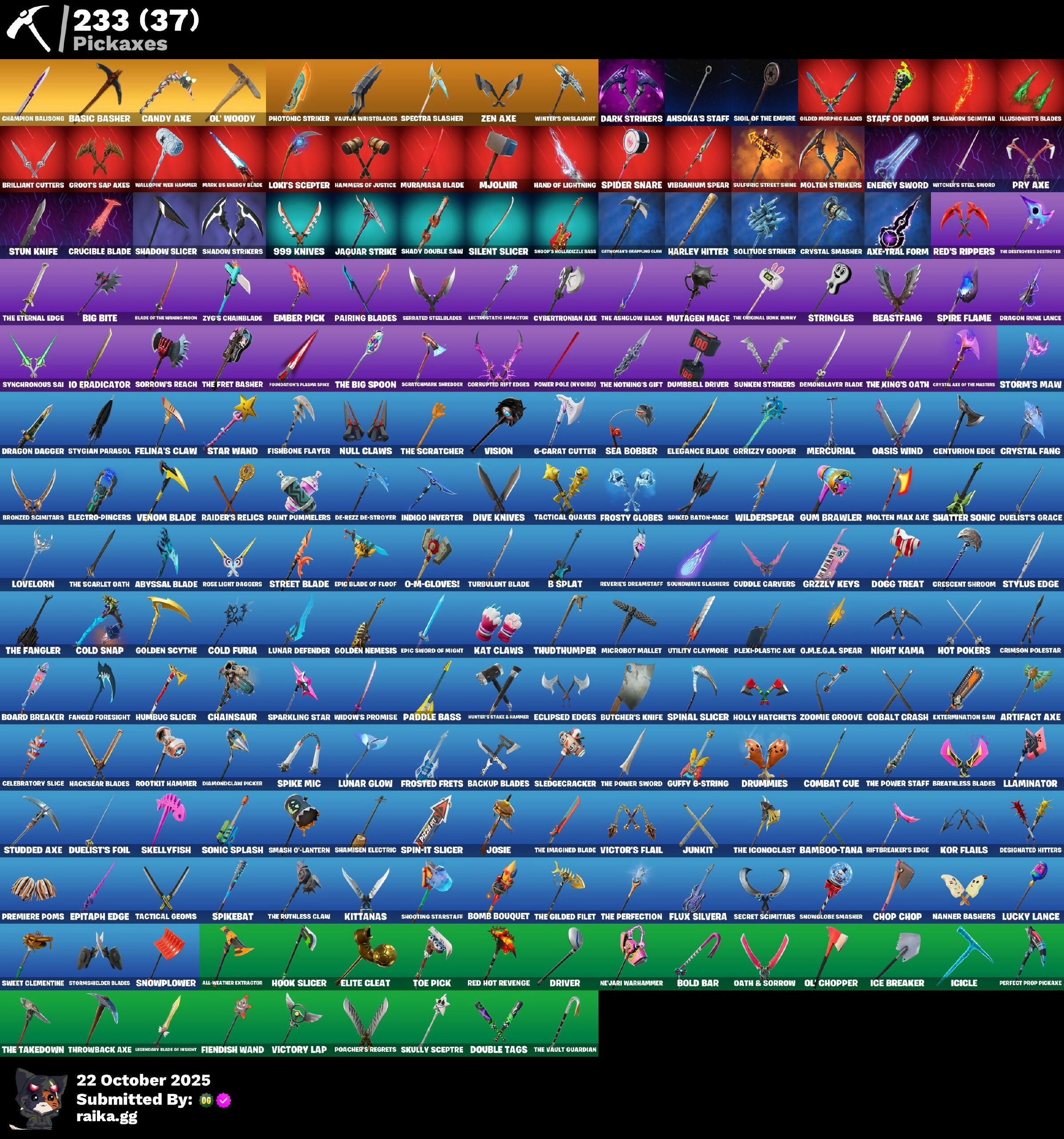 1-Ball, 6-Carat Cutter, 8-Ball Janky, 999 Knives, A Warrior Prepares, AbsenZ, Abyssal Blade, Acolyte's Curse, Adira, Adira's Armor, Adira's Battle Flag, Aerial Classic, Afterparty, Agent Jones, Agent Patch, Ahsoka Tano, Ahsoka's Staff, Air Max 1 '86, All-Weather Extractor, Alli, Alpha Trophy, Alpine Accessories, Alpine Ace, Ancestral Bloom, Antonia, Apocalypse Shroud, Arachnrobatics, Arcane Energy Glider, Arcane Steel, Arctic Adeline, Articulated Blade Wing, Artifact Axe, Auntie Dot, Auto Clutch, Axe-Tral Form, Azarath Metrion Zinthos!, B Splat, B.R.U.T.E. Gunner, Back Board, Back-Rowded Turbo Toner, Backlash, Backstabber, Backup Blades, Balance Board, Bamboo Patch, Bamboo-Tana, Basic Basher, Bat Royale, Battle Bloom, Battle Gamer Mak, Beachcomber, Beamers, Bean Bag, Bear Hug, Beastfang, Beatzbunny, Bedside Nanner, Big Bite, Big Fan, Bike To Go, Black Fang, Blackened Shield, Blackout Bag, Blade of the Waning Moon, Bladed Travpak, Blaze, Blitz Wings, Blizzabelle, Blowin' Up, Blustery Bag, Board Breaker, Boba Bling, Boba Snack, Bobo, Bold Bar, Bomb Bouquet, Bone Patrol, Boogie Down, Boomin', Boosting Ki, Boots 'N' Cats, Bounty 'Brella, Boxy, Brainiác, Breakfast Bounty, Breathless Blades, Brilliant Cutters, Bring It Around, Bronzed Scimitars, Bruteball, Bubloon, Bulma, Bun Bun Bang Bang, Bunsen Backburner, Bushie Bright, Butcher's Knife, Butcher's Tools, Buttoned Up, Bytes, C4S1 Contender II, Cacodemon, Cake!, Cakey, Called Shot, Calling Card, Candy Axe, Cap Kick, Captain Ilamerica, Captain James Child & Phoebe, Carbon Fiber Holster, Carbon Scarlet, Card Drop, Cardistry, Cash Stash, Cassidy Quinn, Castle Peaks, Cat's Paw, Cattitude, Catwoman's Grappling Claw, Cauldron Chill, Cazadora, Celebratory Slice, Centurion, Centurion Edge, Ceph, Chainsaur, Chainstick Pack, Champion Balisong, Champions Total, Chaos Agent, Chaos Directive, Chaos Director, Chaos Origins, Chaotic Crawler, Charge Pack, Charlotte, Checks And Scratches, Chill-La-La-Llama, Chitauri Chariot, Choice Knit, Chop Chop, Chop Dropper, Chrome Cage, Chrome Marked, Chrome Punk, Chromebrella, Chromeseed, Chromestruck Fire, Clark Kent, Clawbox, Clawz Retro, Clean Sweep, Click!, Cliffside Soarer, Cloudburst, Cluck, Clucking Mad, Clutch & Dagger, Cobalt Crash, Cobalt Snowfoot, Cobra Coin, Codename E.L.F., Cold Blooded Style, Cold Furia, Cold Snap, Combat Cue, Combat Tech Jules, Combocopter, Comfy Cats, Commander's Descent, Competitor's Skyblades, Competitor's Time Brella, Confetti, Contour Camo, Coral Commandos, Coral Crush, Corrupted Rift Edges, Corrupted Tendrils, Count It!, Crack It, Crescent Shroom, Crimson Crest, Crimson Polestar, Crimson Wish, Crowning Achievement, Crucible Blade, Crystal, Crystal Axe of the Masters, Crystal Fang, Crystal Smasher, Cuddle Carvers, Cuddlepool, Cuddlepool's Bow, Cuddly Cloudcruiser, Cuff Case, Curling Iron, Cursed Eagleshield, Cursed Marionette, Cybertronian Axe, Cyclo Curl, Dagger Dance, Daisies, Dark Angular Shift, Dark Charger, Dark Phoenix, Dark Power Chord, Dark Six String, Dark Strikers, Darth Shader, Darth Vader, De-Rezz De-Stroyer, Dealer's Deck, Deep Dive, Deep Future, Deimos, Demon Slayer Blade, Designated Hitters, Diamond Diva, Diamond Throne, Diamondclaw Picker, Dice Roll, Dieselback Pack, Dimensional Gate, Dino Deck, Dino Megazord, Dirtbike Challenge, Dive Knives, Do The 'Split, Doctor Doom, Doctor Slone, Dogg Treat, Doom Brella, Doom Chalice, Doom Slayer, Doom's Cowl, Doomed Echo, Double Header, Double Tags, Double-Barreled Boom Ballasts, Doze Dab, Dragon Dagger, Dragon Daggers Song, Dragon Radar, Dragon Rider, Dragon Rune Lance, Dragonhearted 'Brella, Dreamer's Two-Shot, Dreamzy Handbag, Driftwalker, Driver, Drummies, Duelist's Card Trick, Duelist's Foil, Duelist's Grace, Dumbbell Driver, Dusk Knight, Dusty, Dyna-Boom!, Dynamo Grav-Suit, Dynamo TNTina, E.L.F. Shield, Eagle's Form, Echo, Eclipse Brella, Eclipsed Edges, Eggar, Electric Shredder, Electro-Pincers, Elegance Blade, Elite Cleat, Elite Servo, Ember Pick, Emergency Raft, Enchanted Lifebloom, Endless Scroll, Energy Sword, Ensnared, Envoy, Epic Blade of Floof, Epic Sword of Might, Epitaph Edge, Escapees, Evasive Maneuvers, Everything's End, Evie, Exile's Emblem, Expedition Bag, Explorer Emilie, Extermination Saw, FNCS Fighter, Fa-La-La-Llama, Fabio Sparklemane, Fading Ember Cloak, Fanged Foresight, Fashion Accident Janky, Felina, Felina's Claw, Feline Dagger, Ferocious, Fiendish Wand, Fiery Descent, Fiery Flow, Fiery Jam, Final Eclipse, Final Harbinger, Firestarter, Fish Thicc, Fishbone Flayer, Fishstick Janky, Fist Bump, Flaky Feast, Flapjack Flyer, Flashback Breakdown, Flavor-Dusted Sparklewings, Flight Risk, Flip Flyer, Flippin' Away, Flood, Flux Silvera, Foil Flex, For O.X.R!, Fortilla Flier, Foundation's Mantle, Foundation's Plasma Spike, Foundational, Foundational 'Brella, Fox Clan 'Brella, Fox Drifter, Fox Wayfinder, Frequency Flyer, Freshly Forged, Frost Squad, Frostburn, Frosted Frets, Frosty Globes, Frozen Fishstick, Frozen Nog Ops, Frozen Oculara, Frozen Over, Fuzzetti Cake, Galactic Pack, Gallant Gear, Gathering Storm, General's Orders, General's War Table, Geralt of Rivia, Get Griddy, Gila Classic, Gilded Morphic Blades, Glorious Giftblade, Glowing Vengeance, Godzilla's Exo-Spine, Gold Blooded Ace, Golden Grin, Golden Nemesis, Golden Scythe, Goldy Lock, Good Game!, Good Ol' Pete, Good Sportsmanship, Gothic Shadesoarer, Grand Glacier Glider, Grav-Fusion, Greebles, Green Ranger, Griffin's Talon, Grind Bag, Gringle Gift, Grizzly Gooper, Grizzly Keys, Groot, Groot's Sap Axes, Grriz, Grzzly Keys, Guff Gringle, Guffy 6-String, Guffy G-String, Guggimon, Gum Brawler, Gumbo, Gummy Sack, Gunn-Brella, Gunnar's Special, Gwen's Spiderchute, Gwenpool's Katanas, Gwettermann Jacket, Hacksear Blades, Hackshear Blades, Hacktop, Hammers of Justice, Hand of Lightning, Har-Har-Har!, Harley Hitter, Harlowe, Hatch Pack, Haute Hustle, Have A Seat, Haven, Haxasaur, Headhunter Prime, Heart Sign, Heart's Desire, Heartburst, Heist Flier, Helsie,