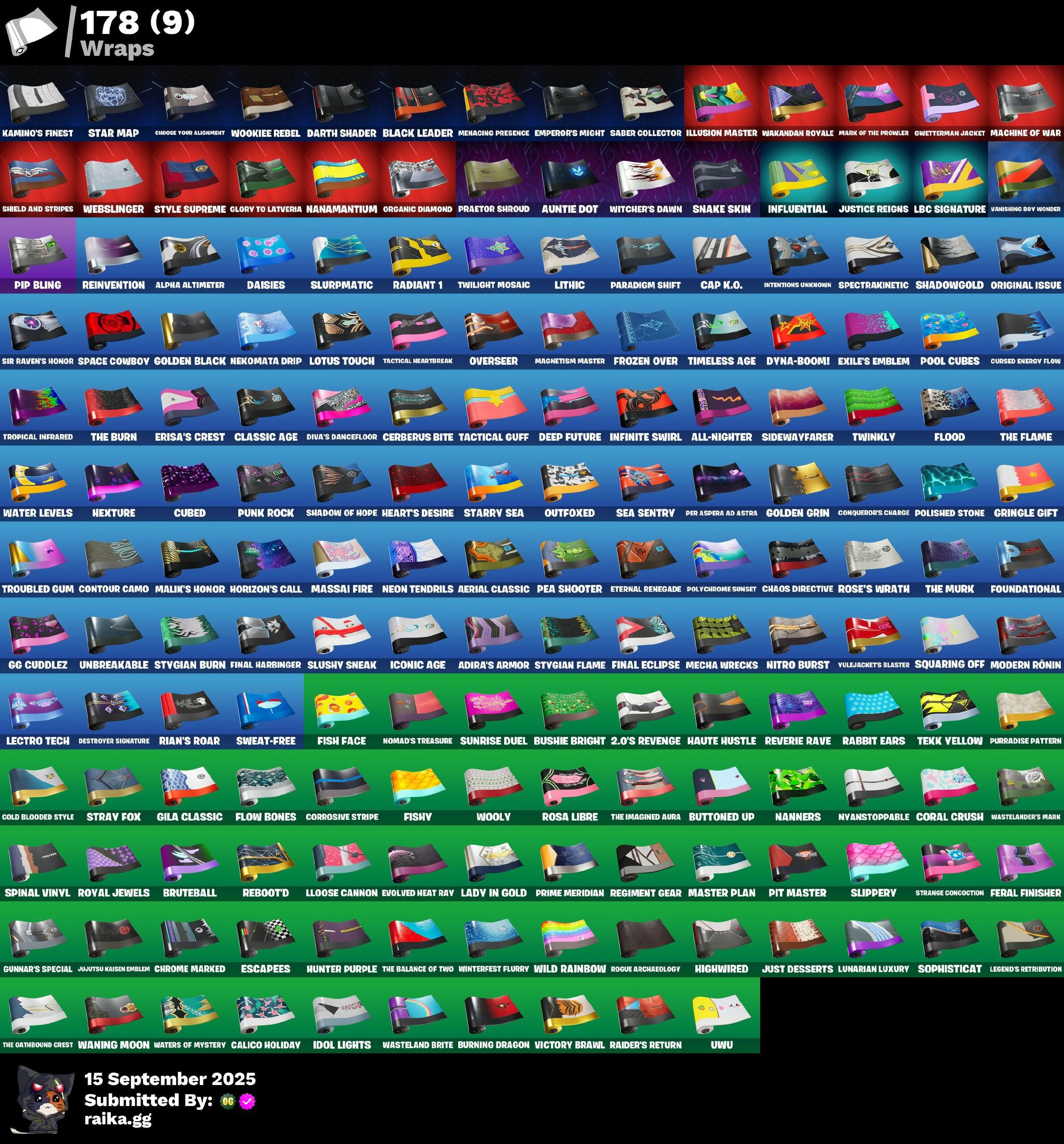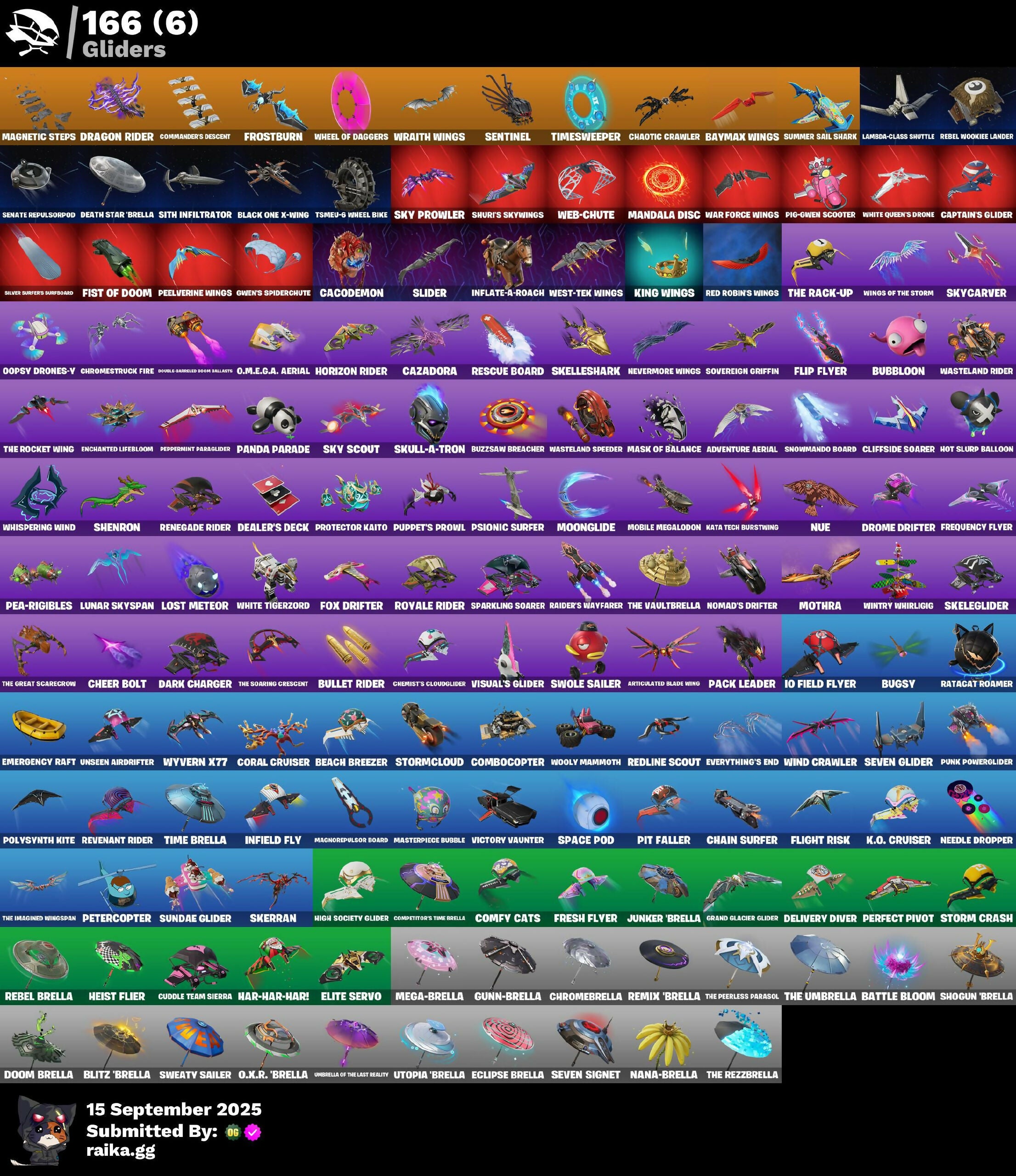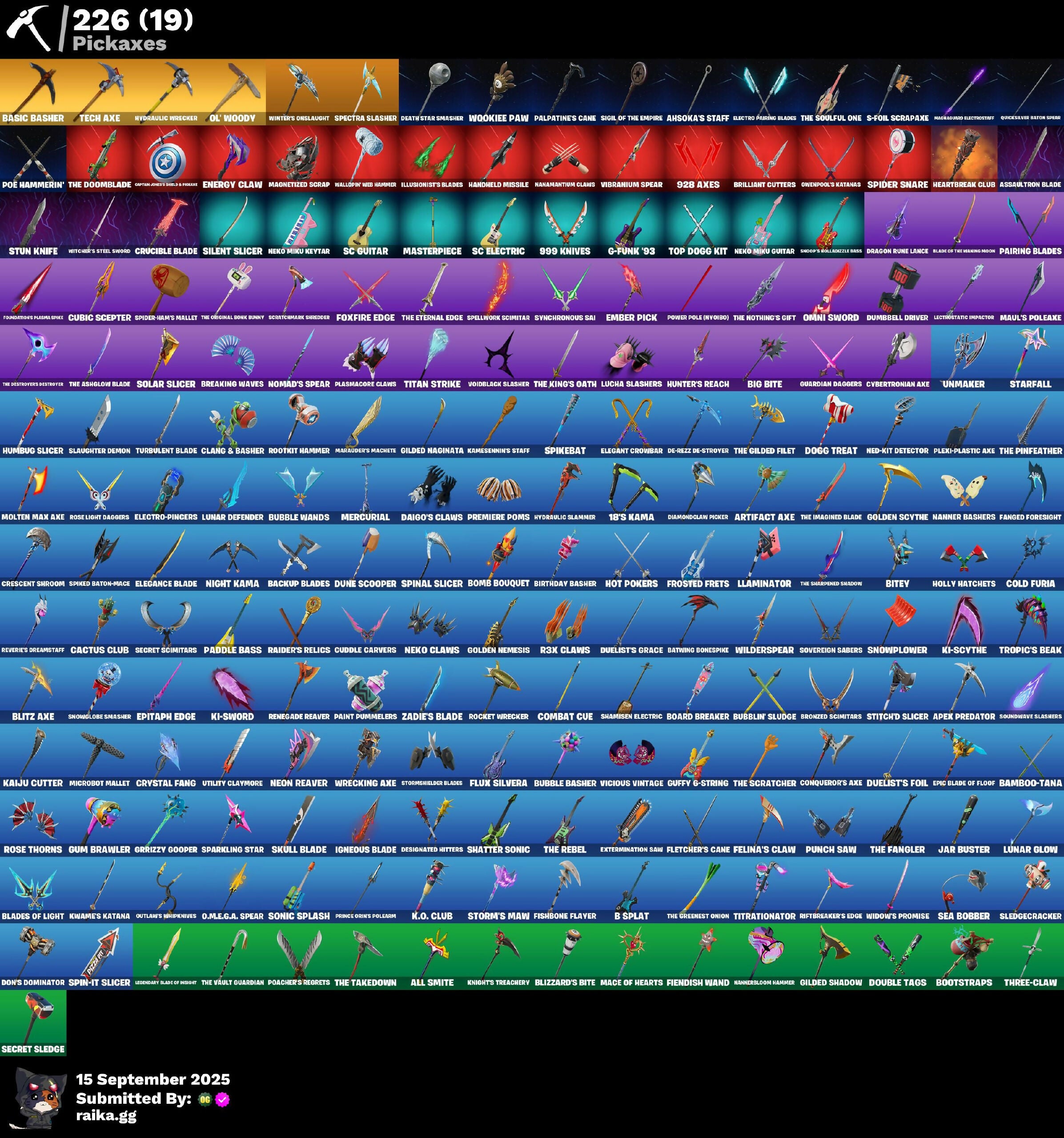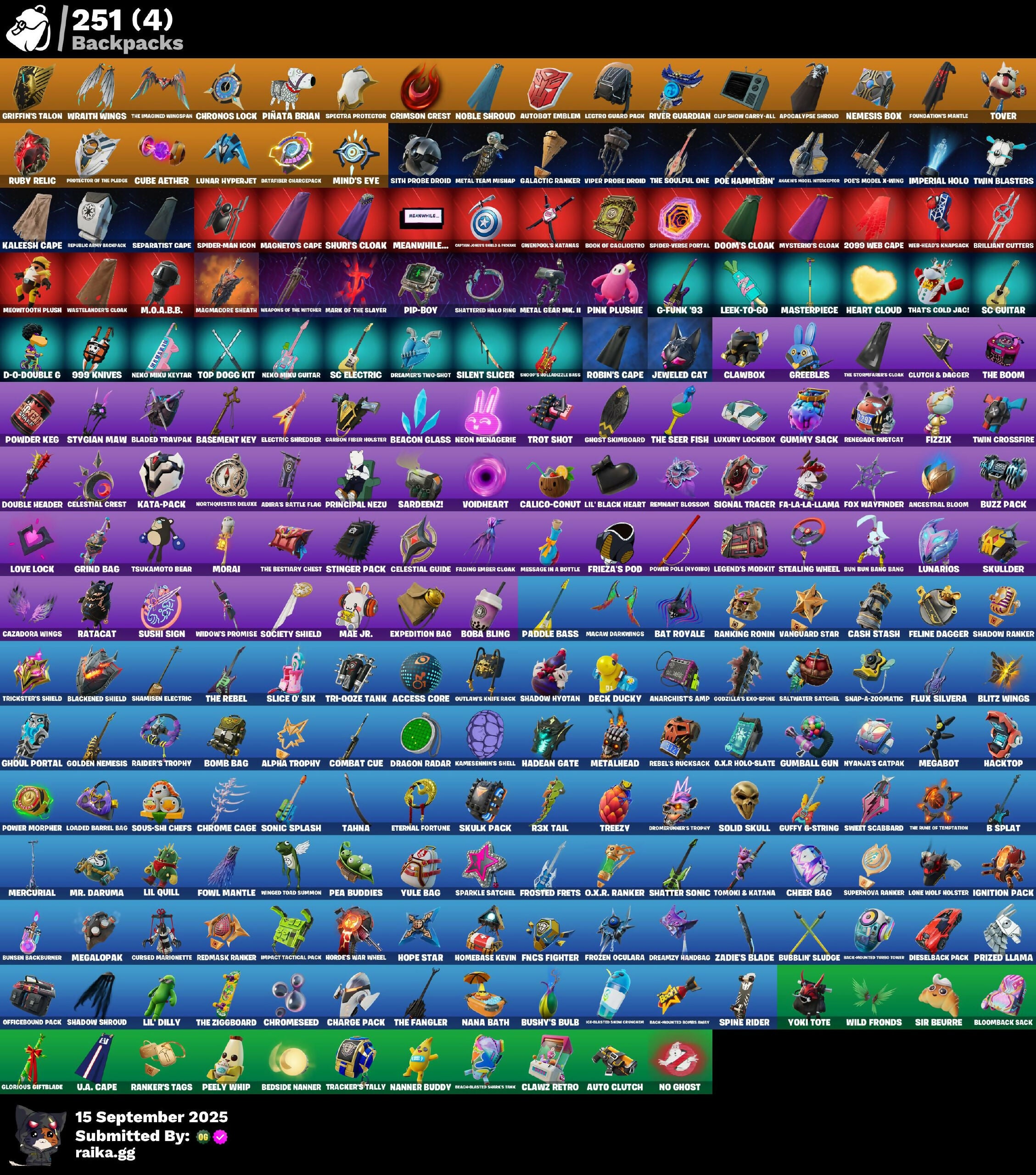 (SnikT!), 1-Ball, 18's Kama, 2.0's Revenge, 2099 Web Cape, 928 Axes, 999 Knives, Access Core, Adira, Adira's Battle Flag, Adira’s Armor, Adventure Aerial, Aerial Assault Bomber, Aerial Classic, Ahsoka Tano, Ahsoka's Staff, All Might, All Smite, All-Nighter, Alpha Altimeter, Alpha Trophy, Anarchist's Amp, Ancestral Bloom, Andy Fangerson, Ansoha’s Clone Trooper, Antonia, Apex Predator, Apocalypse Shroud, Apprentice Evie, Arachrobatics, Arctic Adeline, Articulated Blade Wing, Artifact Axe, Assaultron Blade, Astrea, Auntie Dot, Auto Clutch, Autobot Emblem, Awaking Model Interceptor, Ayla Winn, B Splat, Back-Mounted Bombs Away, Back-Mounted Turbo Timer, Backlash, Backup Blades, Balance Board, Bamboo-Tana, Baron's Hoard, Basement Key, Basic Basher, Bat Royale, Battle Blessing, Battle Bloom, Batwing Bonespike, Baymax Wings, Beach Breezer, Beach-Blasted Sharks Tank, Beacon Glass, Bear Hug, Beatzbunny, Bedside Nanner, Beerus, Big Bite, Big Fan, Bike To Go, Birdarang Flourish, Birthday Basher, Bitey, Black Leader, Black One X-Wing, Blackened Shield, Blade of the Morning Moon, Bladed Travpak, Blades of Light, Blitz 'Brella, Blitz Axe, Blitz Wings, Blizzabelle, Blizzard's Bite, Bloomback Sack, Blowin' Up, Board Breaker, Boba Bling, Boba Snack, Bomb Bag, Bomb Bouquet, Bone Breaker, Bones, Boogie Down, Book of Cagliostro, Boosting Ki, Bootstraps, Bow Go, Breaking Waves, Breezabelle, Brilliant Cutters, Brite Moves, Brite Raider, Bronzed Scimitars, Bruteball, Bubble Basher, Bubble Wands, Bubblin' Sludge, Bubbloon, Bugsy, Bullet Rider, Bun Bun Bang Bang, Bunsen Backburner, Burning Dragon, Bushie Bright, Bushy's Bulb, Buttoned Up, Buzz Pack, Buzzsaw Breacher, Bytes, Cacodemon, Cactus Club, Calico Holiday, Calico-Conut, Called Shot, Cap K.O., Captain Illamerica, Captain Jones, Captain Jones's Shield & Pokeball, Captain Phasma, Captain's Glider, Captain-Jones's Shield & Pouch, Carbon Fiber Holster, Card Drop, Cartoonian Comic Book Outfit, Cash Stash, Cassidy Quinn, Cauldron Chill, Cazadora, Cazadora Wings, Celestial Crest, Celestial Guide, Cerberus Bite, Chain Surfer, Chaos Directive, Chaos Director, Chaotic Crawler, Charge Pack, Charging Up, Check The Map, Cheer Bag, Cheer Bolt, Chef's Special, Chemist's Cloudglider, Choice Knit, Choose Your Alignment, Chrome Cage, Chrome Marked, Chrome Punk, Chromebrella, Chromeseed, Chromestruck Fire, Chronos Lock, Clang & Basher, Classic Age, Clawbox, Clawz Retro, Cliffside Soarer, Clip Show Garcy all, Clone Trooper, Clutch & Dagger, Codsworth's Cleanup, Cold Blooded Style, Cold Furia, Combat Cue, Combocopter, Comfy Cats, Commanders Descent, Competitor's Time Brella, Conjure Weapon, Conqueror's Axe, Conqueror's Charge, Conqueror's Claim, Contour Camo, Coral Cruiser, Coral Crush, Corrosive Stripe, Coruscant Guard, Count It!, Crack It, Crescent Shroom, Crimson Crest, Crowning Achievement, Crucible Blade, Crystal Fang, Cube Aether, Cubed, Cubic Scepter, Cuddle Carvers, Cuddle Team Sierra, Cuddle Team Specialist, Cursed Energy, Cursed Energy Flow, Cursed Marionette, Cybertronian Axe, Cyclo Curl, D-O-Double G, Dagger Dance, Daigo, Daigo's Claws, Daisies, Dark Charger, Darth Maul, Darth Shader, Darth Vader, Datafiber Chargepack, De-Rezz de-Stroyer, Dealer's Deck, Death Star 'Brella, Death Star Smasher, Deck Ducky, Deep Future, Delivery Diver, Designated Hitters, Destroyer Signature, Diamond Throne, Diamondclaw Picker, Dice Roll, Die With A Smile Bruno, Dieselback Pack, Dirtbike Challenge, Disassemble, Diva Fever, Diva's Dancefloor, Do The 'Split, Doctor Strange, Dogg Treat, Don's Dominator, Doom, Doom Brella, Doom Slayer, Doom's Cloak, Doom's Domain, Double Header, Double Tags, Double-Barreled Boom Ballasts, Doze Dab, Dragon Radar, Dragon Rider, Dragon Rune Lance, Dramatic Flares, Dreamers Two-Ghot, Dreamzy Handbag, Drome Drifter, Dromeroners Trophy, Duelist's Card Trick, Duelist's Foil, Duelist's Grace, Dumbbell Driver, Dune Scooper, Durrr Taisho, Dusk Knight, Dusty, Dyna-Boom!, Dynamo Tntina, Eclipse Brella, Electric Shredder, Electro Pairing Blades, Electro-Pincers, Electrostatic Impactor, Elegance Blade, Elegant Crowbar, Elite Servo, Ember Pick, Emergency Raft, Emma Frost, Emperor Palpatine, Emperor's Might, Empress Fan Dance, Enchanted Lifebloom, Endless Ned, Energy Claw, Epic Blade of Floof, Epitaph Edge, Era, Eren Jaeger, Erisa, Erisa's Crest, Escapees, Eternal Fortune, Eternal Renegade, Everything's End, Evie, Evolved Heat Ray, Exile's Emblem, Expedition Bag, Explorer Emilie, Expressionism, Extermination Saw, Fa-La-La-Llama, Fading Ember Cloak, Fang Dance, Fanged Foresight, Feel The Force, Felina, Felina's Claw, Feline Dagger, Feral Finisher, Fiendish Wand, Final Eclipse, Final Harbinger, Fire Show, Fireworks Salvo, First Order Stormtrooper, Fish Face, Fish Thicc, Fishbone Flayer, Fishstick, Fishy, Fishy Flourish, Fist Bump, Fist Of Doom, Fizzix, Flaky Feast, Flashback Breakdown, Fletcher's Cane, Flight Risk, Flip Flyer, Flood, Flow Bones, Flux Silvera, Fncs Fighter, Foil Flex, Force Lightning, Foundation's Mantle, Foundation's Plasma Spike, Foundational, Fowl Mantle, Fox Drifter, Fox Wayfinder, Foxfire Edge, Frequency Flyer, Fresh Flyer, Frieza, Frieza's Pod, Front Page Pose, Frostburn, Frosted Frets, Frozen Oculora, Frozen Over, Full Googly, Fusion! Hah!!, G-Funk '93, GG Coddlez, GGWP, Galactic Ranker, Gangnam Style, General Grievous, Geralt Of Rivia, Get Out Of Your Mind, Ghost Skimboard, Ghoul Portal, Gila Classic, Gilded Naginata, Gilded Shadow, Glorious Giftblade, Glory to Latveria, Godzilla Evolved, Godzilla's Exo-Spine, Goku Black, Gold Blooded Ace, Golden Black, Golden Grin, Golden Nemesis, Golden Scythe, Good Game, Well Played, Good Sportsmanship, Grand Glacier Glider, Greebles, Griffin's Talon, Grind Bag, Gringle Gift, Grizzly Gooper, Grriz, Guardian Daggers, Guff Gringle, Guffy G-String, Gum Brawler, Gumball Gun, Gumbo, Gummy Sack, Gunn-Brella, Gunnar, Gunnar’s Special, Gwen's Spiderchute, Gwen-step, Gwenpool, Gwenpools Katanas, Gwetterman Jacket, Ha
