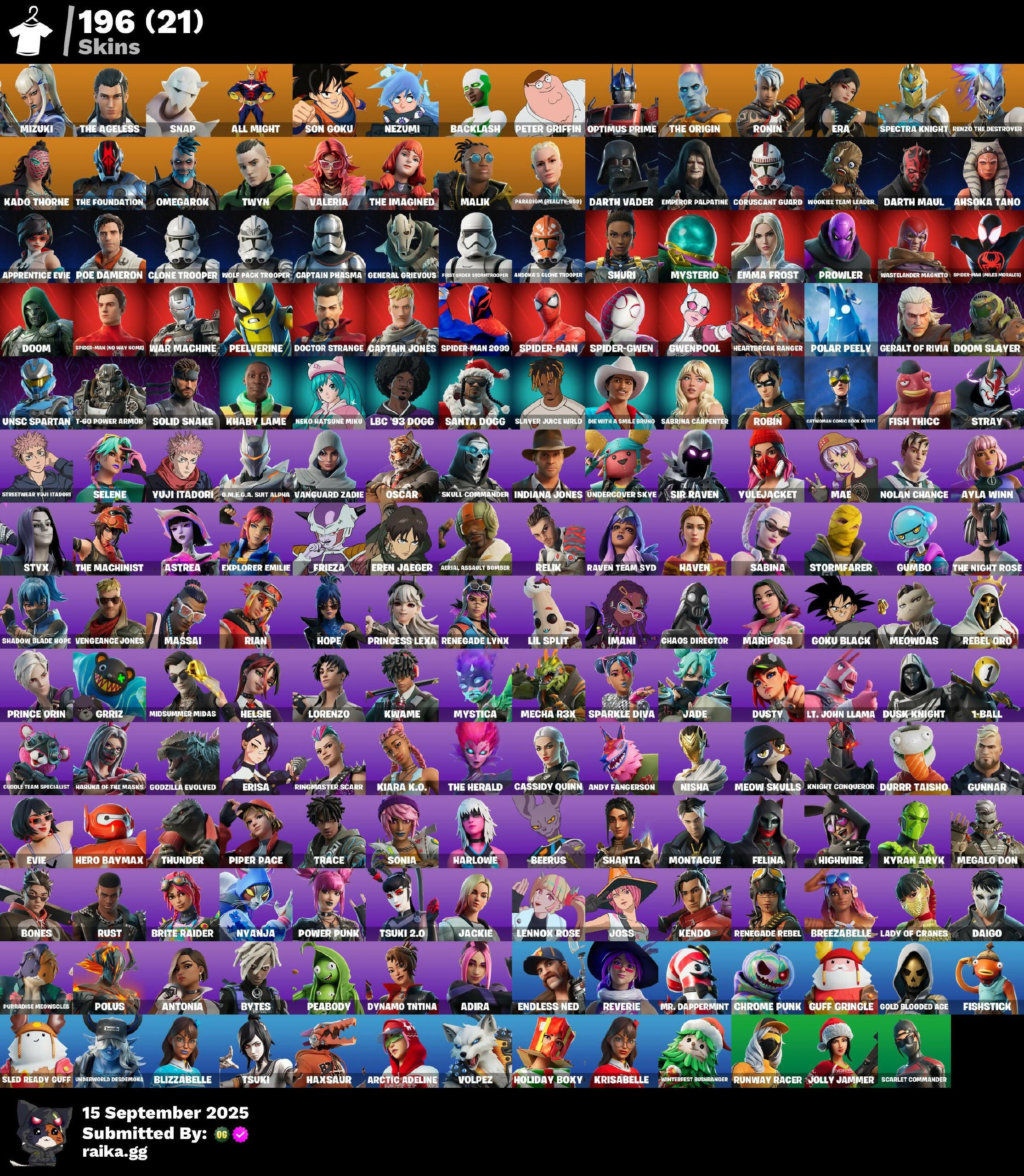 [PC/PSN/XBOX/NITTENDO] 196 skins Mizuki | The Ageless | Snap | All Might | Son Goku | Nezumi | Backlash | Peter Griffin | Optimus Prime | The Origin | Ronin | Era | 100 VB