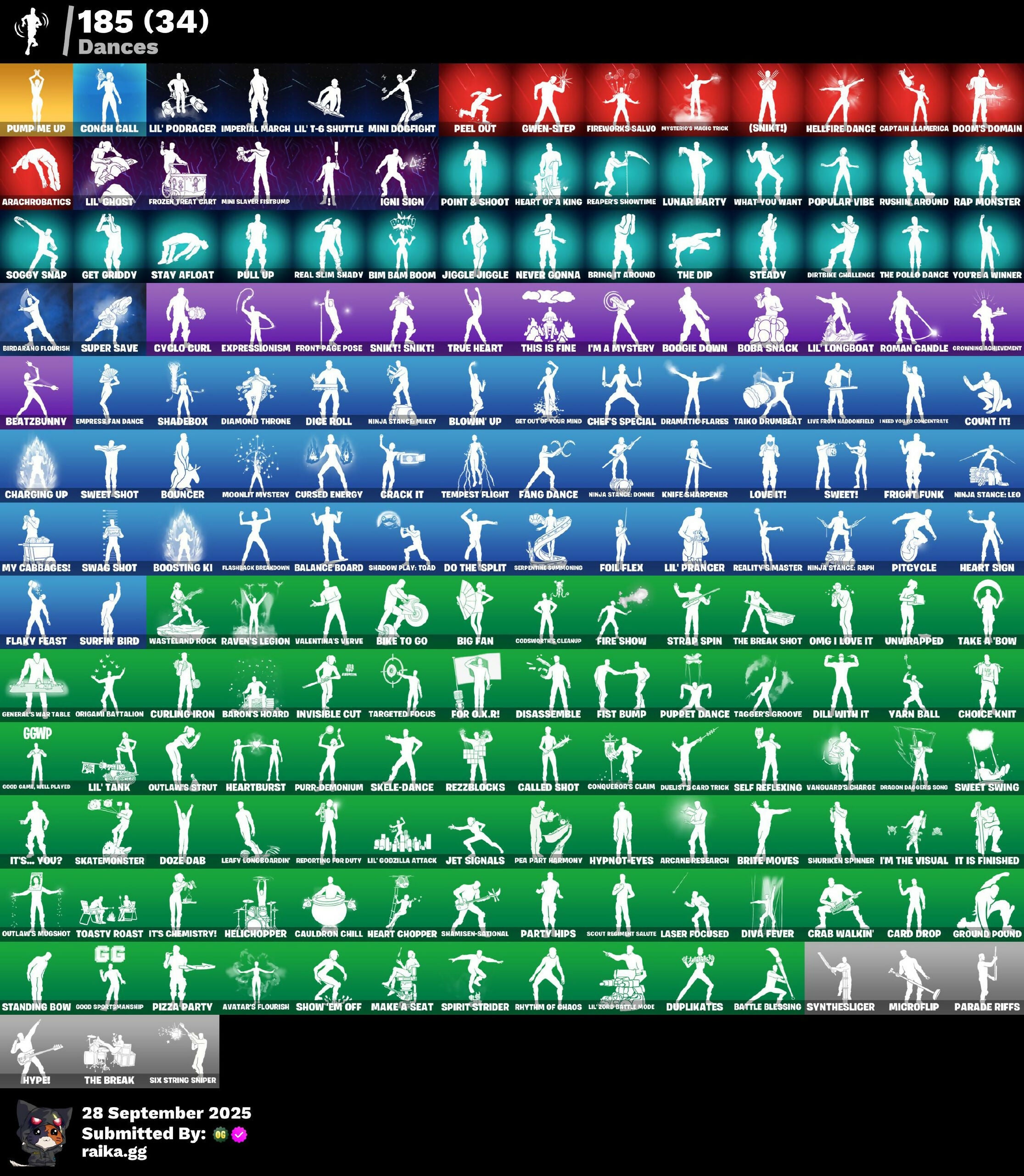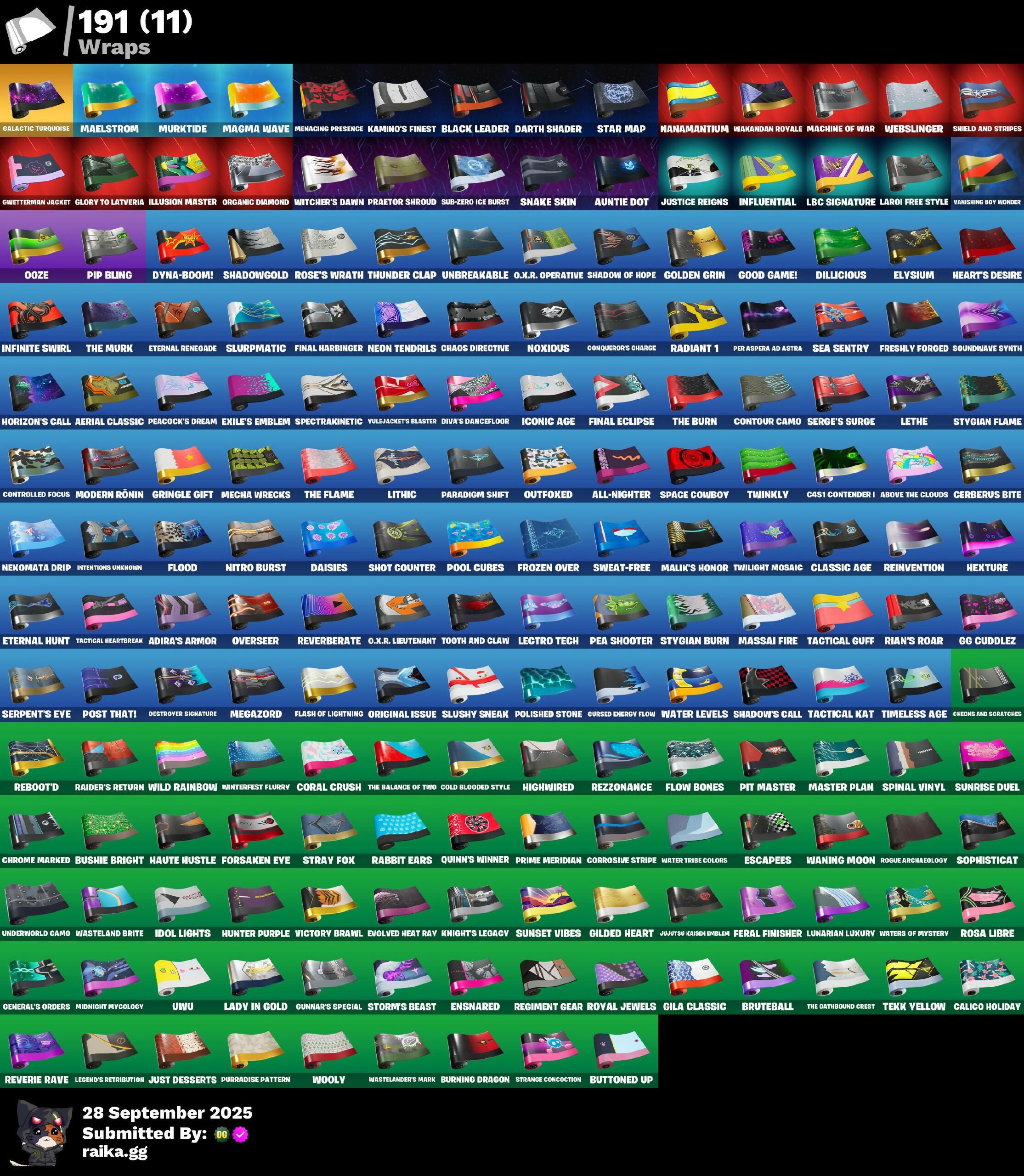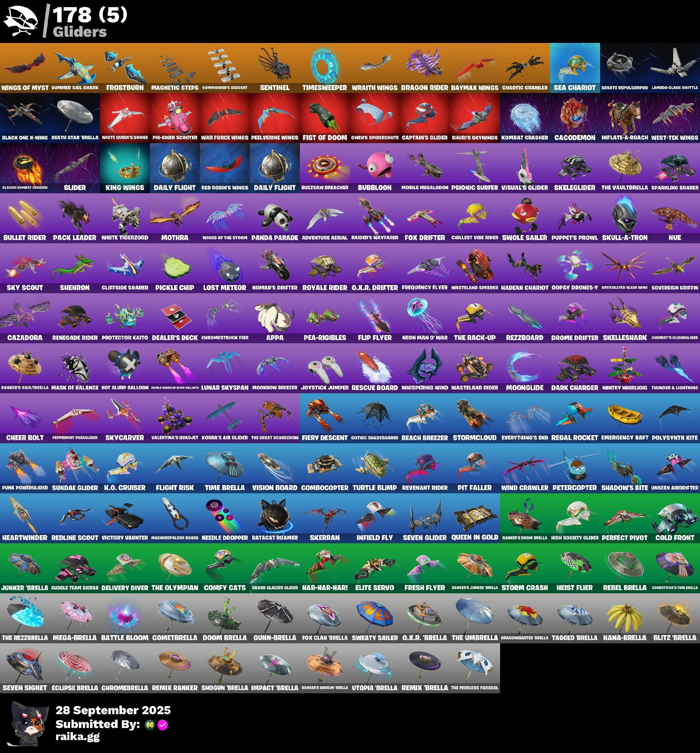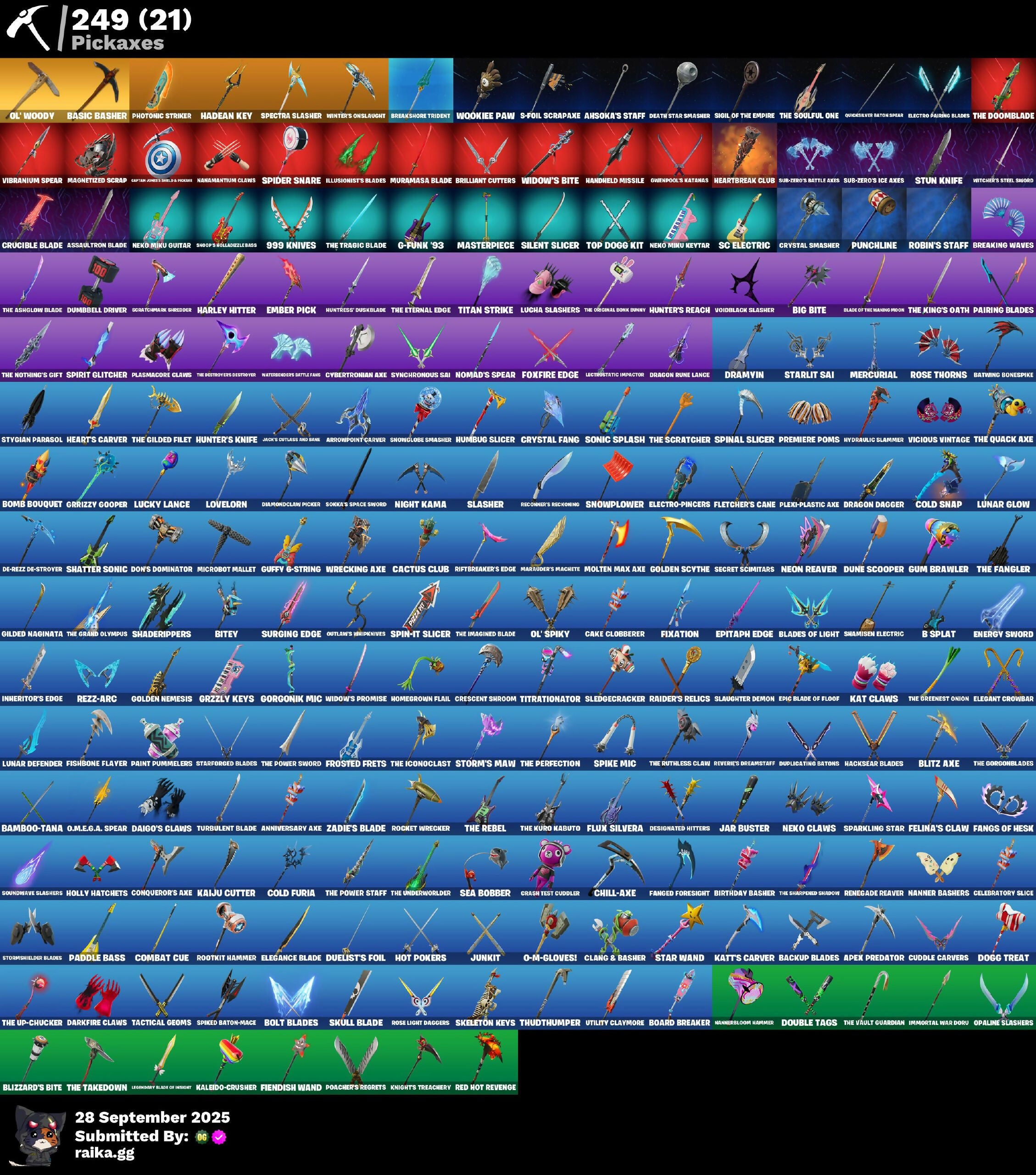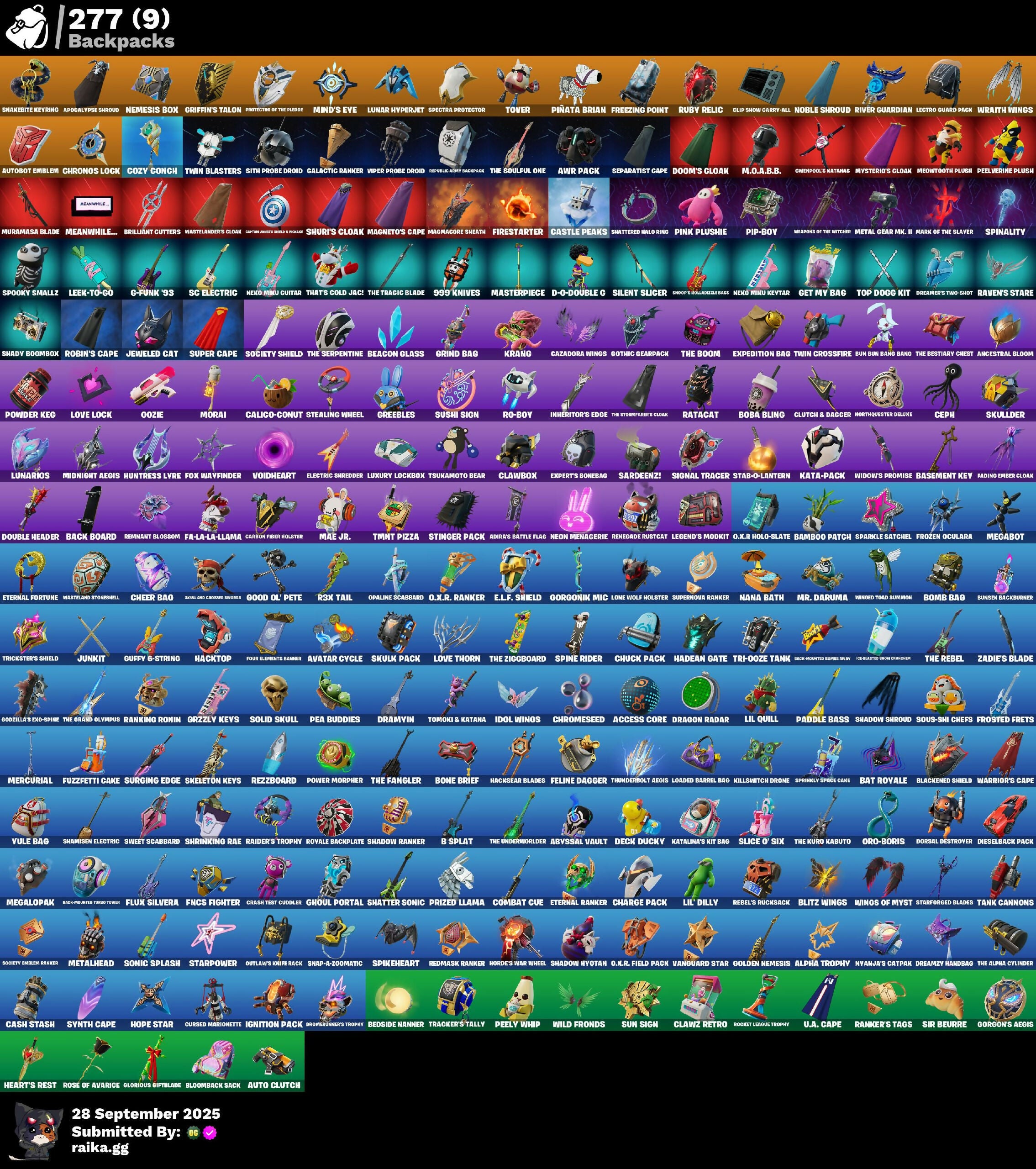 (Snikt!), 1-Ball, 999 Knives, AWR Pack, Above The Clouds, Abyssal Vault, Access Core, Adira, Adira's Armor, Adira's Battle Flag, Adventure Aerial, Aerial Assault Bomber, Aerial Classic, Agent Patch, Ahsoka Tano, Ahsoka's Clone Trooper, Ahsoka's Staff, All-Nighter, Alpha Trophy, Ancestral Bloom, Andromeda, Andy Fangerson, Anniversary Axe, Anti-Est Rust Ranger, Antonia, Apex Predator, Aphrodite, Apocalypse Shroud, Appa, Arachirobatics, Arcane Research, Arctic Adeline, Ares, Arrowpoint Carver, Artemis, Articulated Blade Wing, Assa Ultron Blade, Astrea, Auntie Dot, Auto Clutch, Autobot Emblem, Avatar Cycle, Avatar's Flourish, B Splat, Back Board, Back Mounted Dipping Away, Back-Powered Turgo Tower, Backlash, Backup Blades, Balance Board, Bamboo Patch, Bamboo-Tana, Baron's Hoard, Basement Key, Basic Basher, Bat Royale, Battle Blessing, Battle Bloom, Battle Gamer Mae, Batwing Bonespike, Baymax Wings, Beach Breezer, Beacon Glass, Beatzbunny, Bedside Nanner, Big Bite, Big Dill, Big Fan, Bike To Go, Bim Bam Boom, Birdarang Flourish, Birthday Basher, Bitey, Black Leader, Black One X-Wing, Blackened Shield, Blade of the Hawking Moon, Blades of Light, Blaze, Blitz 'Brella, Blitz Axe, Blitz Wings, Blizzard's Bite, Bloomback Sack, Blowin' Up, Board Breaker, Boba Bling, Boba Snack, Bolt Blades, Bomb Bag, Bomb Bouquet, Bone Brief, Bones, Boogie Down, Boosting Ki, Bouncer, Breaking Waves, Breakshore Trident, Brilliant Cutters, Bring It Around, Brite Moves, Brite Raider, Bruteball, Bubloon, Bullet Rider, Bun Bun Bang Bang, Bunsen Backburner, Burning Dragon, Bushie Bright, Buttoned Up, Buzzsaw Breacher, Bytes, C4S1 Contender I, Cacodemon, Cactus Club, Cake Clobberer, Calico Holiday, Calico-Coconut, Called Shot, Captain Jones, Captain Jones's Shell & Hooka, Captain Jones's Shield & Pickaxe, Captain Llamerica, Captain's Glider, Carbon Fiber Holster, Card Drop, Cash Stash, Cassidy Quinn, Castle Peaks, Catswoman Comic Book Outfit, Cauldron Chill, Cazadora, Cazadora Wings, Celebratory Slice, Ceph, Cerberus, Cerberus Bite, Chaos Directive, Chaos Director, Chaotic Crawler, Charge Pack, Charging Up, Checks and Scratches, Cheer Bag, Cheer Bolt, Chef's Special, Chemist's Cloudglider, Chill-Axe, Chillest Vibe Rider, Choice Knit, Chord Kahele, Chrome Marked, Chrome Punk, Chromebrella, Chromeseed, Chromestruck Fire, Chronos Lock, Chuck Pack, Clang & Basher, Classic Age, Clawbox, Clawz Retro, Cliffside Soarer, Clip Show Carry-All, Clutch & Dagger, Codename E.L.F., Codsworth's Cleanup, Cold Blooded Style, Cold Front, Cold Furia, Cold Snap, Combat Cue, Combat Tech Jules, Combocopter, Cometbrella, Comfy Cats, Commander's Descent, Competitor's Time Brella, Conch Call, Conqueror's Axe, Conqueror's Charge, Conqueror's Claim, Contour Camo, Contract Giller, Controlled Focus, Coral Crush, Corrosive Stripe, Coruscant Guard, Count It!, Cozy Conch, Crab Walkin', Crack It, Crash Test Cuddler, Crescent Shroom, Crowning Achievement, Crucible Blade, Crystal Fang, Crystal Smasher, Cuddle Carvers, Cuddle Team Sierra, Cuddle Team Specialist, Curling Iron, Cursed Energy, Cursed Energy Flow, Cursed Marionette, Cybertronian Axe, Cyclo Curl, D-O-Double G, Daigo, Daigo's Claws, Daily Flight, Daisies, Dark Charger, Dark Doggo, Darkfire Claws, Darth Shader, Darth Vader, De-Rezz De-Stroyer, Dealer's Deck, Death Star 'Brella, Death Star Smasher, Deck Ducky, Delivery Diver, Designated Hitters, Destroyer Signature, Diamond Throne, Diamondclaw Picker, Dice Roll, Dieselback Pack, Dill With It, Dillicious, Dino Megazord, Dirtbike Challenge, Disassemble, Diva Fever, Diva's Dancefloor, Do The Split, Dogg Treat, Don's Dominator, Doom, Doom Brella, Doom Slayer, Doom's Cloak, Doom's Domain, Dorsal Destroyer, Double Header, Double Tags, Double-Barreled Slurp Ballasts, Doze Dab, Dragon Dagger, Dragon Daggers Song, Dragon Radar, Dragon Rider, Dragon Rune Lance, Dragonhearted 'Brella, Dramatic Flares, Dramvin, Dramyin, Dreamer's Two-Shot, Dreamzy Handbag, Drome Drifter, DroneRunner's Trophy, Duelist's Card Trick, Duelist's Foil, Dumbbell Driver, Dune Scooper, Dupli-Kate, Duplicating Batons, Duplikates, Durrr Taisho, Dusk Knight, Dusty, Dyna-Boom!, Dynamo TNTina, E.L.F. Shield, Eclipse Brella, Electric Shredder, Electro Pairing Blades, Electro-Pincers, Elegance Blade, Elegant Crowbar, Elite Servo, Elysium, Ember Pick, Emergency Raft, Emma Frost, Empress Fan Dance, Energy Sword, Ensnared, Epic Blade of Floof, Epitaph Edge, Era, Eren Jaeger, Escapees, Eternal Fortune, Eternal Hunt, Eternal Ranker, Eternal Renegade, Everything's End, Evie, Evolved Heat Ray, Exile's Emblem, Expedition Bag, Expert's Bonebag, Explorer Emilie, Expressionism, FNCS Fighter, Fa-La-La-Llama, Fading Ember Cloak, Fang Dance, Fanged Foresight, Fangs of Heskl, Felina, Felina's Claw, Feline Dagger, Feral Finisher, Fiendish Wand, Fiery Descent, Final Eclipse, Final Harbinger, Fire Show, Firestarter, Fireworks Salvo, First Order Stormtrooper, Fish Thicc, Fishbone Flaver, Fist Bump, Fist of Doom, Fixation, Flaky Feast, Flash of Lightning, Flashback Breakdown, Fletcher Kane, Fletcher's Cane, Flight Risk, Flip Flyer, Flood, Flow Bones, Flux Silvera, Focus, Foil Flex, For O.X.R.!, Forsaken Eye, Four Elements Banner, Fox Clan 'Brella, Fox Drifter, Fox Wayfinder, Foxfire Edge, Freezing Point, Frequency Flyer, Fresh Flyer, Freshly Forged, Fright Funk, Front Page Pose, Frostbite, Frostburn, Frosted Frets, Frozen Fishstick, Frozen Nog Ops, Frozen Oculara, Frozen Over, Frozen Treat Cart, Fuzzfetti Cake, G-Funk '93, GG Cuddlez, Galactic Ranker, Galactic Turquoise, General's Orders, General's War Table, Geralt Of Rivia, Get Griddy, Get My Bag, Get Out Of Your Mind, Ghoul Portal, Gila Classic, Gilded Heart, Gilded Naginata, Glorious Giftblade, Glory to Latveria, Godzilla Evolved, Godzilla's Evo-Spine, Gold Blooded Ace, Golden Grin, Golden Nemesis, Golden Scythe, Good Game!, Good Game, Well Played, Good Ol' Pete, Good Sportsmanship, Goodwave Slashers, Gorgon's Aegis, Gorgonik Mic, Gothic Gearpack, Gothic Shade