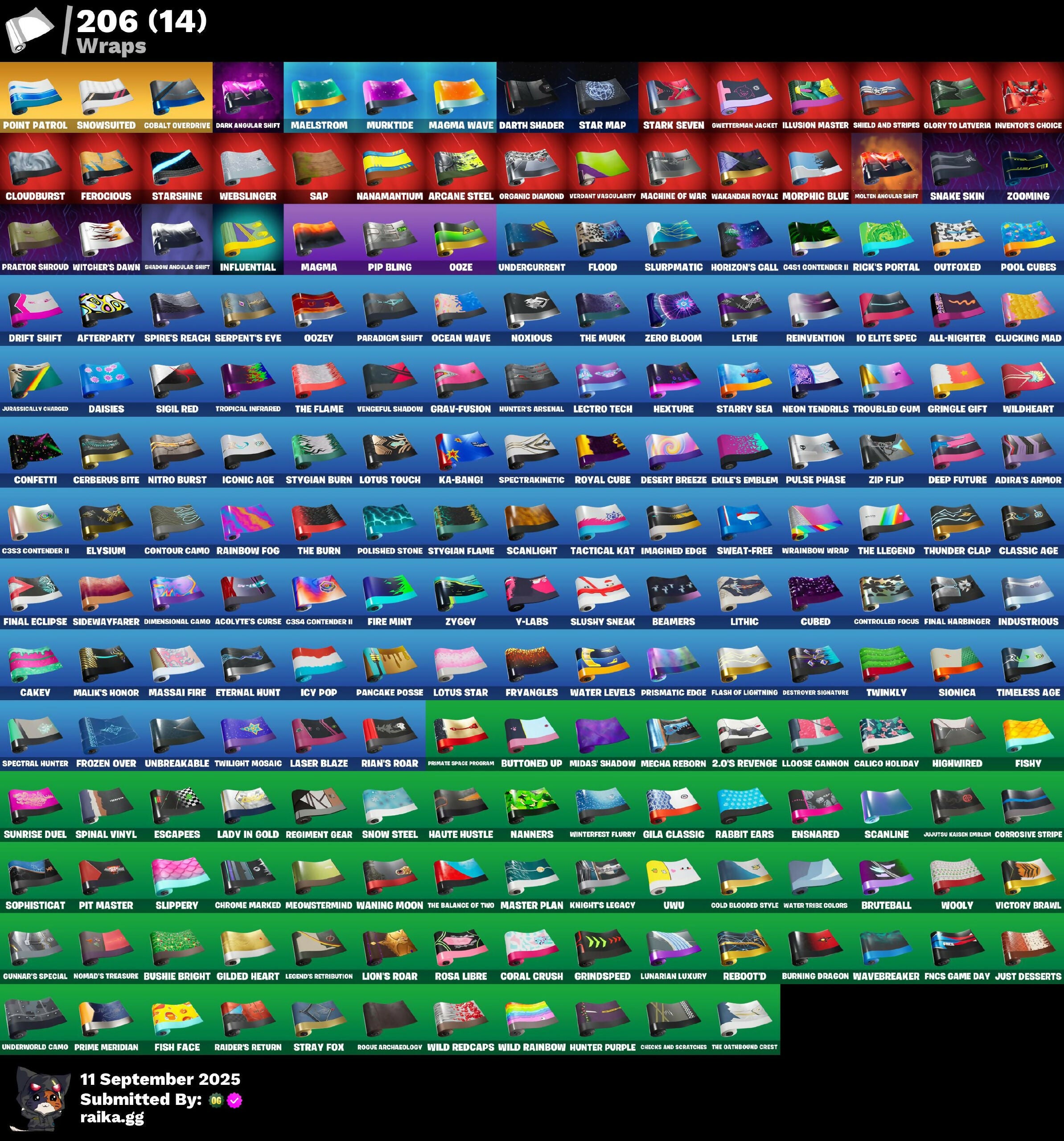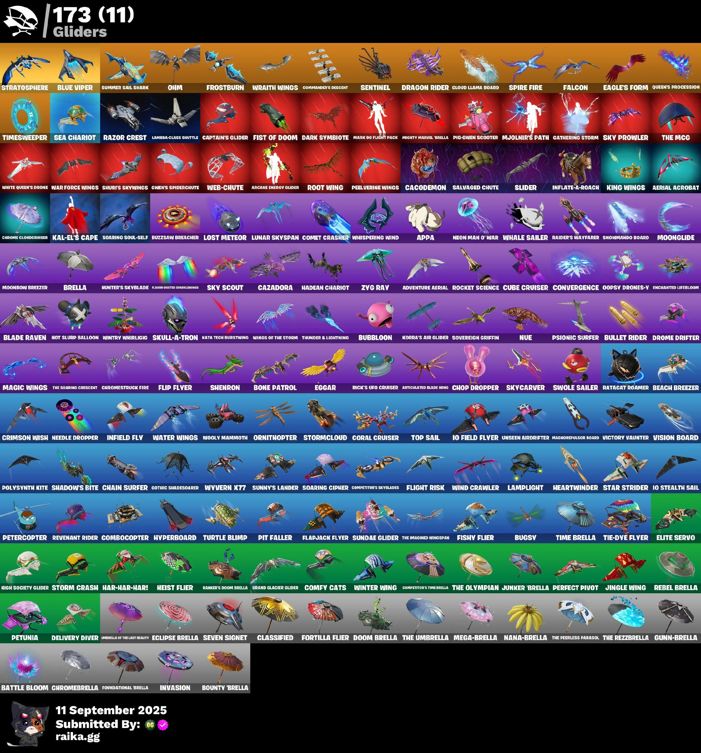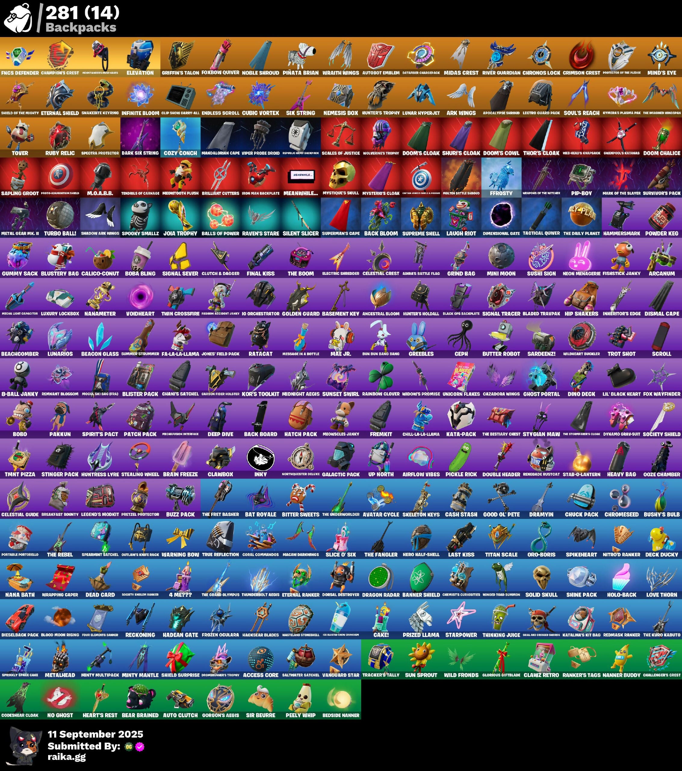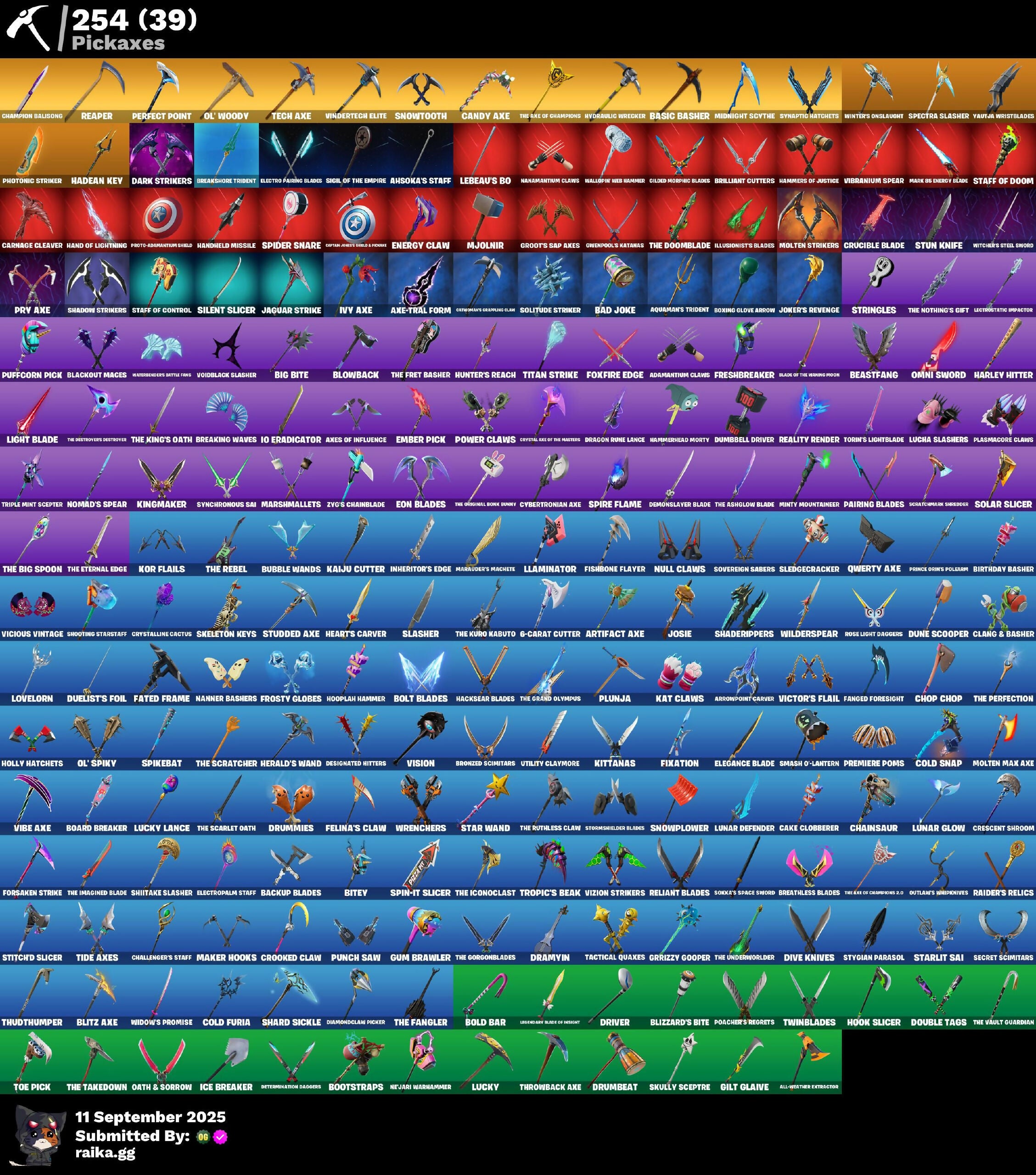 (Snikt!), 10 Orchestrator, 2.0’s Revenge, 4 Me???, 6-Carat Cutter, 8-Ball Janky, A Warrior Prepares, Access Core, Acolyte's Curse, Adamantium Claws, Adira, Adira's Battle Flag, Adira’s Armor, Adonis Creed, Adventure Aerial, Aerial Acrobat, Afterparty, Agent Jones, Ahsoka's Staff, Air Shredder, Airflow Vibes, Alias, All-Nighter, All-Weather Extractor, Ancestral Bloom, Antonia, Aphrodite, Appa, Aquaman, Aquaman's Trident, Arachnrobatics, Arcane Energy Glider, Arcane Steel, Arcanum, Arctic Adeline, Ark, Arrowpoint Carver, Artemis, Articulated Blade Wing, Artifact Axe, Assault Trooper, Astrea, Atlantean Fishstick, Auto Clutch, Autobot Emblem, Avatar Cycle, Avatar's Flourish, Aw-Snap!, Axe-Tral Form, Axes of Influence, Azarath Metrion Zinthos!, Back Bloom, Back Board, Backup Blades, Bad Joke, Balance Board, Balls Of Power, Banner Shield, Basement Key, Basic Basher, Bat Royale, Battle Bloom, Be Seeing You, Beach Breezer, Beachcomber, Beacon Glass, Beamers, Bean Bag, Bear Brained, Bear Hug, Beast Blastin', Beastfang, Beatz Bunny, Bedside Nanner, Bhangra Boogie, Big Bite, Big Fan, Billy Bounce, Birthday Basher, Bitey, Bitter Sweets, Black Ops Backplate, Black Wings, Blackout Maces, Blade Raven, Blade of the Howling Moon, Bladed Travpak, Blister Pack, Blitz Axe, Blizzabelle, Blizzard Bomber, Blizzard's Bite, Blood Moon Rising, Bloomin' Bouquet, Blowback, Blowin' Up, Blue Viper, Blustery Bag, Board Breaker, Boba Bling, Boba Snack, Bobo, Bold Bar, Bolt Blades, Bone Patrol, Boogie Down, Boomin', Boosting Ki, Boots N' Cats, Bootstraps, Bounty Brella, Boxing Glove Arrow, Brain Freeze, Branded Brigadier, Breakaway, Breakfast Bounty, Breaking Point, Breaking Waves, Breakshore Trident, Breathless Blades, Breezabelle, Brella, Brilliant Cutters, Bring It, Bronzed Scimitars, Bruteball, Bubble Wands, Bubbloon, Bugsy, Bullet Rider, Bun Bun Bang Bang, Burn Bright, Burning Dragon, Burnoff, Bushile Bright, Bushy's Bulb, Business Hips, Butter Buddy, Butter Robot, Buttoned Up, Buzz Pack, Buzzsaw Breacher, Bytes, C3S3 Contender II, C3S4 Contender II, C4S1 Contender II, Cacodemon, Cairo, Cake Clobberer, Cake!, Cakev, Calico Holiday, Calico-Conut, Call Me, Called Shot, Candy Axe, Caper, Captain America, Captain Elamerica, Captain Jones, Captain Jones's Guild 2 Pickaxe, Captain’s Glider, Carbon Fiber Holster, Card Drop, Cardistry, Carnage, Carnage Cleaver, Cash Stash, Catwoman's Grappling Claw, Cazadora, Cazadora Wings, Celestial Crest, Celestial Guide, Ceph, Cerberus, Cerberus Bite, Chain Surfer, Chainsaur, Challenger's Crest, Challenger's Staff, Champion Balisong, Champion Siren, Champion's Crest, Chani, Chani's Satchel, Chaos Agent, Chaos Explorer, Charlotte, Checks And Scratches, Chef's Special, Chemist's Curiosities, Chill-La-La-Llama, Choice Knit, Chop Chop, Chop Dropper, Chrome Cloudcruiser, Chrome Marked, Chrome Punk, Chromebrella, Chromeseed, Chromestruck Fire, Chronos Lock, Chuck Pack, Clang & Basher, Clark Kent, Classic Age, Classified, Clawbox, Clawz Retro, Clean Sweep, Click Click Flash, Cloud Llama Board, Cloud Striker, Cloudburst, Cluck, Clucking Mad, Clutch & Dagger, Cobalt Overdrive, Codeshear Cloak, Cold Blooded Style, Cold Furia, Cold Snap, Combat Tech Jules, Combocopter, Comet Crasher, Comfy Cats, Commander’s Descent, Competitor’s Skyblades, Competitor’s Timbrella, Conch Call, Confetti, Contour Camo, Contract Giller, Controlled Focus, Controller Crew, Convergence, Copines, Coral Commandos, Coral Cruiser, Coral Crush, Corrosive Stripe, Count It!, Covert Cobalt, Cozy Conch, Crack It, Crazyboy, Crescent Shroom, Crimson Crest, Crimson Wish, Crooked Claw, Crowning Achievement, Crucible Blade, Crystal Axe of the Masters, Crystalline Cactus, Cube Cruiser, Cubed, Curling Iron, Cybertronian Axe, Cyclo Curl, Daisies, Dance Therapy, Dark Angular Shift, Dark Power Chord, Dark Six String, Dark Strikers, Dark Symbiote, Darth Shader, Darth Vader, Datafiber Charged Pack, Dead Card, Decaying Dribbler, Deck Ducky, Deep Dive, Deep Future, Delivery Diver, Demonslayer Blade, Desert Breeze, Desert Dawn Lyric, Designated Hitters, Destroyer Signature, Determination Daggers, Diamond Diva, Diamond Throne, Diamondclaw Picker, Dice Roll, Dieselback Pack, Dimensional Camo, Dimensional Gate, Dino Deck, Dip, Dirtbike Challenge, Dismal Cape, Dive Knives, Do The Split, Doctor Doom, Doctor Slone, Doom, Doom Brella, Doom Chalice, Doom Slayer, Doom's Cloak, Doom's Cowl, Dorsal Destroyer, Double Header, Double Tags, Double Up, Doze Dab, Dragon Radar, Dragon Rider, Dragon Rune Lance, Dramatic Flares, Dramyin, Dreamflower, Drift Shift, Driver, Drome Drifter, Dronebrunner's Trophy, Drumbeat, Drummies, Duelist's Foil, Dumbbell Driver, Dummy Supreme, Dune Scooper, Dusty, Dynamic Shuffle, Dynamo Grav-Suit, Eagle’s Form, Echo, Eclipse Brella, Egg Drop Scoop, Eggar, Electric Shredder, Electro Pairing Blades, Electro Swing, Electropalm Staff, Electrostatic Impactor, Elegance Blade, Elevation, Elite Servo, Elysium, Ember Pick, Emma Frost, Empress Fan Dance, Enchanted Lifebloom, Energy Claw, Ensnared, Eon Blades, Era, Eren Jaeger, Escapees, Eternal Hunt, Eternal Knight, Eternal Ranker, Eternal Shield, Evasive Maneuvers, Everybody Loves Me, Evie, Evil Plan, Exile’s Emblem, Explorer Emilie, Expressionism, FNCS Game Day, Fa-La-La-Llama, Fabio Sparklemane, Fade, Falcon, Fan Fervor, Fancy Footwork, Fang Dance, Fanged Foresight, Far Out Man, Fated Frame, Felina, Felina's Claw, Ferocious, Ffrosty, Final Eclipse, Final Harbinger, Final Kiss, Fire Mint, Fireworks Salvo, Fish Face, Fish Thicc, Fishbone Flayer, Fishstick, Fishstick Janky, Fishy, Fishy Flier, Fishy Flourish, Fist Of Doom, Fixation, Fixer, Flaky Feast, Flapjack Flyer, Flash Of Lightning, Flashback Breakdown, Flavor-Outside Sparklesings, Flight Risk, Flip Flyer, Flippin' Away, Flood, Fncs Defender, Focus, Foil Flex, Forsaken Strike, Fortilla Flier, Foundational Brella, Four Elements Banner, Fox Wavfinder, Foxbow Quiver, Foxfire Edge, Fremkit, Fresh Aura, Freshbreaker, Frost Sq