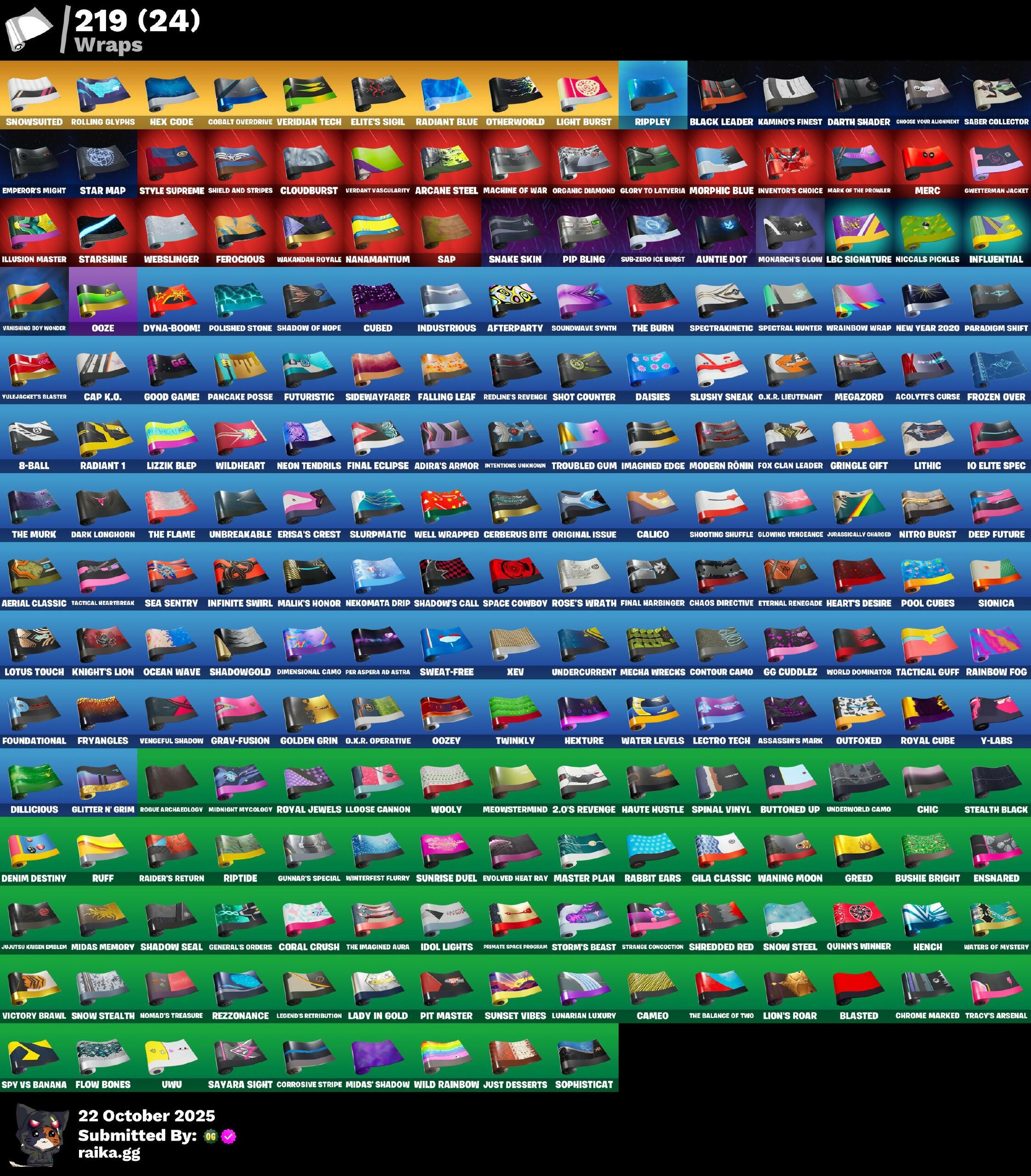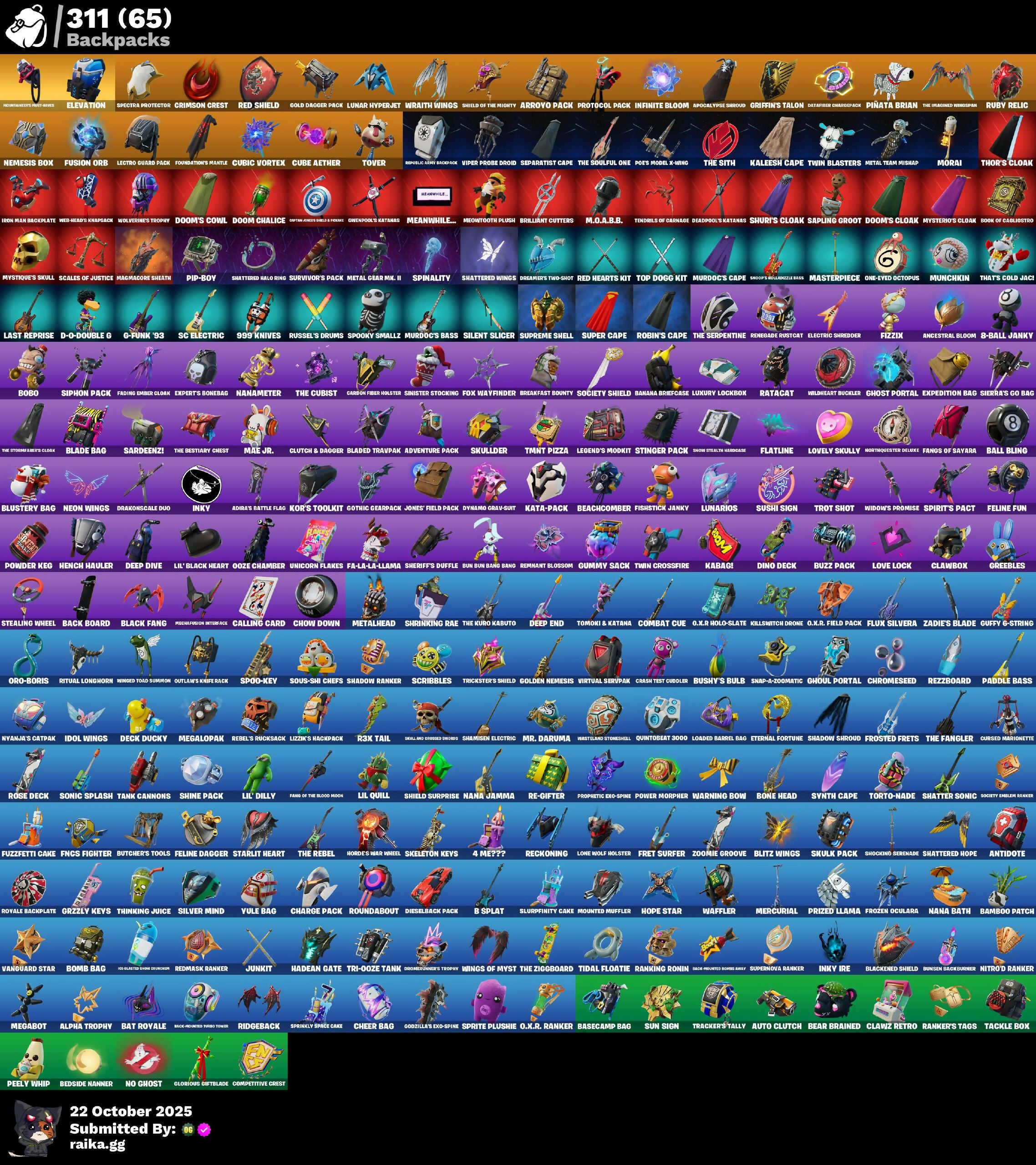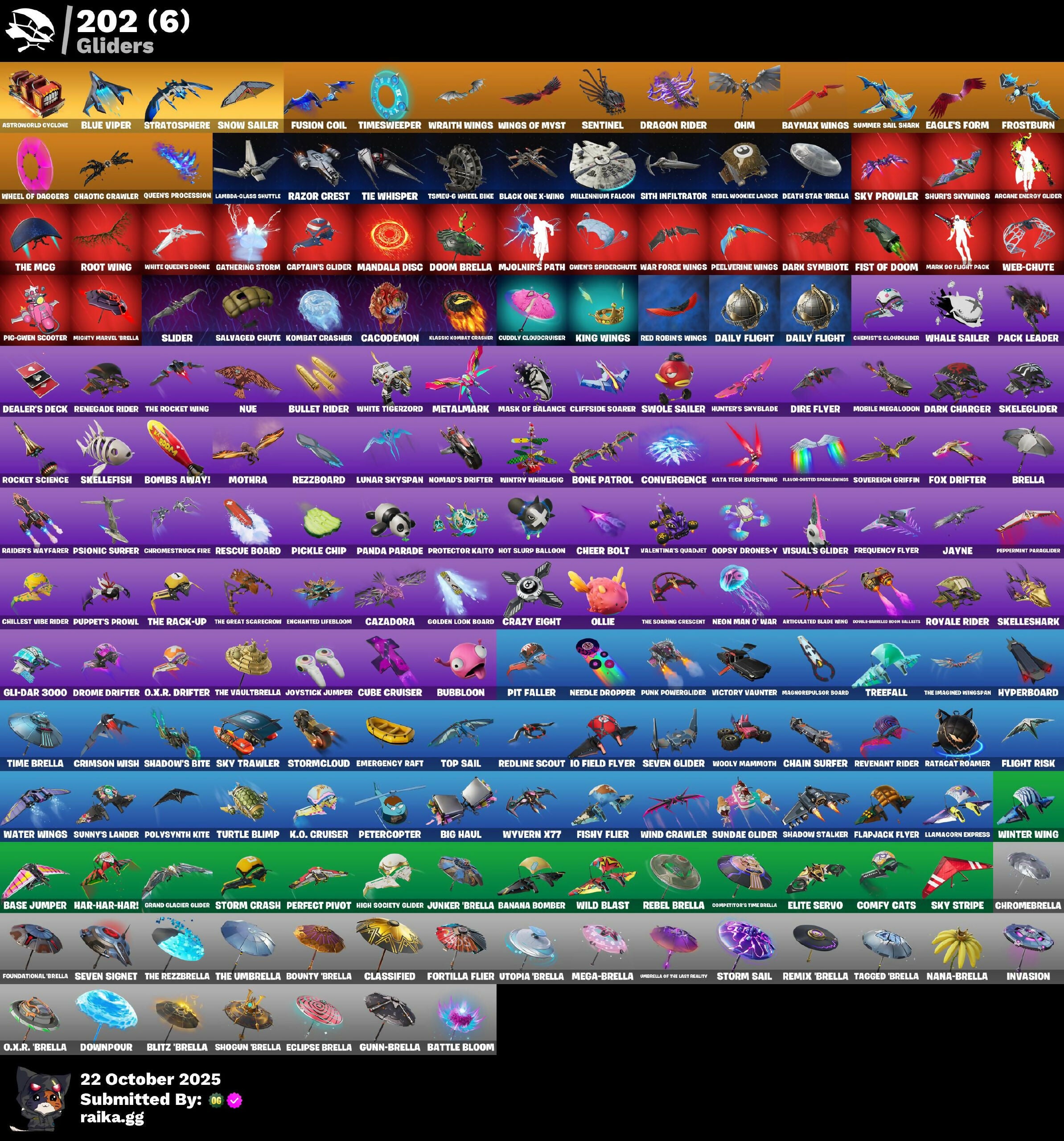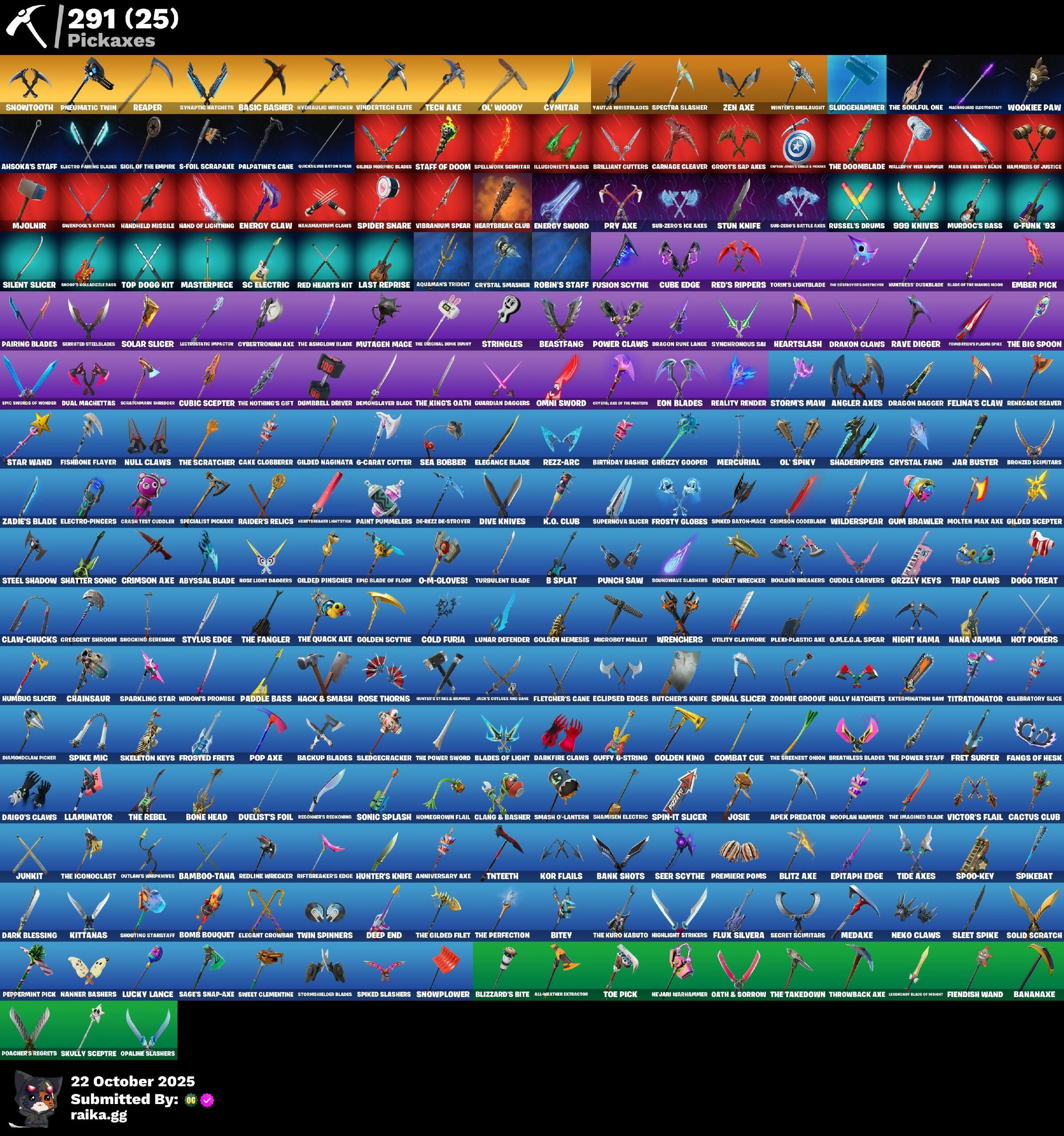 (Snikt!), 1-Ball, 180-Glated Stone Cruncher, 2.0's Revenge, 4 Me???, 6-Carat Cutter, 8 Splat, 8-Ball, 8-Ball Janky, 8-Ball Vs Scratch, 999 Knives, A Warrior Prepares, Absenz, Abyssal Blade, Acolyte's Curse, Adira, Adira's Armor, Adira's Battle Flag, Adventure Pack, Aerial Assault Bomber, Aerial Classic, Aftermath, Afterparty, Agent Jones, Agent Patch, Agent Peely, Ahsoka Tano, Ahsoka's Staff, Air Shredder, All-Weather Extractor, Alpha Trophy, Ancestral Bloom, Andy Fangerson, Angler Axes, Anniversary Axe, Antidote, Antonia, Apex Predator, Apocalypse Shroud, Apprentice Evie, Aquaman, Aquaman's Trident, Arachnrobatics, Arcane Energy Glider, Arcane Research, Arcane Steel, Arrovo Pack, Articulated Blade Wing, Ascend!, Assassin's Mark, Assault Trooper, Astroworld Cyclone, Augury, Auntie Dot, Aura, Auto Clutch, Aw, Shucks., B Splat, Back Board, Back-Pounted Bomb Archer, Backup Blades, Ball Bling, Bamboo Patch, Bamboo-Tana, Banana Bomber, Banana Briefcase, Bananaxe, Bank Shots, Banner Trooper, Baron's Hoard, Base Jumper, Basecamp Bag, Basic Basher, Bat Royale, Battle Blessing, Battle Bloom, Battle Call, Battle Gamer Mae, Baymax Wings, Beachcomber, Bear Brained, Beastfang, Beatzbunny, Bedside Manner, Beep Beep, Bernie, Bhangra Boogie, Big Dill, Big Haul, Bike To Go, Birdarang Flourish, Birthday Basher, Bitey, Black Fang, Black Leader, Black One X-Wing, Black-Hooved Turbo Tower, Blackened Shield, Blade Bag, Blade of the Waning Moon, Bladed Trapvax, Blades of Light, Blasted, Blitz 'Brella, Blitz Axe, Blitz Wings, Blizzard Bomber, Blizzard's Bite, Blowin' Up, Blue Viper, Blustery Bag, Bobo, Boing!, Bold Stance, Bomb Bag, Bomb Bouquet, Bombs Away!, Bone Head, Bone Patrol, Boogie Down, Book of Cagliostro, Boomin', Boulder Breakers, Bounty 'Brella, Breakfast Bounty, Breaking Point, Breathless Blades, Brella, Brilliant Cutters, Brite Bomber, Bronzed Scimitars, Bubbloon, Bug Punk Sunny, Bullet Rider, Bun Bun Bang Bang, Bunsen Backburner, Bushie Bright, Bushy's Bulb, Butcher's Knife, Butcher's Tools, Buttoned Up, Buzz Beat, Buzz Pack, Bytes, Cacodemon, Cactus Club, Cake Clobberer, Calico, Call Me, Calling Card, Cameo, Cameo Vs Chic, Cap K.O., Cap Kick, Captain America, Captain America's Shield & Mjolnir, Captain Jones, Captain Jones' Shield & Pickaxe, Captain's Glider, Carbon Fiber Holster, Card Drop, Cardistry, Carnage, Carnage Cleaver, Cassidy Quinn, Cauldron Chill, Cazadora, Celebratory Slice, Cerberus, Cerberus Bite, Chain Surfer, Chainsaur, Chaos Agent, Chaos Directive, Chaos Director, Chaos Origins, Chaotic Crawler, Charge Pack, Charlotte, Cheer Bag, Cheer Bolt, Chemist's Cloudglider, Chic, Chillest Vibe Rider, Choice Knit, Chow Down, Chrome Marked, Chrome Punk, Chromebrella, Chromeseed, Chromestruck Fire, Clang & Basher, Classic Kombat Crasher, Classified, Claw-Chucks, Clawbox, Clawz Retro, Clean Sweep, Clever Joyce Wild, Cliffside Soarer, Clone Trooper, Cloud Striker, Cloudburst, Clutch & Dagger, Cobalt Overdrive, Coin Flip, Cold Furia, Color Crush, Combat Cue, Comfy Cats, Competitive Crest, Competitor's Time Brella, Conjure Weapon, Contour Camo, Convergence, Coral Crush, Corrosive Stripe, Count It!, Crack It, Crash Test Cuddler, Crazy Eight, Crescent Shroom, Crimson Axe, Crimson Codeblade, Crimson Crest, Crimson Wish, Crystal Axe of the Praestors, Crystal Fang, Crystal Smasher, Cube Aether, Cube Assassin, Cube Cruiser, Cube Edge, Cubed, Cubic Scepter, Cubic Vortex, Cuddle Carvers, Cuddly Cloudcruiser, Cursed Marionette, Cybertronian Axe, Cyclo Curl, Cymitar, D'ark, D-O-Double G, Dagger Dance, Daigo, Daigo's Claws, Daily Flight, Daisies, Danica, Dark Blessing, Dark Charger, Dark Longhorn, Dark Side, Dark Symbiote, Darkfire Claws, Darth Shader, Darth Vader, Datafused Charger Pack, De-Rezz De-Stroyer, Deadpool, Deadpool's Katanas, Dealer's Deck, Death Star 'Brella, Deck Ducky, Deep Dab, Deep Dive, Deep End, Deep Future, Demonslayer Blade, Denim Destiny, Dewlad-2D Digged Sword, Diamond Diva, Diamond Throne, Diamondclaw Picker, Dice Roll, Die With A Smile, Die With A Smile (Bling), Dieselback Pack, Dillicious, Dimensional Camo, Dino Deck, Dino Megazord, Dire Flyer, Dirtbike Challenge, Dive Knives, Do The Split, Doctor Doom, Doctor Strange, Dogg Treat, Doggo, Doom, Doom Brella, Doom Chalice, Doom's Cloak, Doom's Cowl, Doom's Domain, Double Up, Double-Barreled Boom Ballista, Downpour, Doze Dab, Dragon Dagger, Dragon Daggers Song, Dragon Rider, Dragon Rune Lance, Drakon Claws, Drakon Steel Hybrid, Drakonscale Duo, Dreamer's Two-Shot, Drome Drifter, Dronehunter's Trophy, Droop, Dual Machettas, Duelist's Card Trick, Duelist's Foil, Dumbbell Driver, Durrr Taisho, Dusk Knight, Dyna-Boom!, Dynamo, Dynamo Grav-Suit, Dynamo Tntina, Eagle's Form, Eclipse Brella, Eclipsed Edges, Electric Farming Blades, Electric Shredder, Electro Swing, Electro-Pincers, Electrostatic Impactor, Elegance Blade, Elegant Crowbar, Elevation, Elite Servo, Elite's Sigil, Ember Pick, Emergency Raft, Emma Frost, Emperor's Might, Enchanted Lifebloom, Energy Claw, Energy Sword, Ensnared, Eon Blades, Epic Blade of Floof, Epic Swords of Wonder, Epitaph Edge, Erisa, Erisa's Crest, Eternal Fortune, Eternal Renegade, Evasive Maneuvers, Evie, Evolved Heat Ray, Expedition Bag, Expert's Bonebag, Explorer Emilie, Extermination Saw, FNCS Fighter, Fa-La-La-Llama, Fabio Sparkleman, Fade, Fading Ember Cloak, Falling Leaf, Fang of the Blood Moon, Fangs of Hesk, Fangs of Sayara, Feel The Force, Felina, Felina's Claw, Feline Dagger, Feline Fun, Ferocious, Fiendish Wand, Final Eclipse, Final Harbinger, Finger Wag, Fireworks Salvo, Fish Thicc, Fishbone Flayer, Fishstick Janky, Fishy Flier, Fist Bump, Fist Of Doom, Fixer, Fizzix, Flaky Feast, Flapjack Flyer, Flashback Breakdown, Flatline, Flavor-Dusted Sparklings, Fletcher Kane, Fletcher's Cane, Flight Risk, Flippin' Away, Flow Bones, Flux Silvera, Focused, Foil Flex, Follow The Butterfly, For O.K.R!, Force Lightning, Fortilla Flier, Foundation's Mantle, Foundational, Foundational 'Brella, Fox Clan Leader, Fo